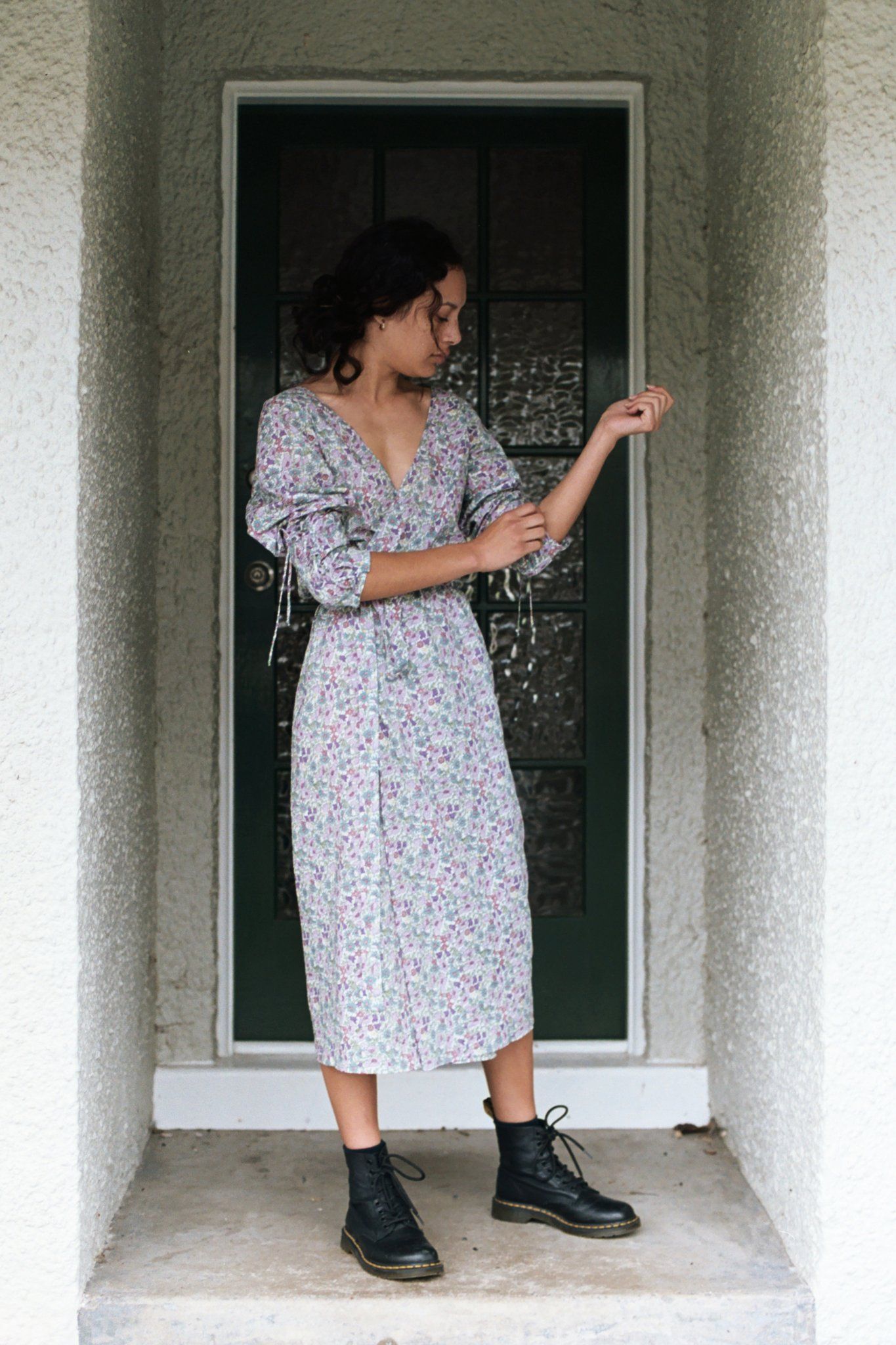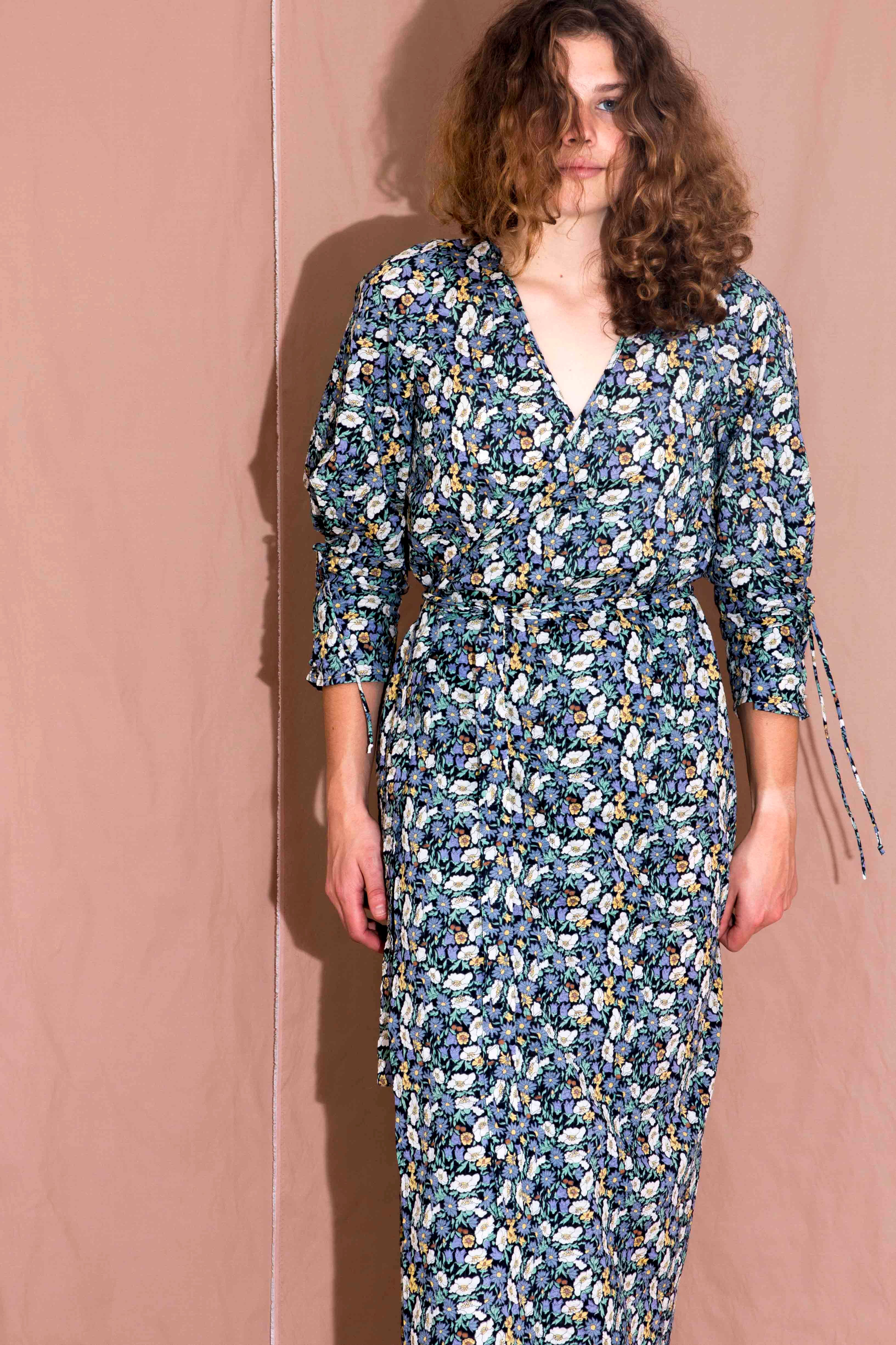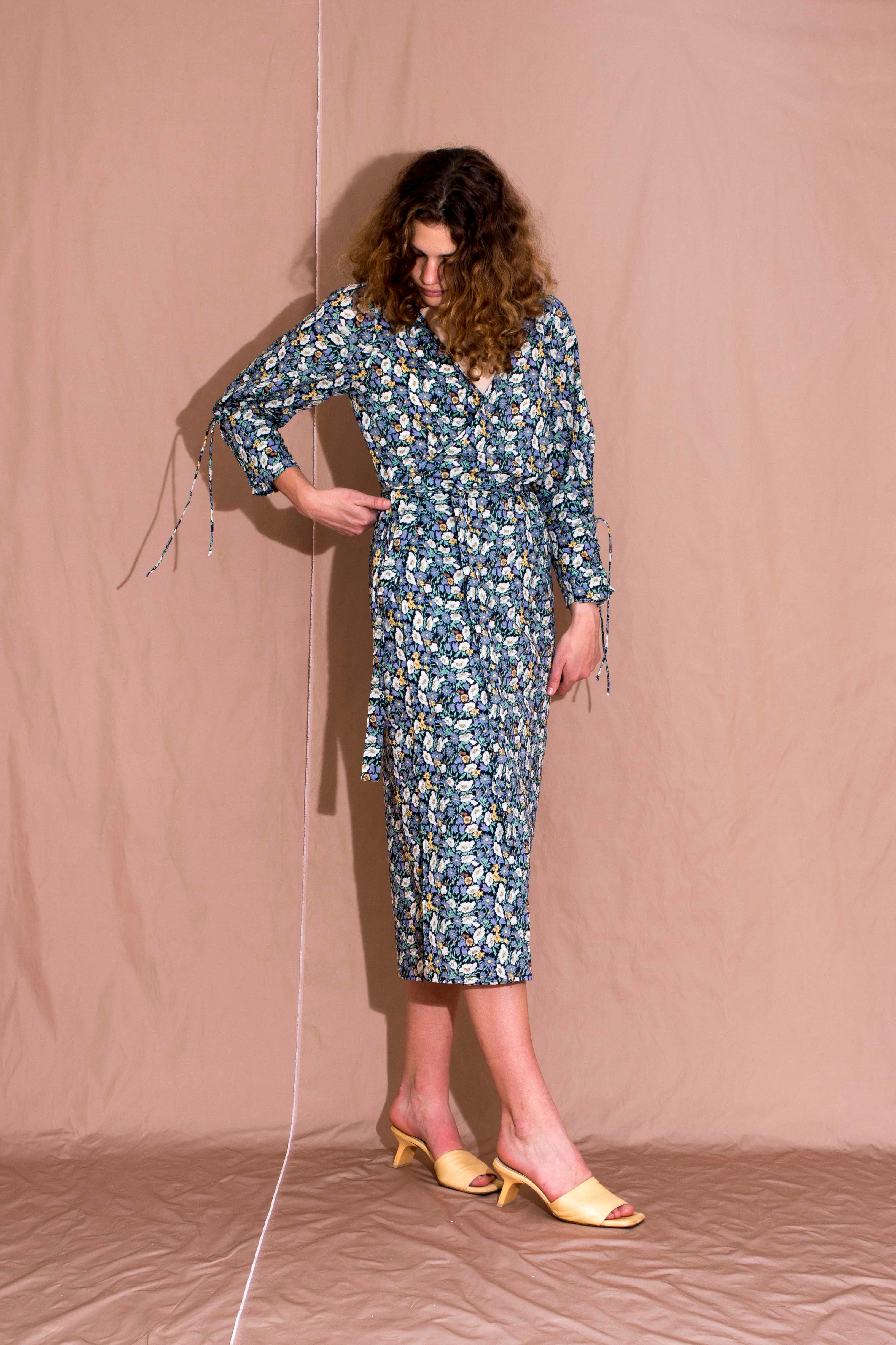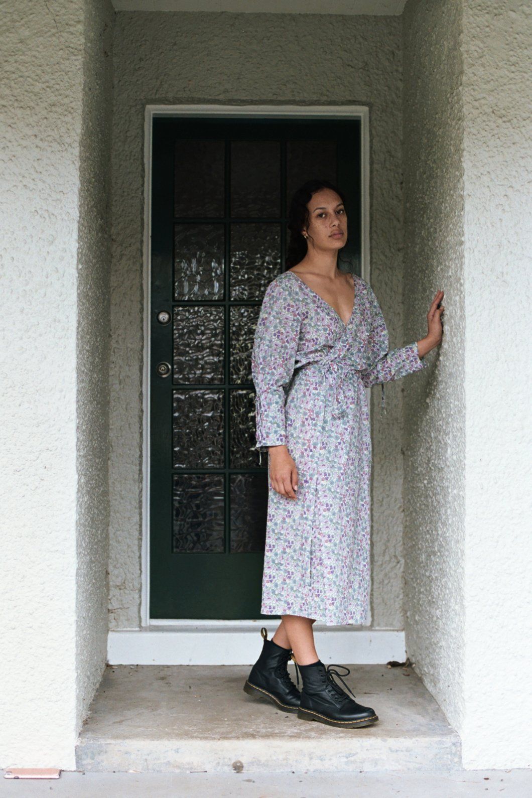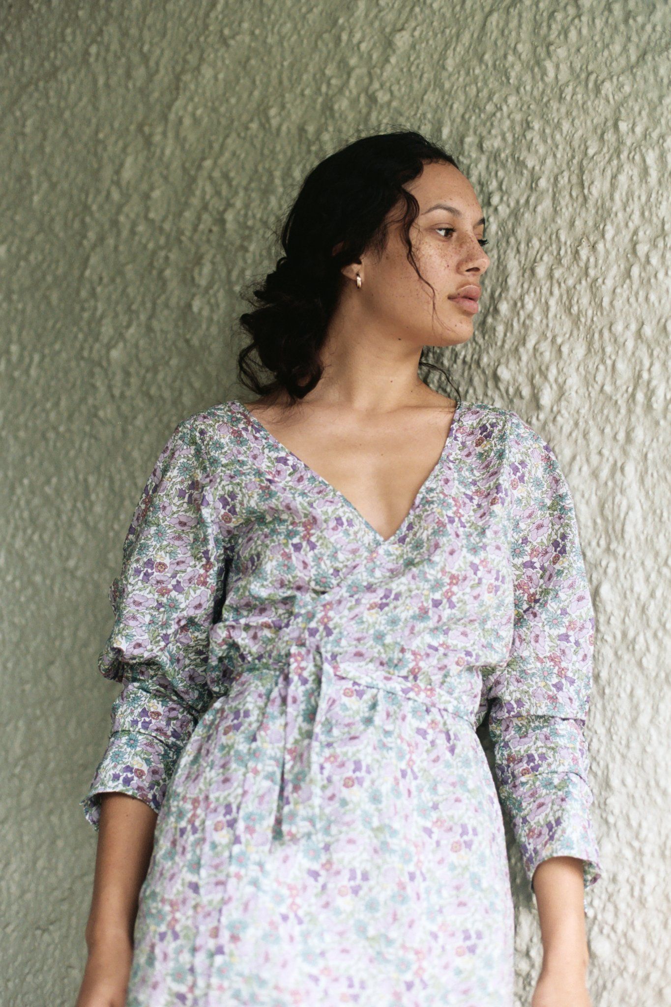 An elegant wrap dress with a low back, featuring ties at the top back neck to allow for it to be worn draped and wide over the shoulders or can be tied in to fit. Wraps at waist and features a beautiful lace up deatiled sleeve.
