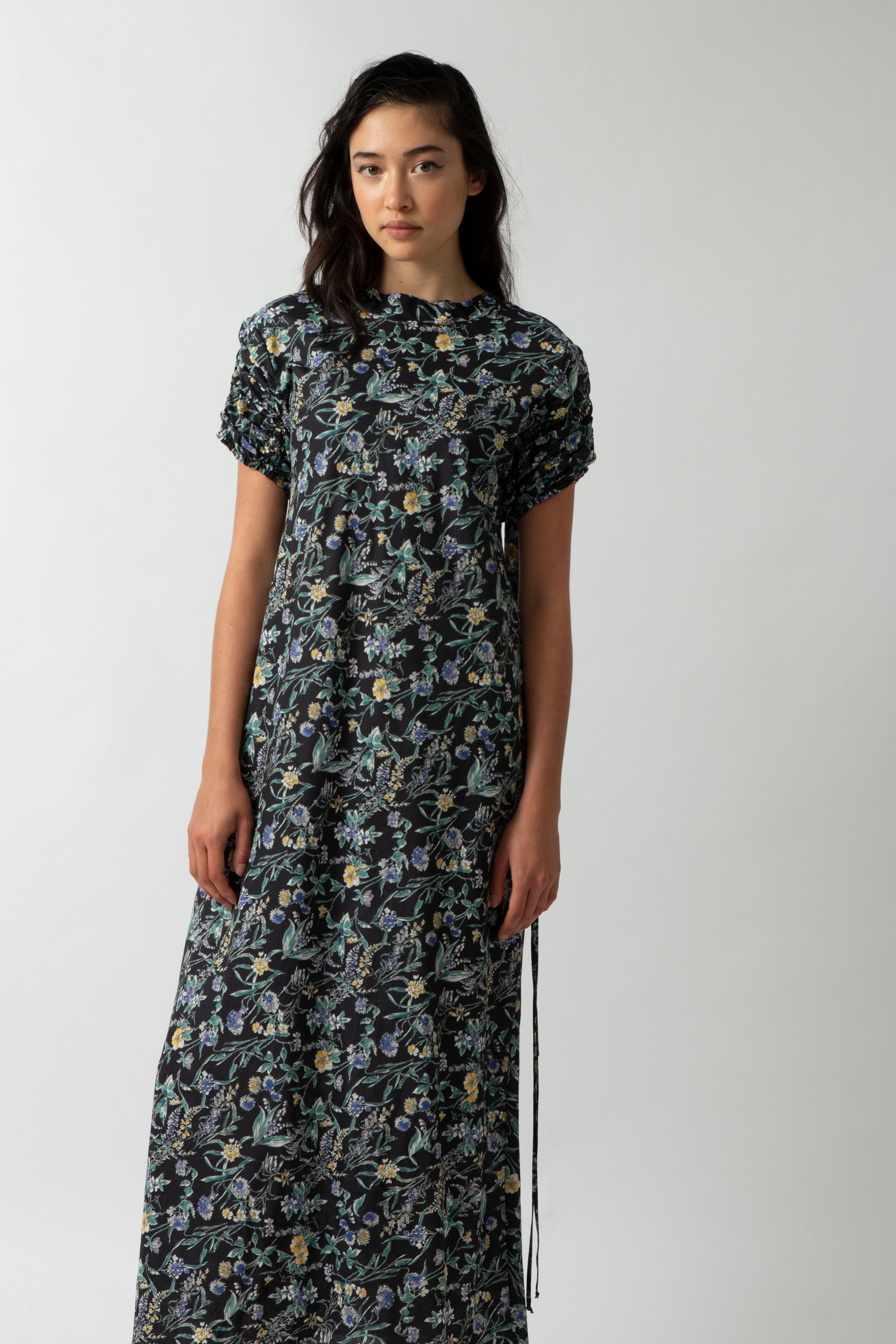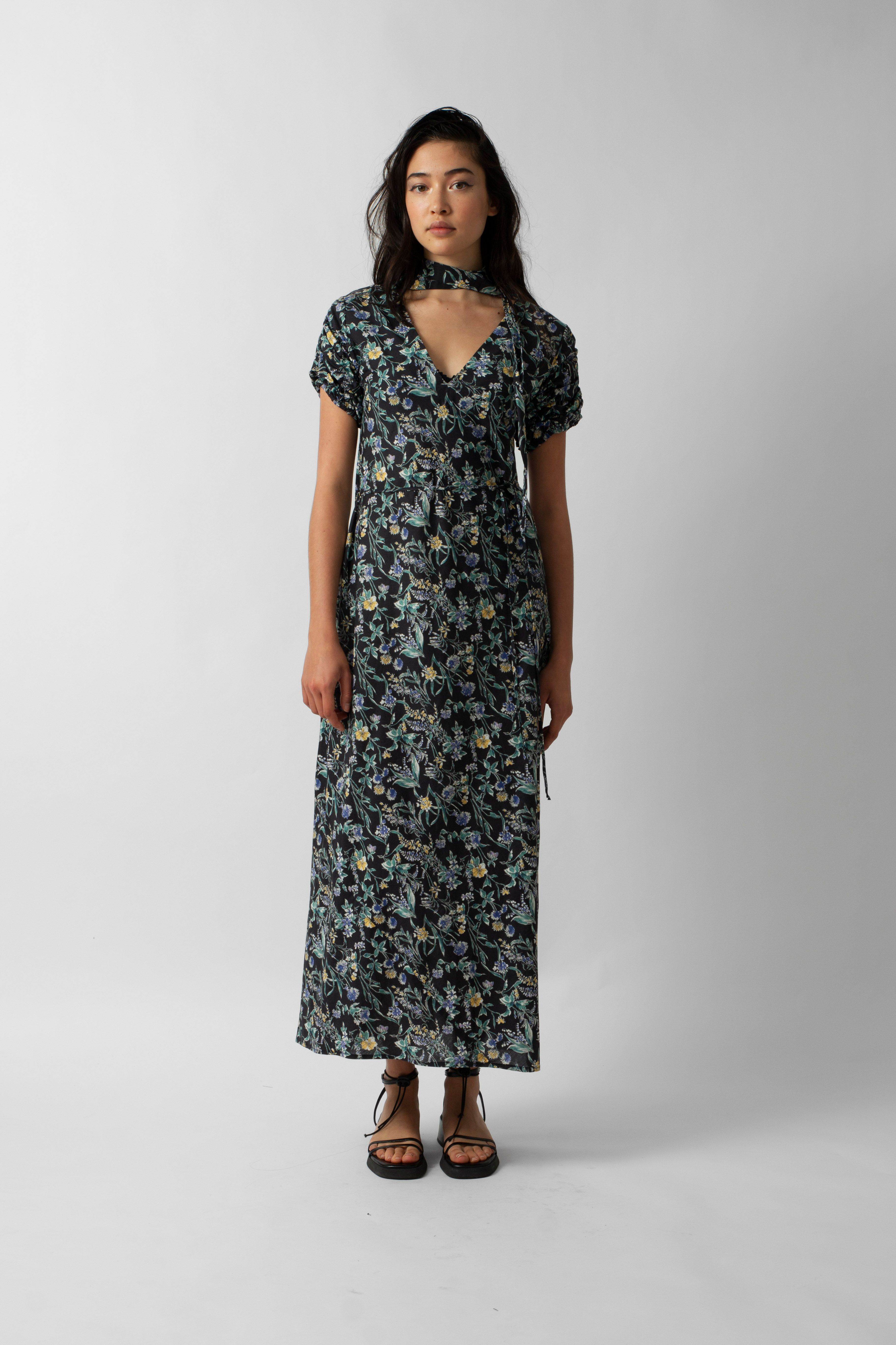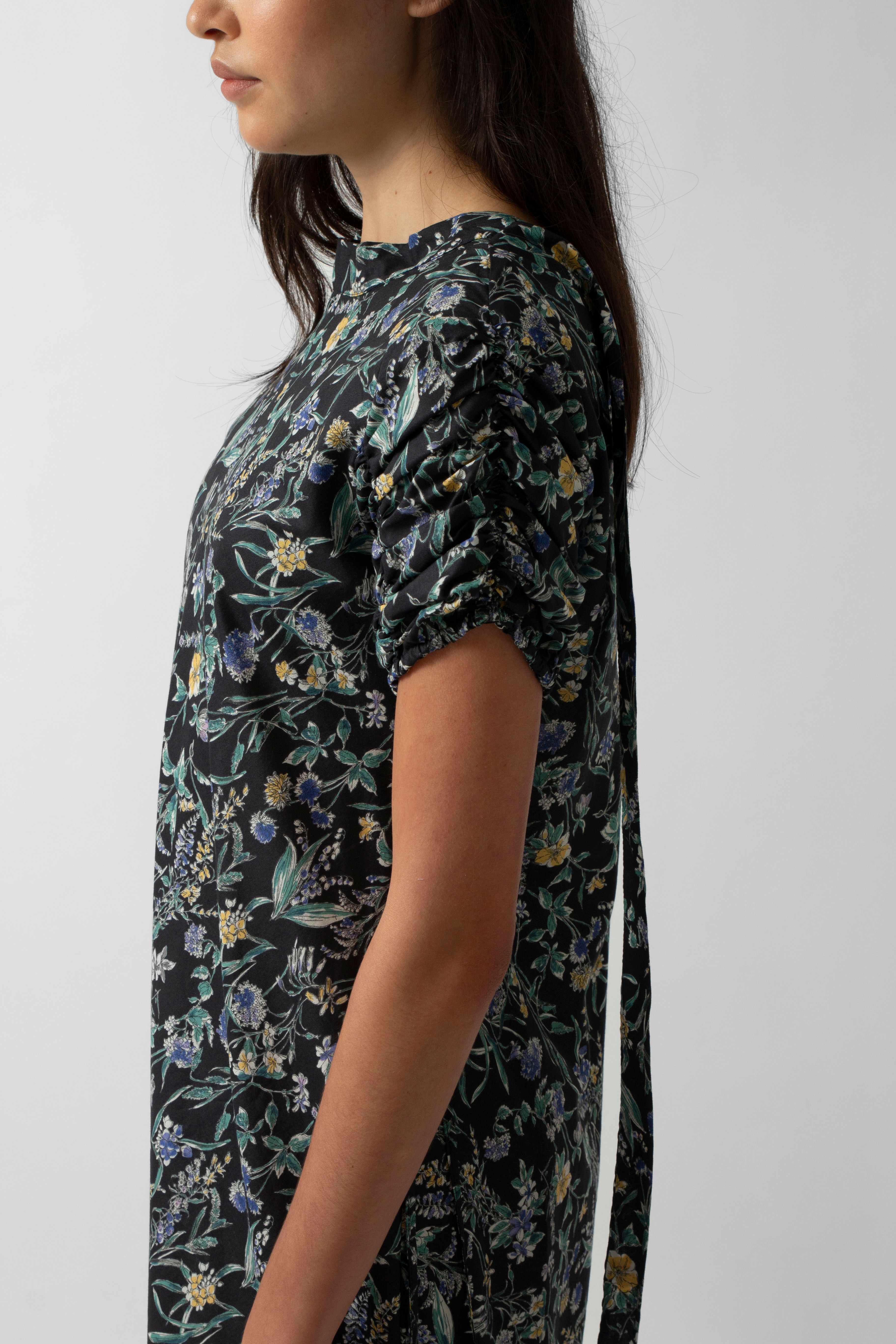 The sleeve has ruched detailing running vertical down the sleeve and the neck features a soft tie that can be worn around the neck or hanging loose.