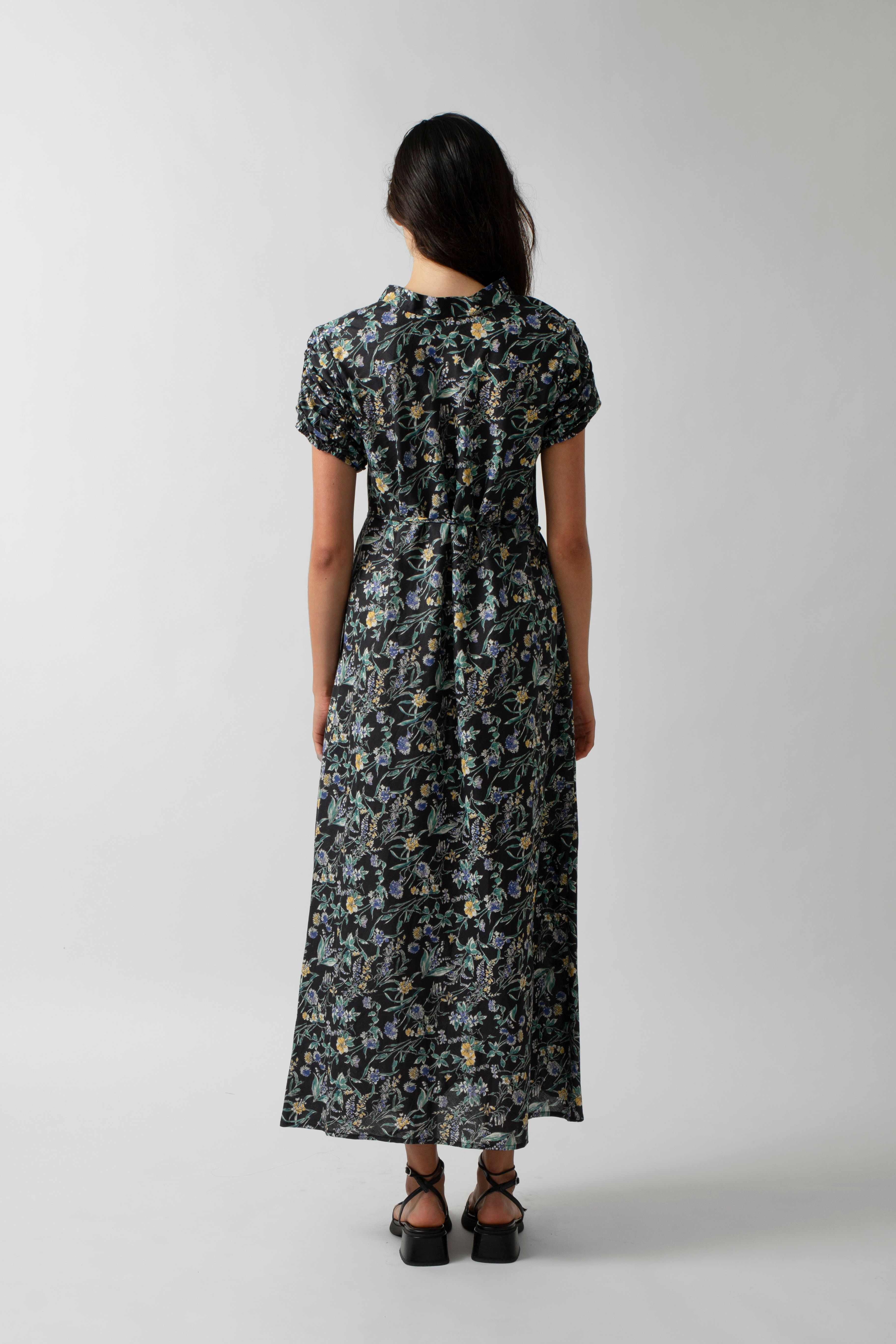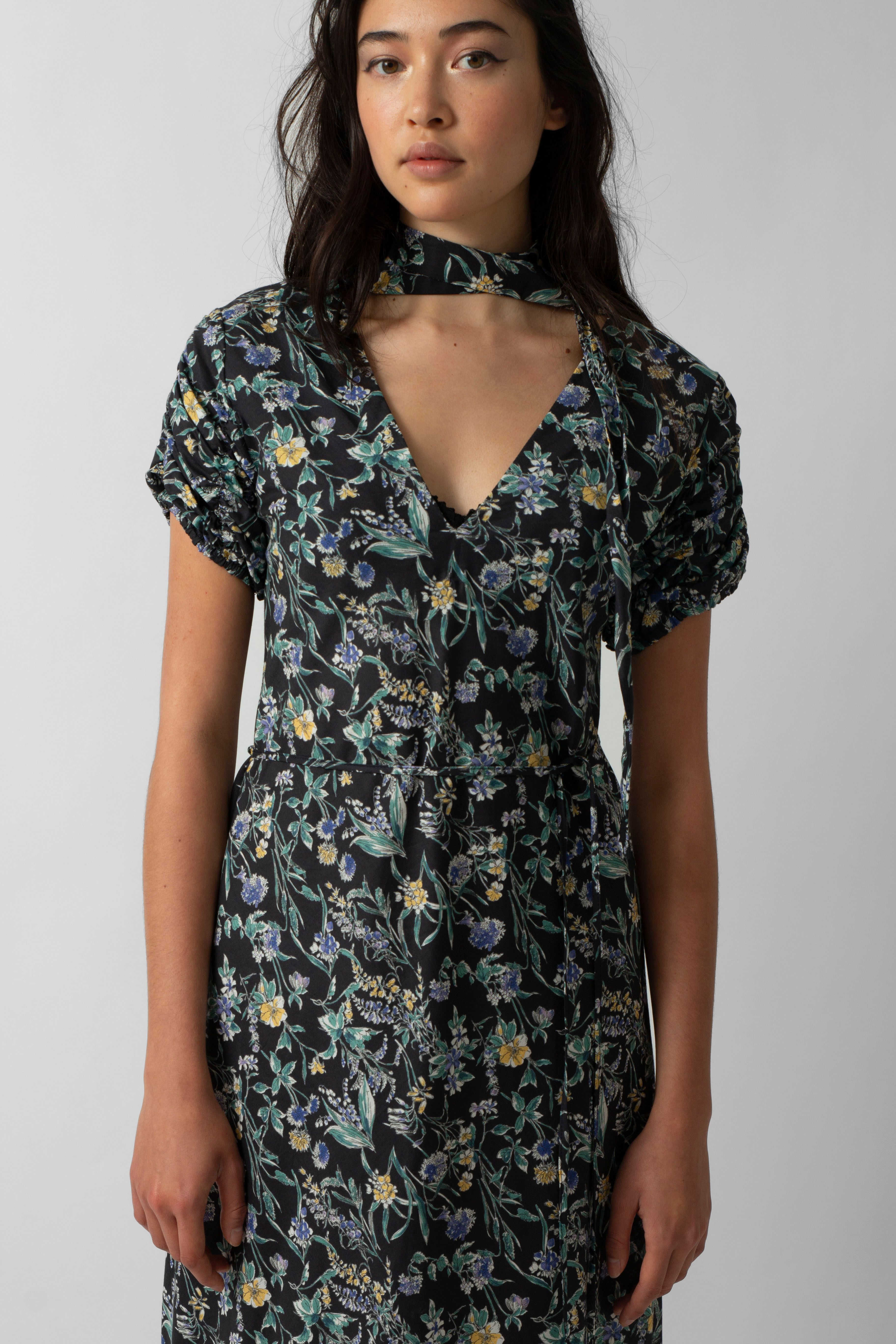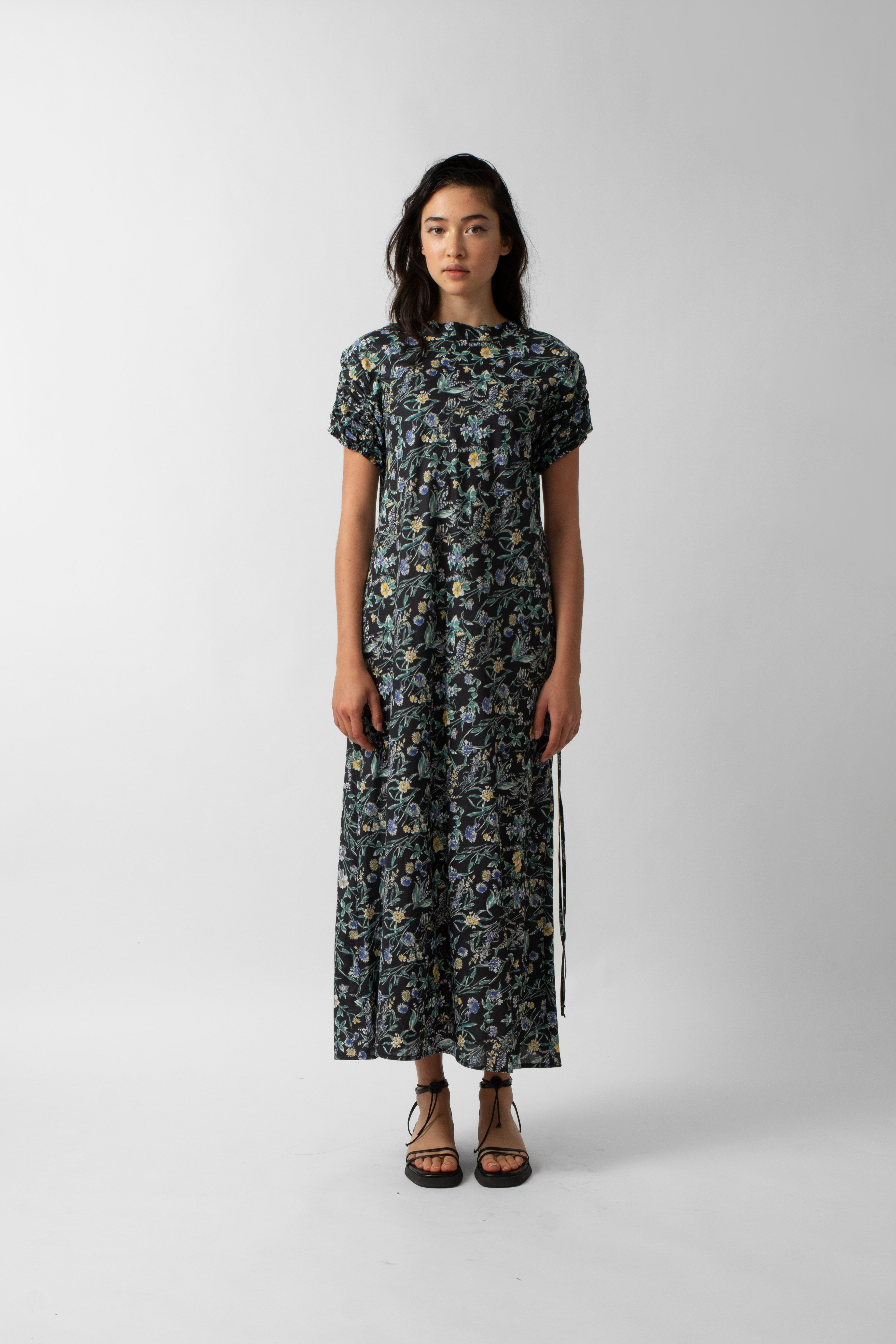 The sleeve has ruched detailing running vertical down the sleeve and the neck features a soft tie that can be worn around the neck or hanging loose.