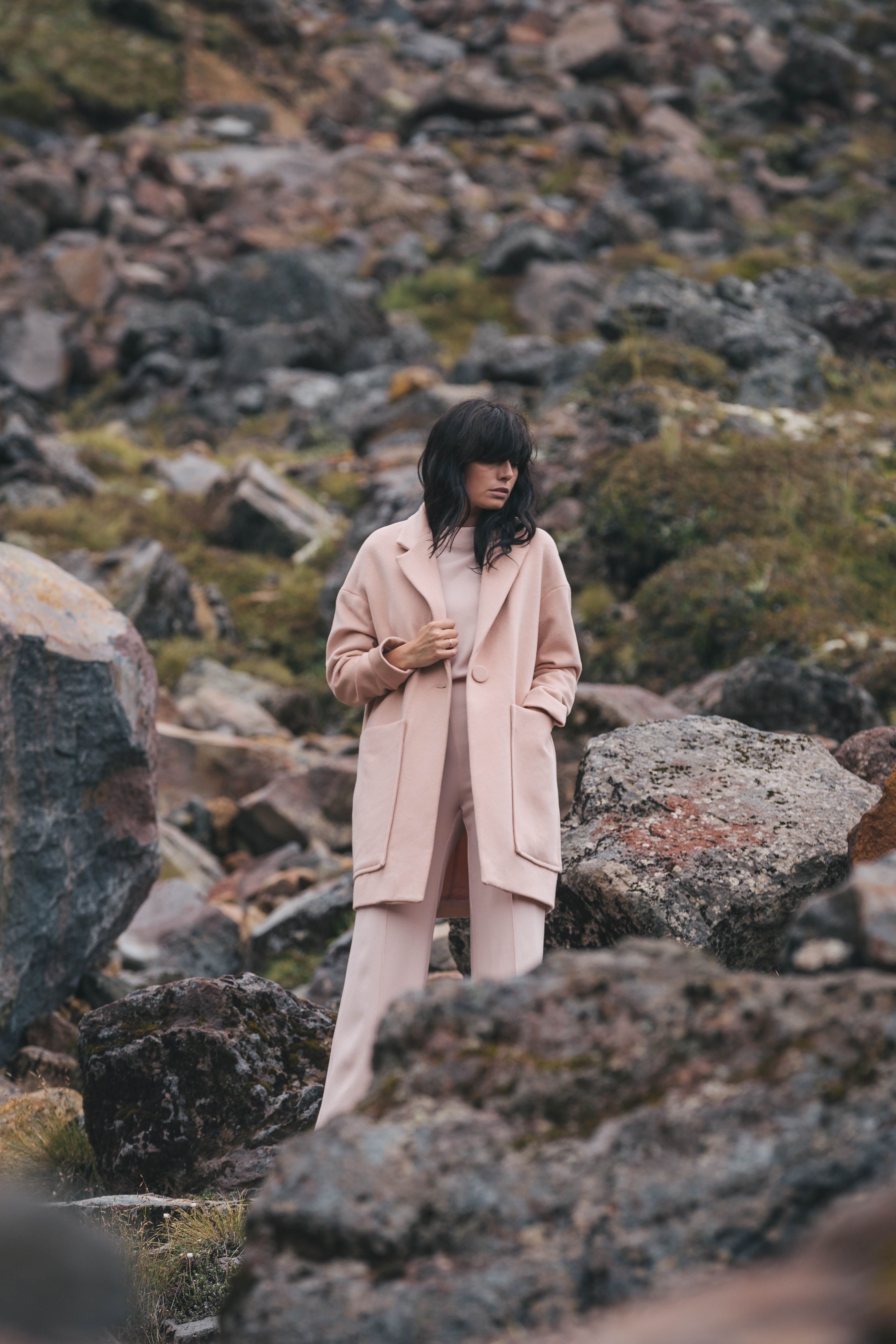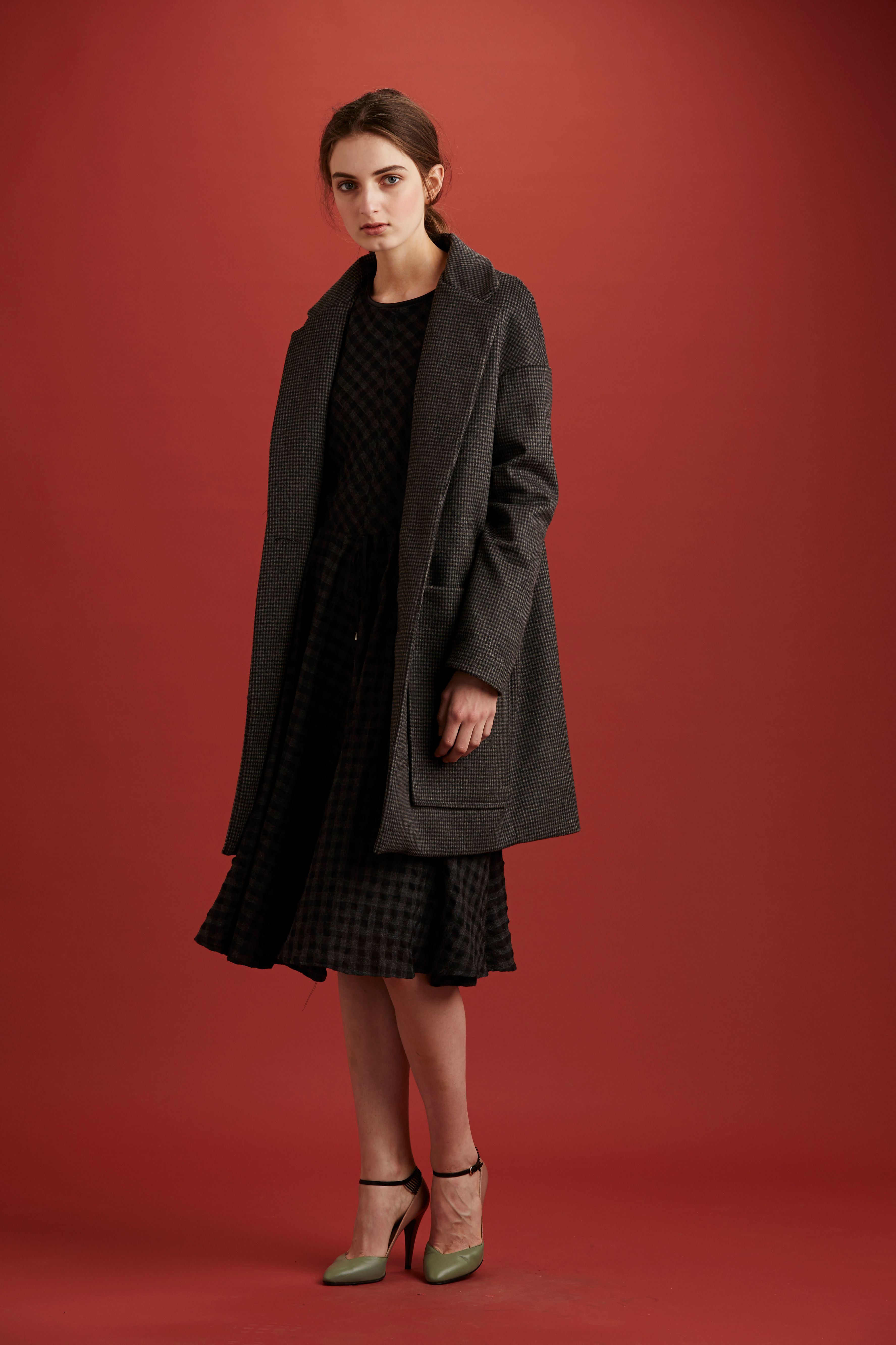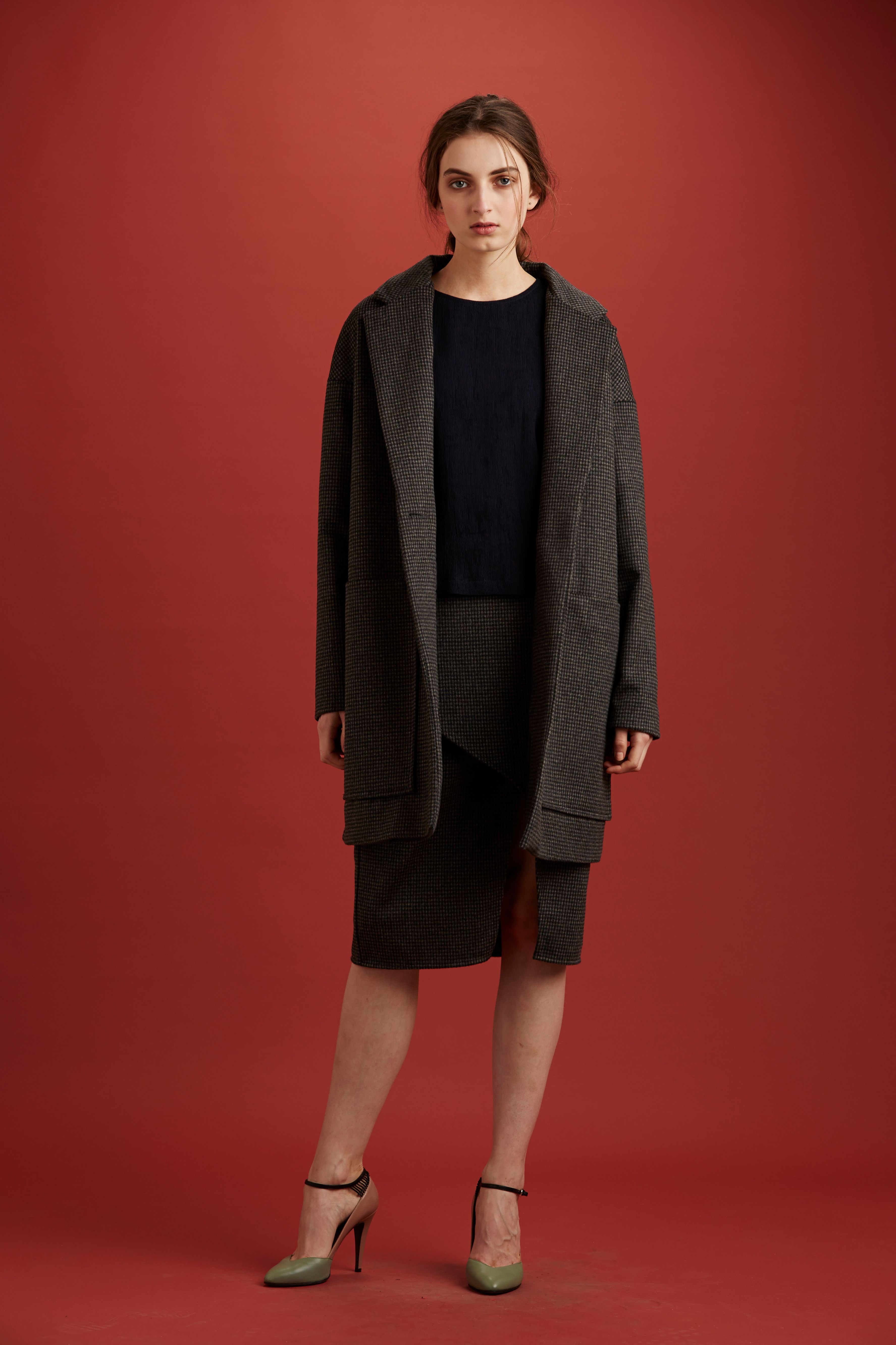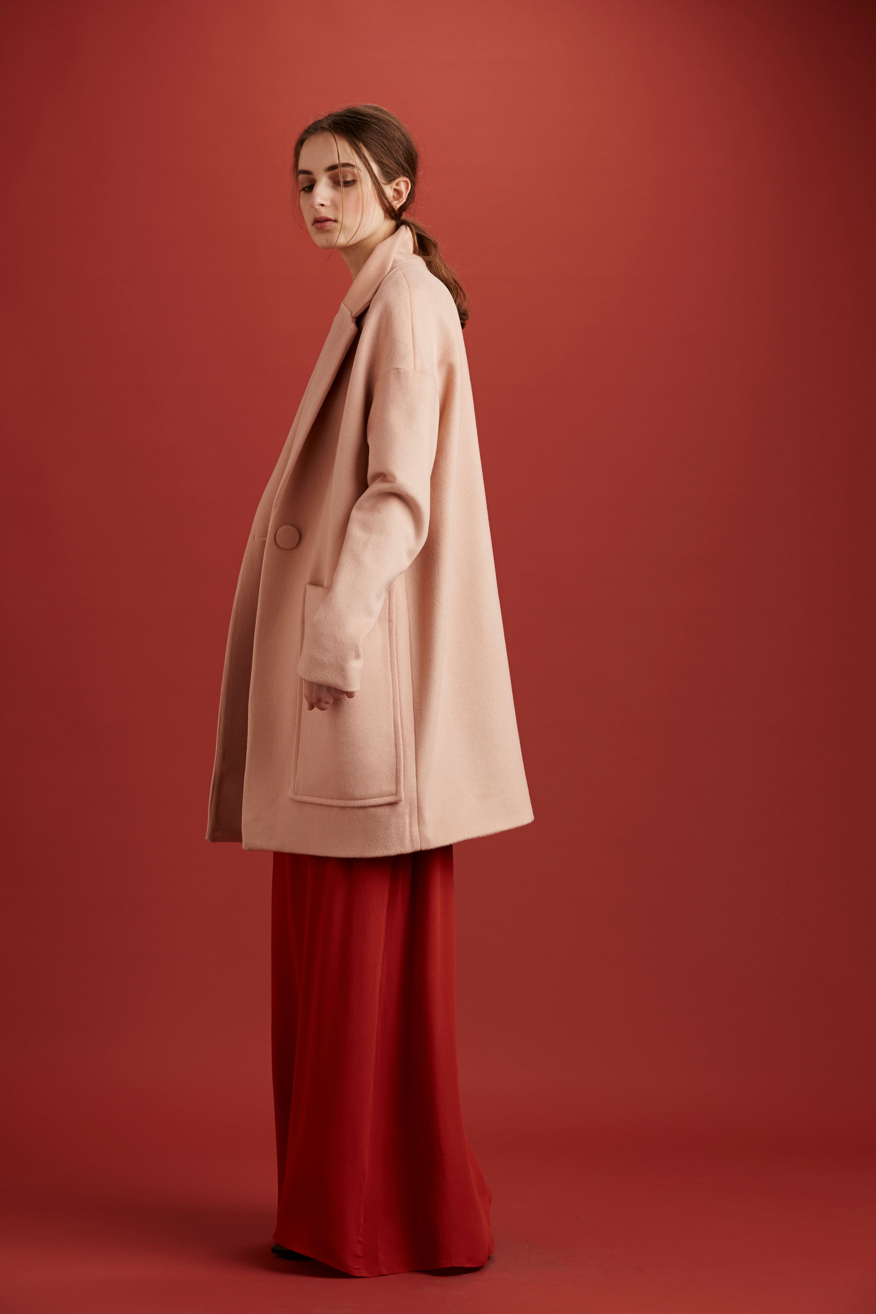 The Newby coat features a dropped shoulders, full sleeves, over-sized pockets and a boxy cut. Large collar wraps around the neck and tracks to the waist. Closed by one large button. The dream coat to wrap up in cold weather.