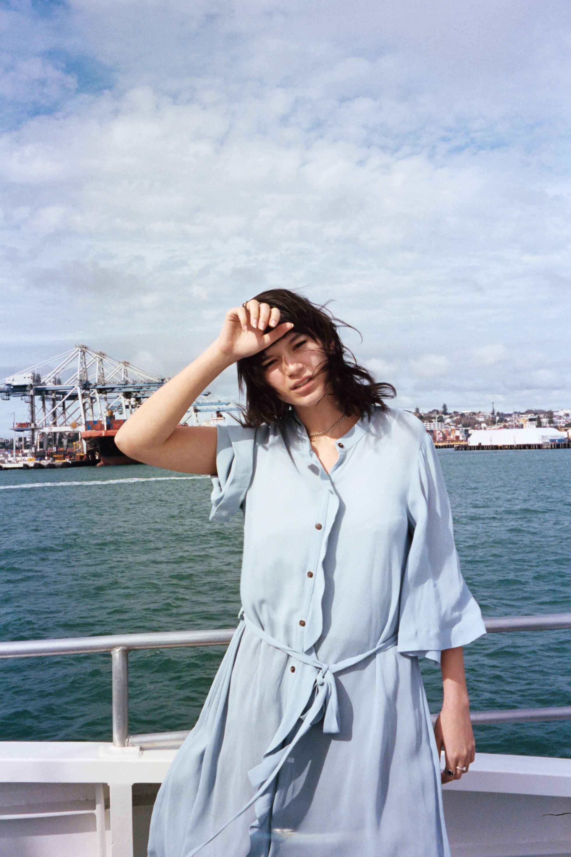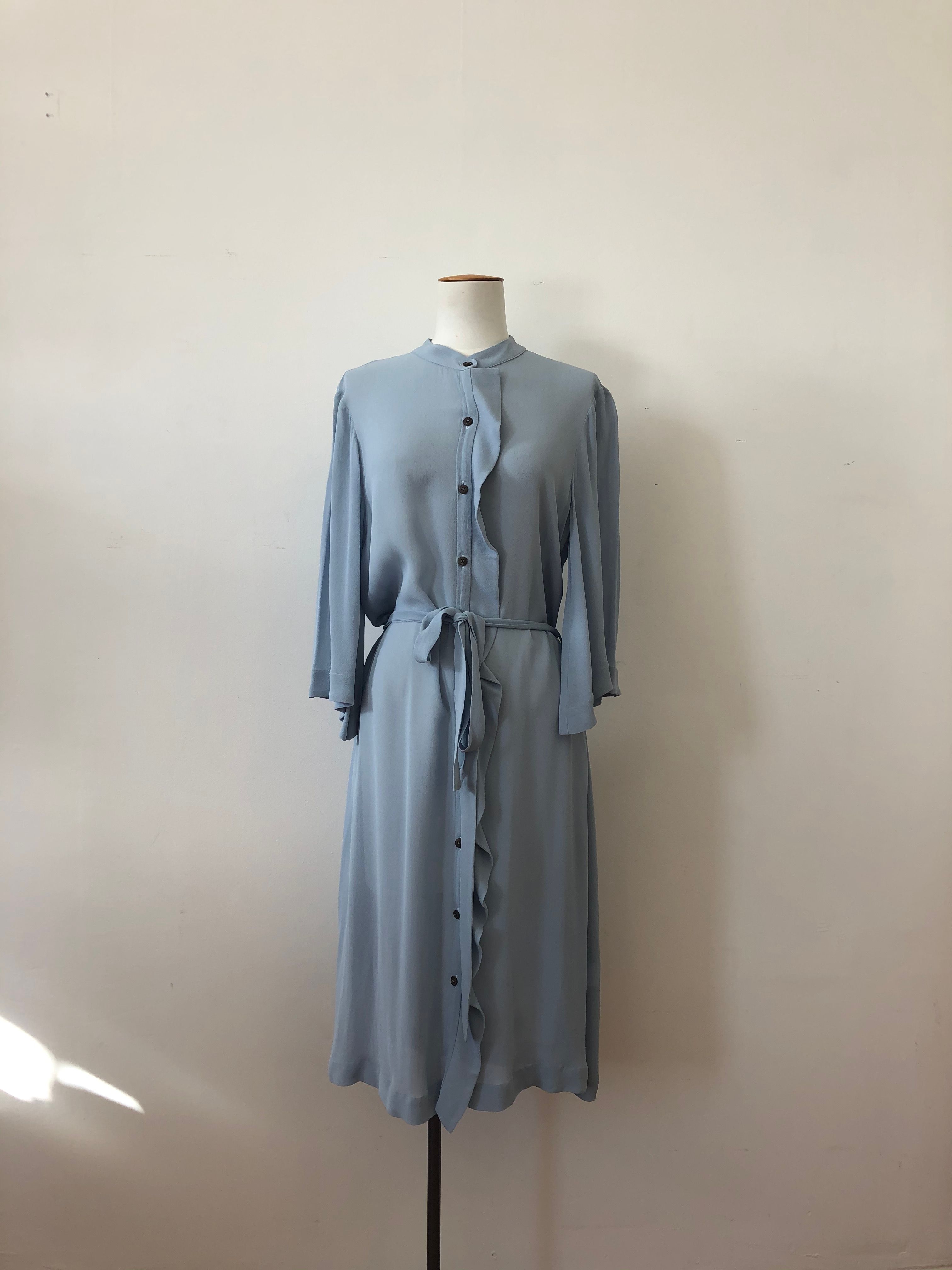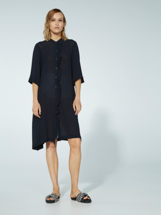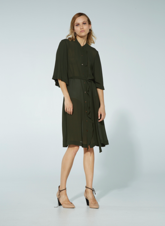 Violetta shirt dress is sophisticated and versatile, in a soft, drapey viscose. Short, rounded collar at the neck. Button down front with gentle ruffle which traces from neck to hem. Ever so flattering flute sleeves that reach to just below the elbow. Features pockets and waist tie. Hem finishes at the knee.