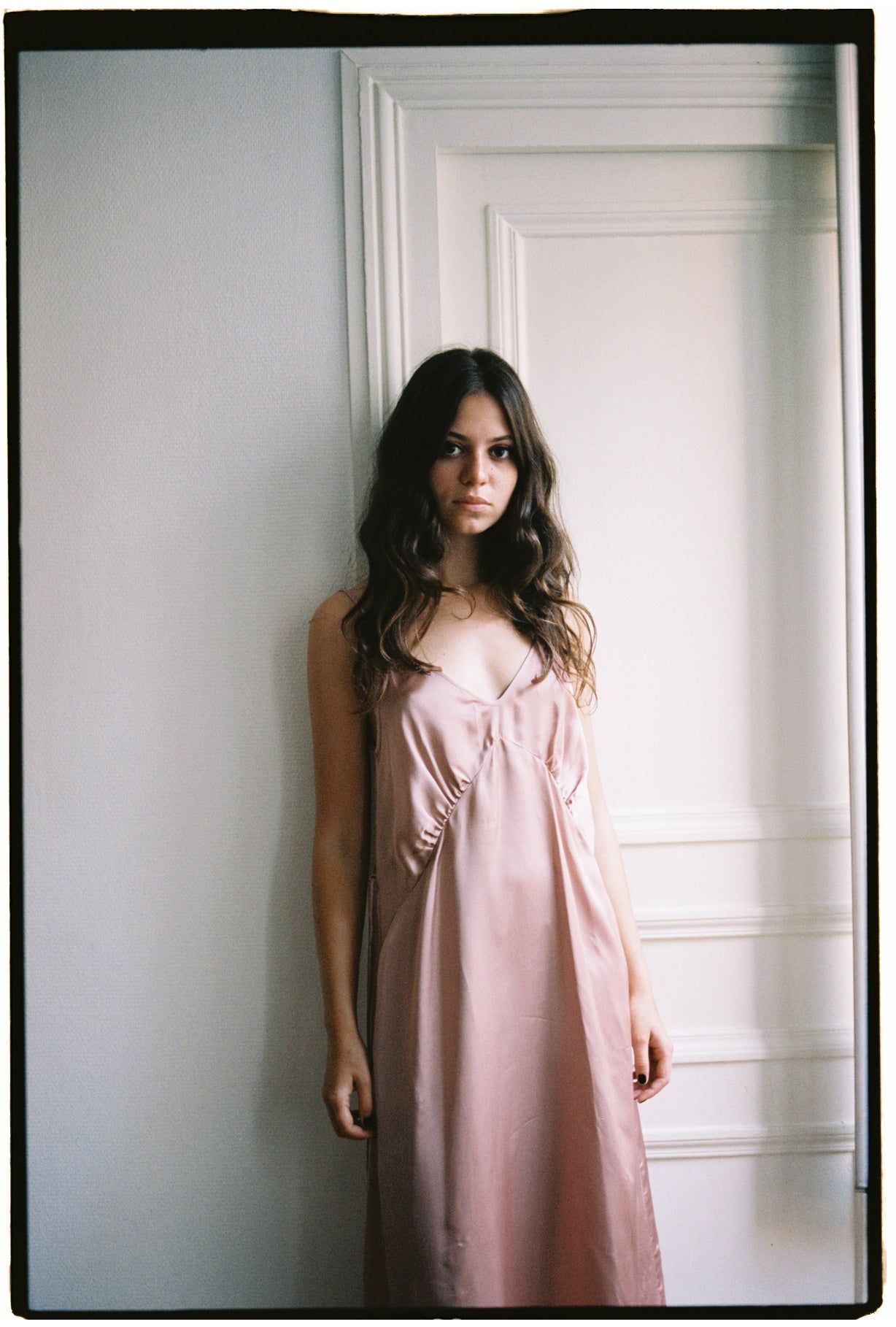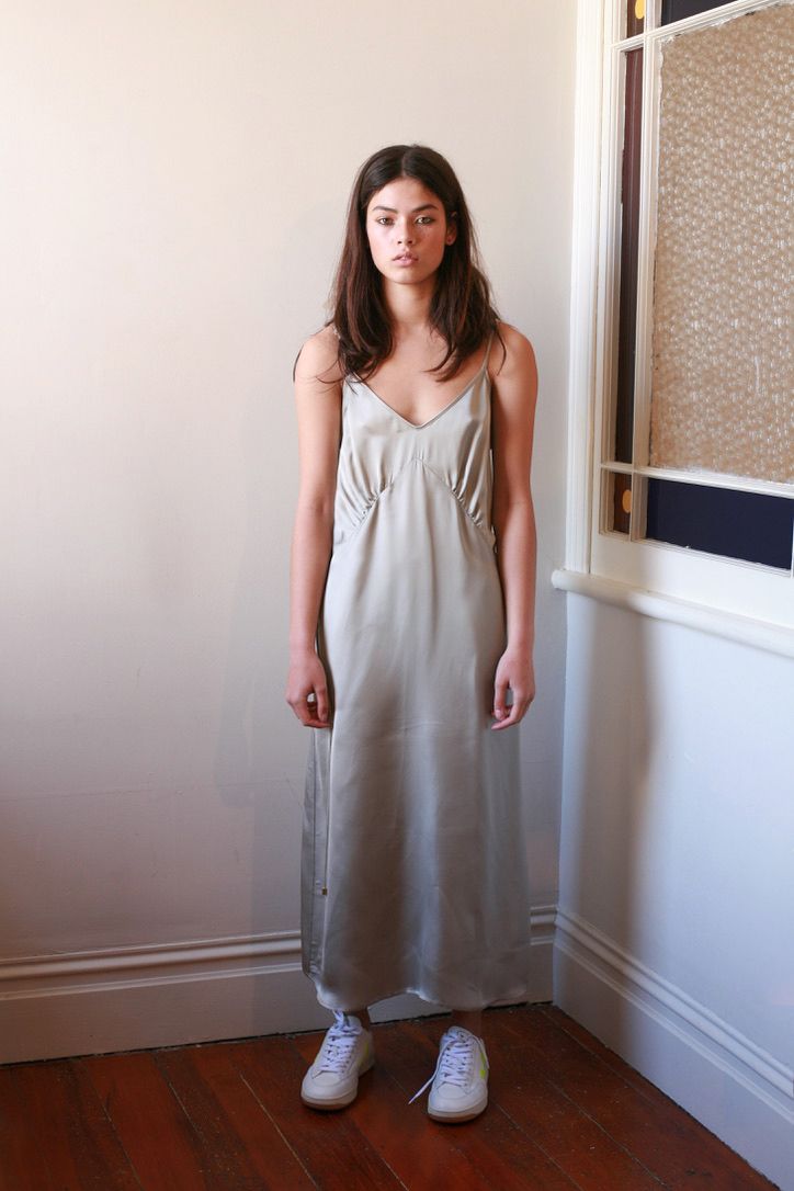 Drapey and romantic in a luxurious fabric. Thin straps and soft V neckline. Seam under bust runs in v shape and flows down to waist line with gathering detail. Ties at back to create more shape at waist. Length falls to mid-shin.