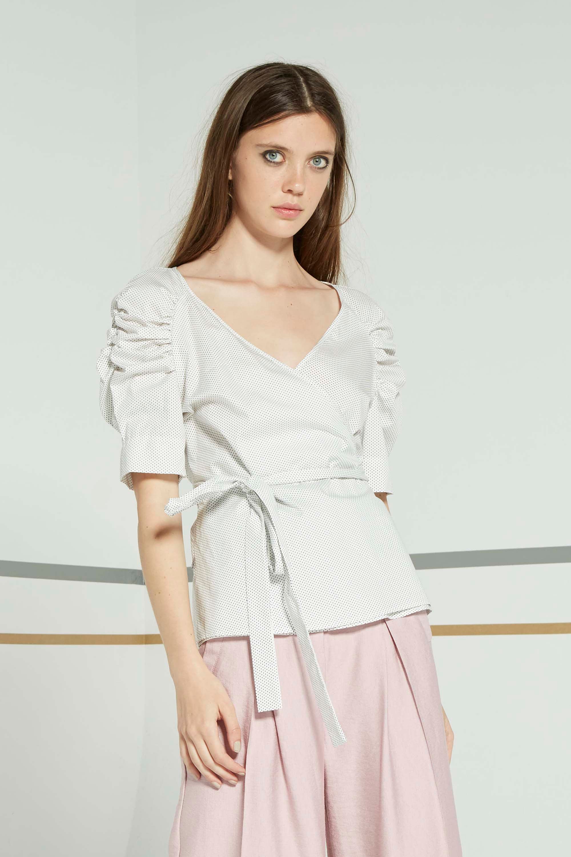 The Bellis top is the perfect summer wrap top. Delicate dot pattern cotton fabric with v-neck. Gathered detailing around edge and centre of sleeve to create a lightly volumus shape. Falls to ¾ sleeve length. Hem finishes at hips.