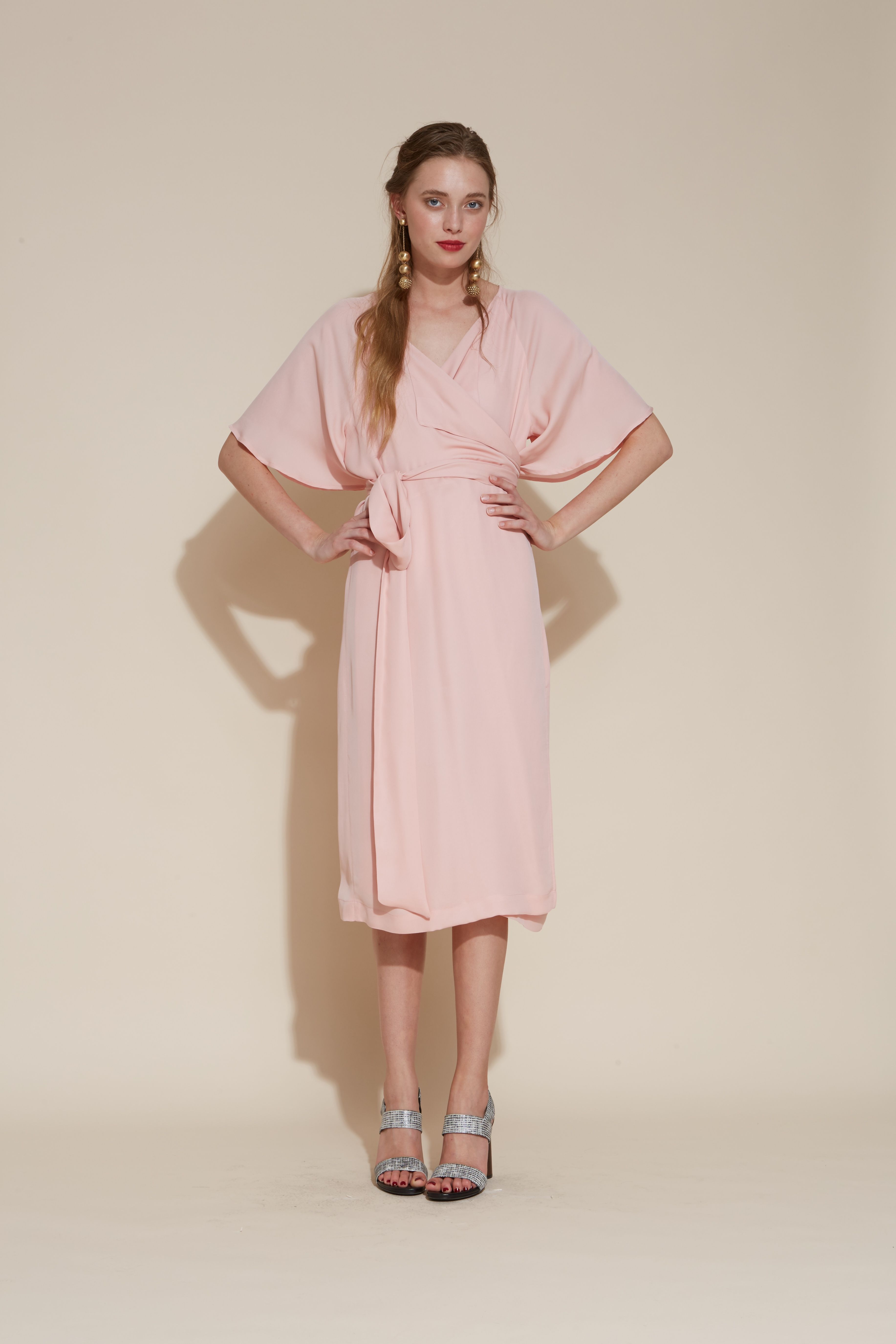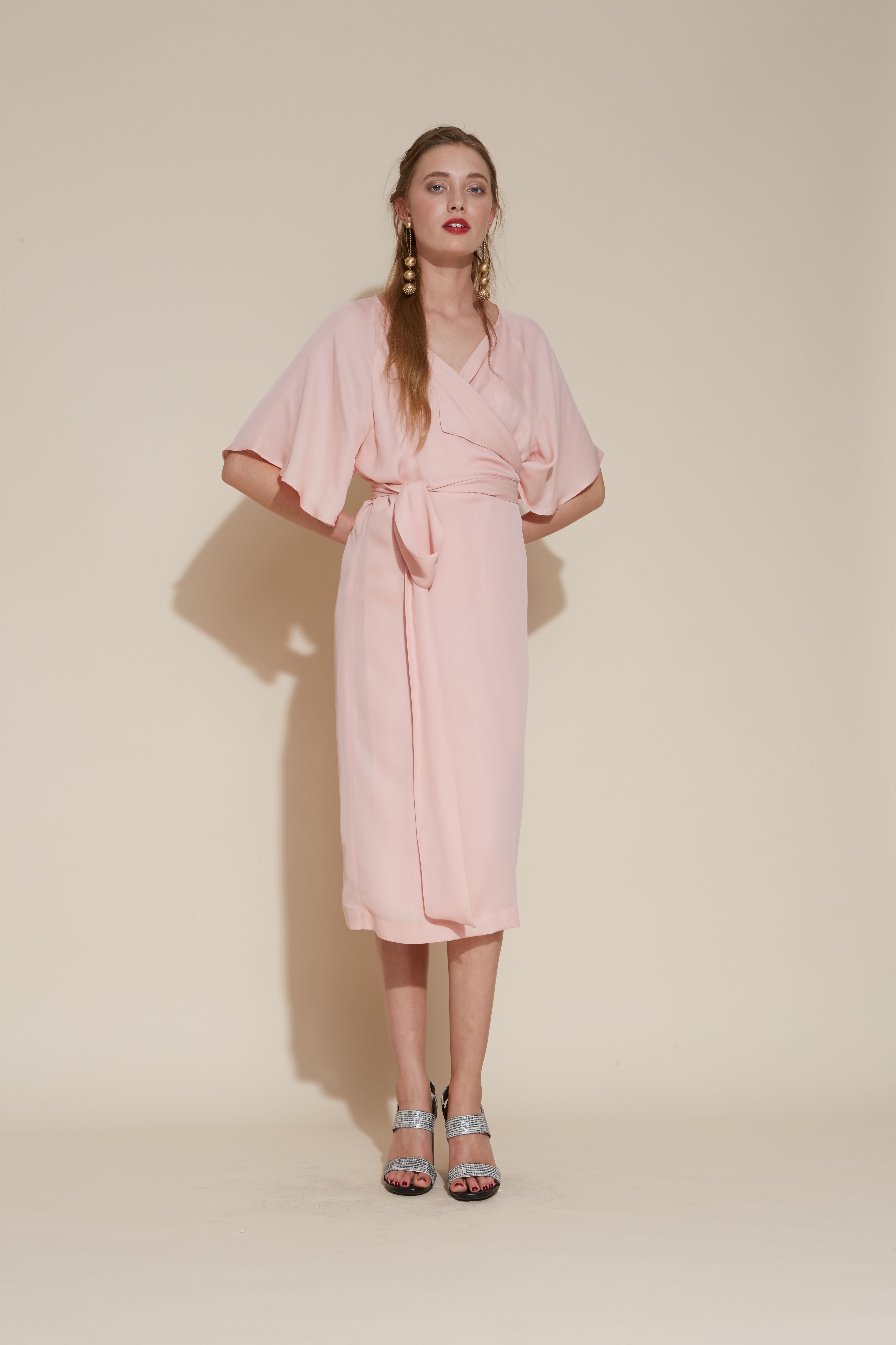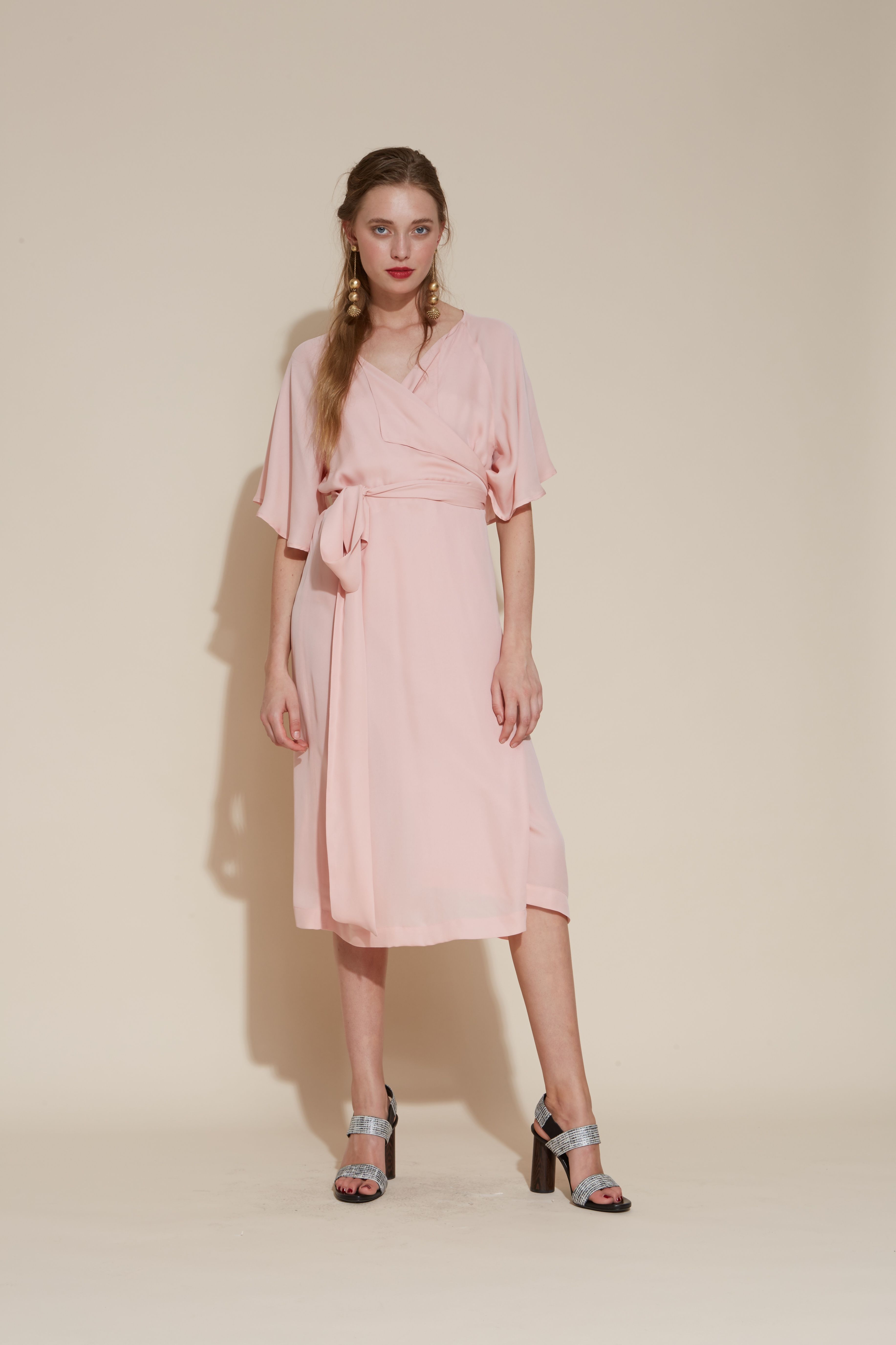 A romantic wrap style dress with wide waist tie. Beautifully light flute sleeves sit gently over the shoulders and fall just shy of the elbow. Skims over the hips and hem finishes just below the knee.