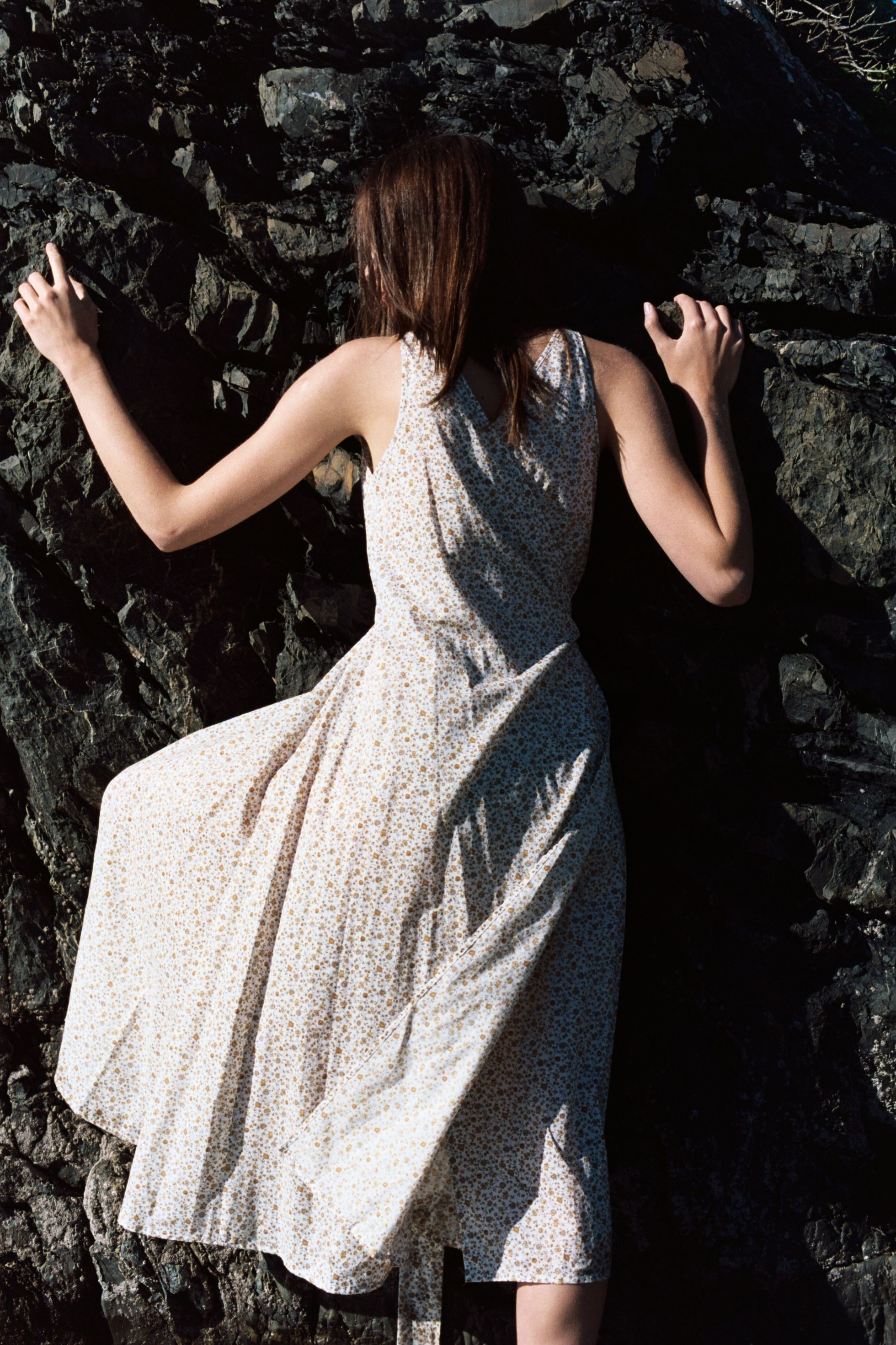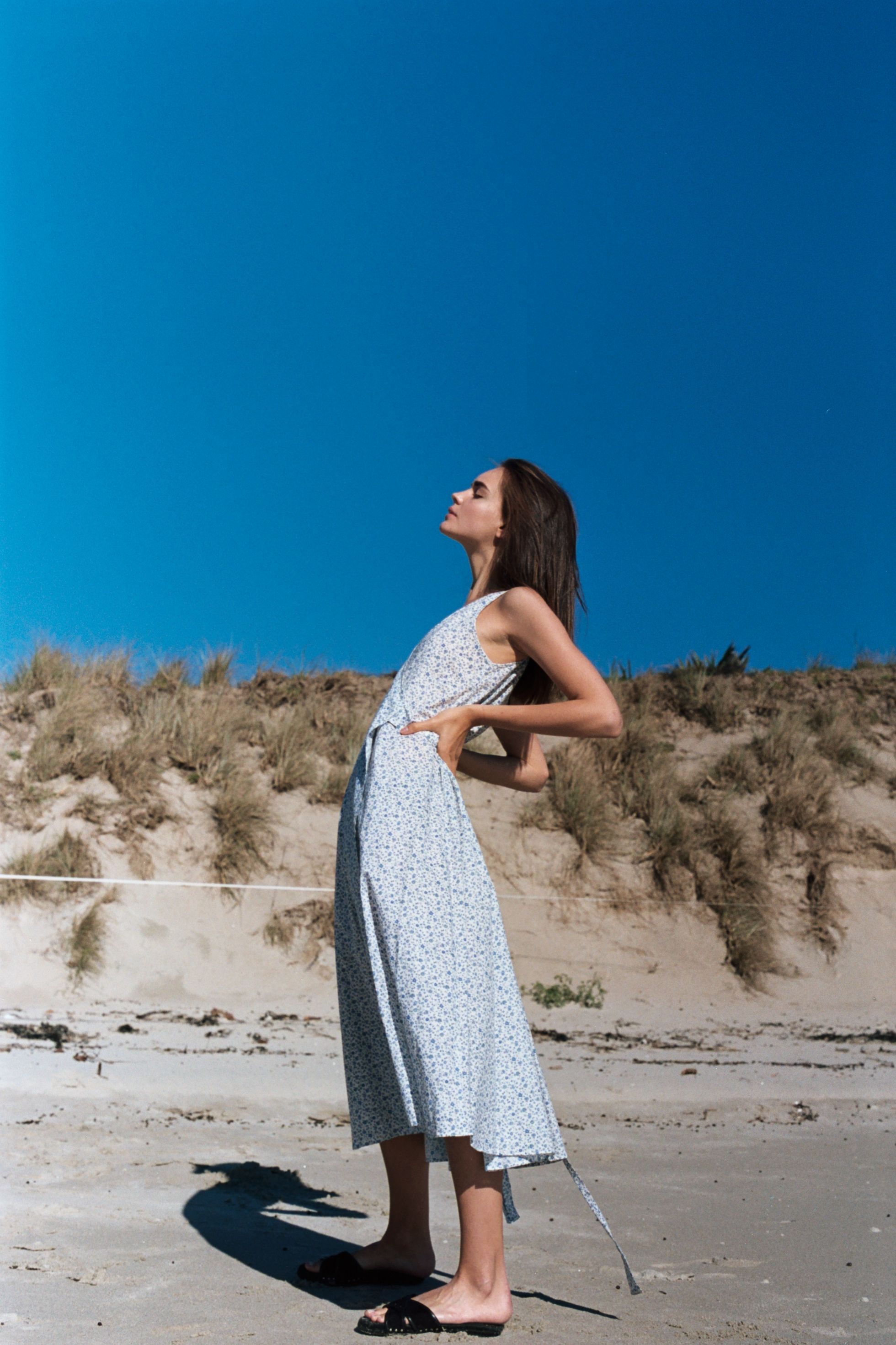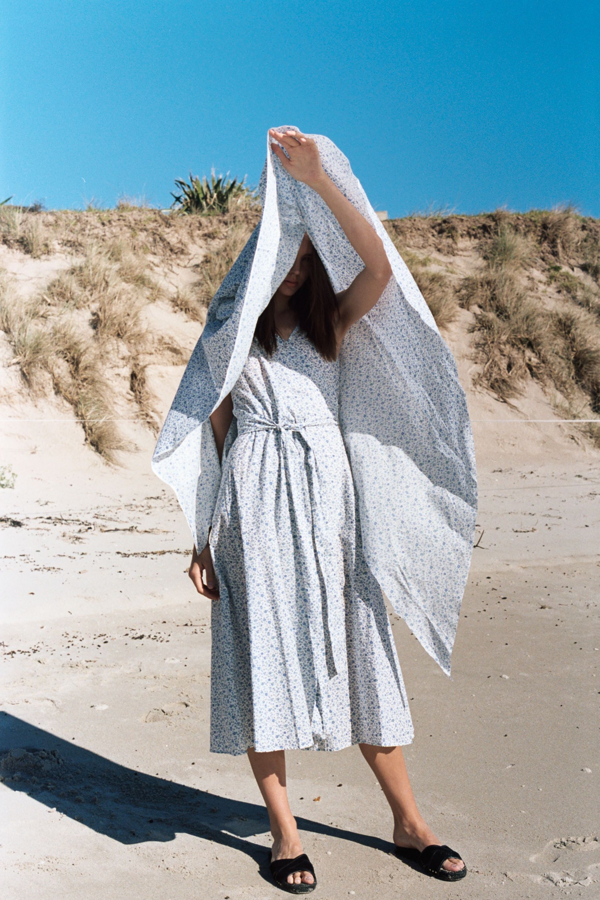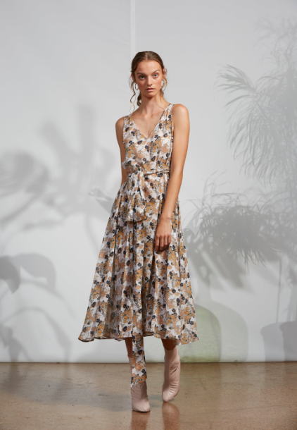 A mid calf wrap dress. Features beautiful large gathered ties at waist and shallow V neckline. Reversible- wear crossed at the front or back. Seams trace from shoulder to hem and add subtle volume to the skirt.