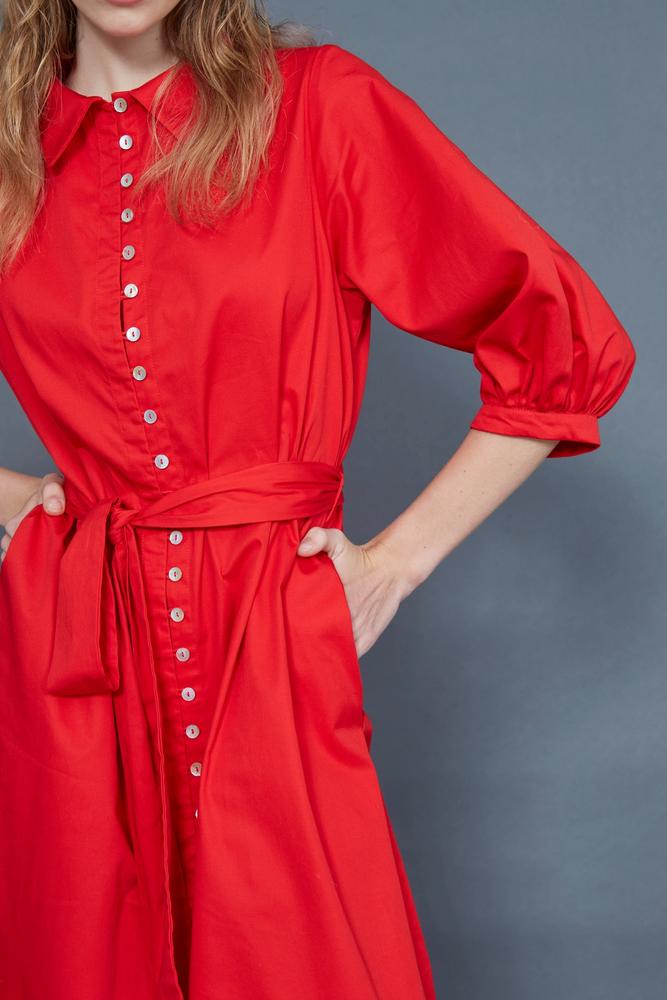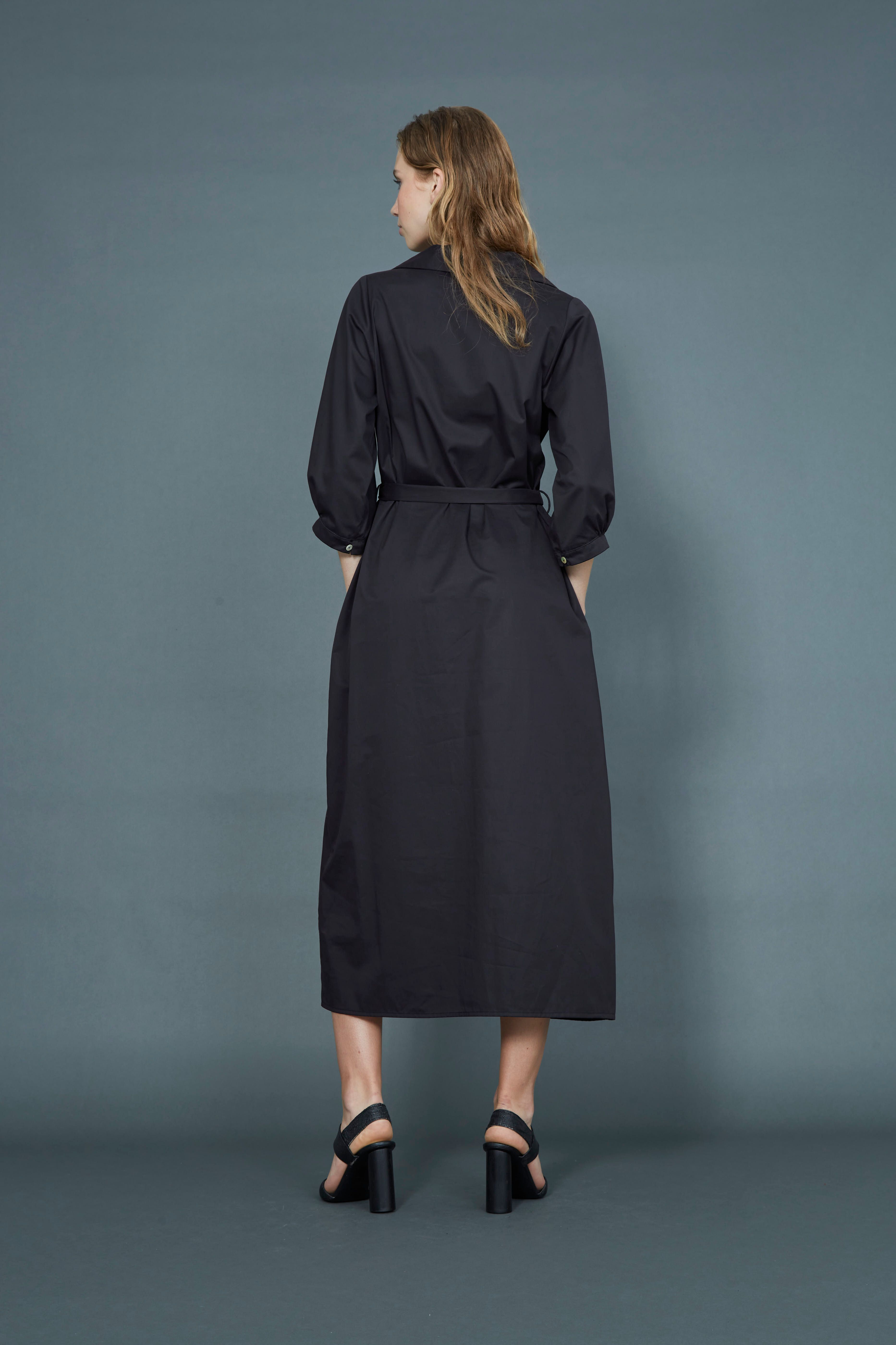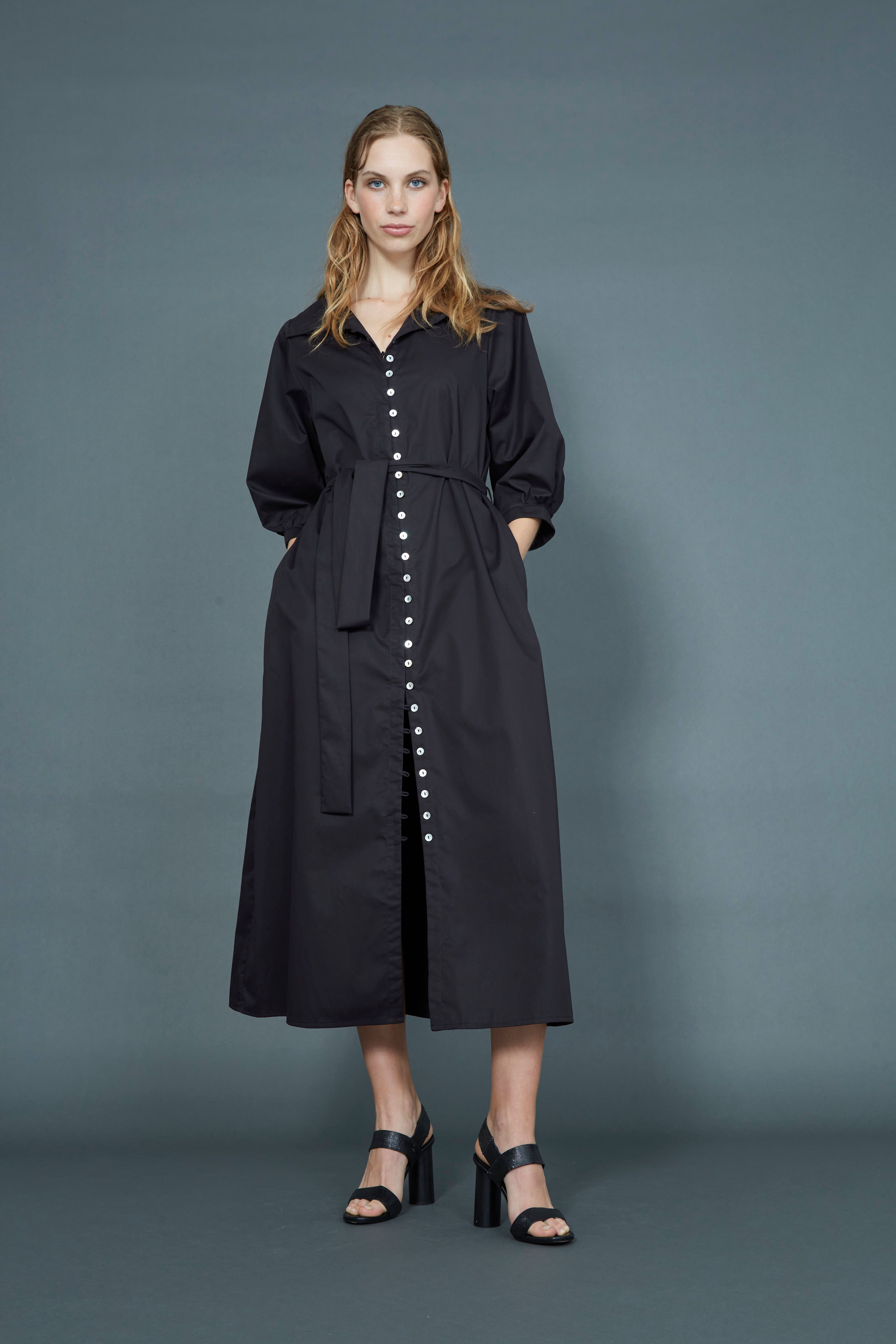 Relaxed shirt dress Sleeve is gathered into cuff Looped button-down Pockets Waist tie Finishes mid-calf