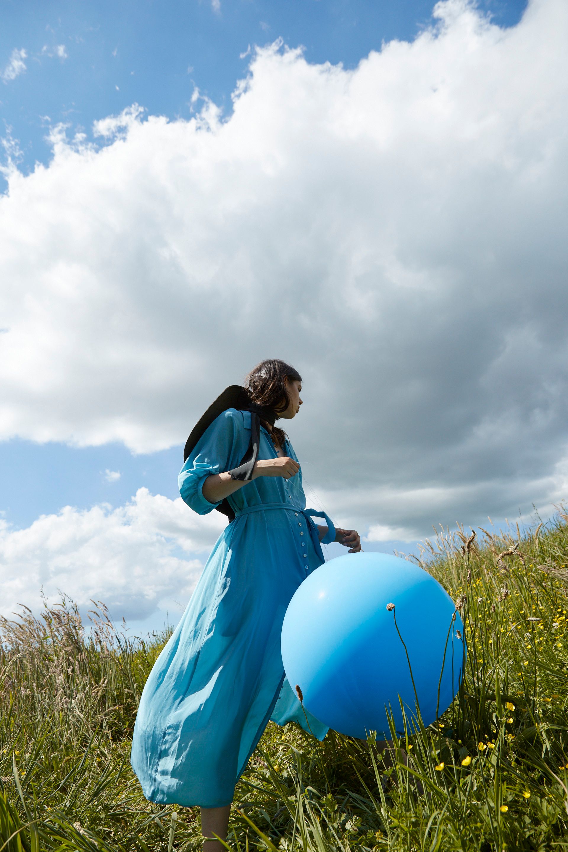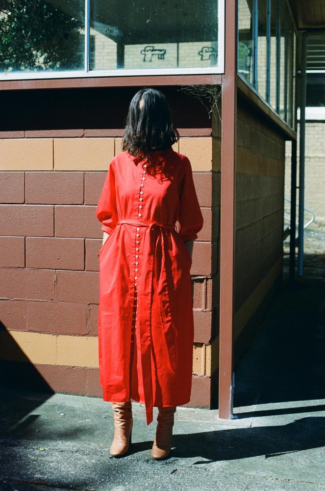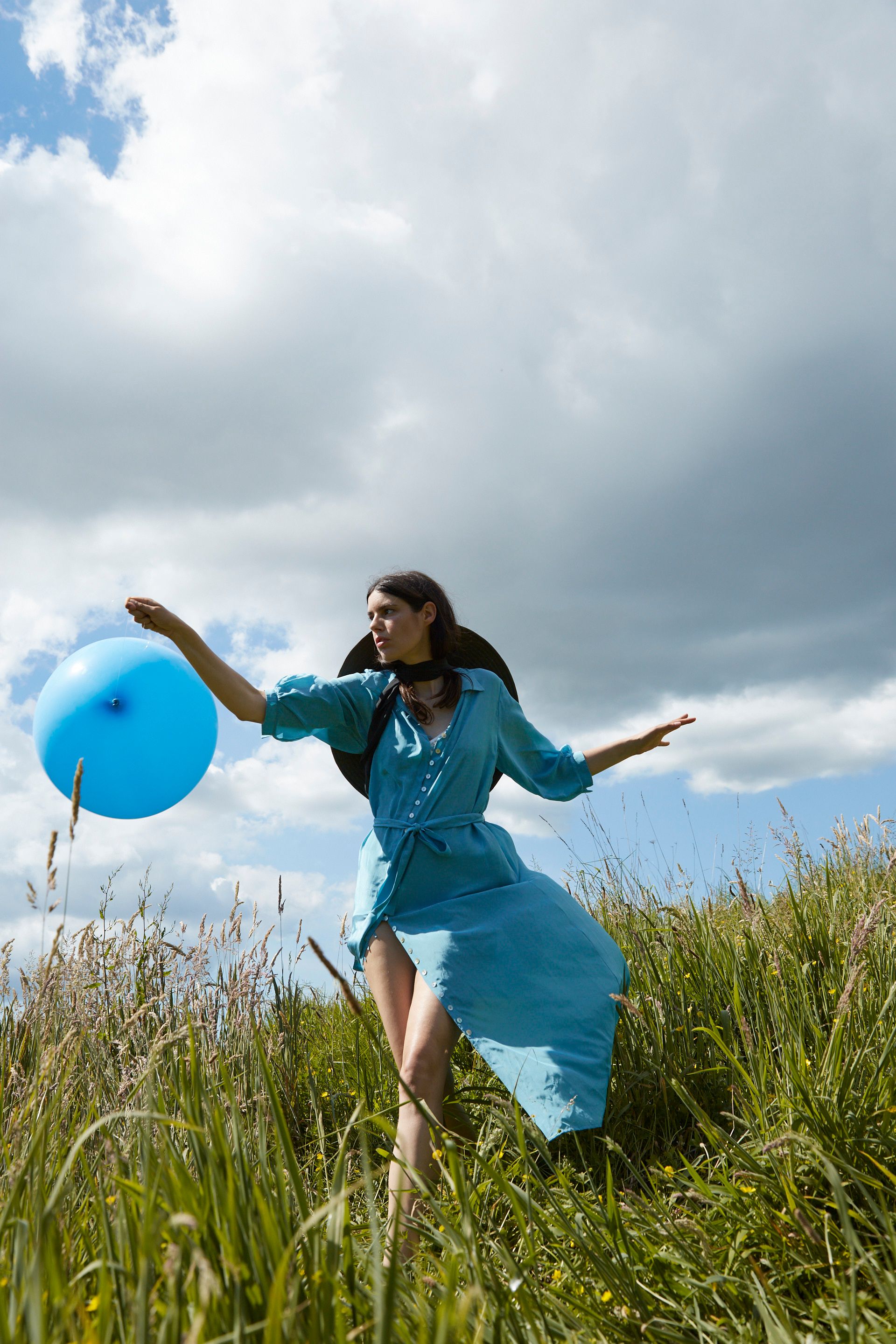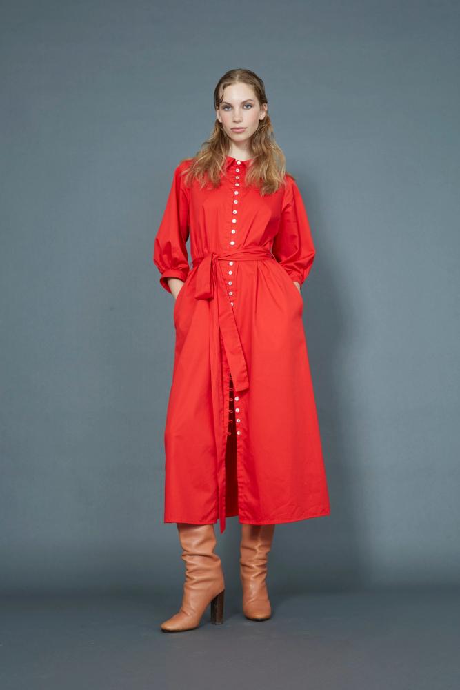 Relaxed shirt dress Sleeve is gathered into cuff Looped button-down Pockets Waist tie Finishes mid-calf