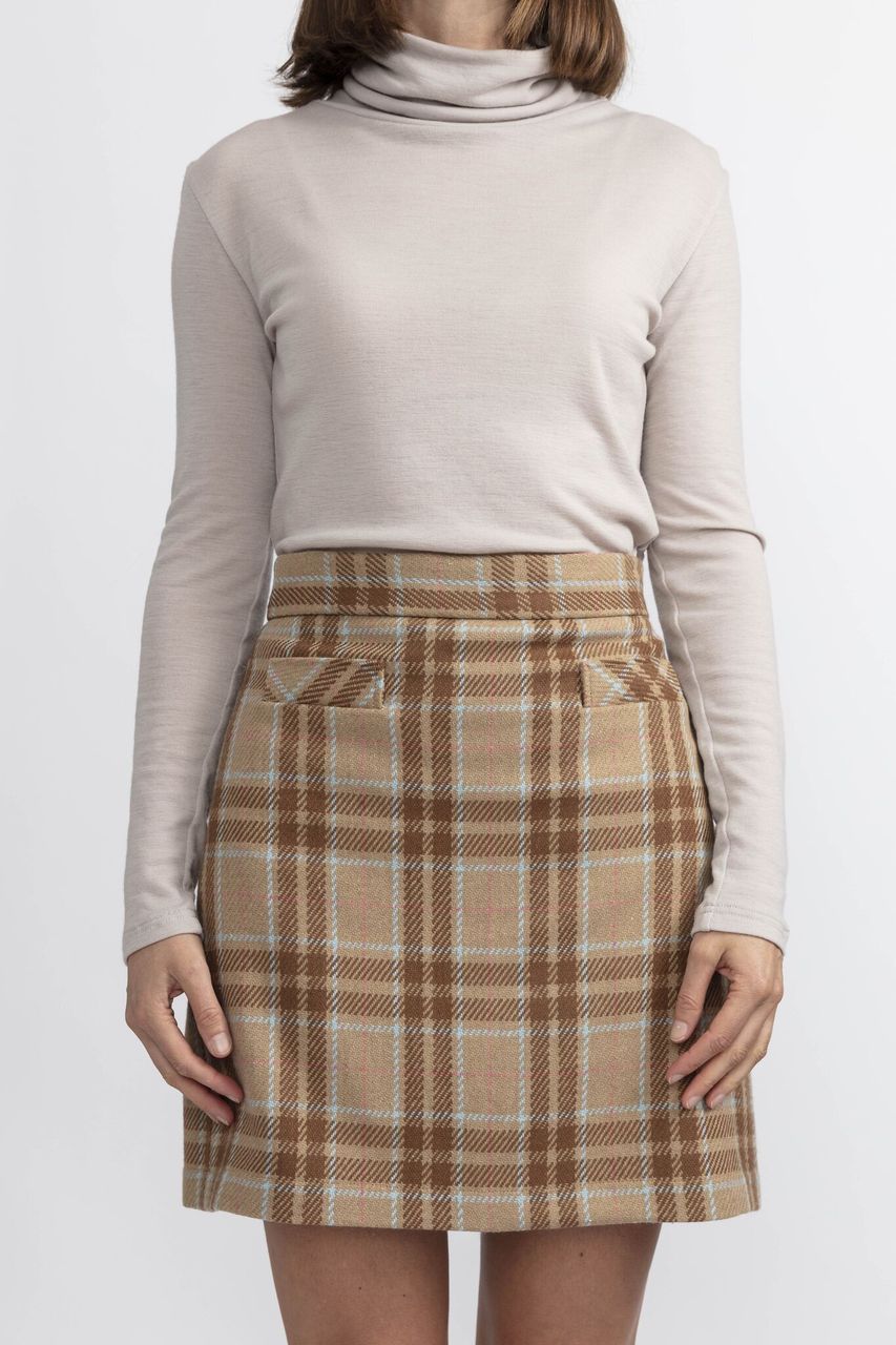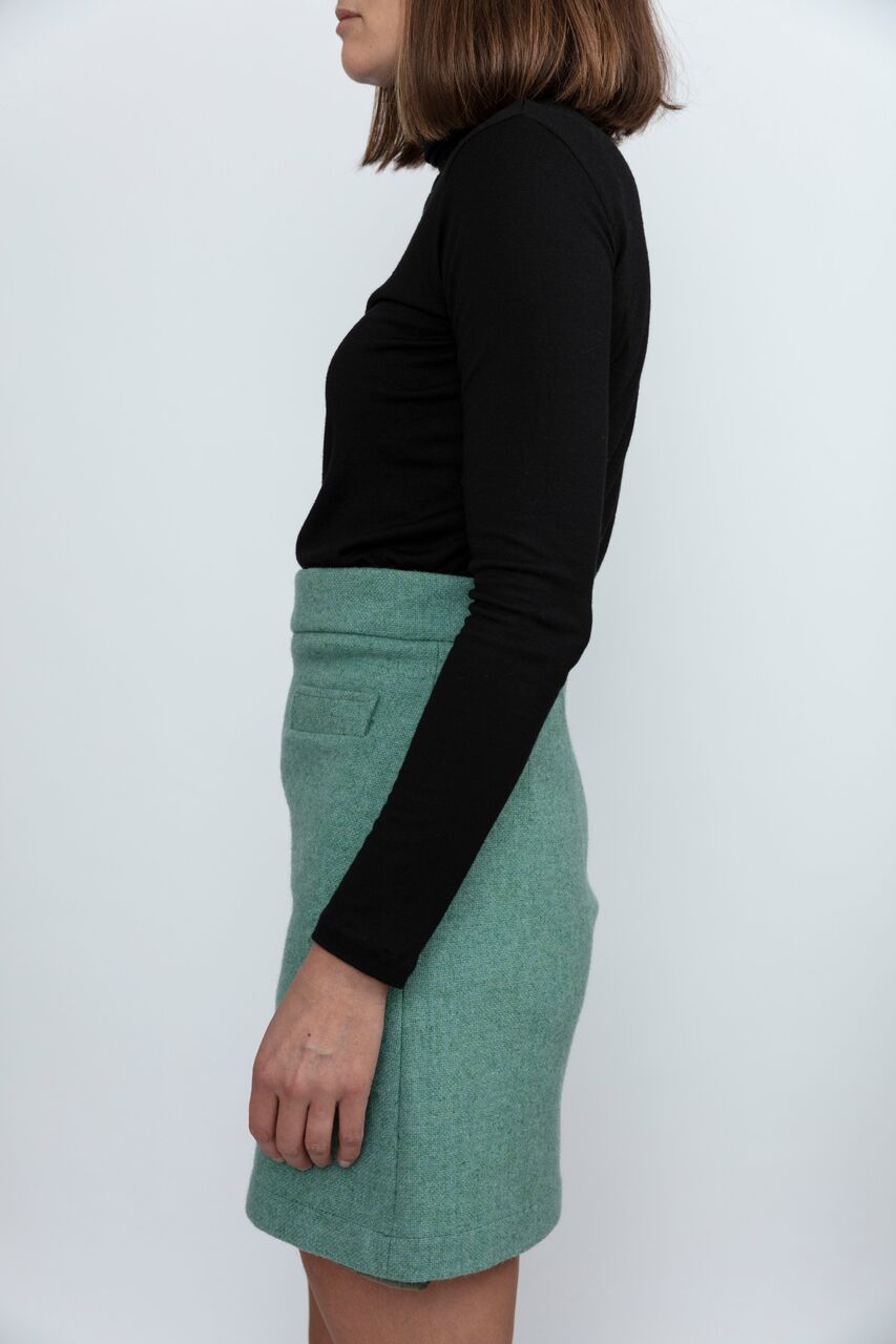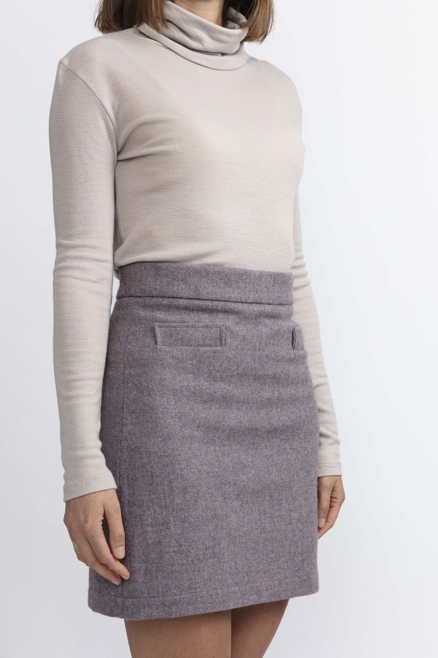 The Cellini skirt sits high on the waist and falls to the mid-thigh. Winter weight in a warm wool. Fully lined. Wide waistband with zipper at back. Pocket details sit on each hip. Smooth over the hips