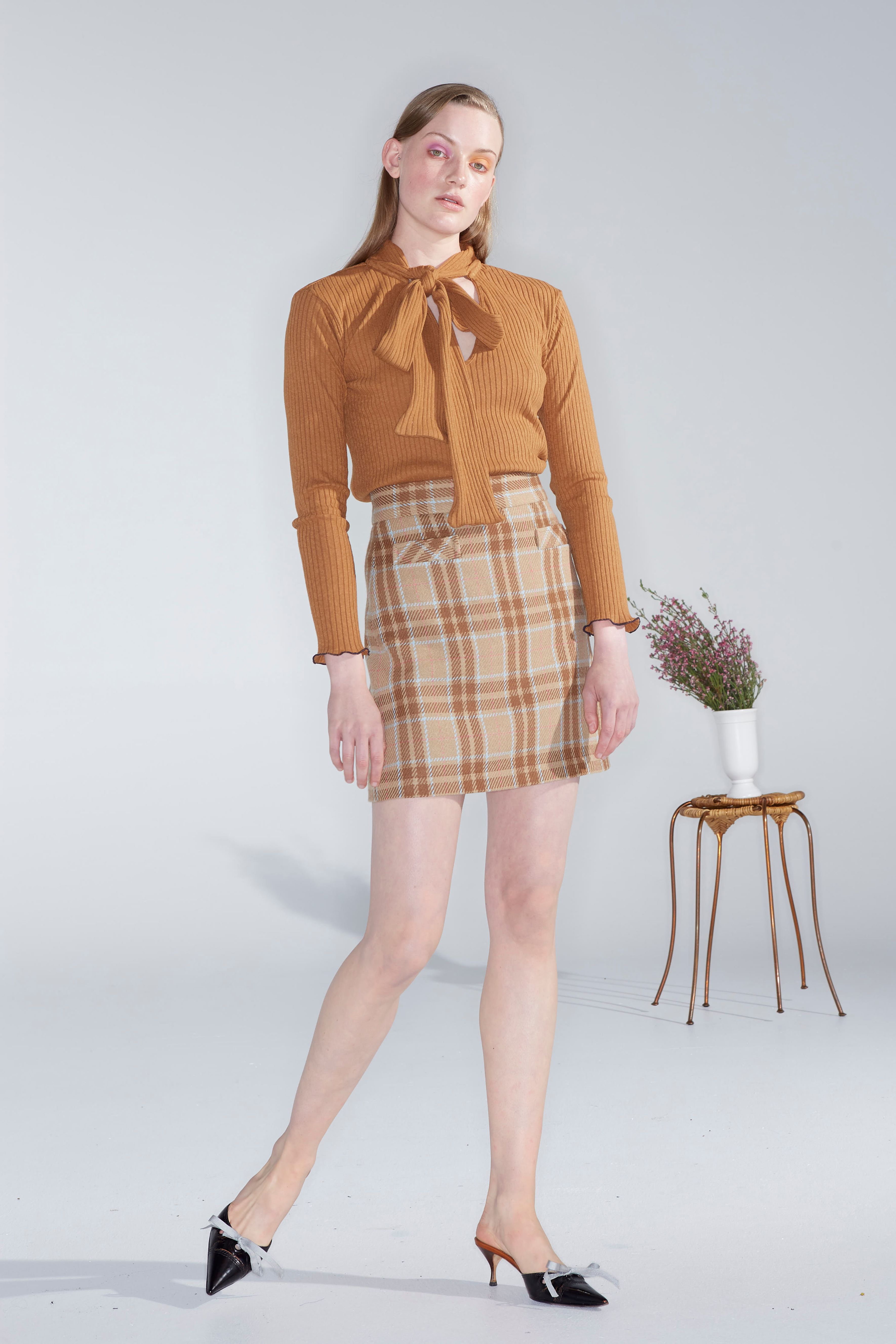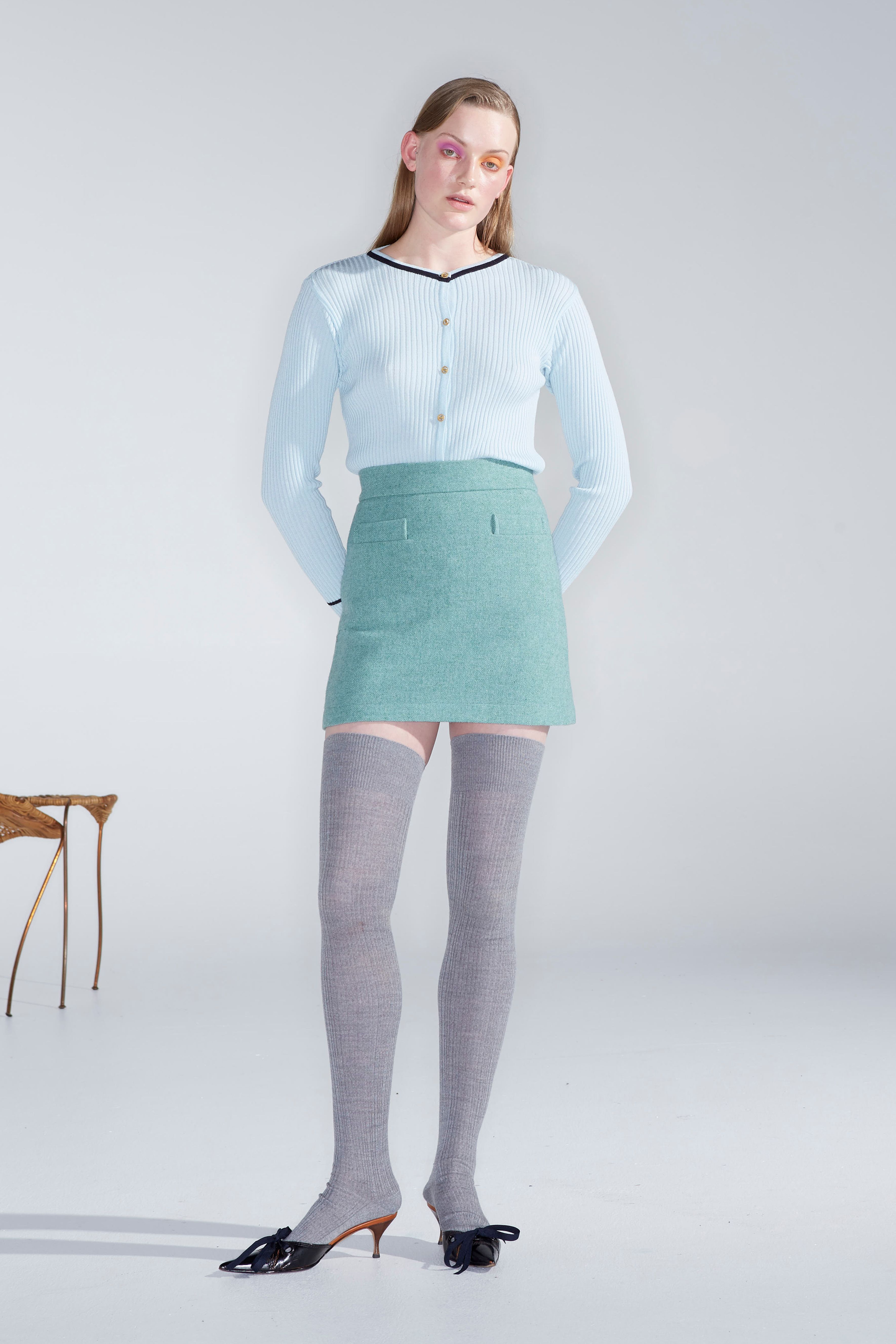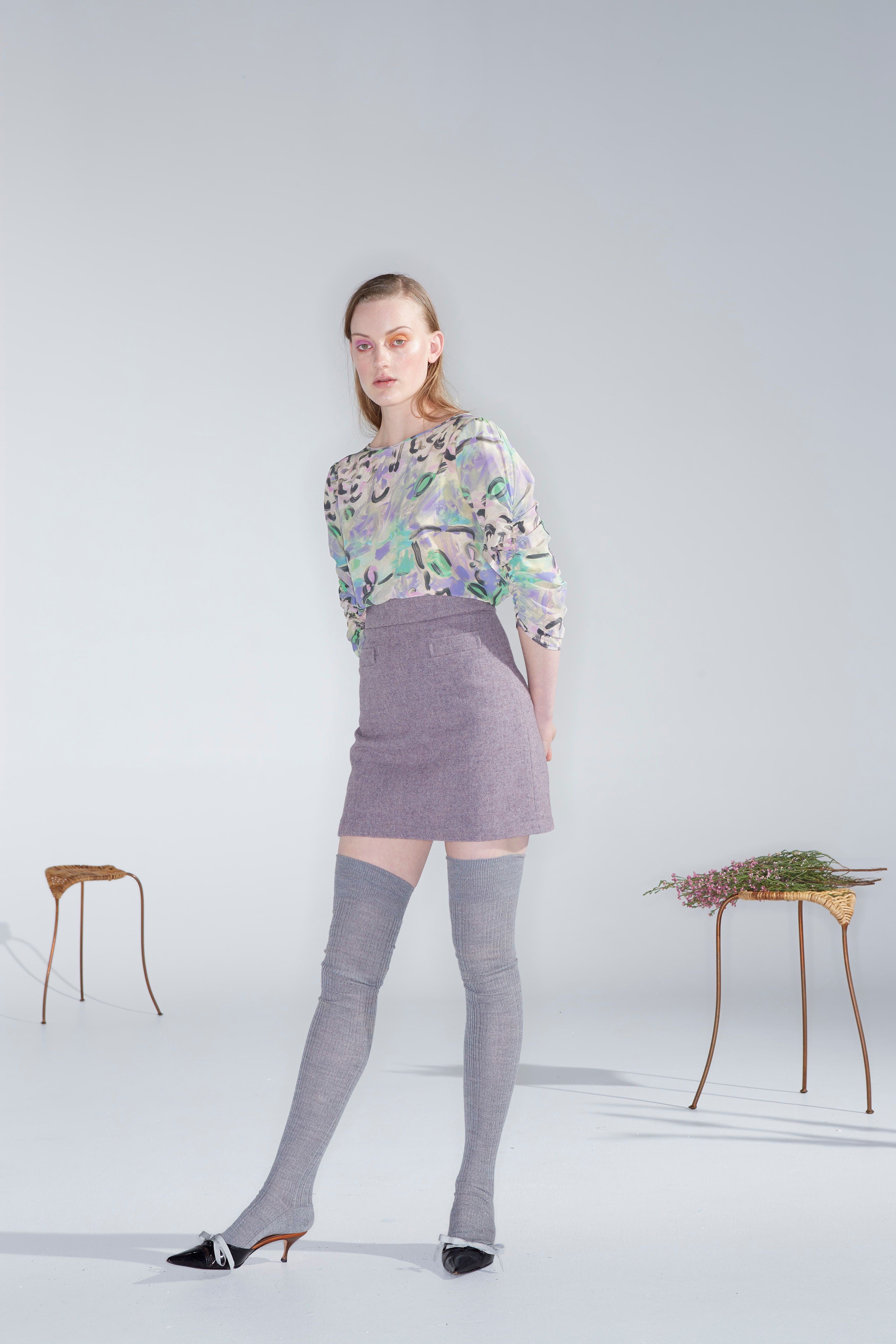 The Cellini skirt sits high on the waist and falls to the mid-thigh. Winter weight in a warm wool. Fully lined. Wide waistband with zipper at back. Pocket details sit on each hip. Smooth over the hips