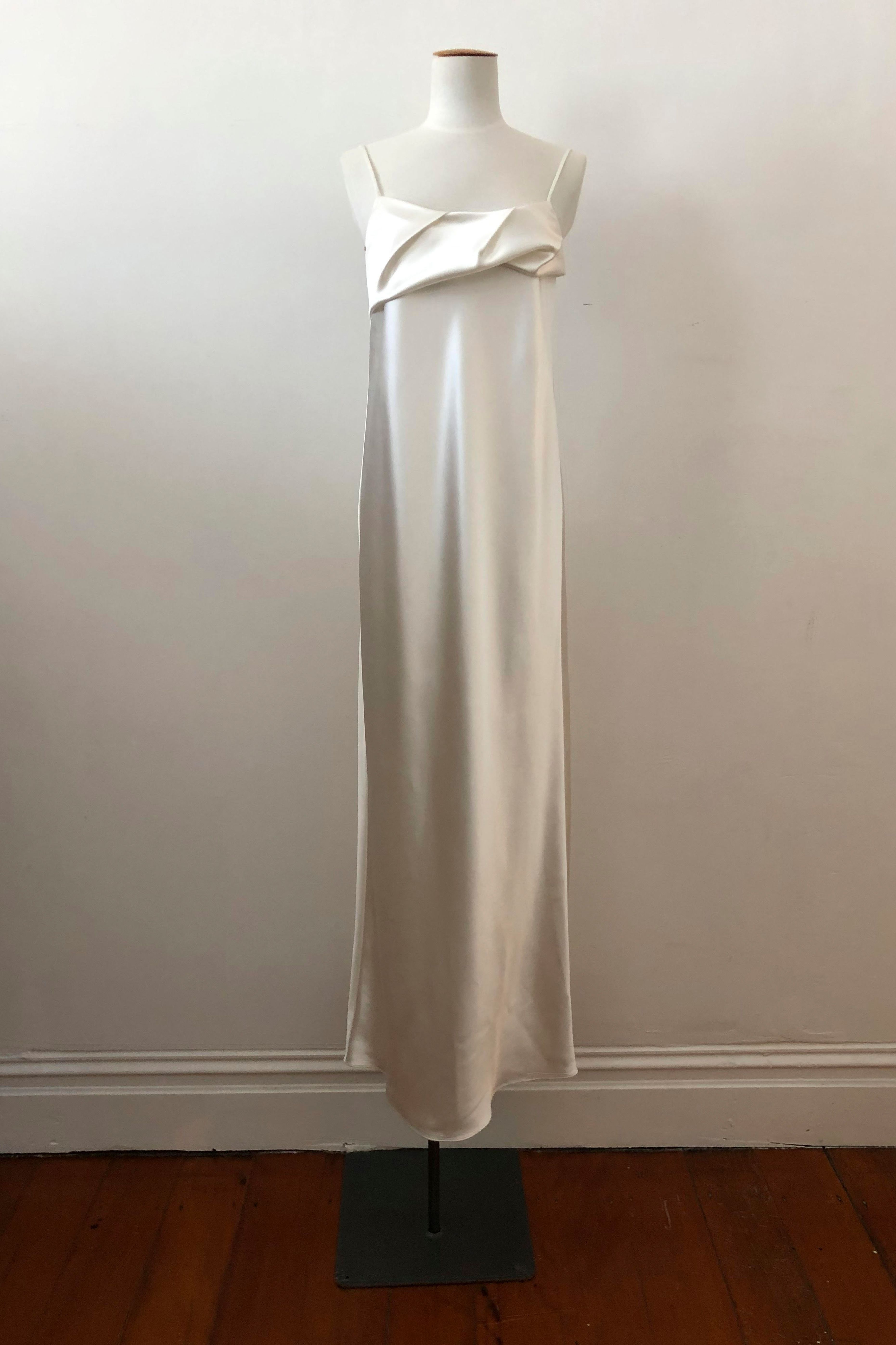 Sleek, pared-back elegance with the Otherness Dress. Fine, adjustable spaghetti straps, this bias-cut silk skims the body gently with hem falling to the mid shin. Folded bias fabric detailing at the bust.
