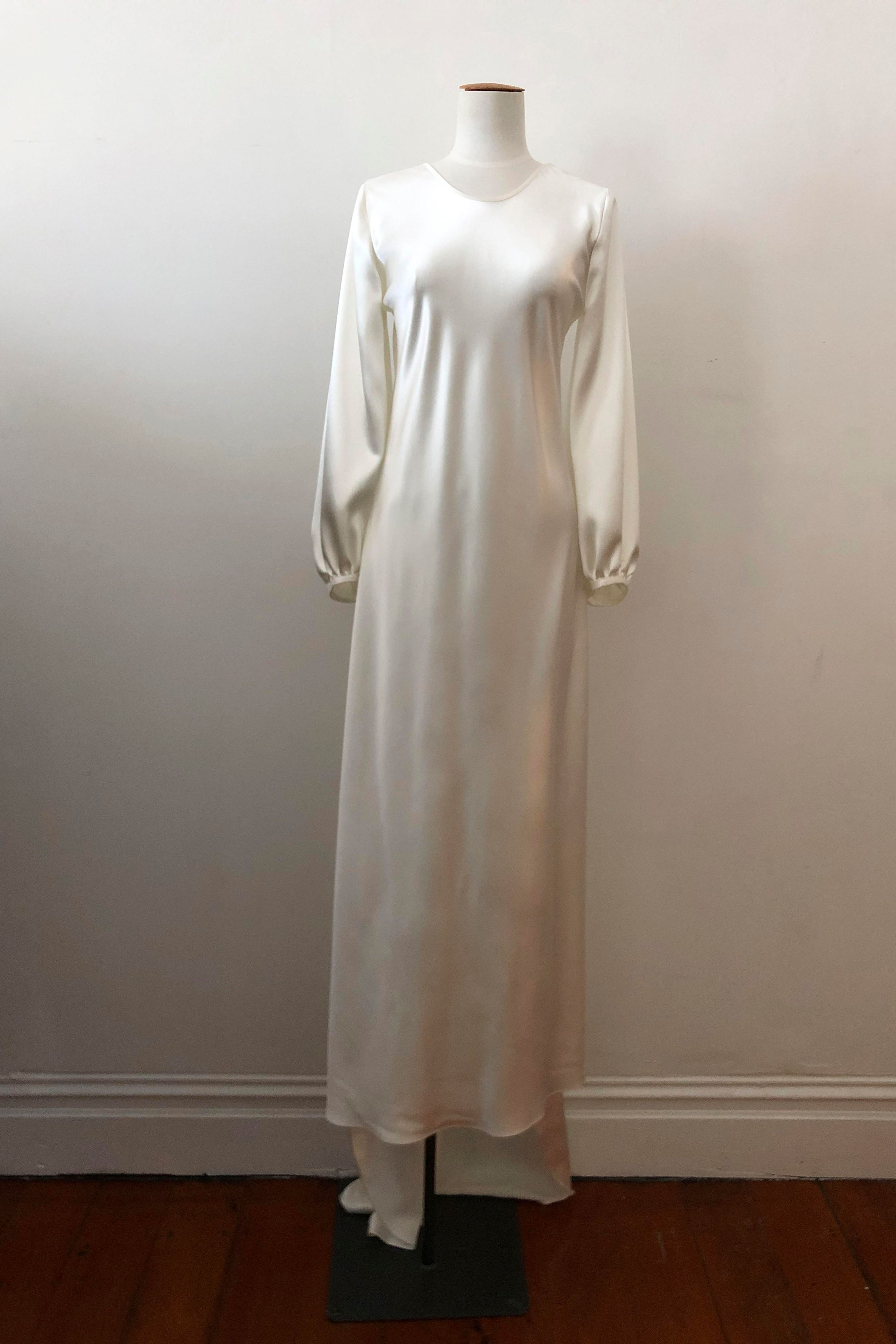 Elegance and simplicity with the Angel dress, cut on the bias shaping to the body. Full length billowy sleeves and tapered cuff with soft elastic to fasten. Round crew neck with lower scooped back with a tie across the back neck.