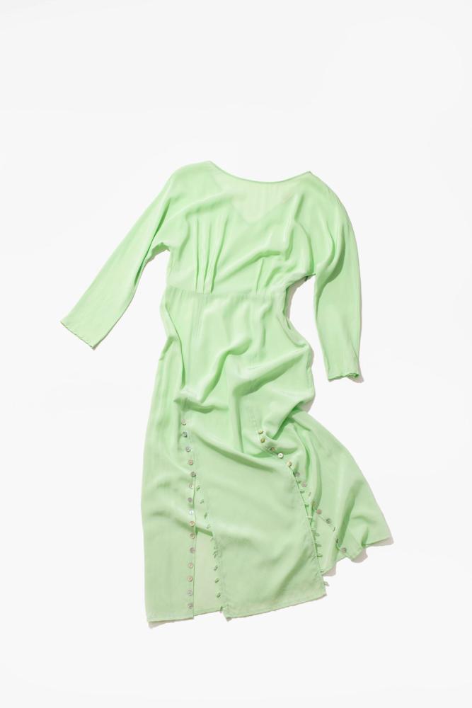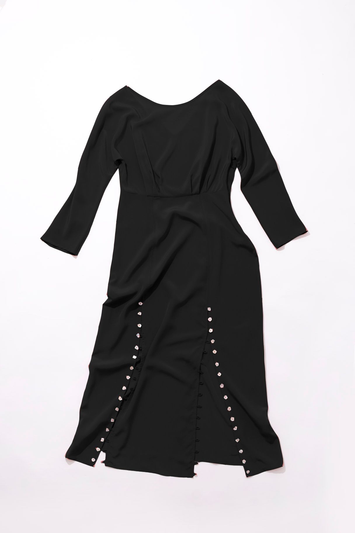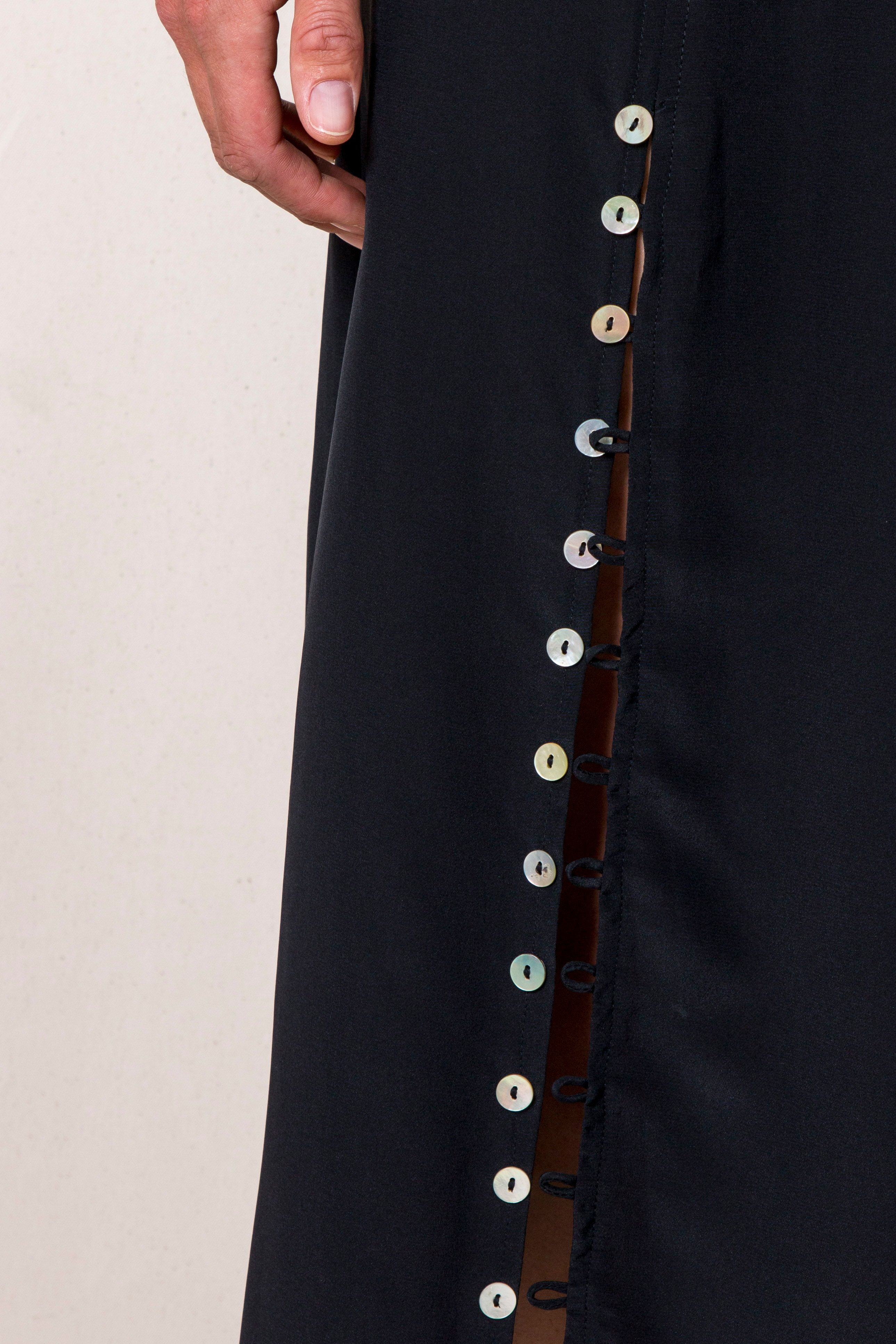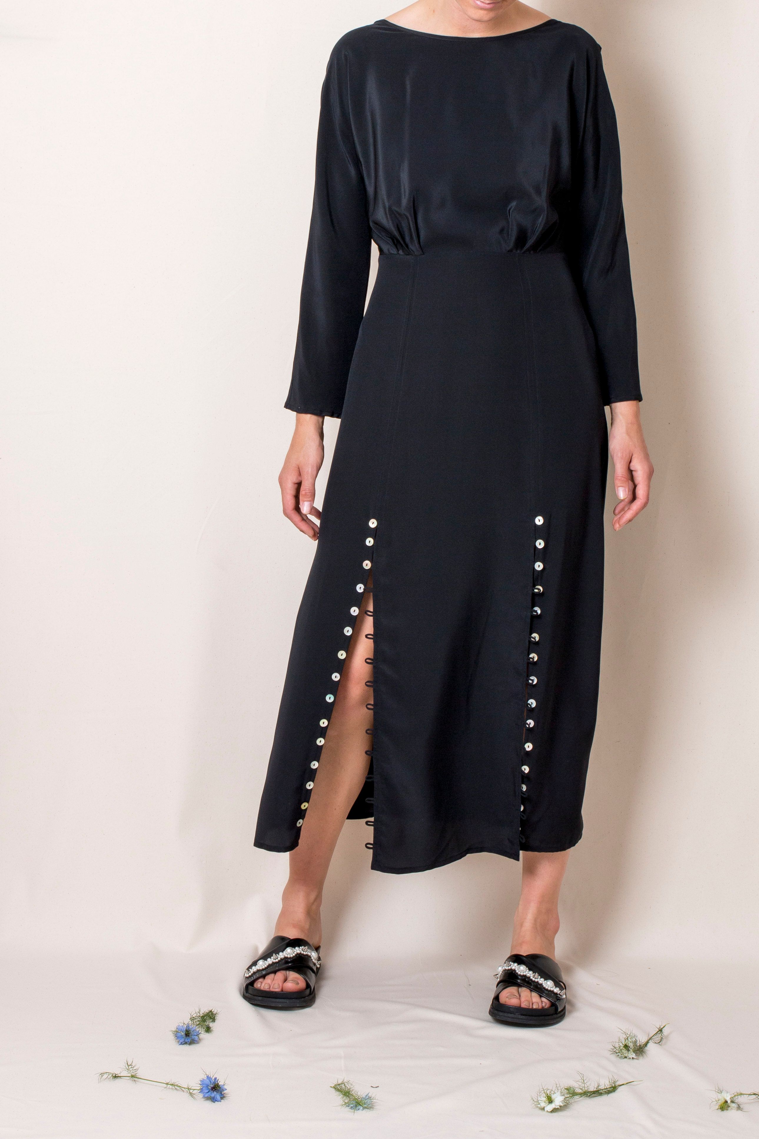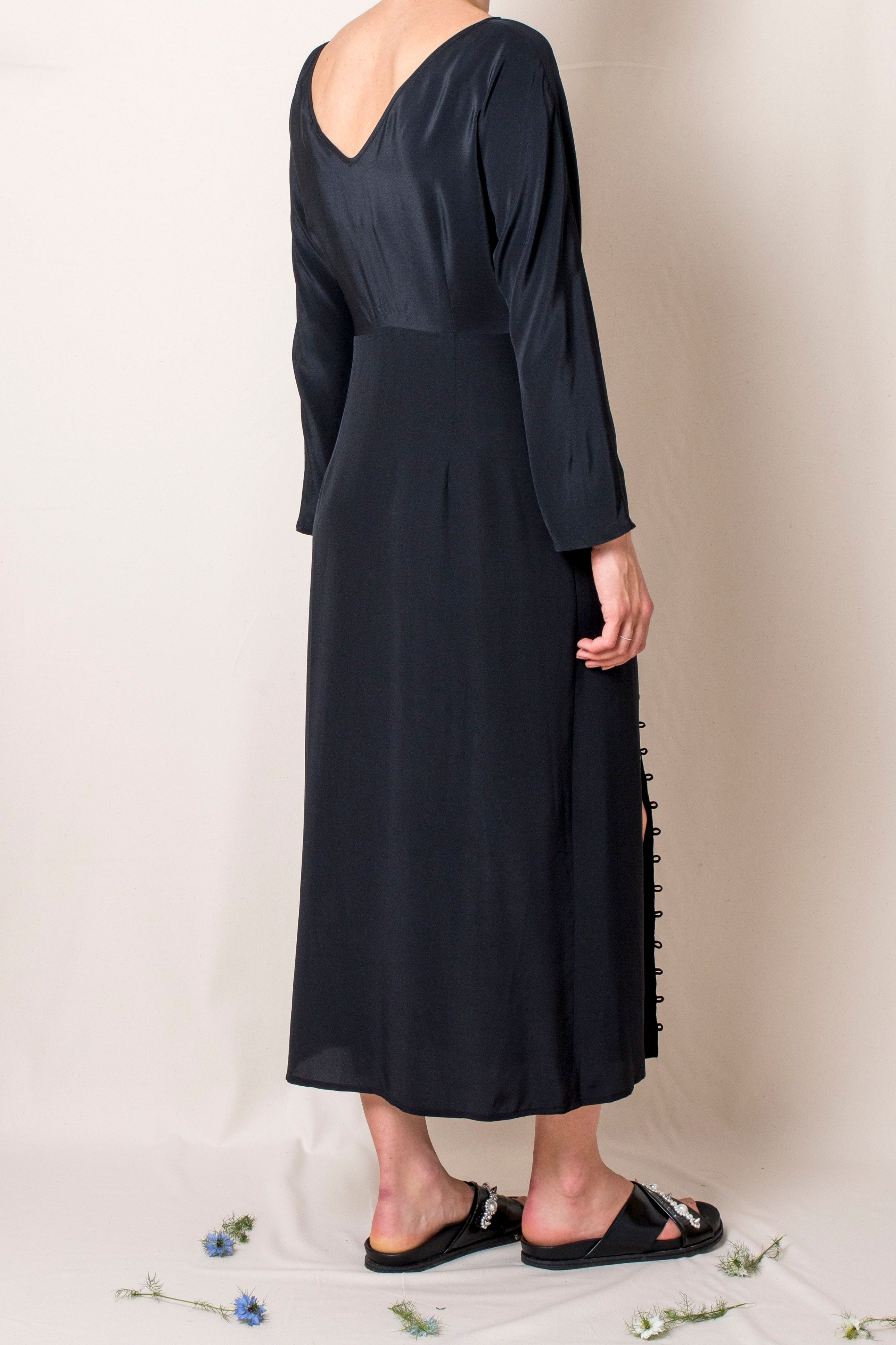 High neck Invisible zip on the side Looped button details running along front splits V-back Finishes mid-calf