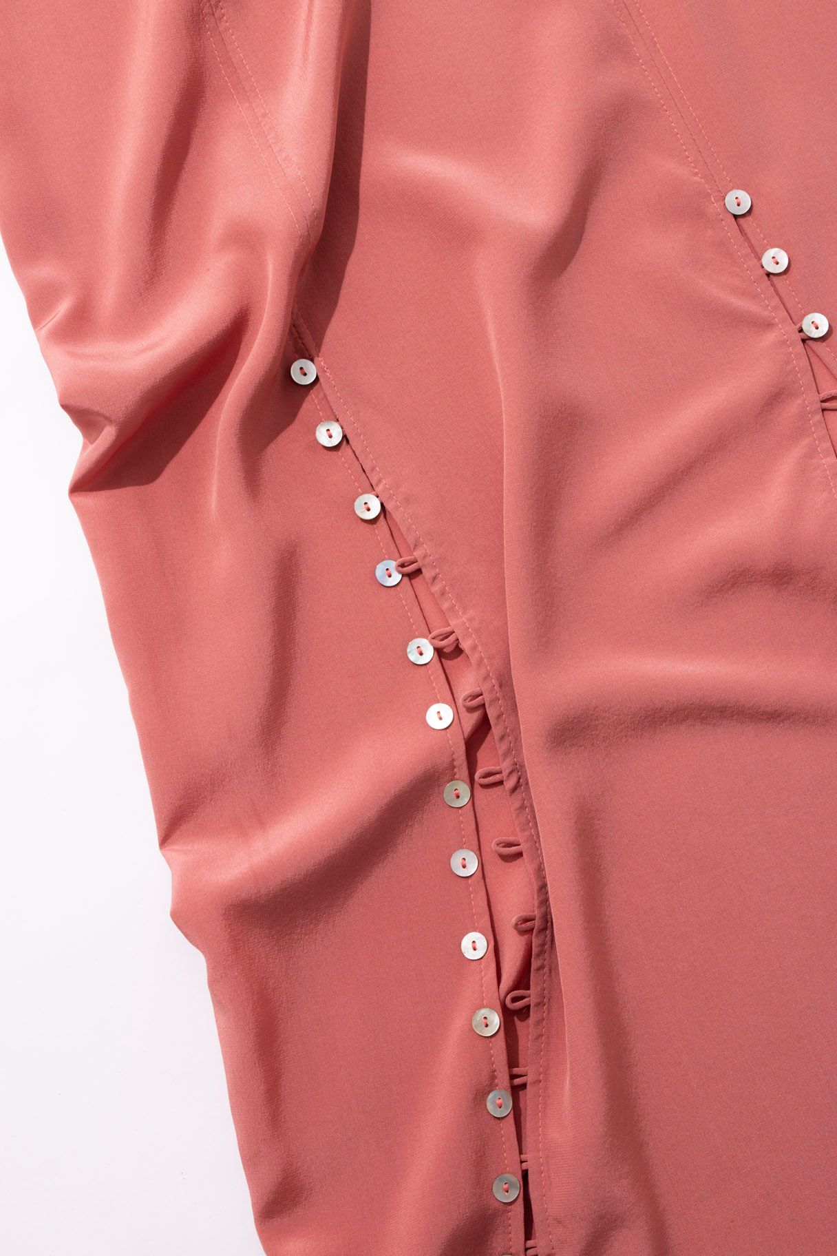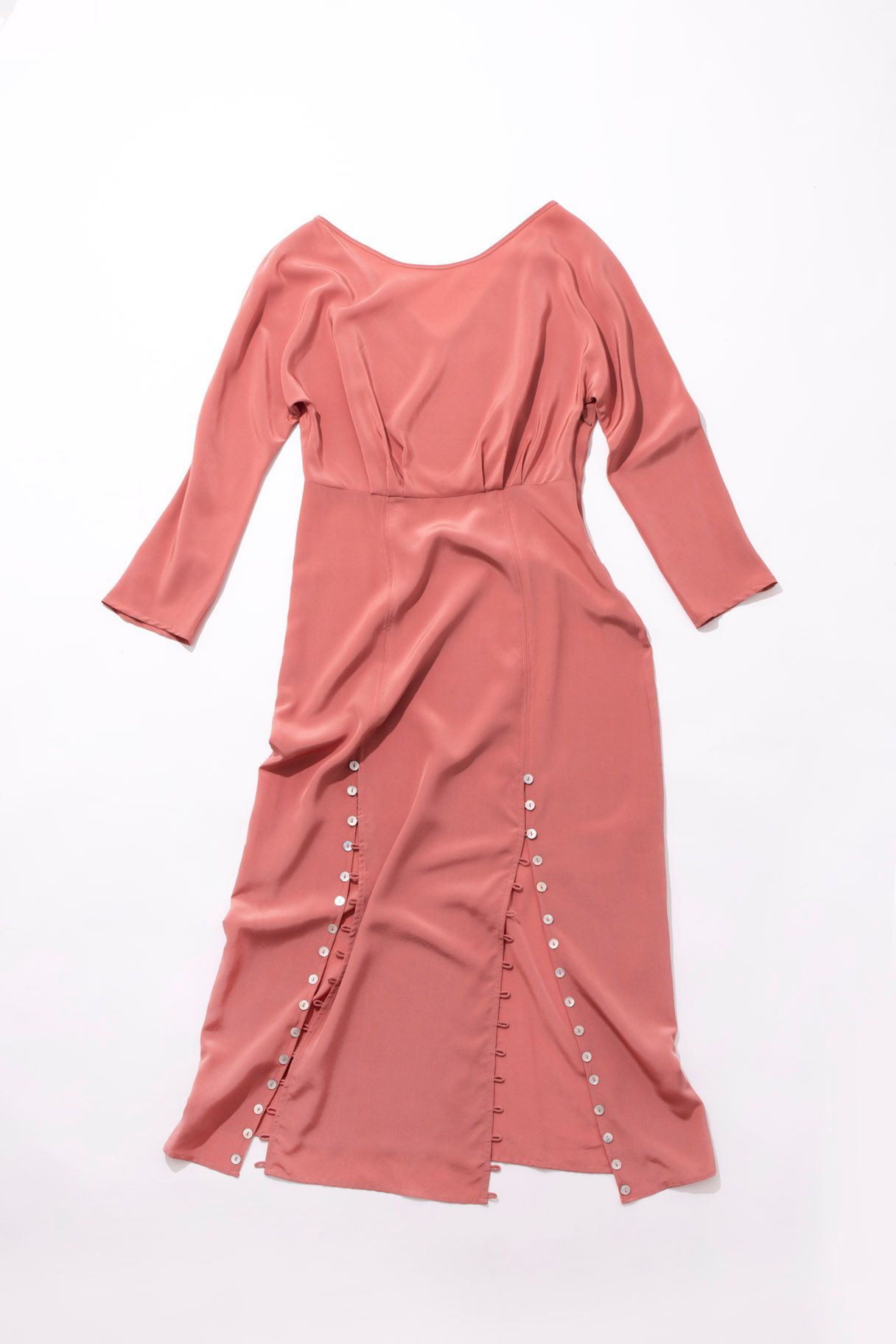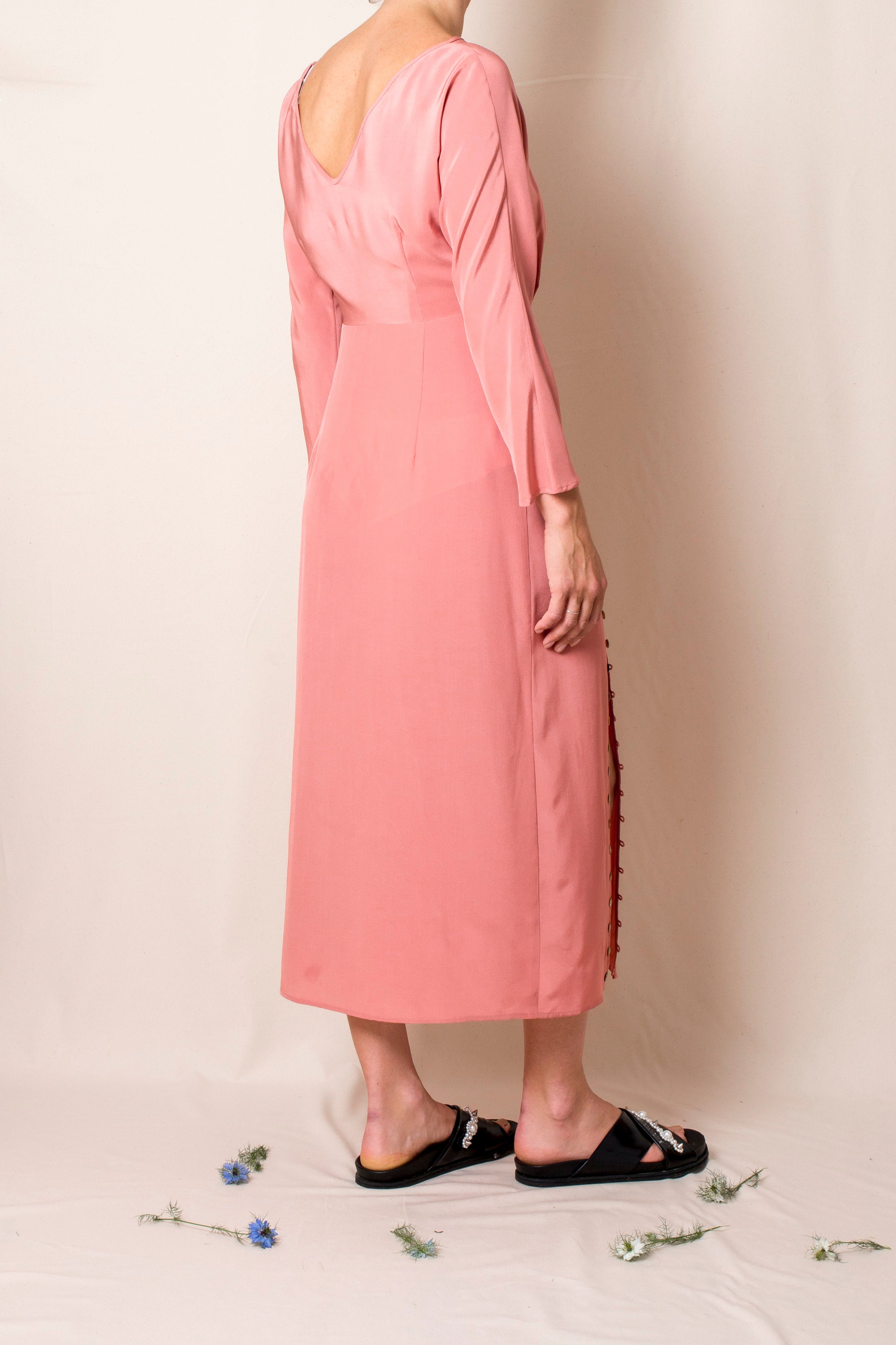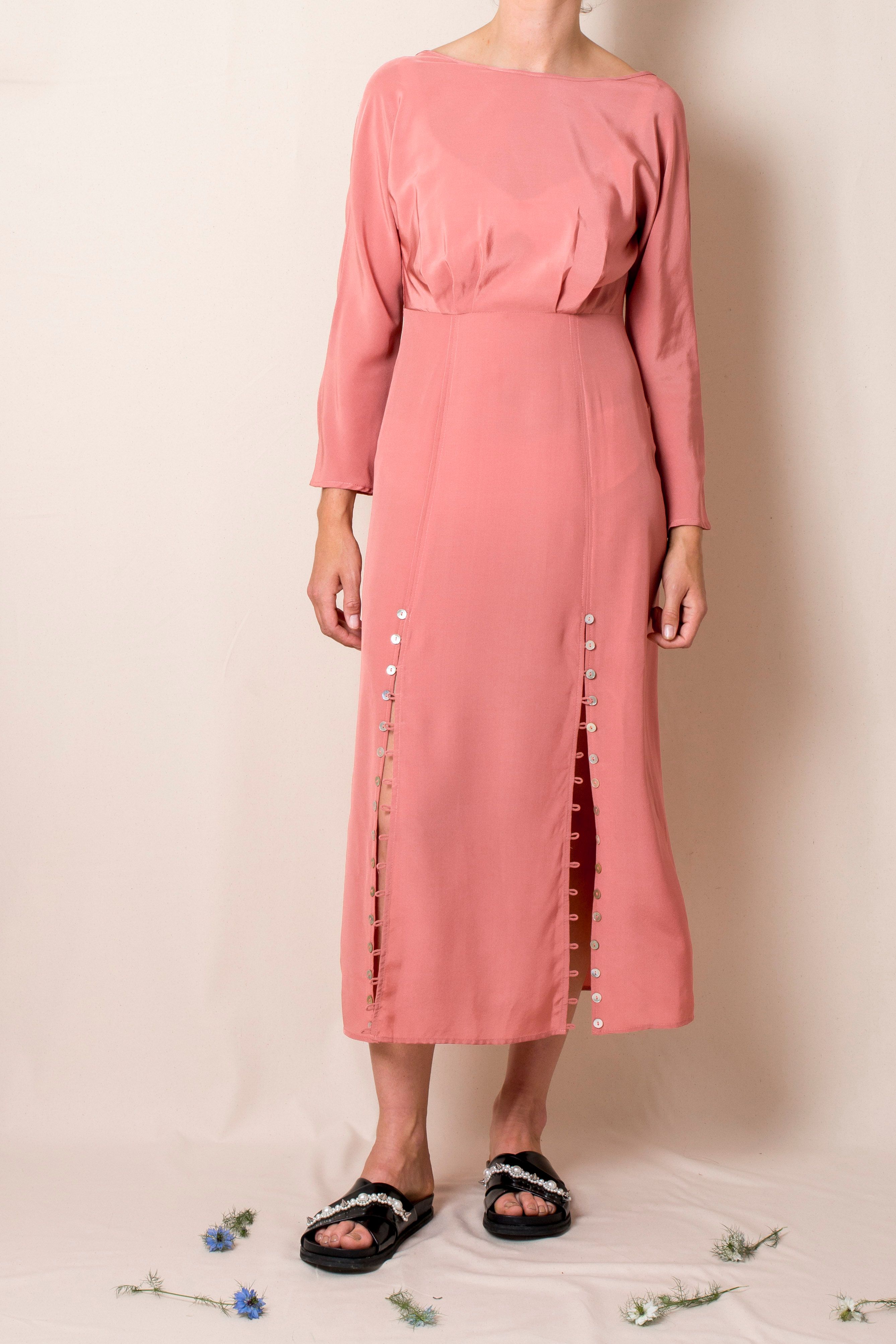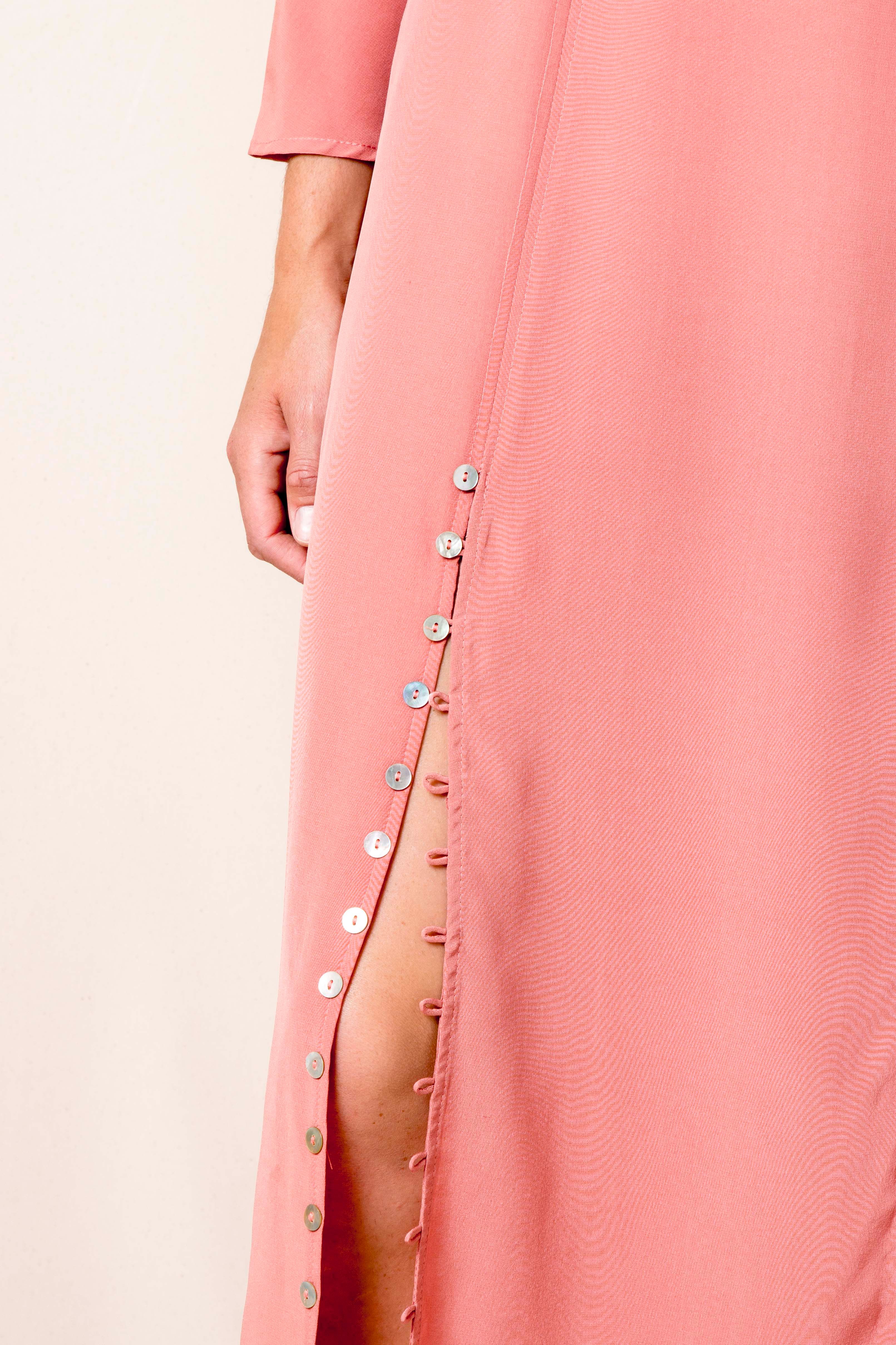 High neck Invisible zip on the side Looped button details running along front splits V-back Finishes mid-calf