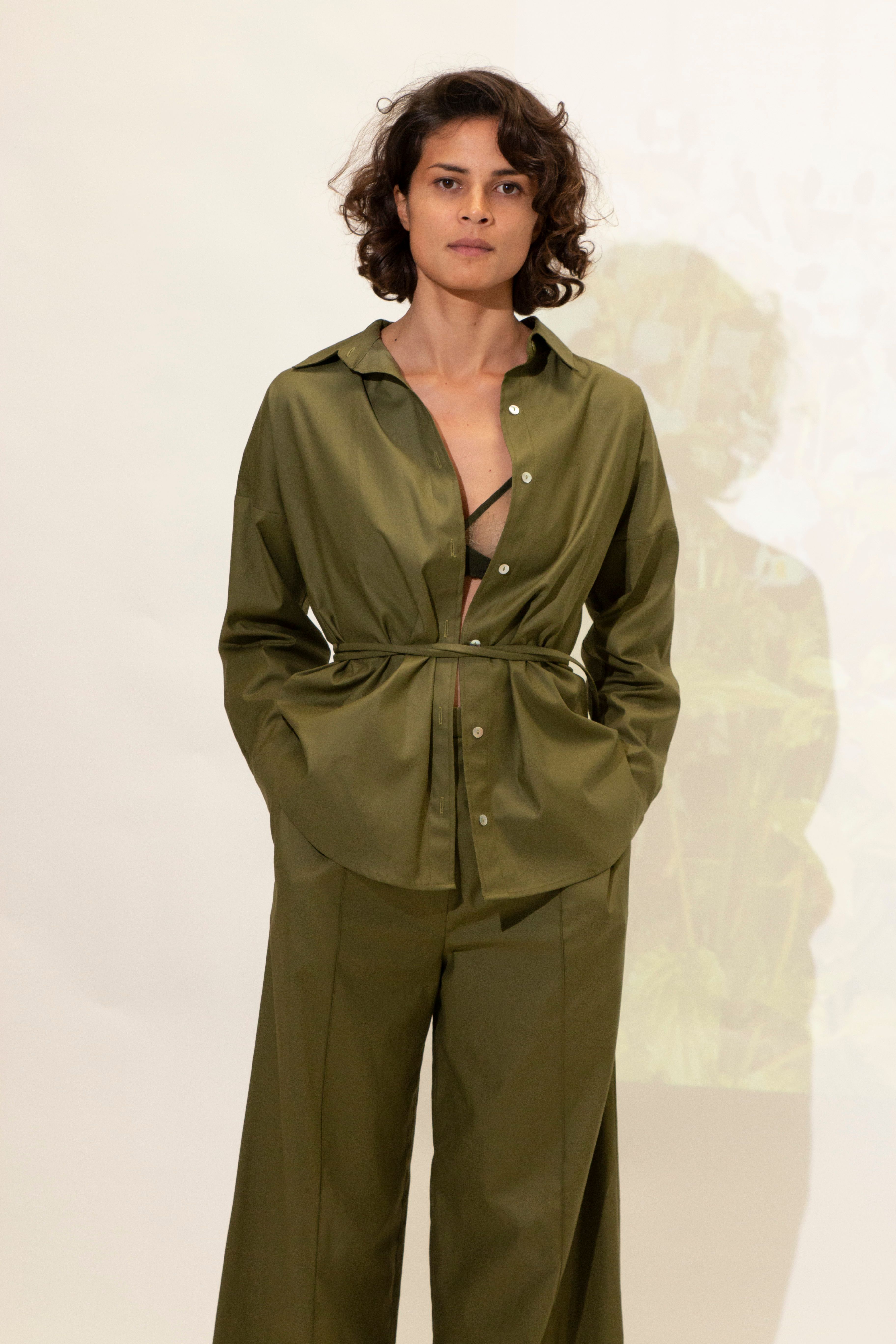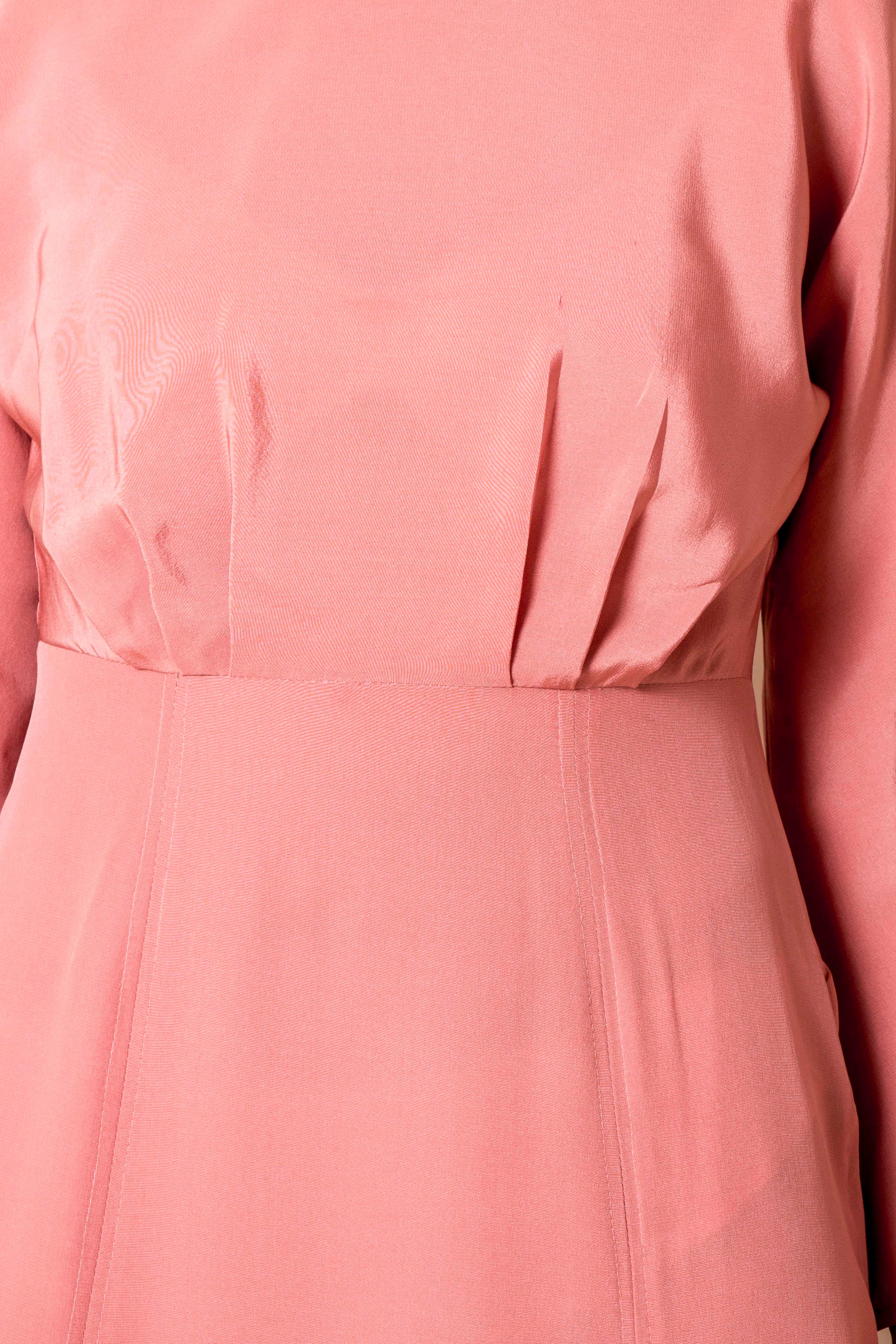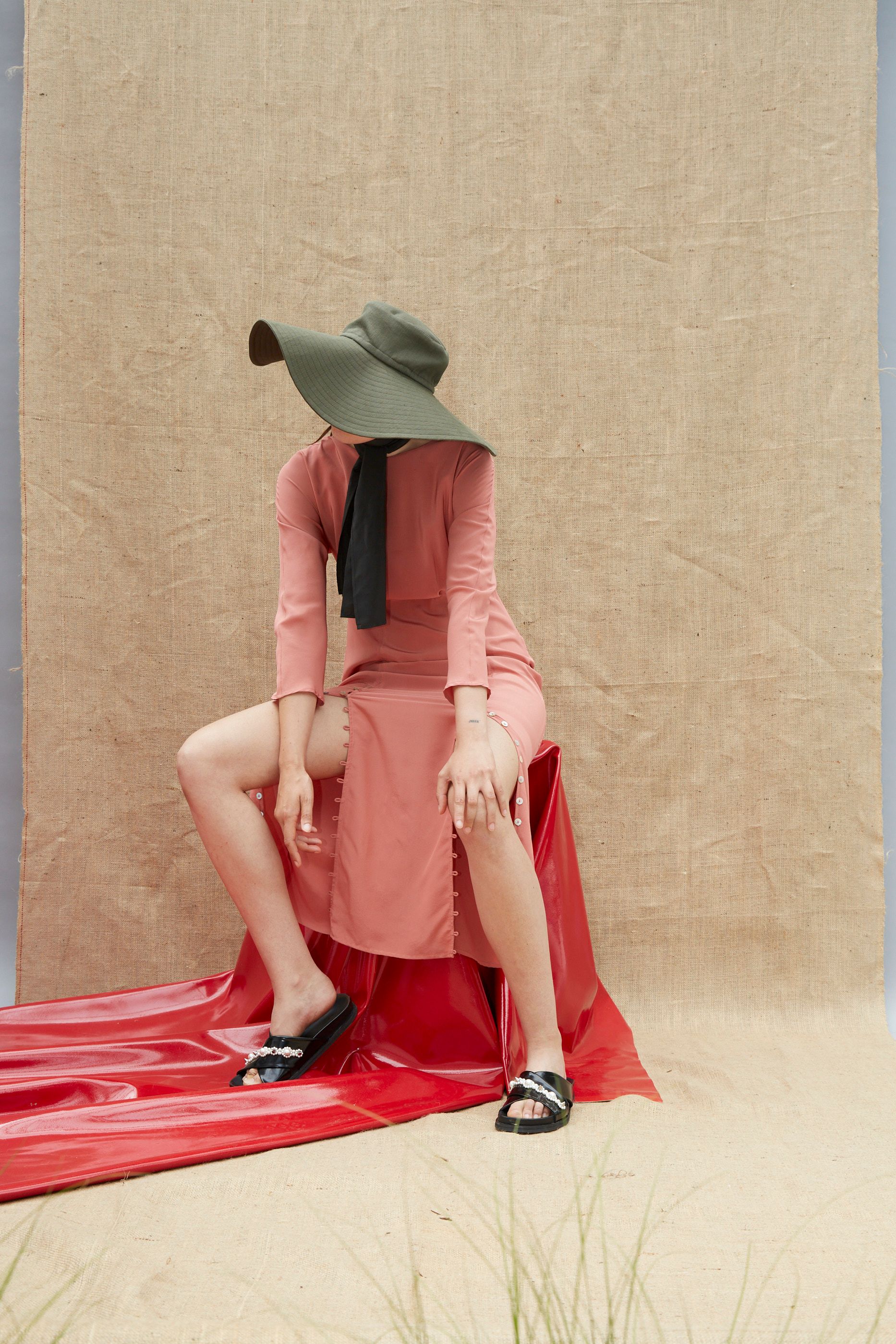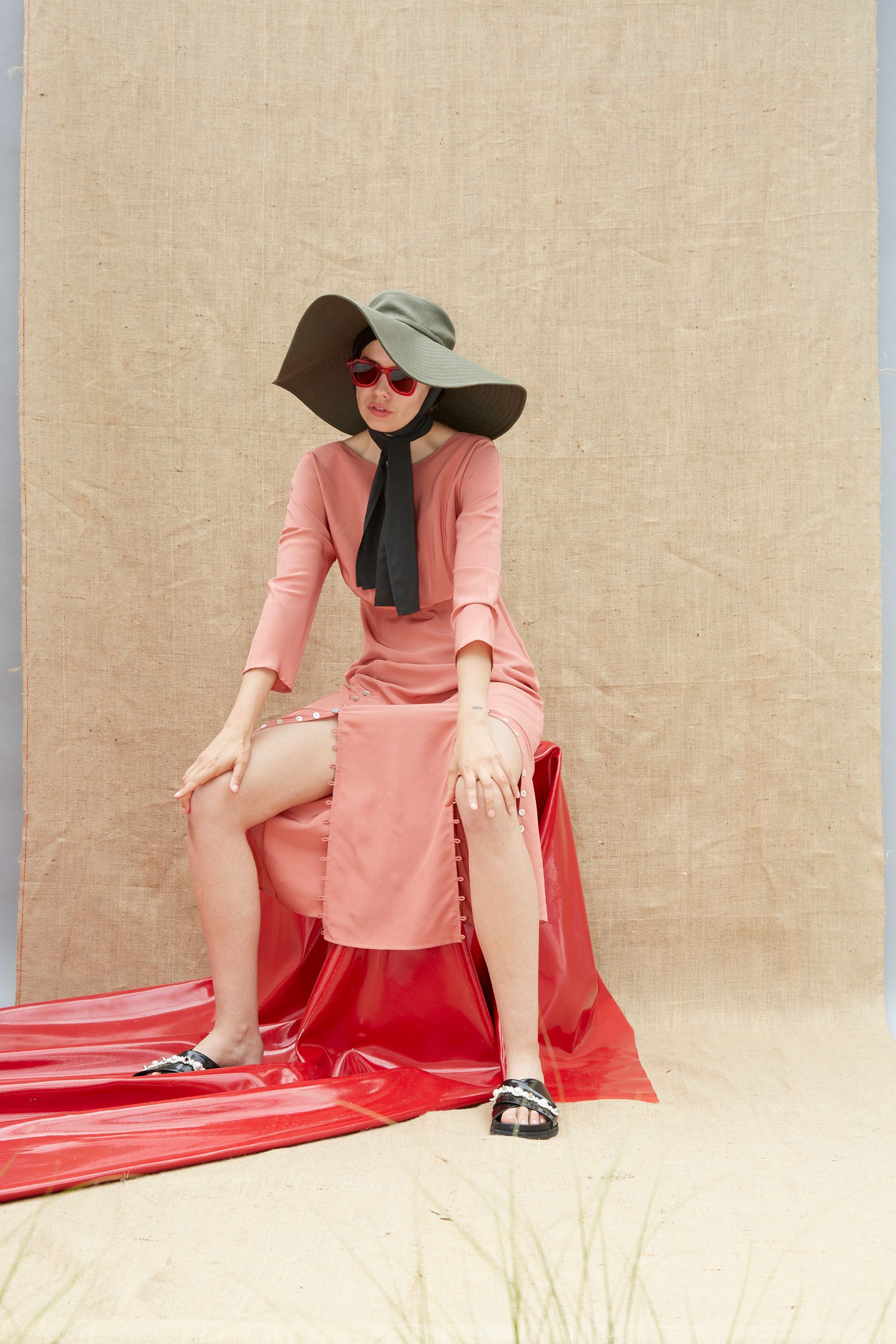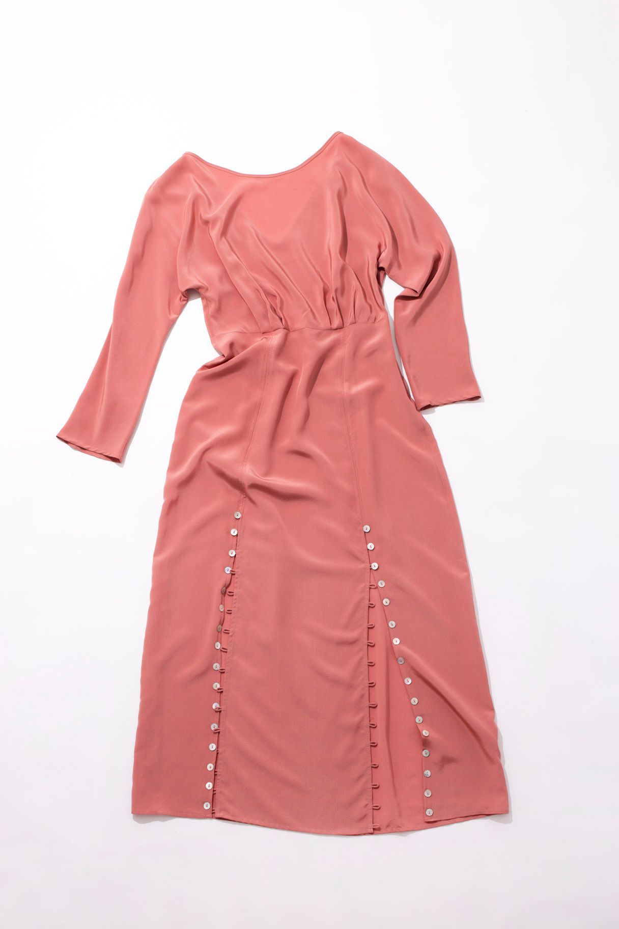 High neck Invisible zip on the side Looped button details running along front splits V-back Finishes mid-calf