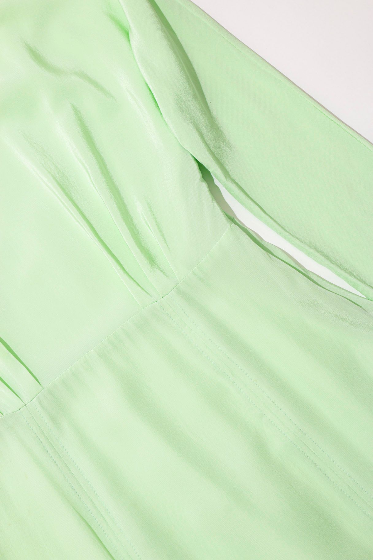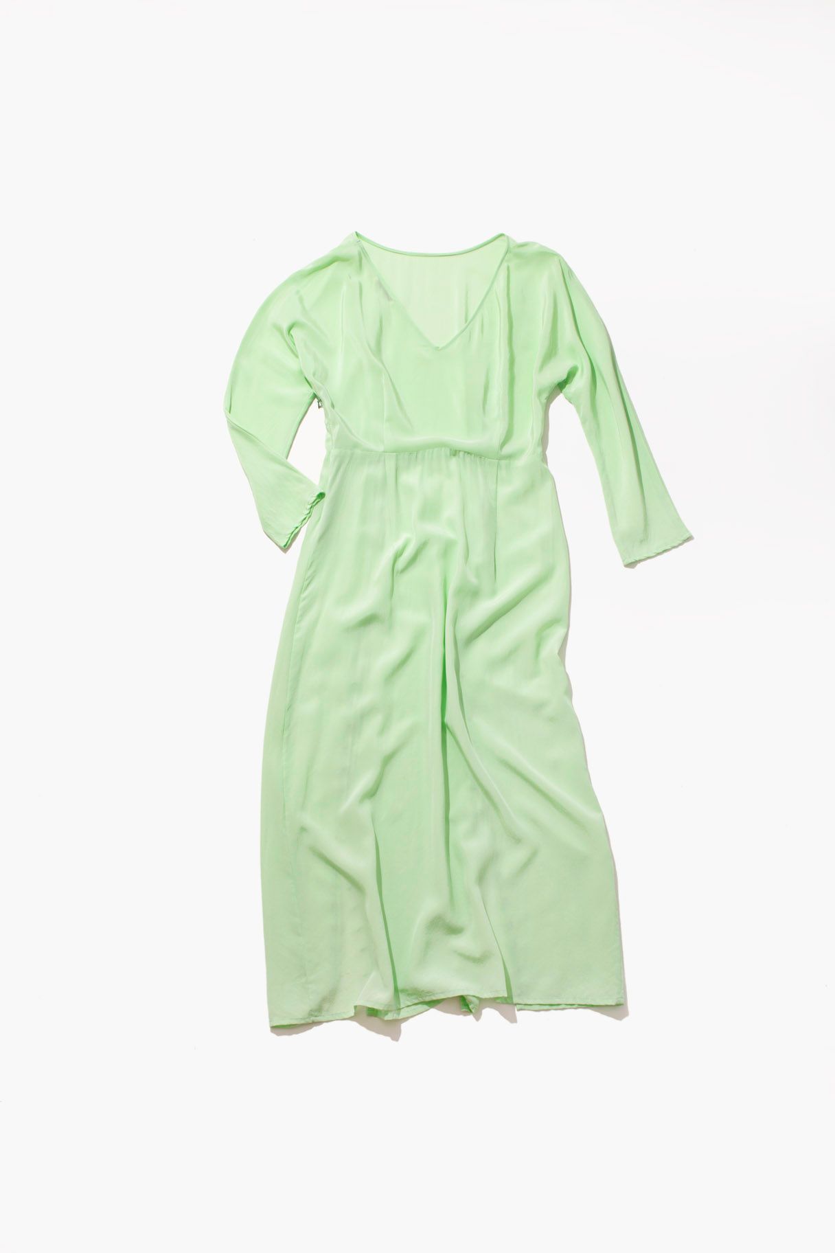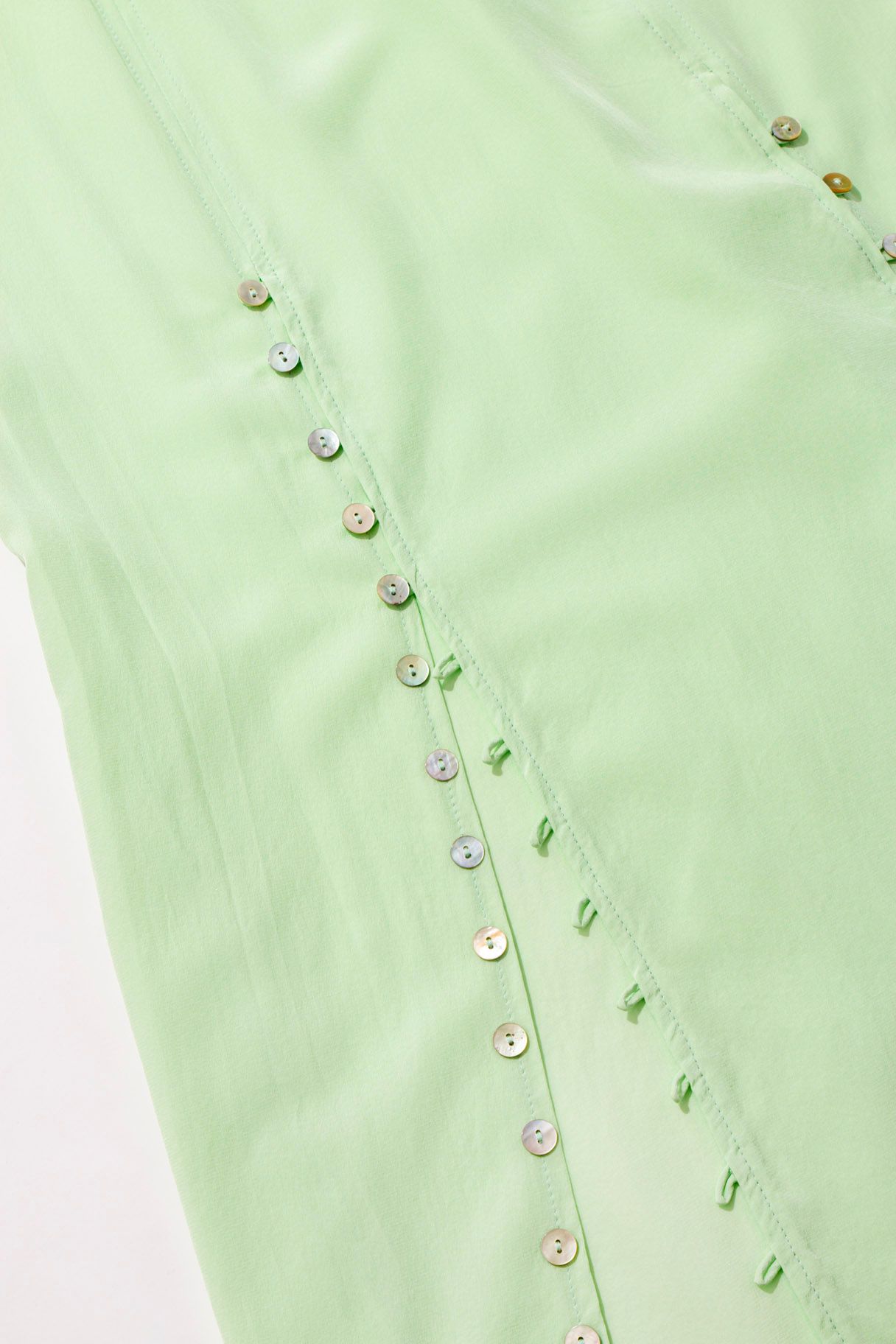 High neck Invisible zip on the side Looped button details running along front splits V-back Finishes mid-calf