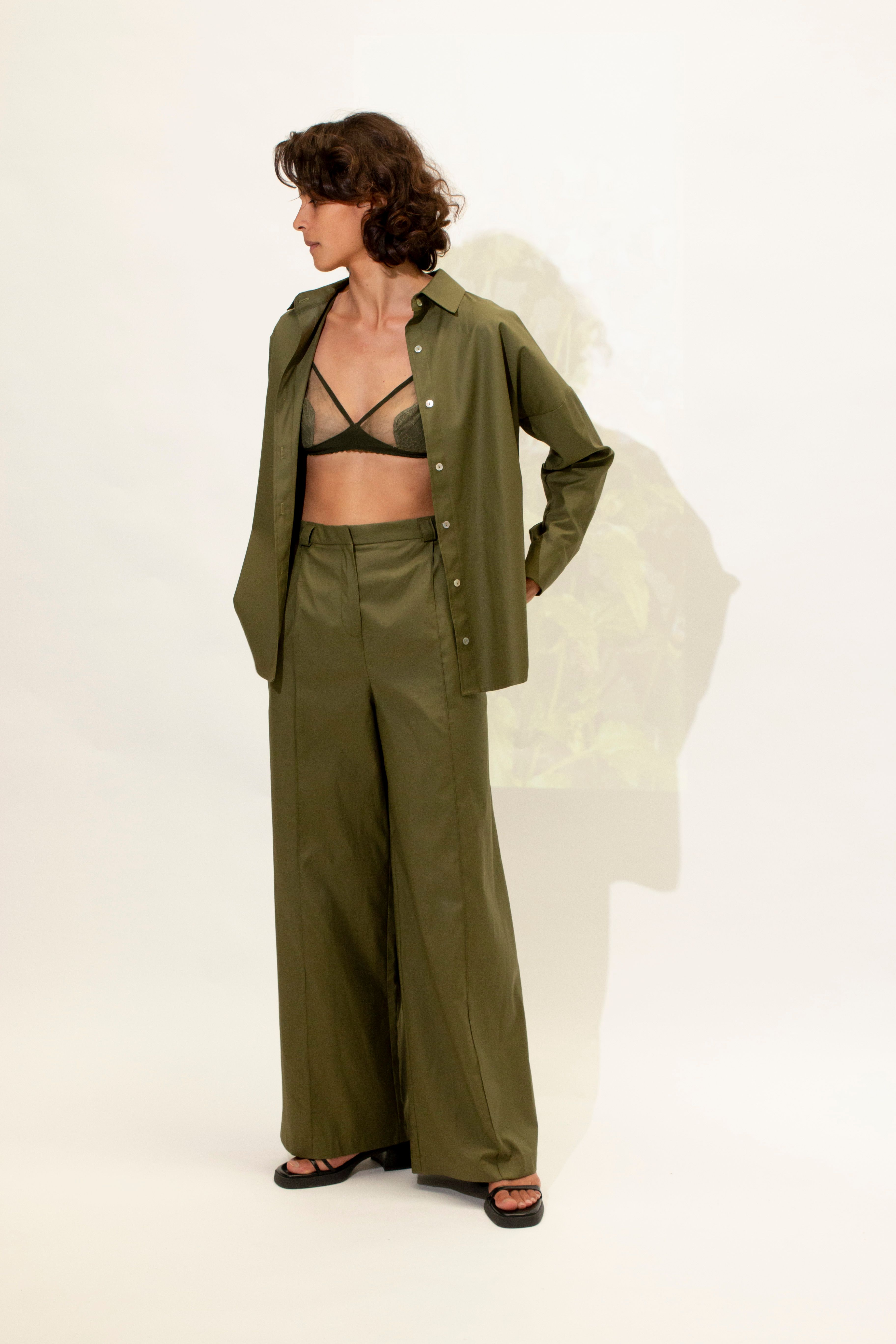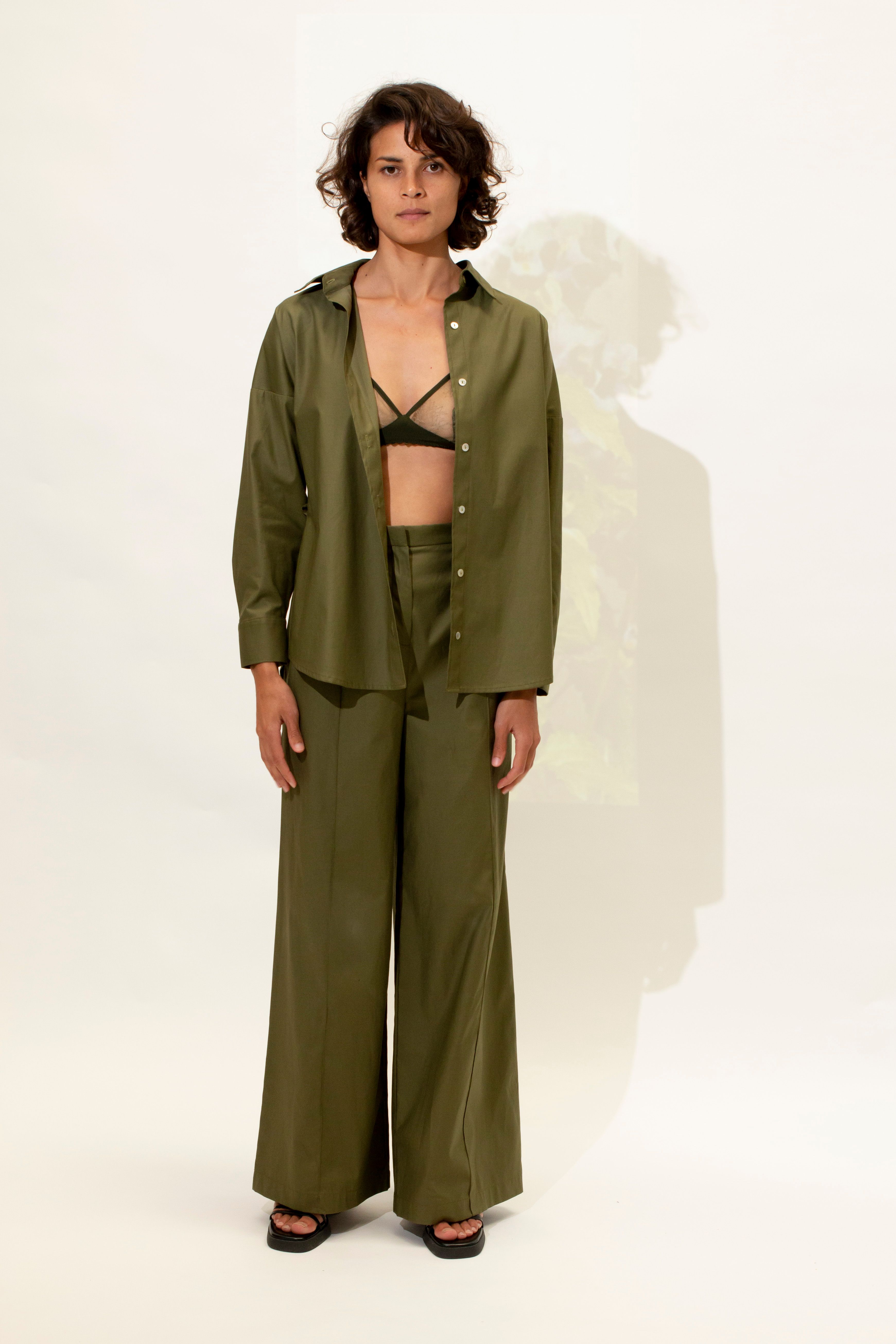 High waisted Loose-fitting Pin-tuck sewn down front of leg Latch closure Full-length Made in Aotearoa