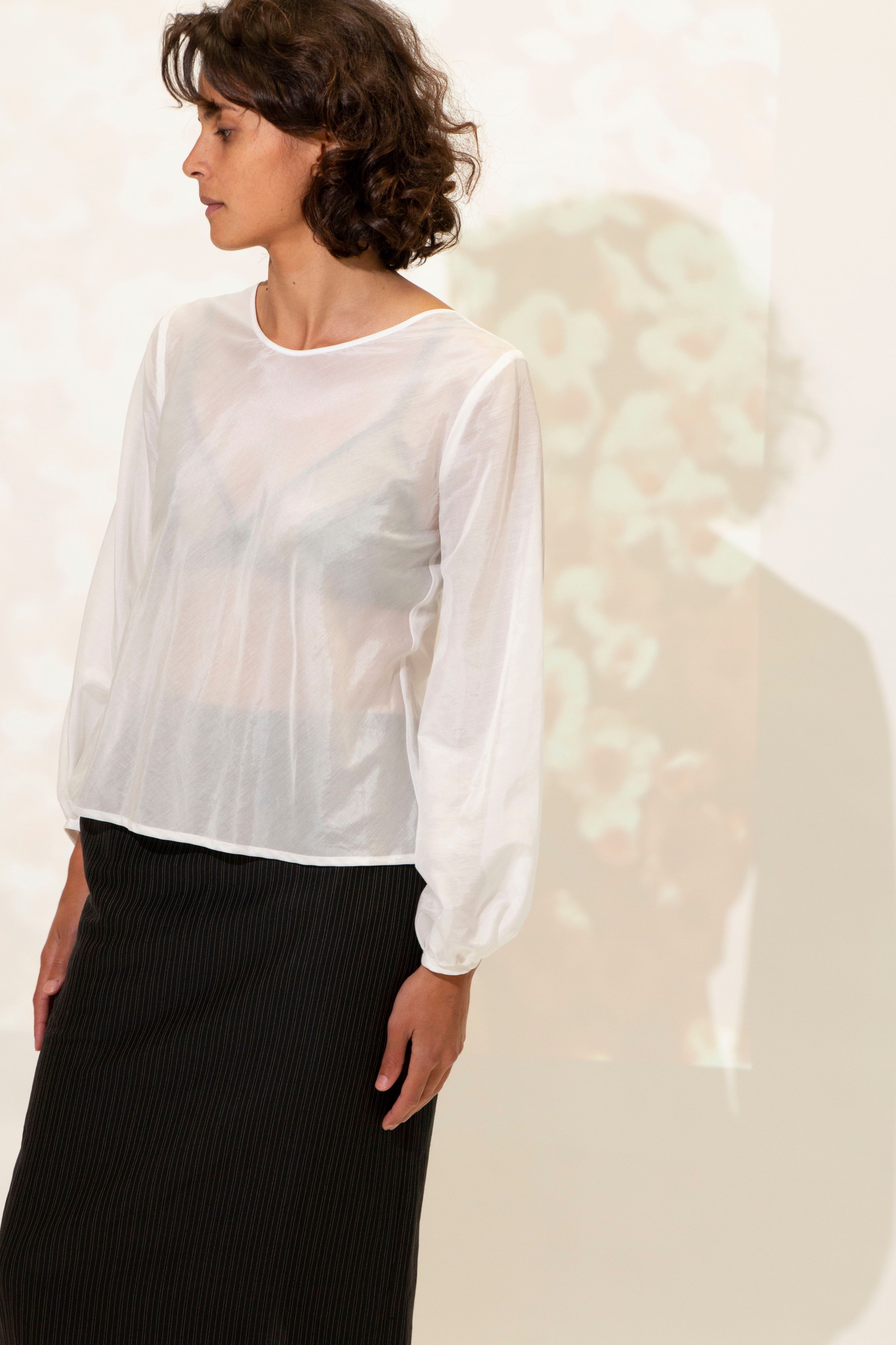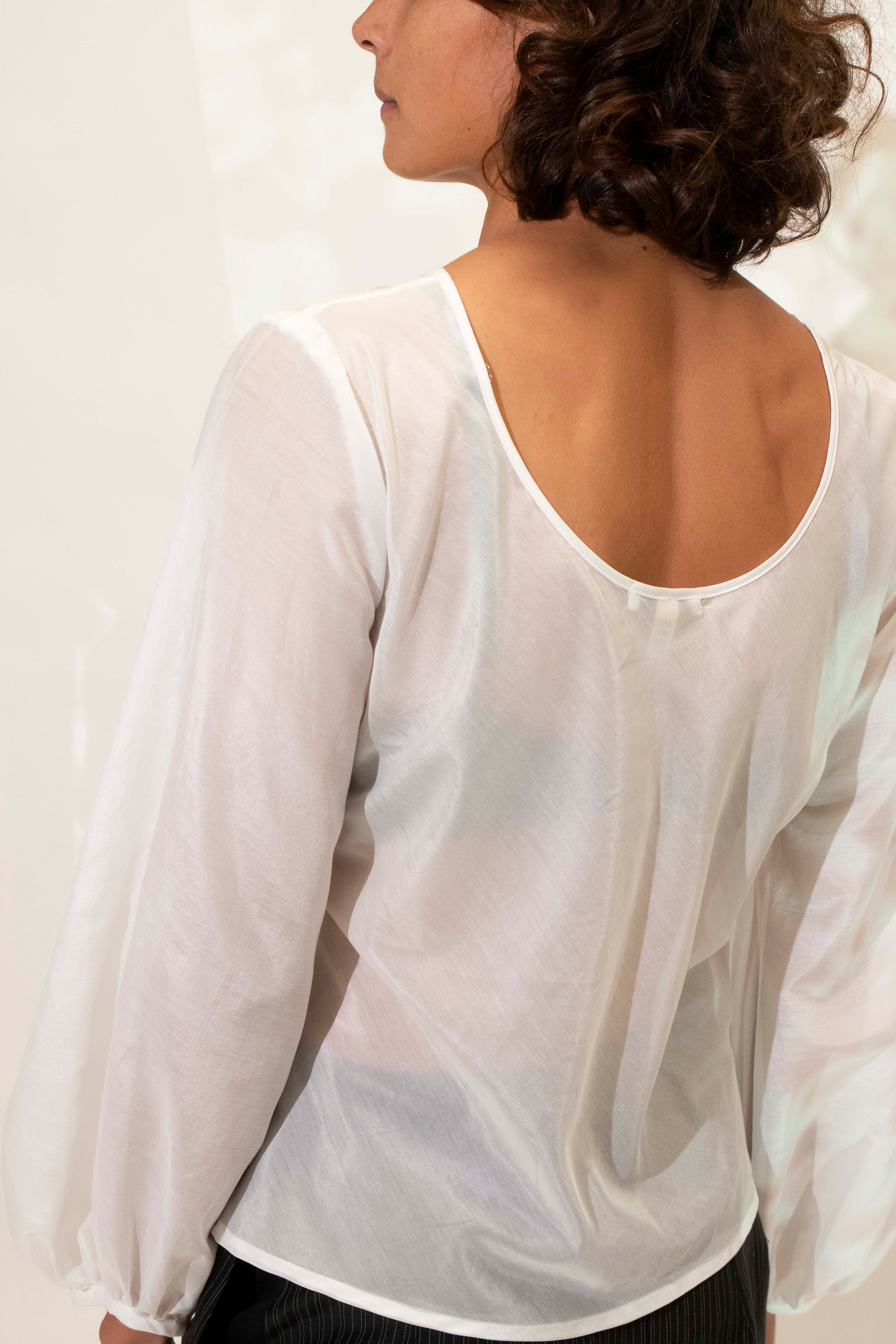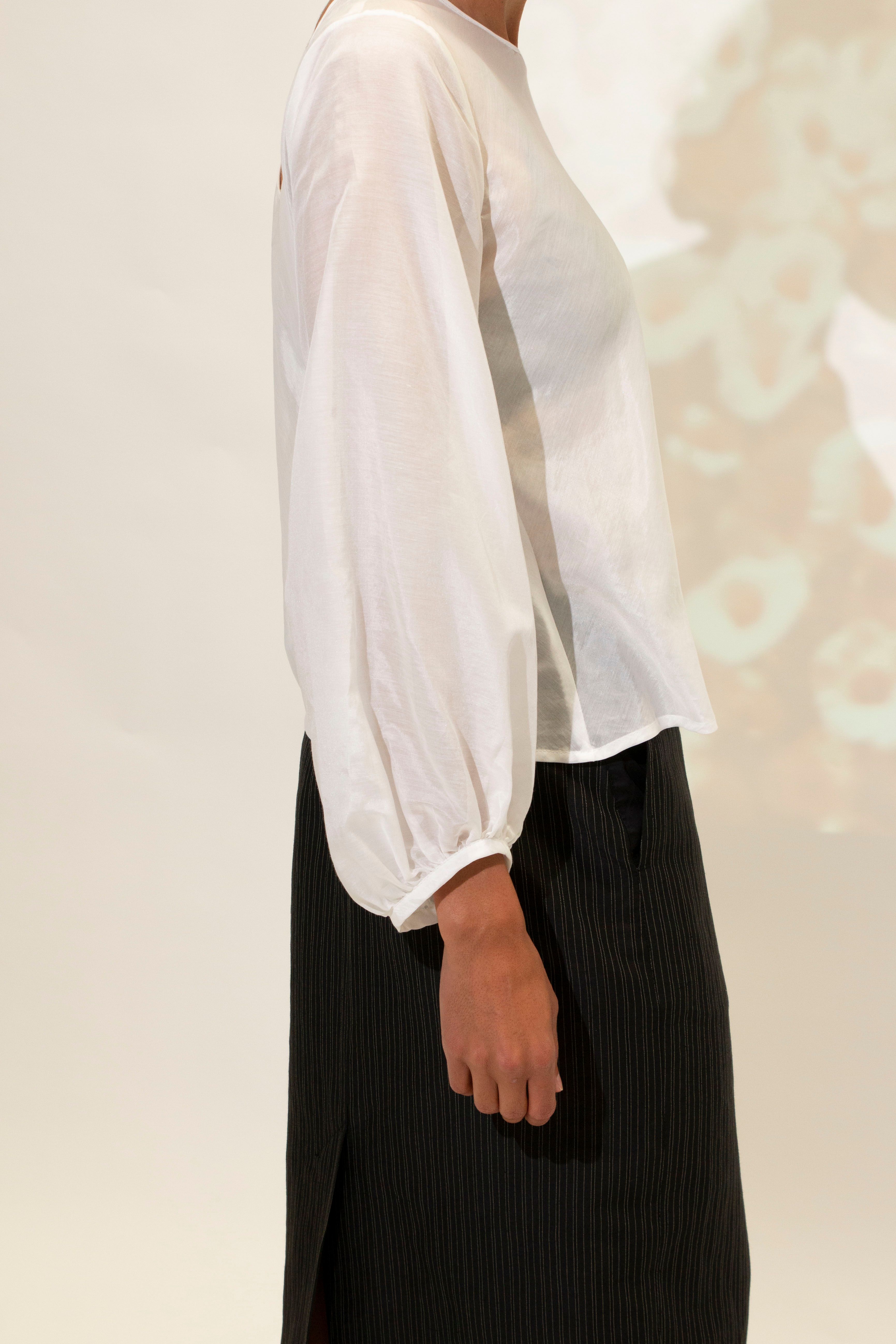 Rounded neckline. Neat on the shoulder with the back neckline scooping lower. A versatile style with the option to wear reversed. Bias cut through the body. Bishop sleeve. Hem finishes at the hips.