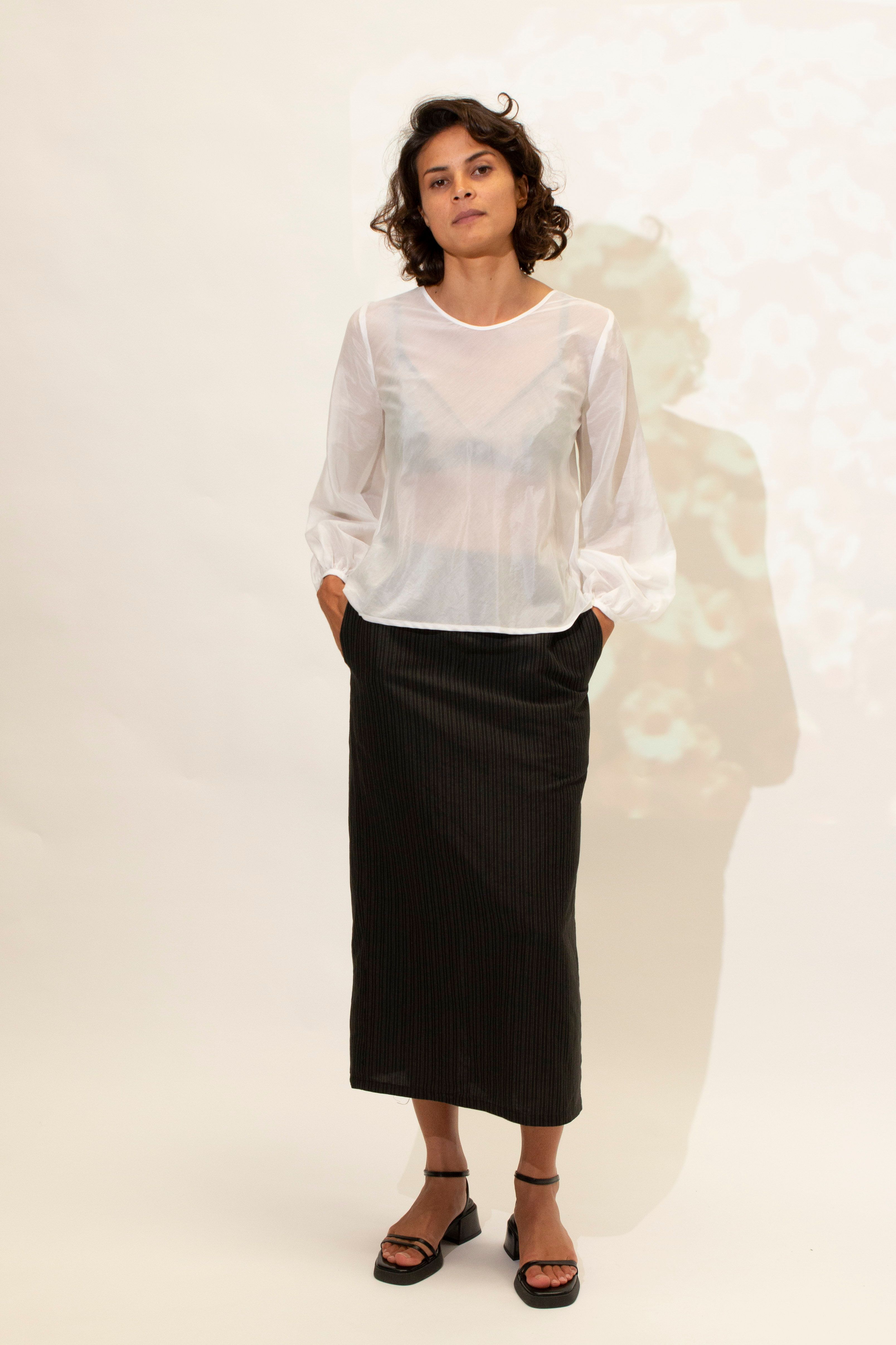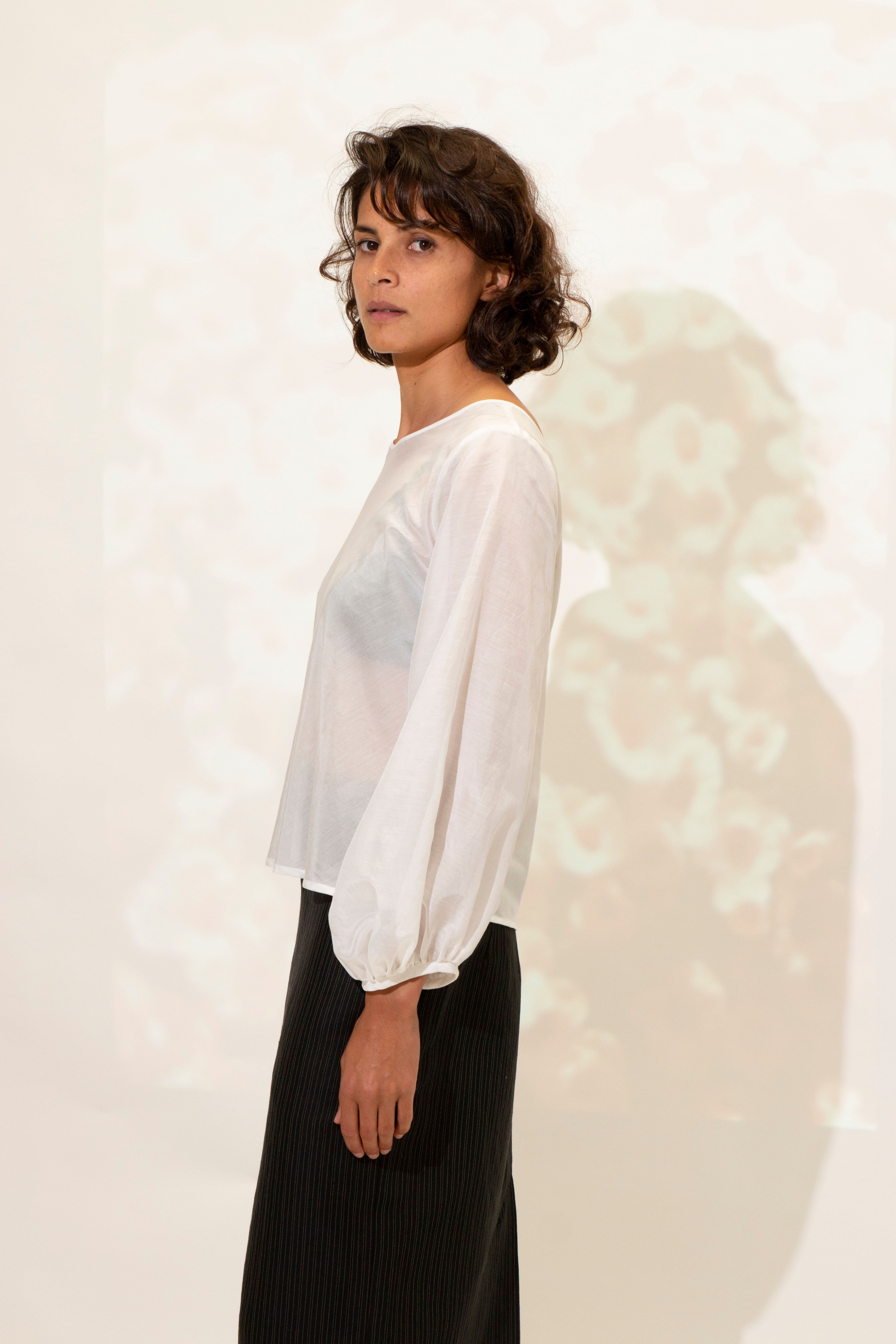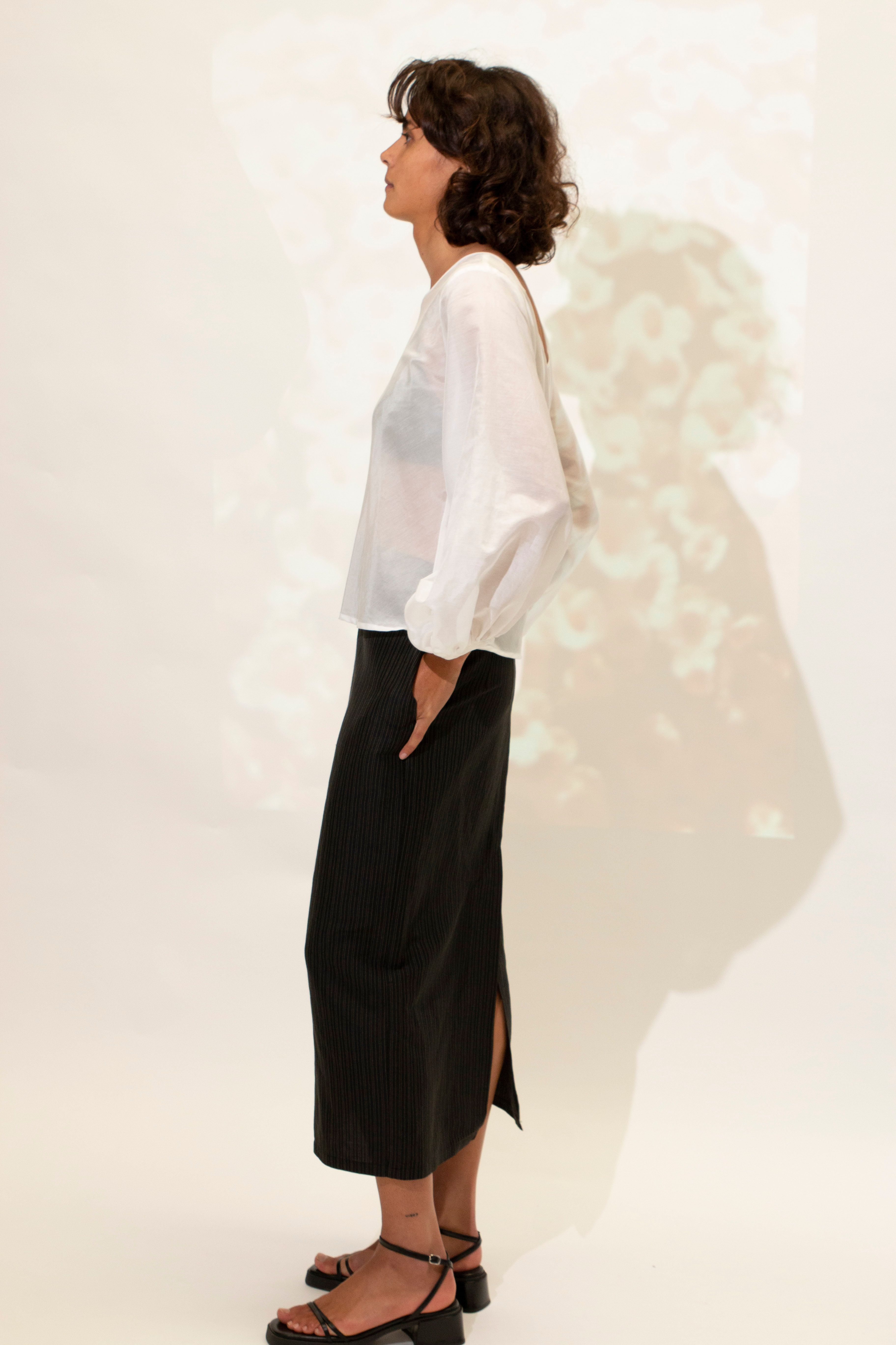 Rounded neckline. Neat on the shoulder with the back neckline scooping lower. A versatile style with the option to wear reversed. Bias cut through the body. Bishop sleeve. Hem finishes at the hips.