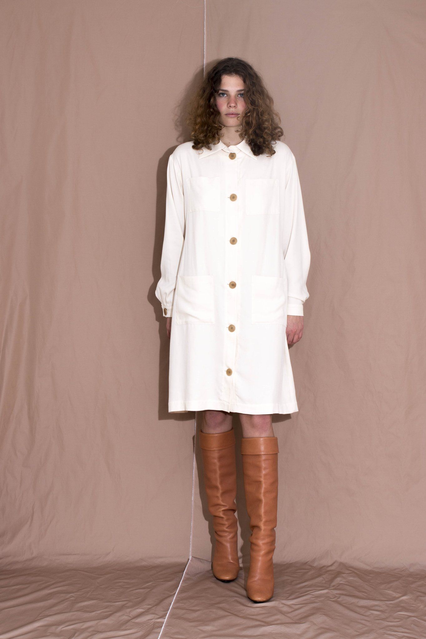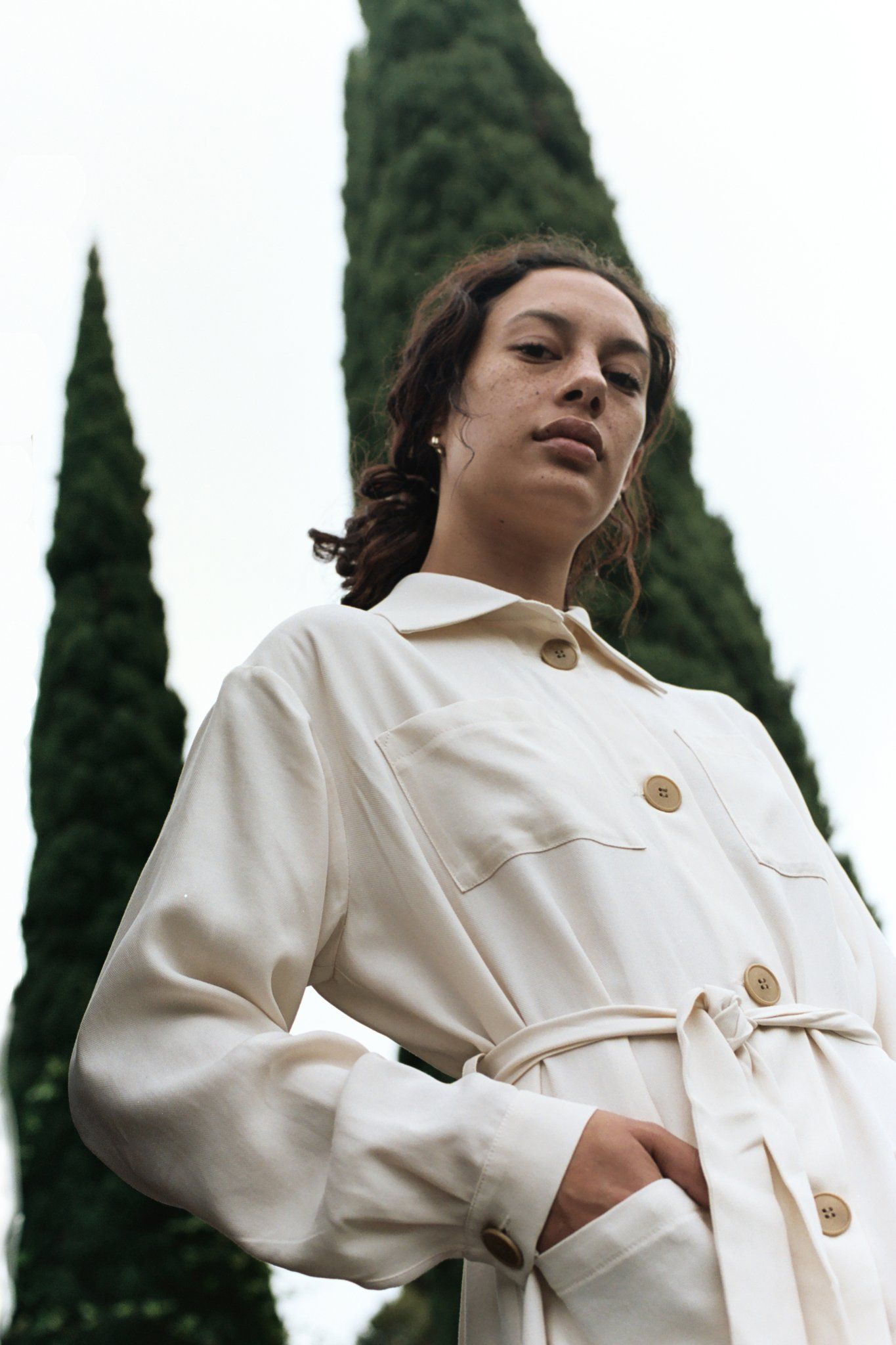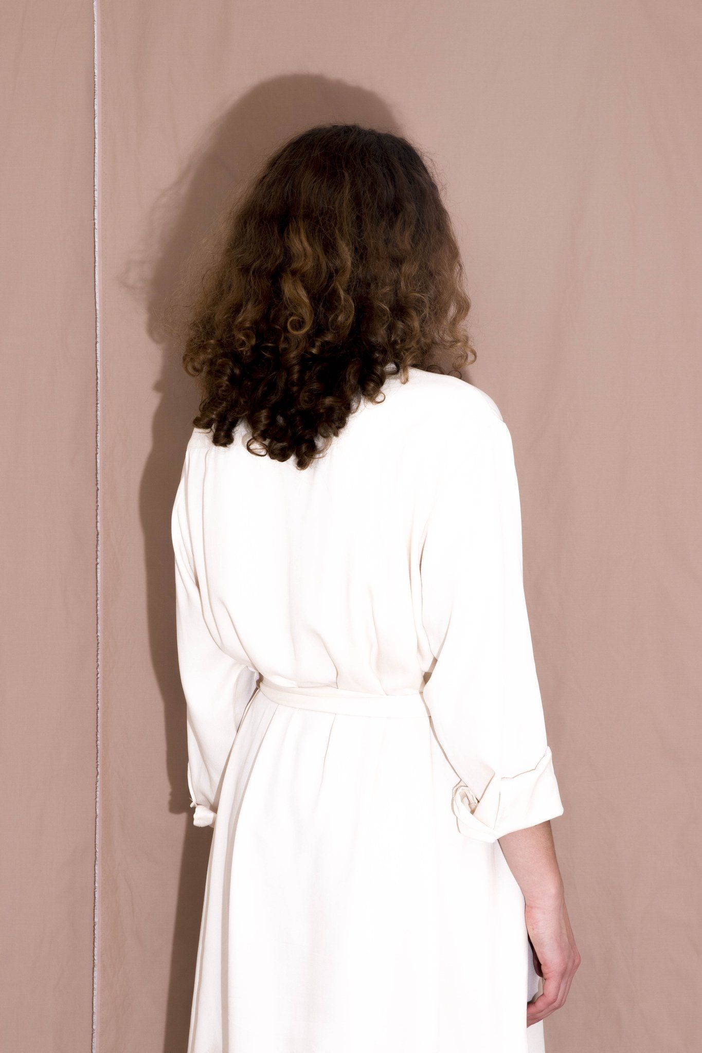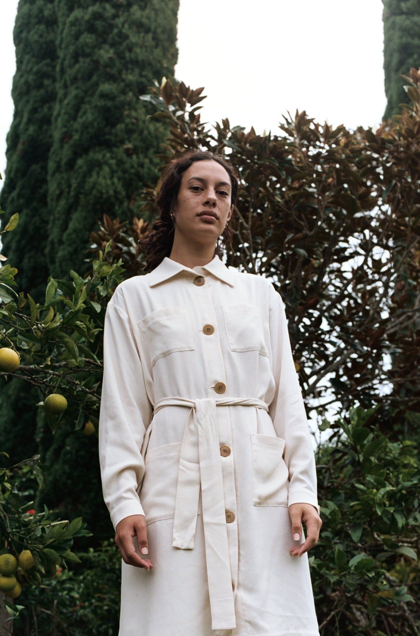 Relaxed easy fit Tie at the waist Custom dyed buttons Drop shoulder Hem finishes at the knee Fabric is subtly textured