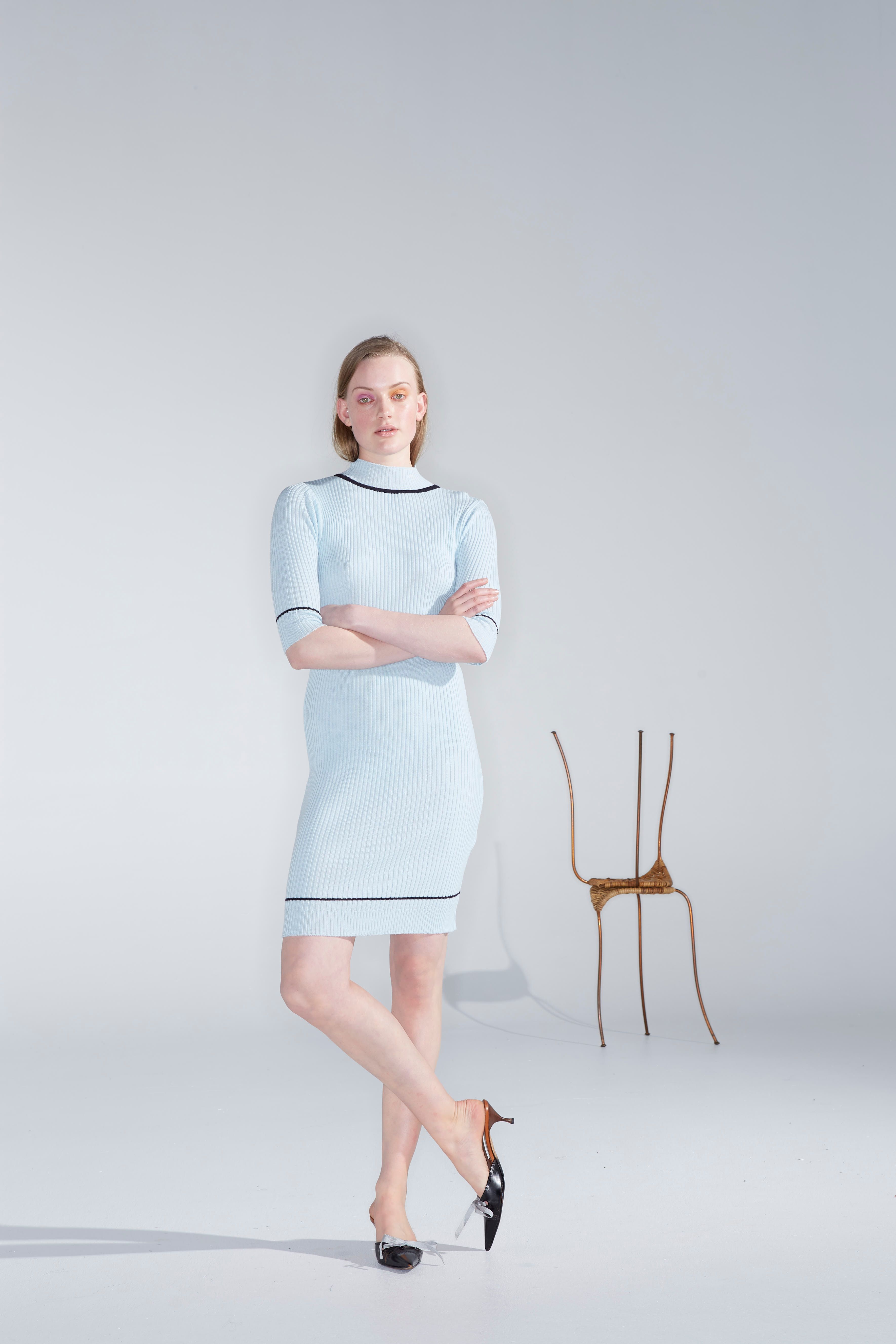 Fits snug to the body and is luxuriously comfortable and warm. Beautiful 100% merino in a fine ribbed dress. High neck with contrast black trim around neckline, sleeve and hem. Neat fitting on the shoulder and ¾ length sleeves finishing at the elbow.