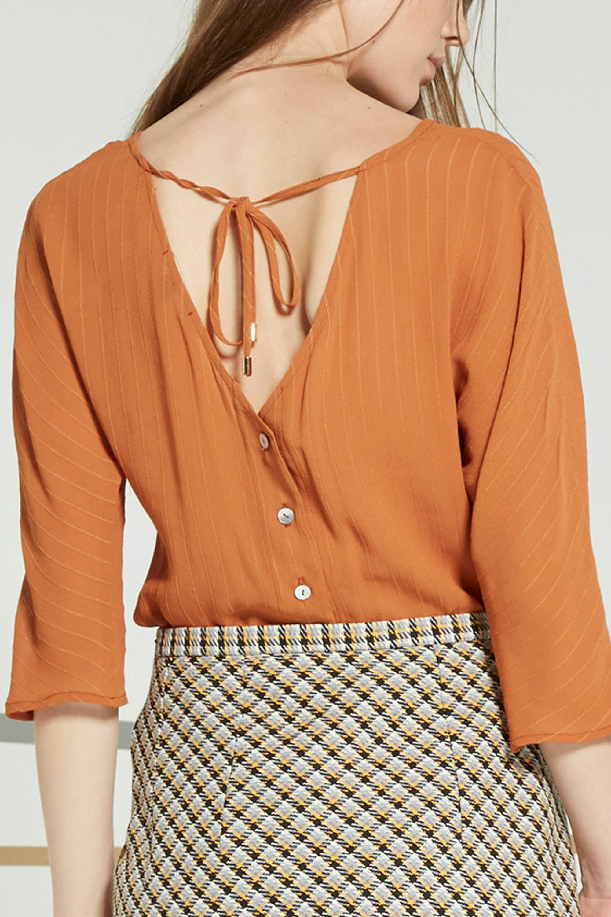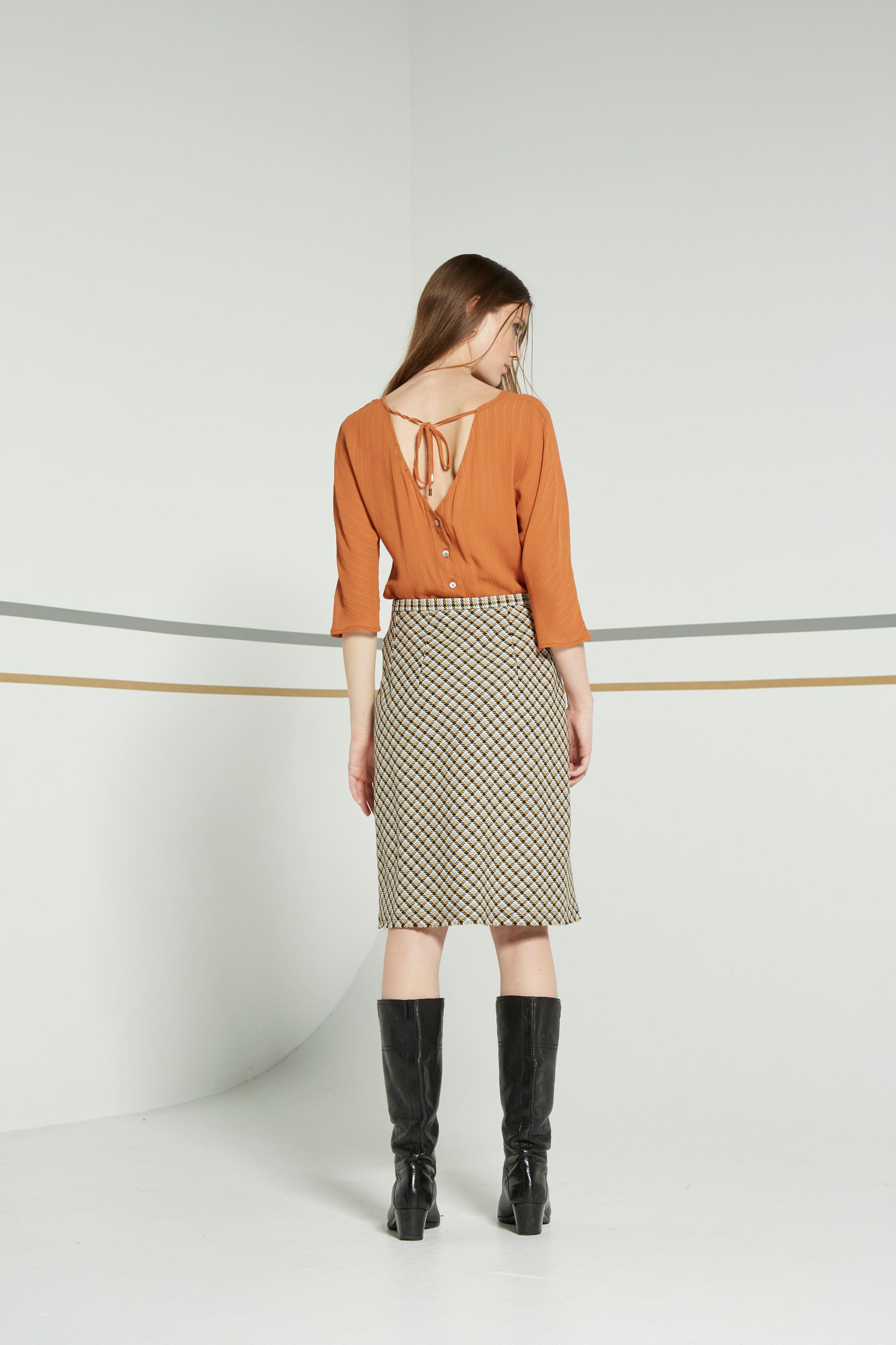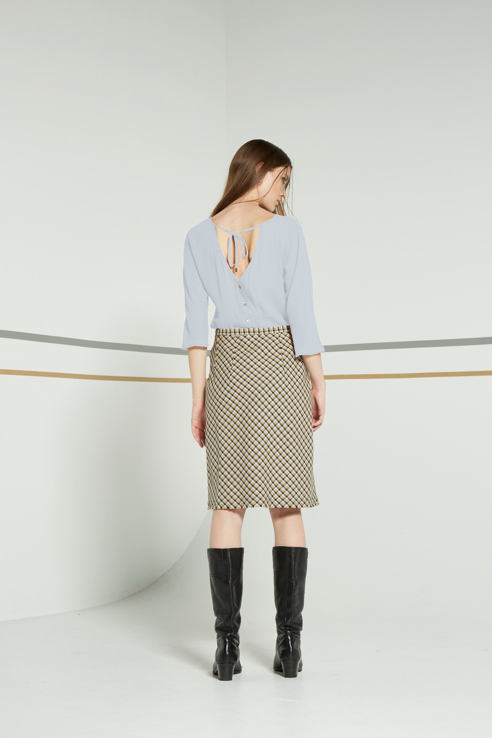 Elegance and ease, the Dahlia top is a perfect summer top for work or weekend. Wide high neck with v-back followed by button up and tie across the back shoulders. Can be worn in reverse. Dolman sleeve falls to elbow. Hem finishes at hips.