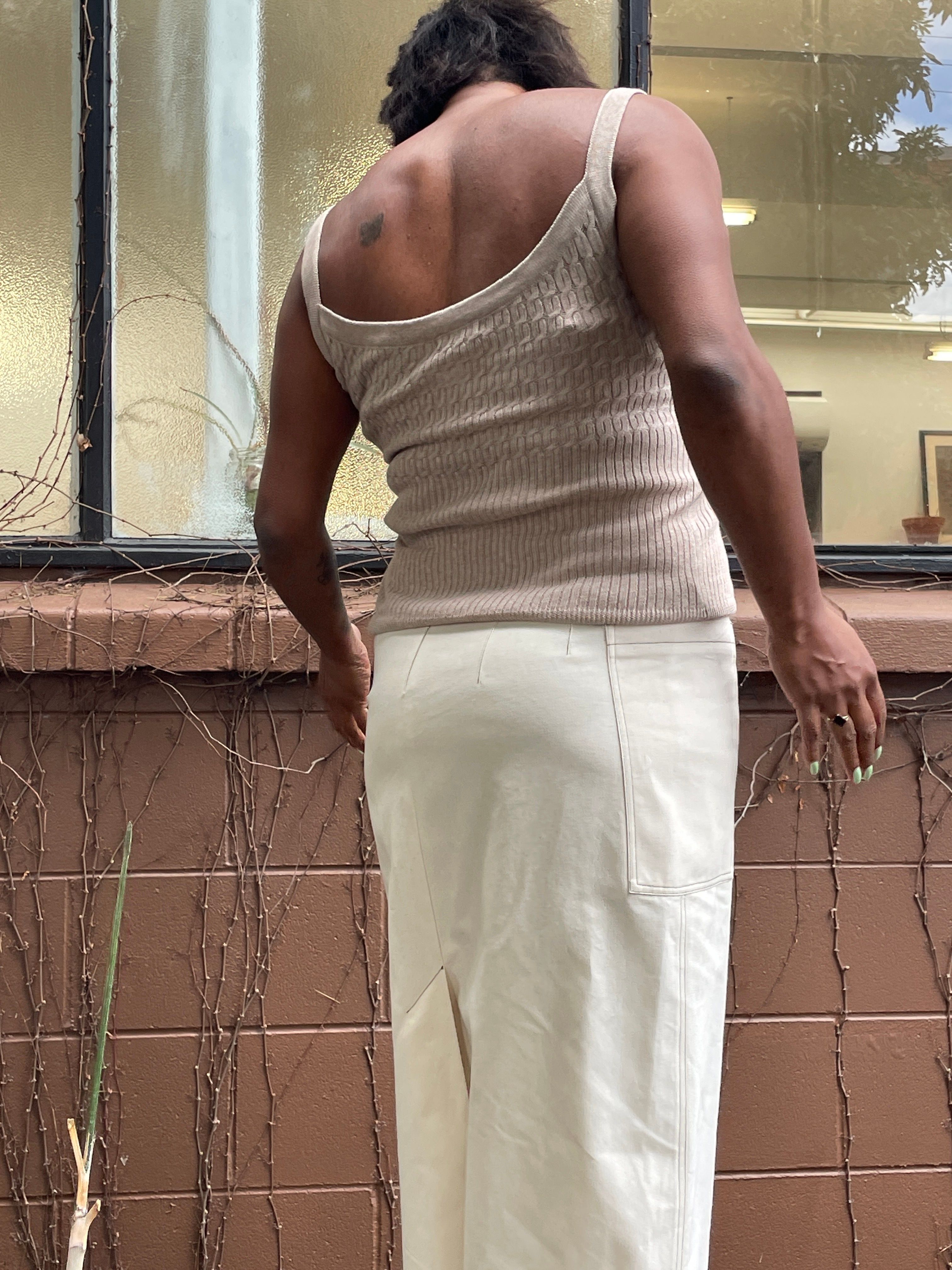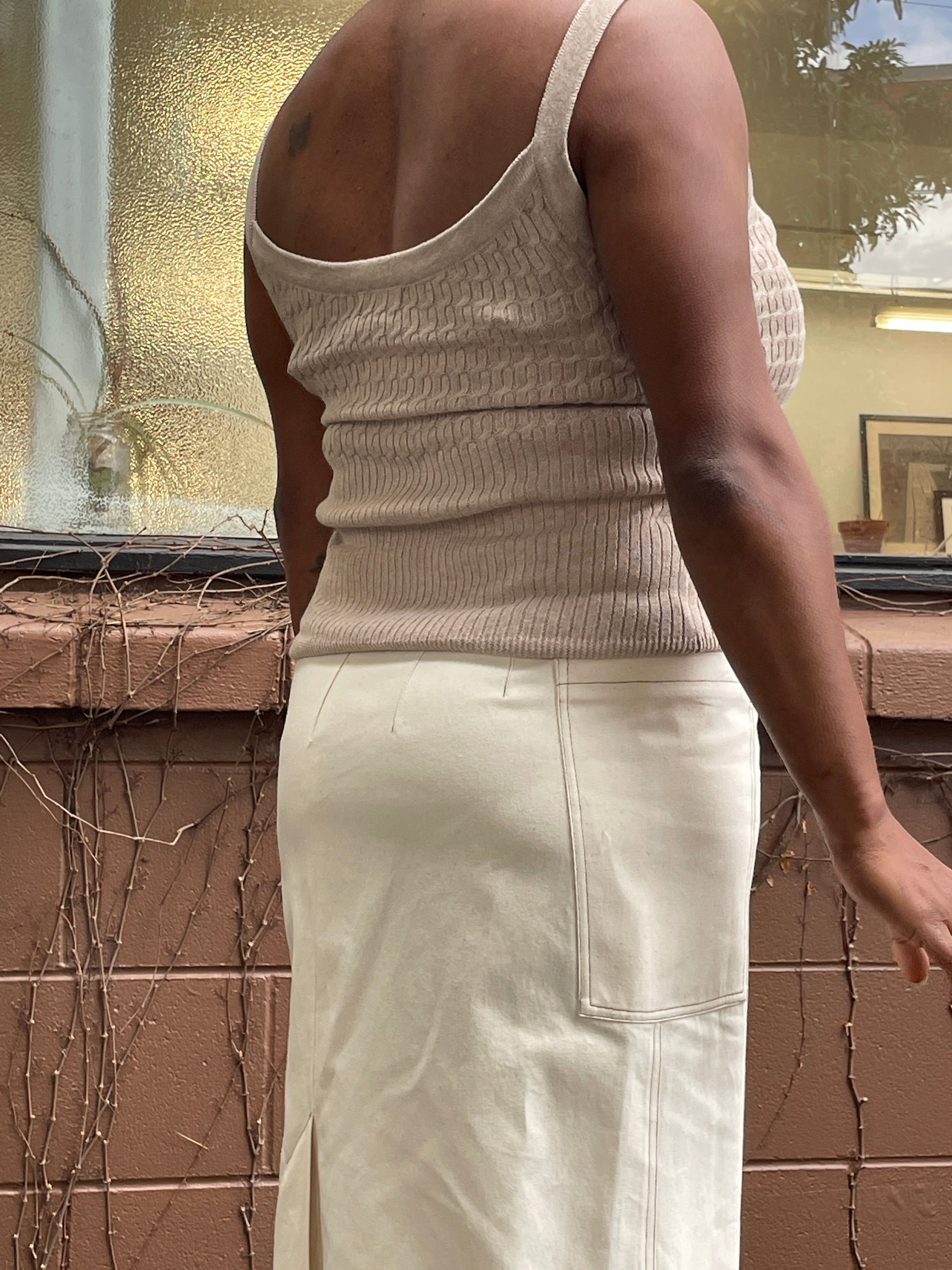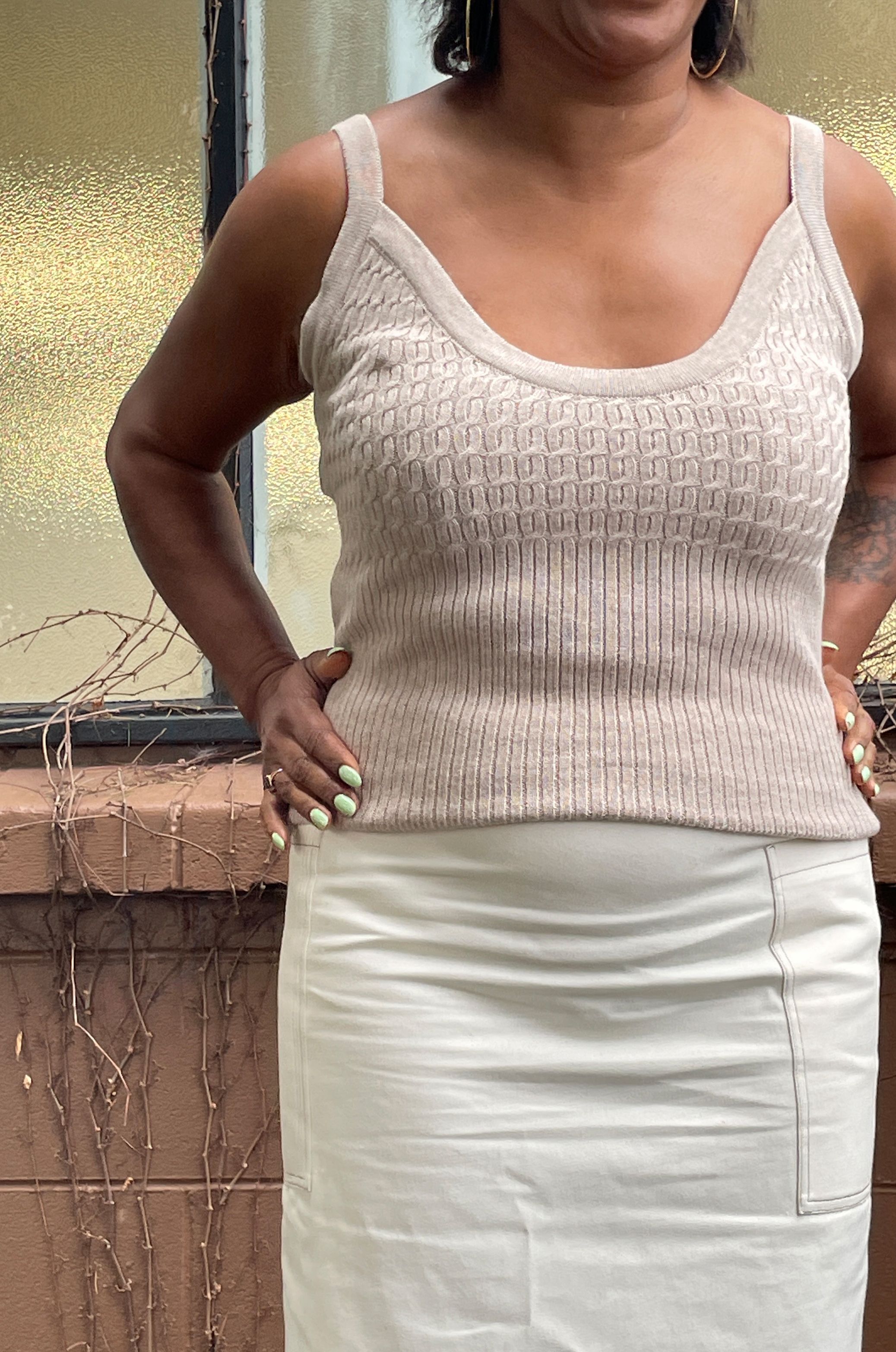 Wide strap Scoop neck Fitted silhouette Fine cable knit