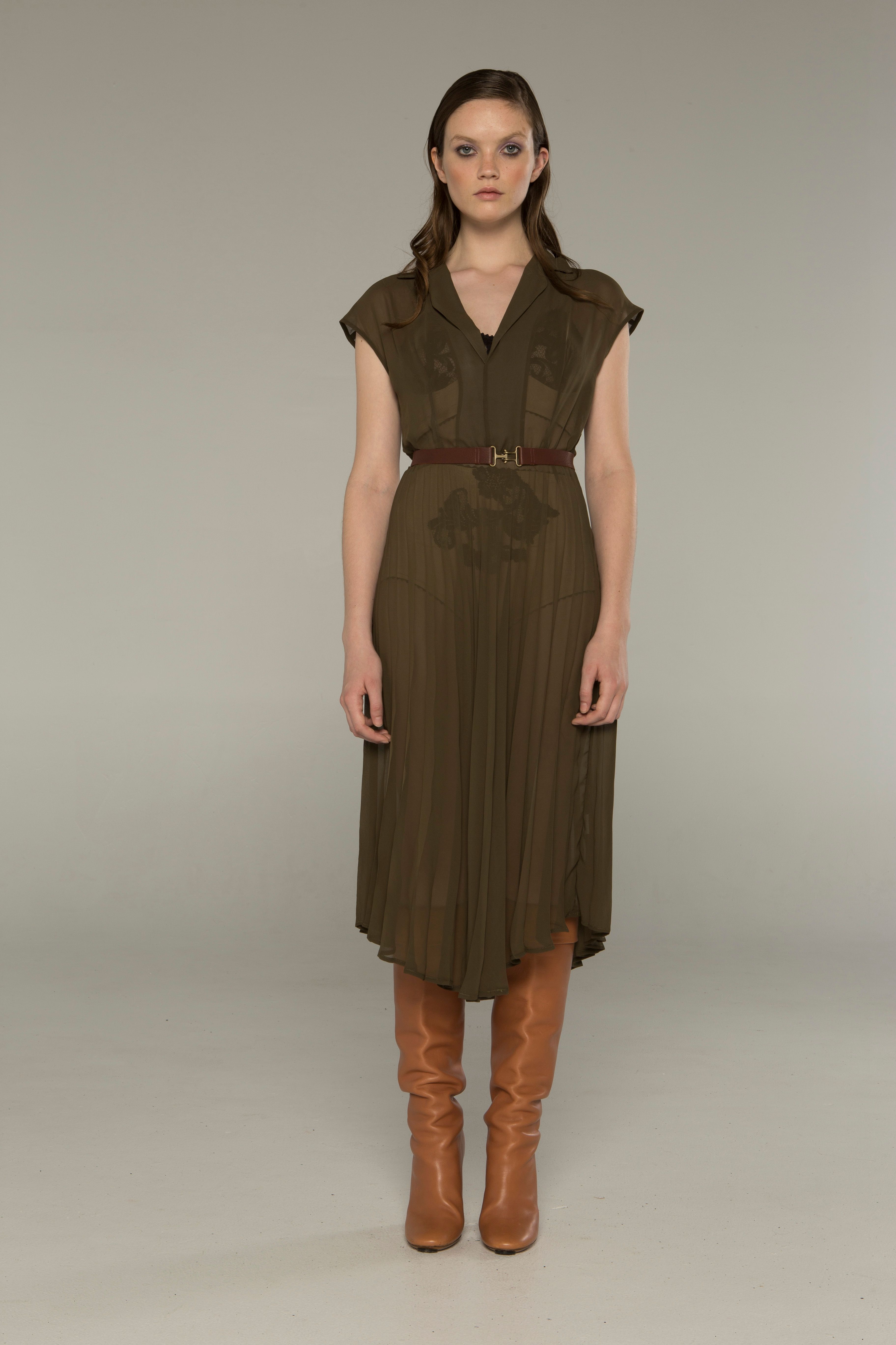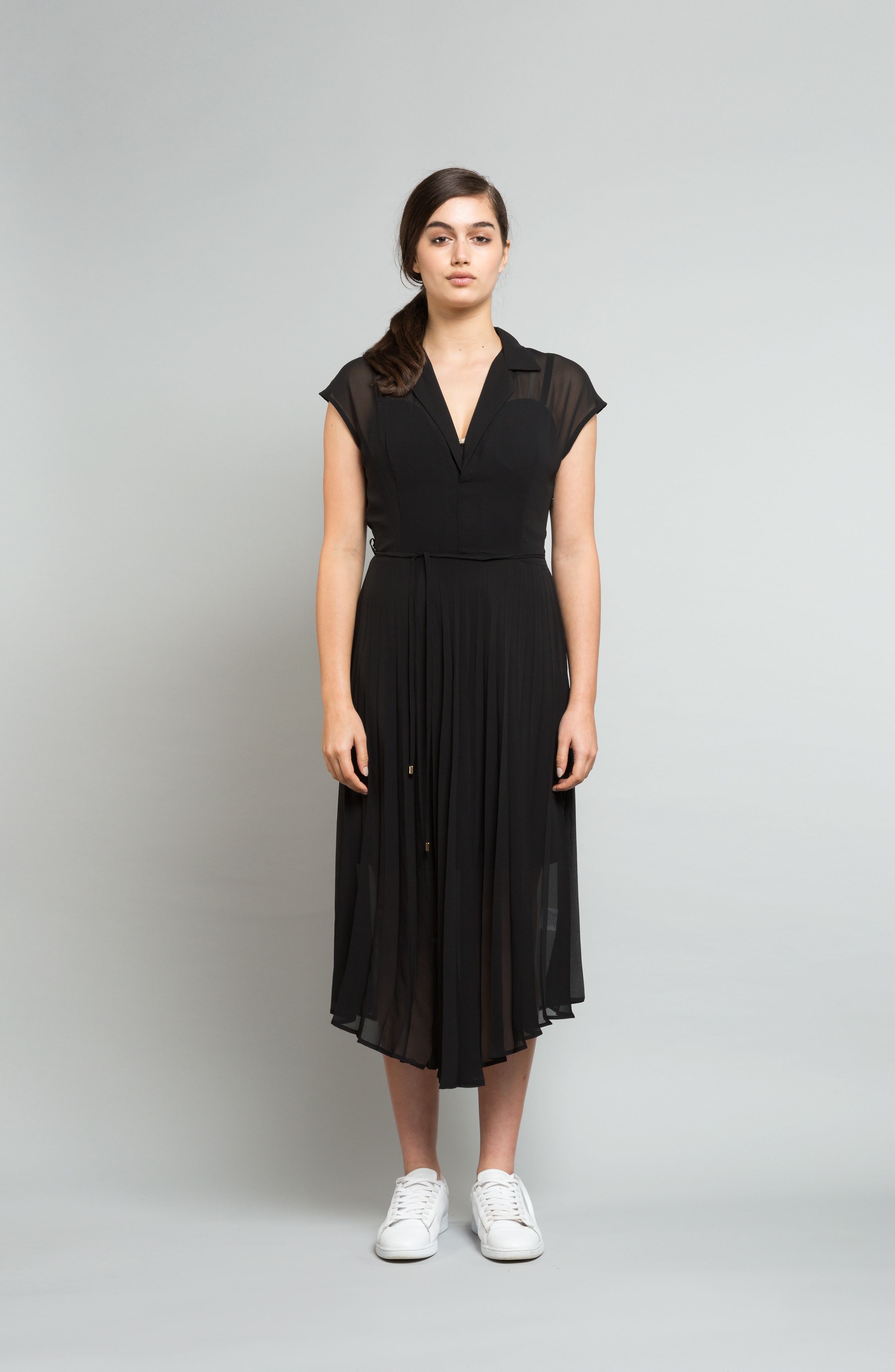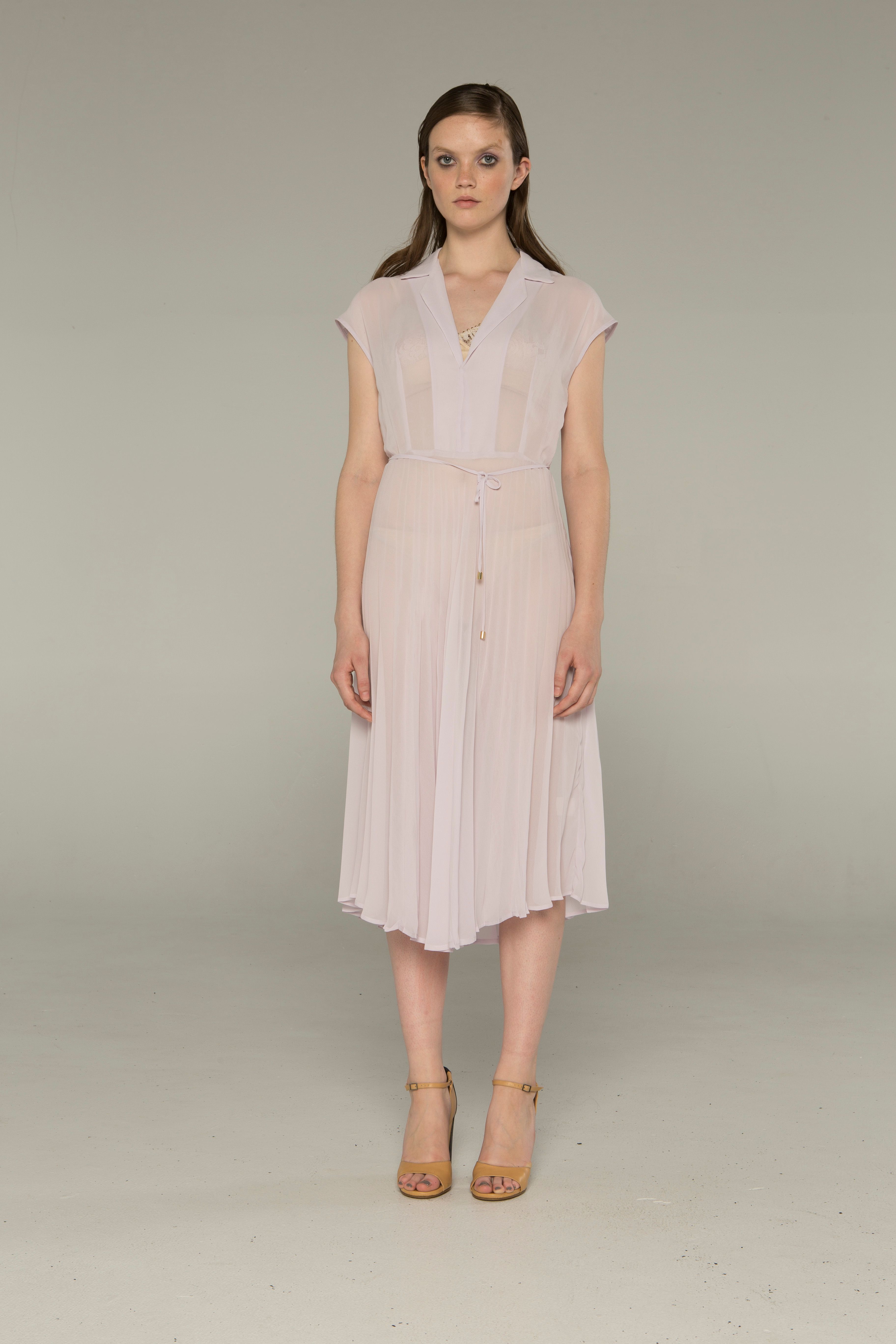 The Ditta Dress sits softly on the shoulder with a relaxed collar and short cap sleeve. Fine tie at the waist and a beautifully full pleated skirt that falls to just below the knee.