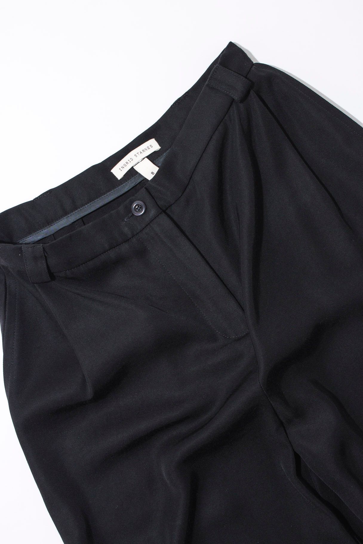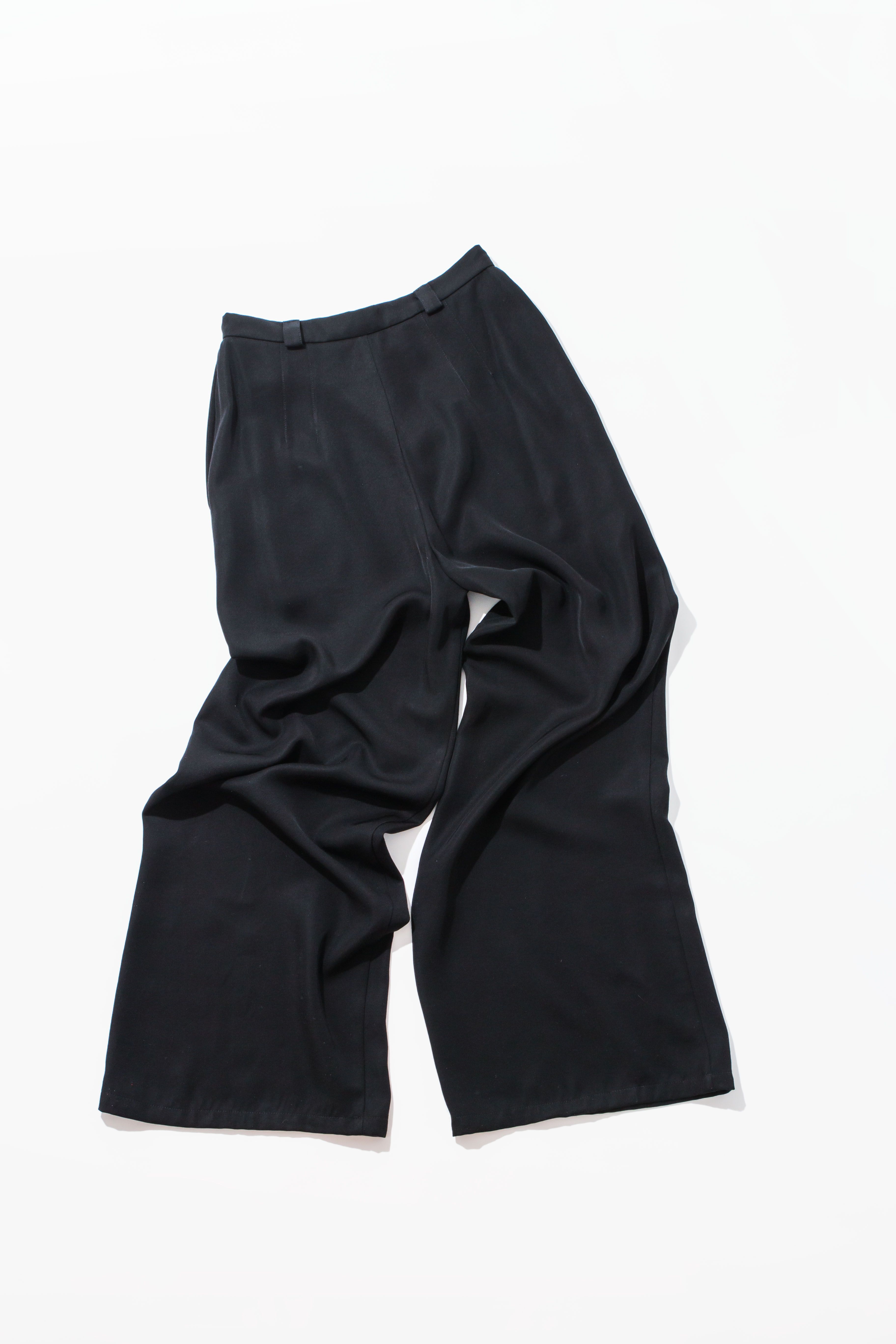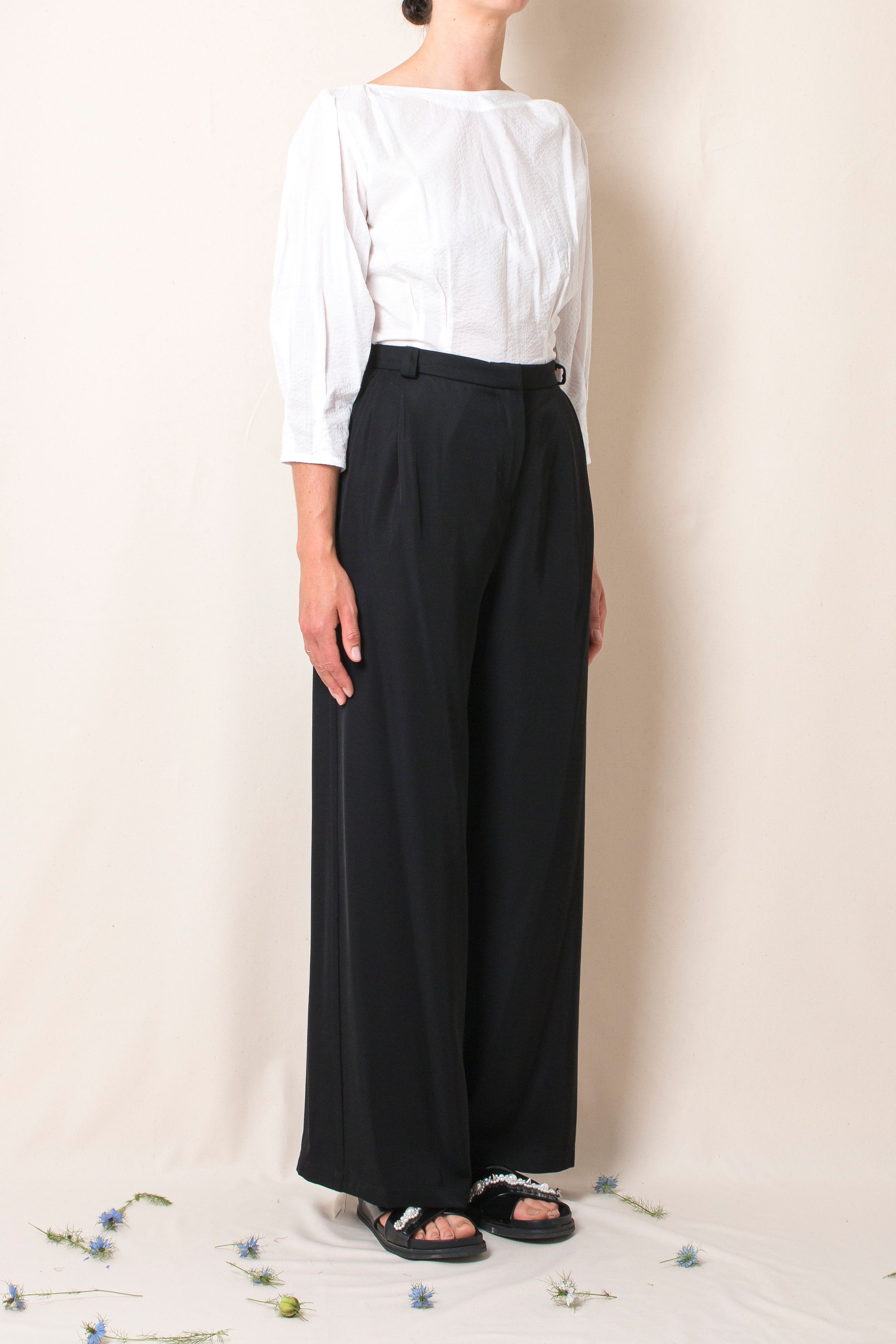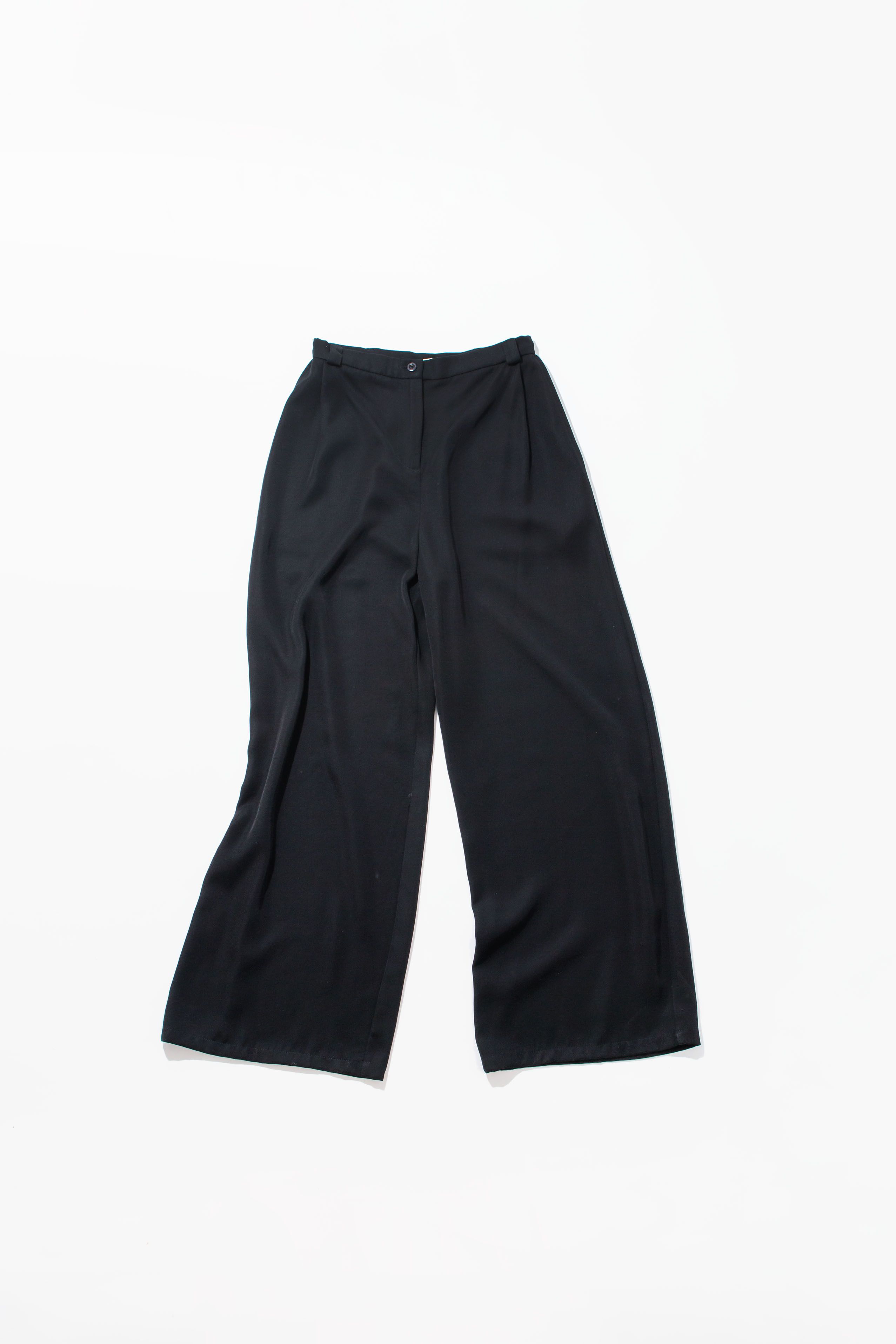 Slim waistband that sits high on the waist Wide leg Latch closure Full-length