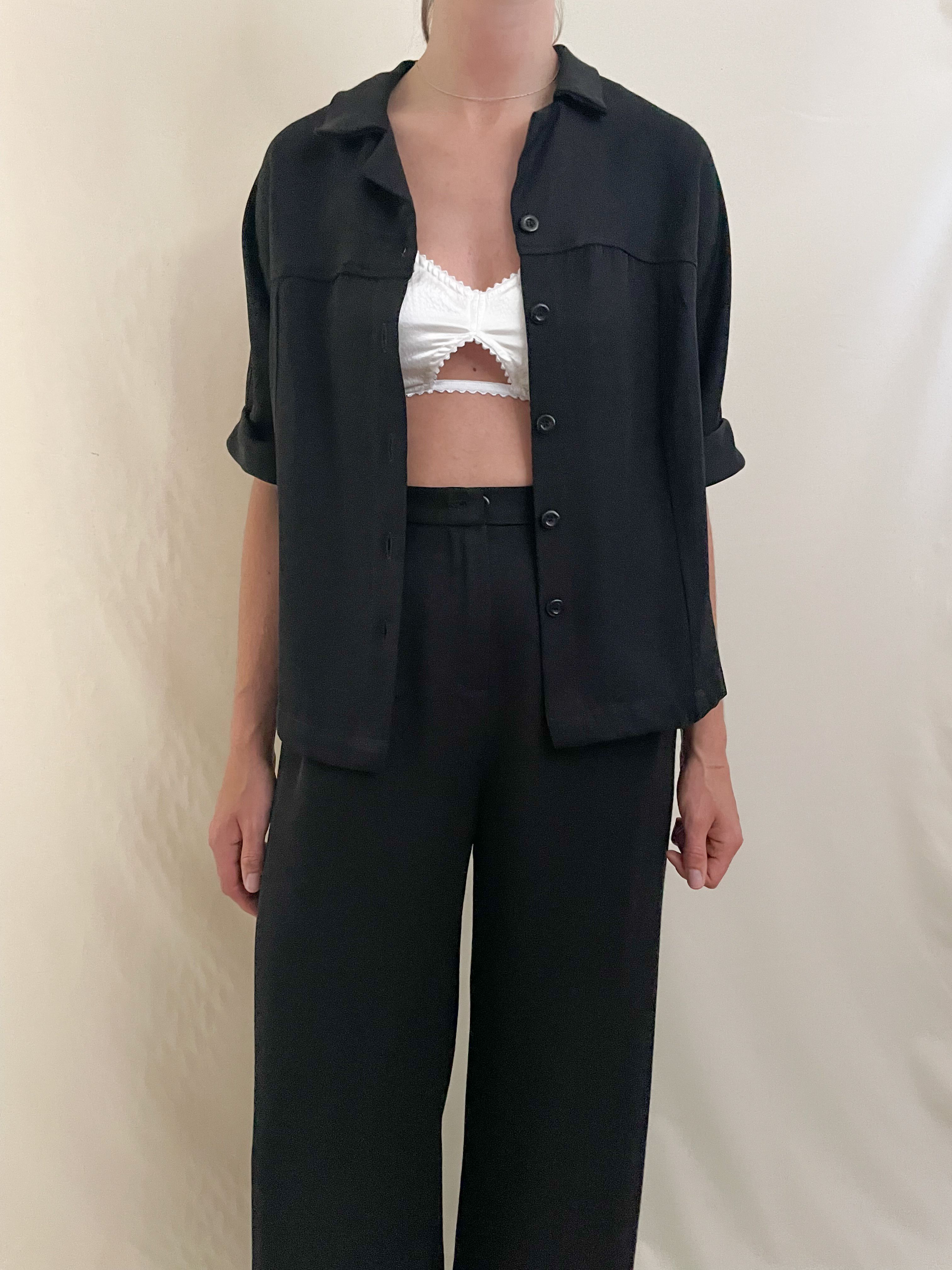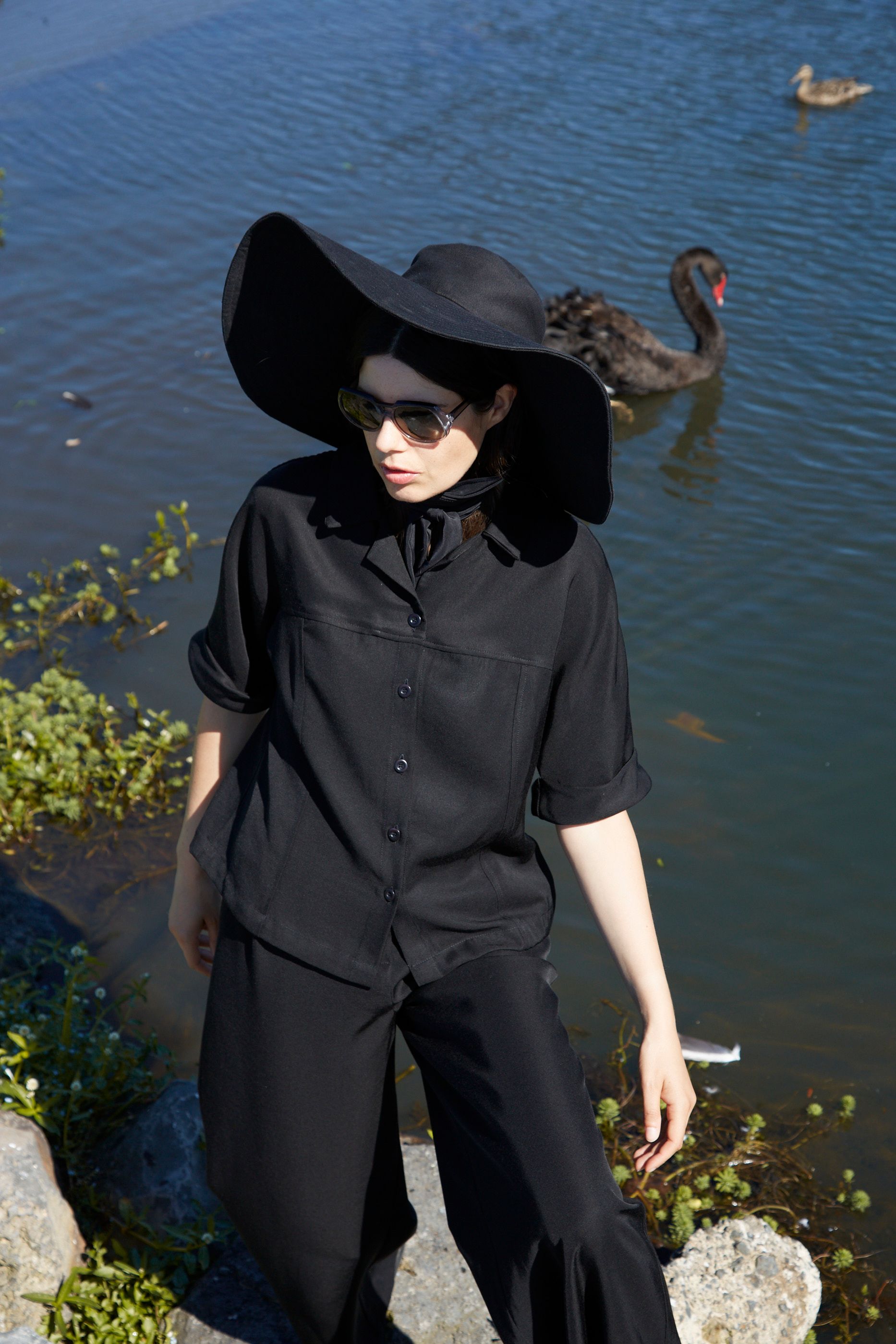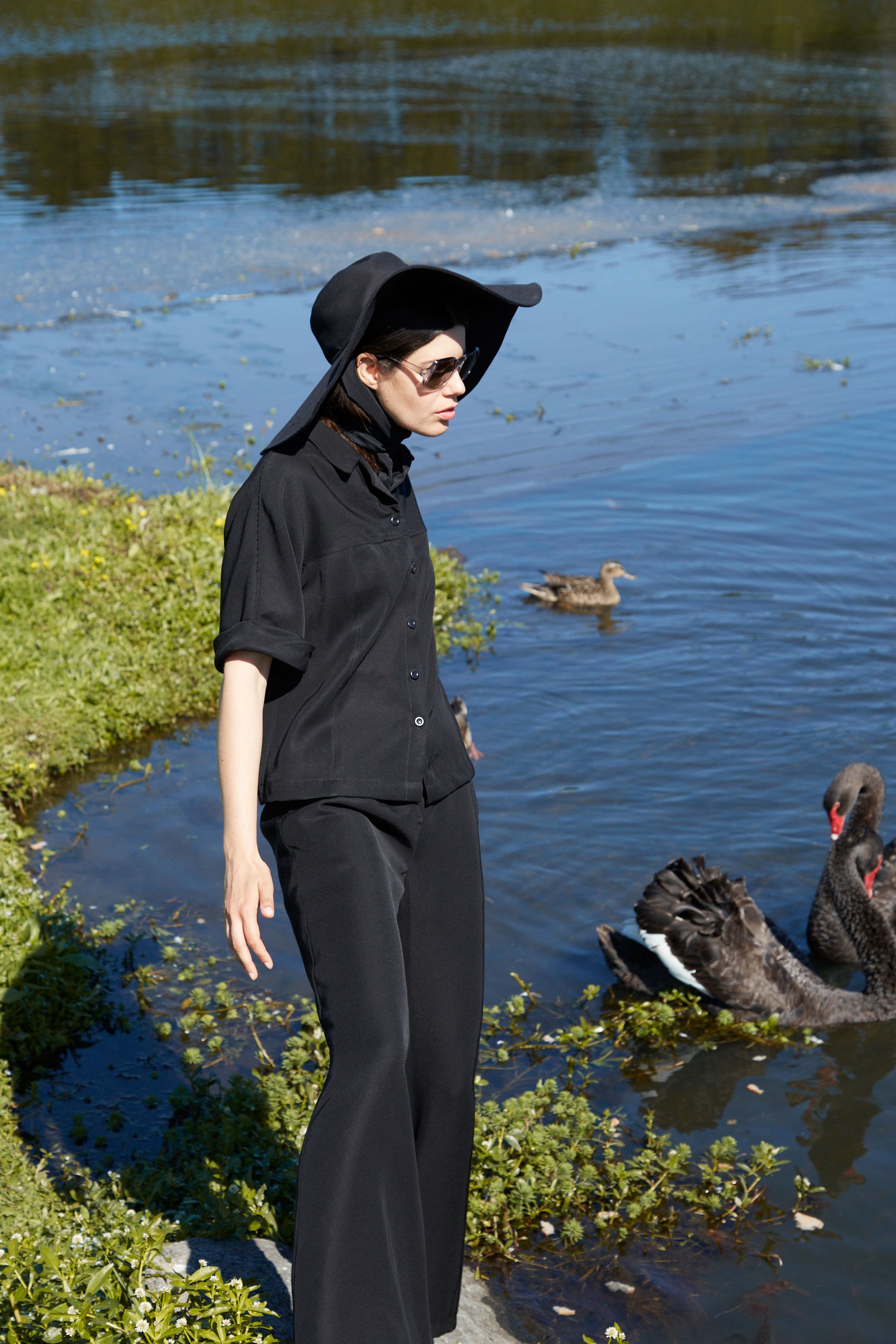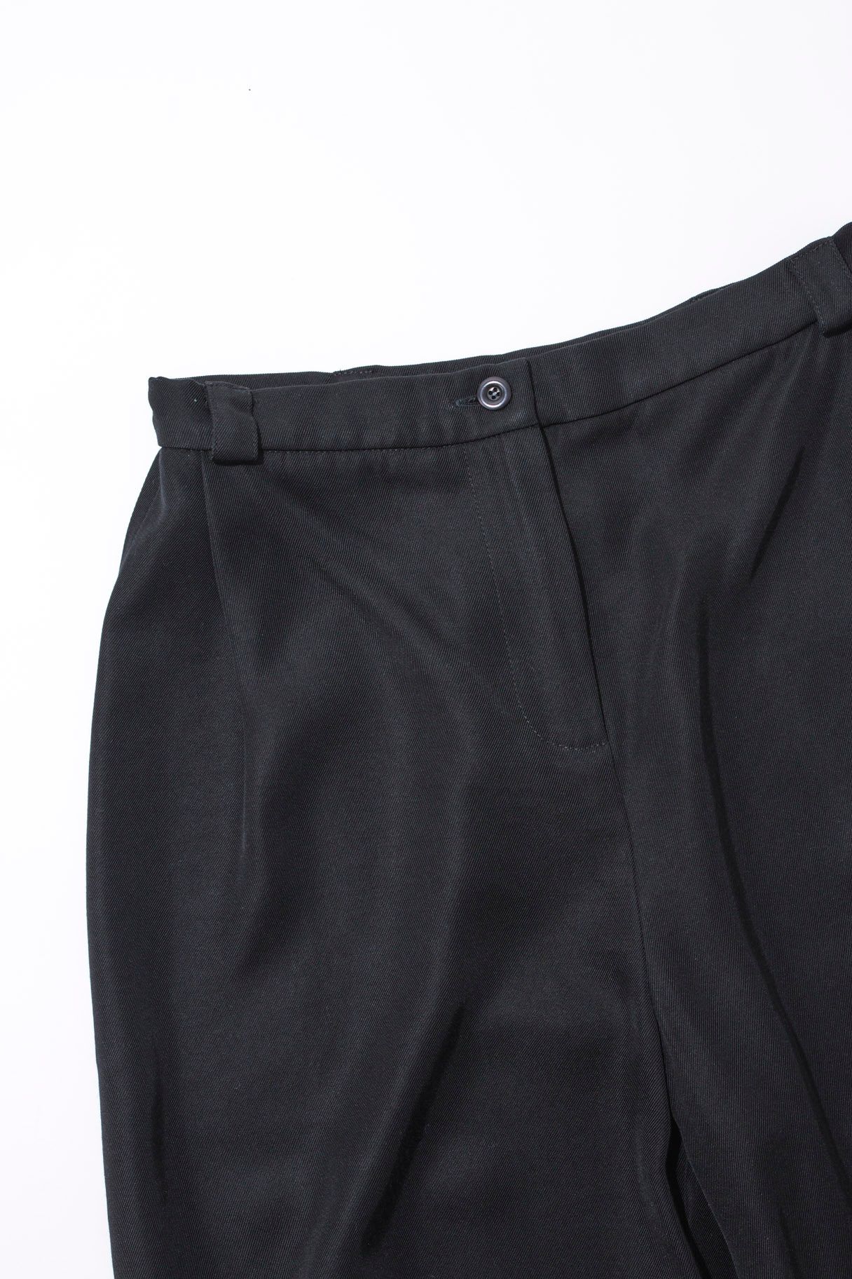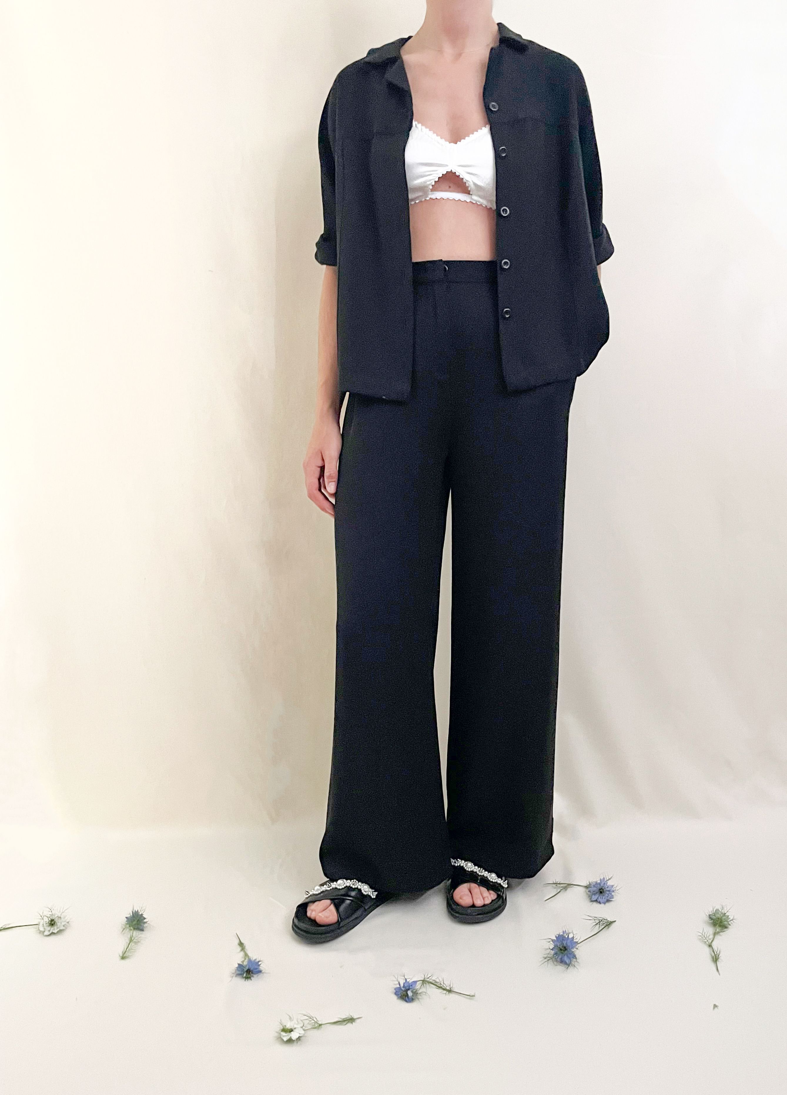 Slim waistband that sits high on the waist Wide leg Latch closure Full-length