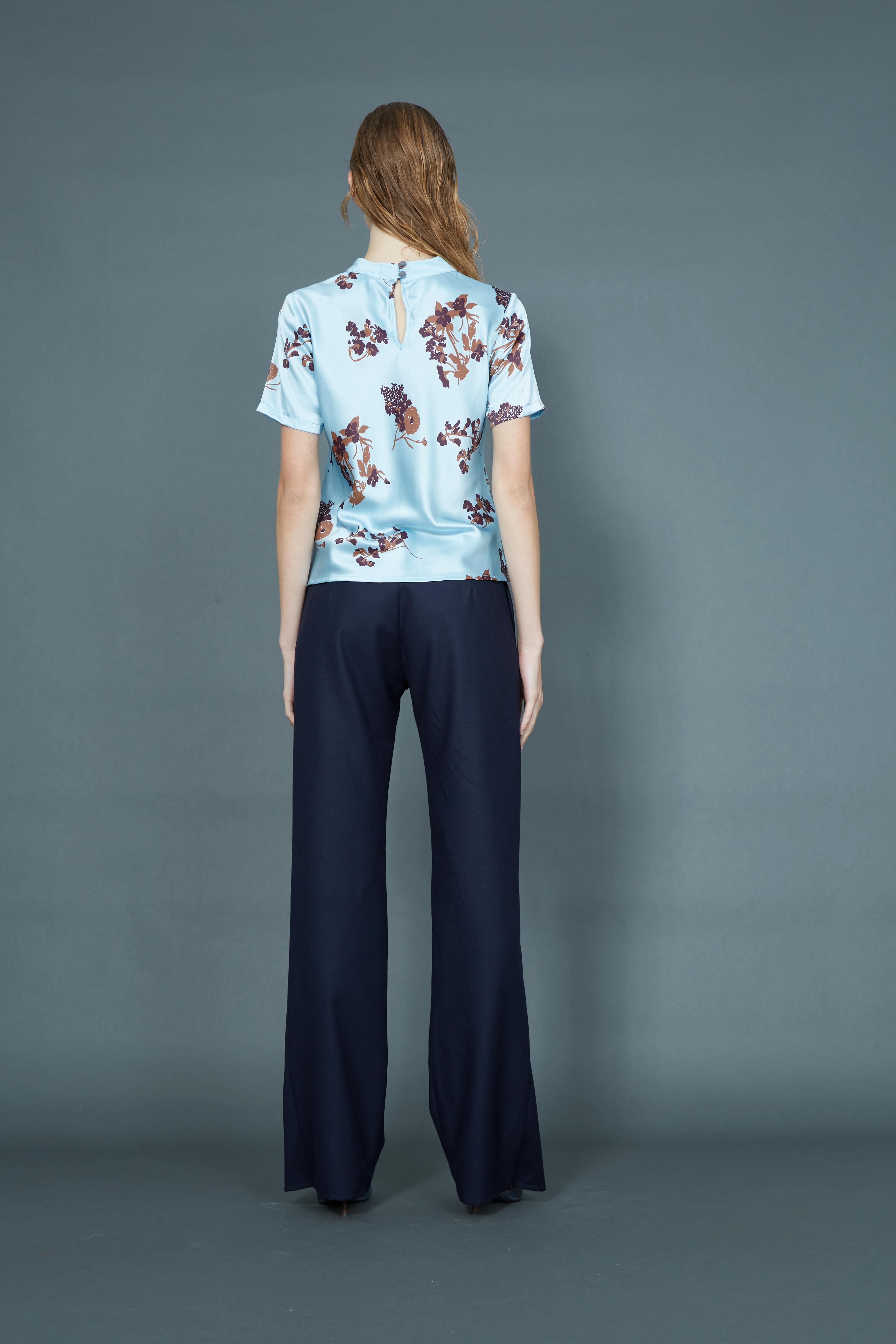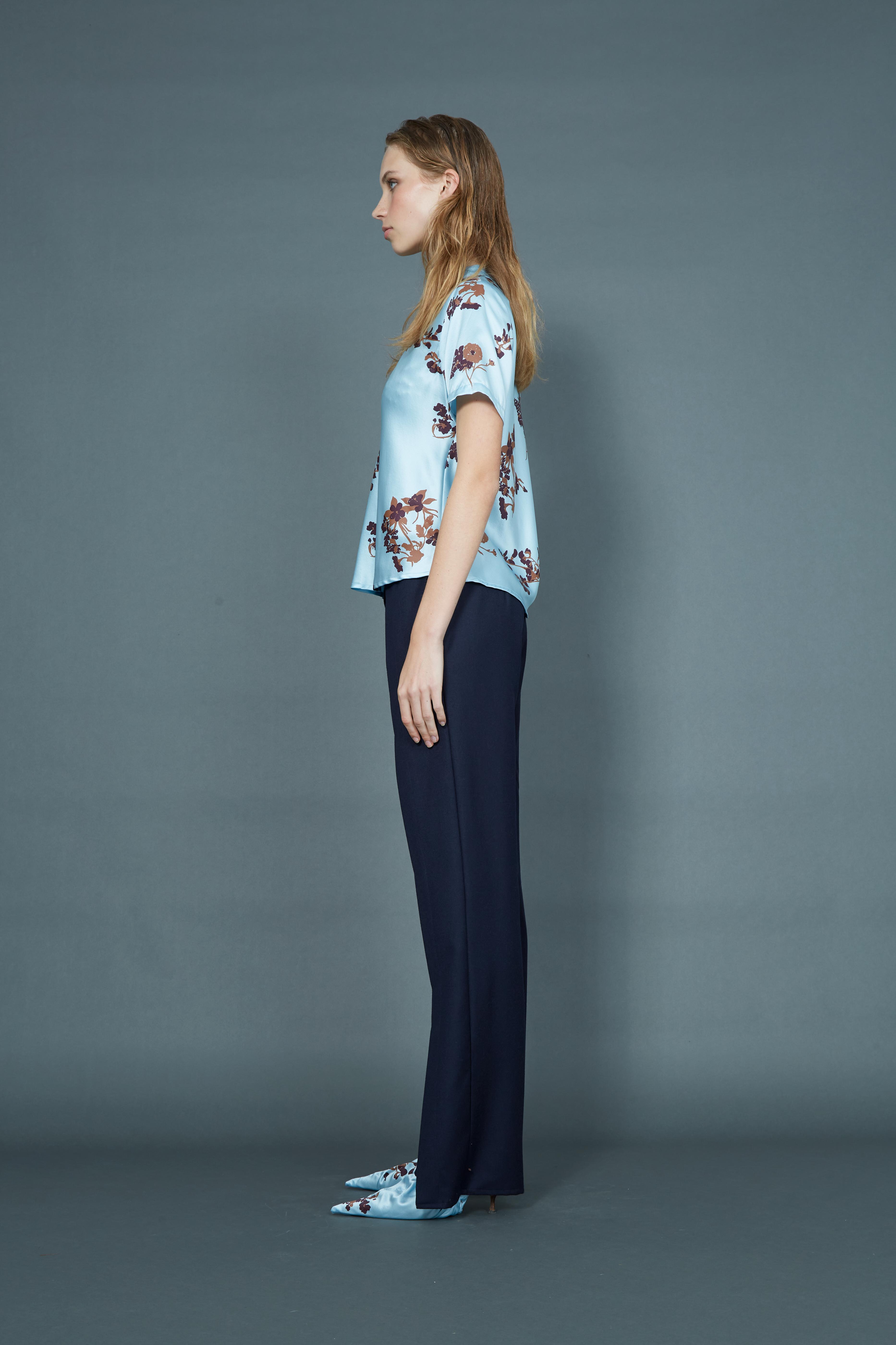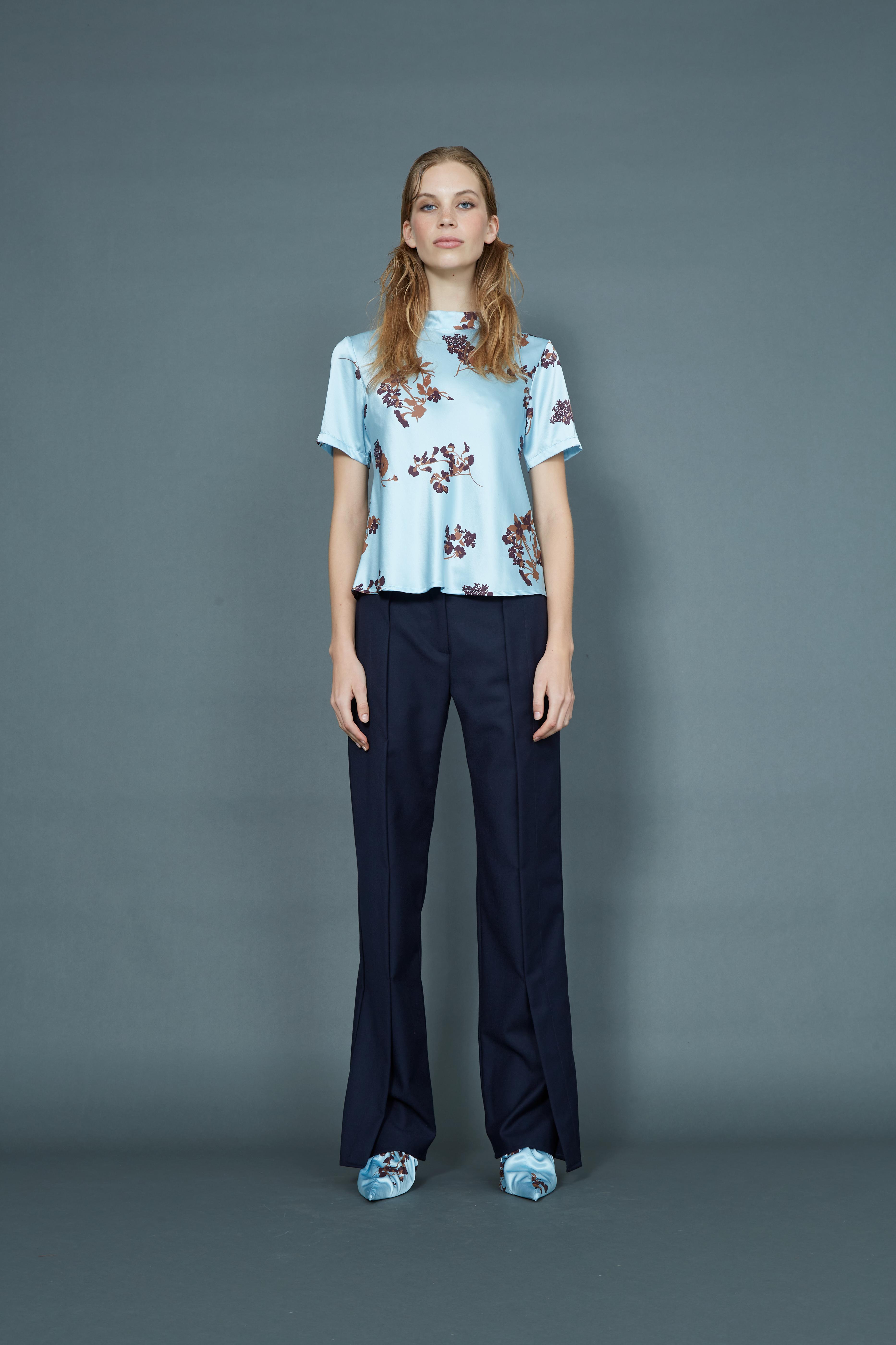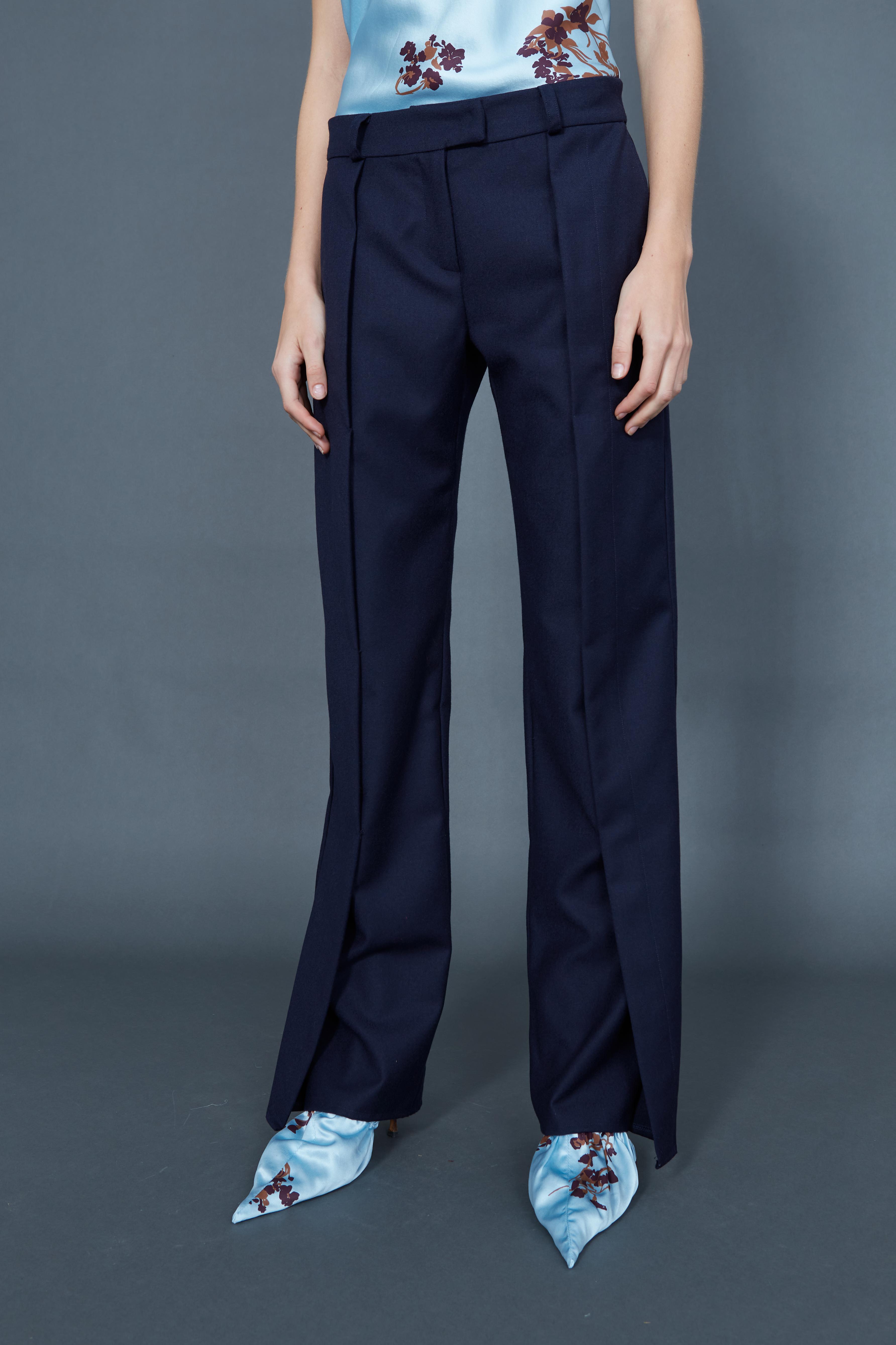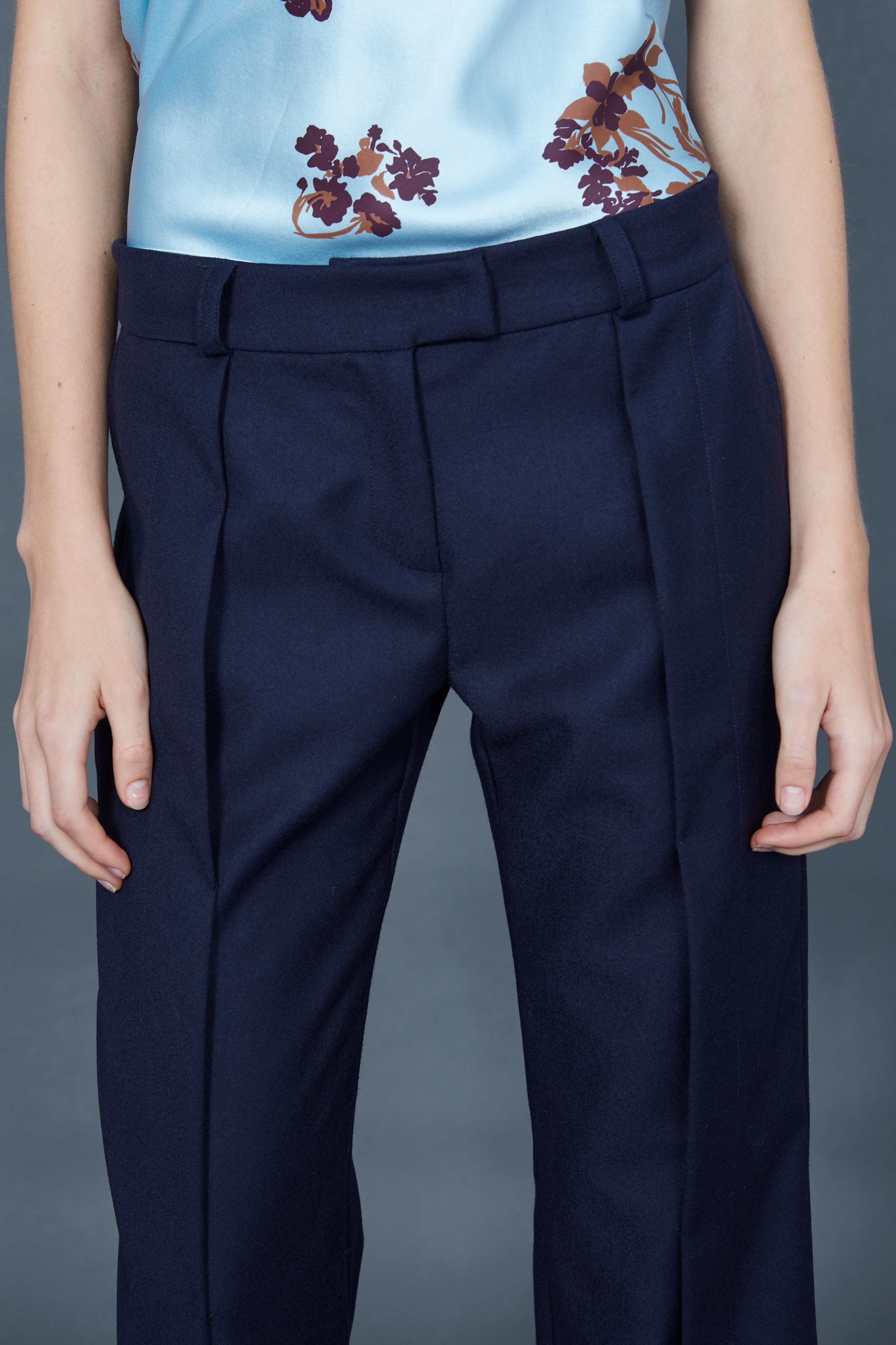 Sits on the hips Straight leg Sewn down pleat down the front Belt loops