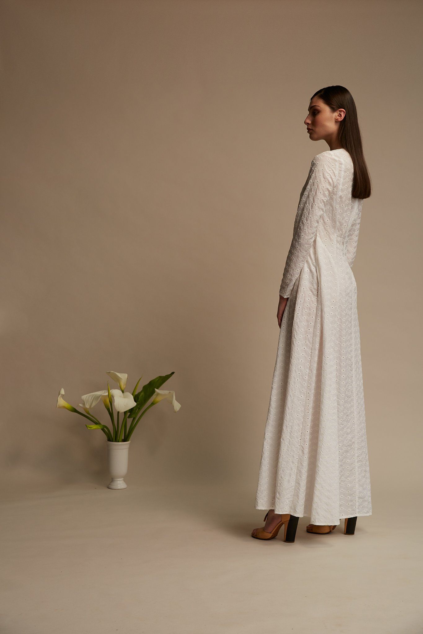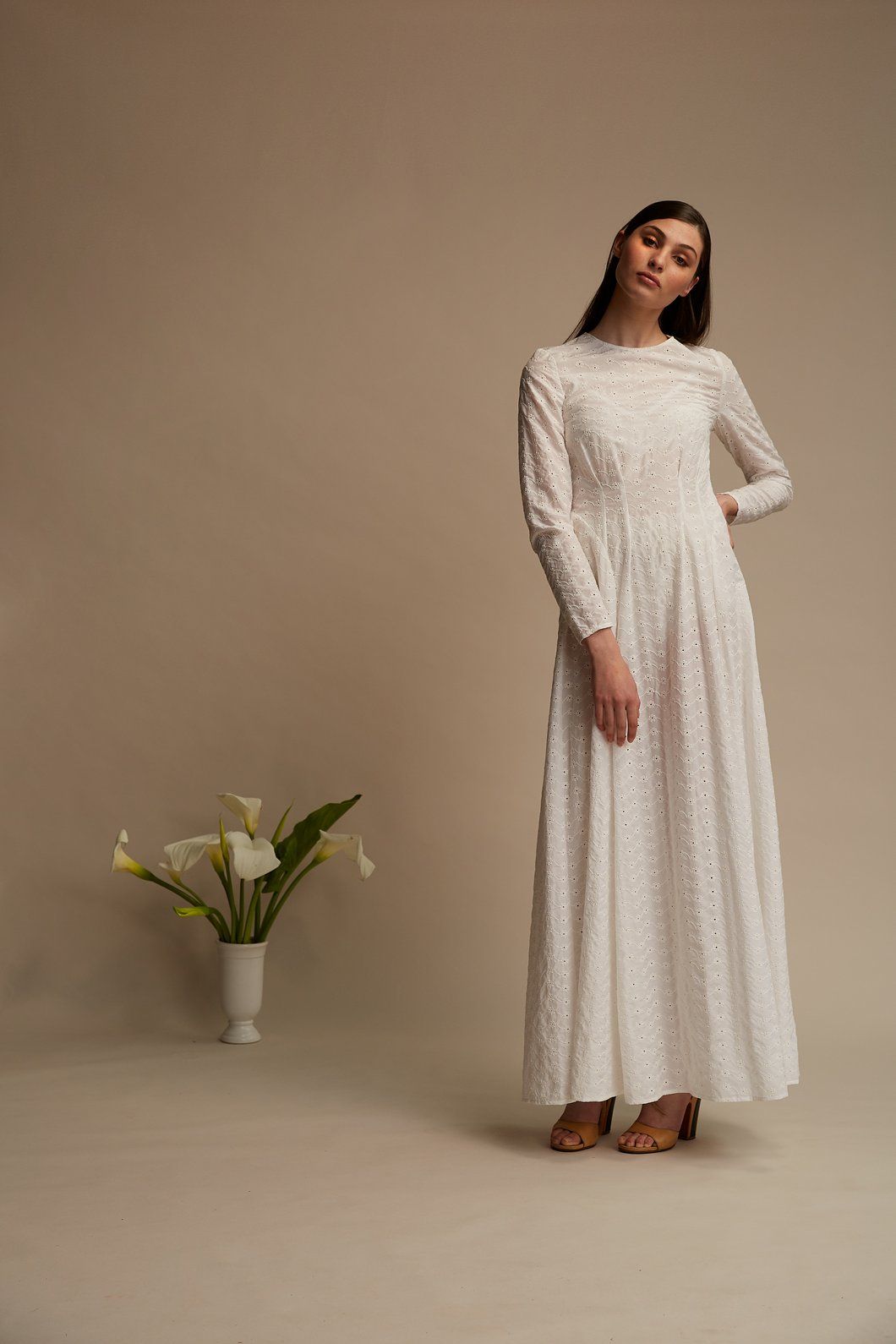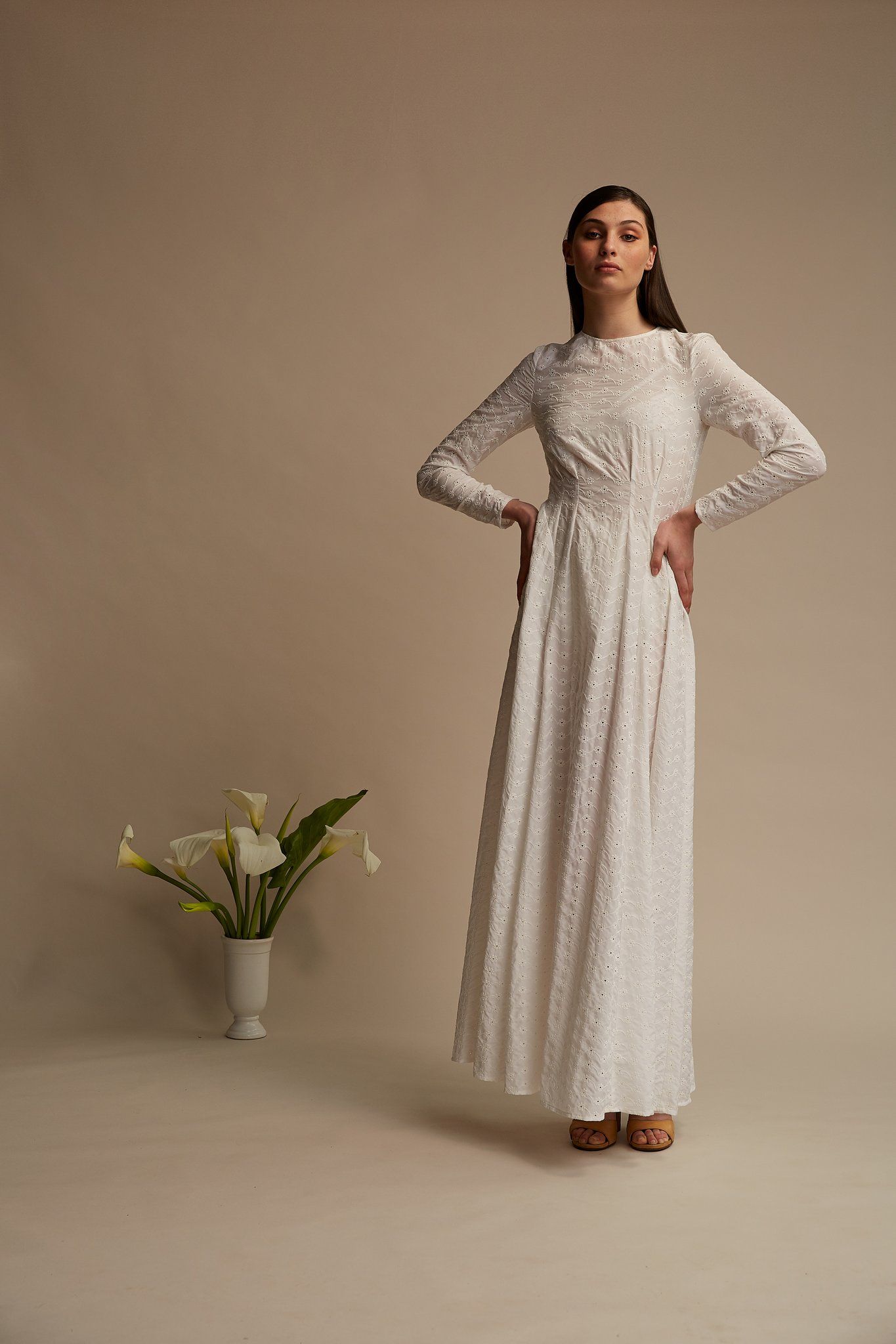 The romantic Floretta dress in detailed silk cotton broderie. Rounded, high neckline and neat on the shoulder. Zip closure at back. Full length sleeves finish at the wrist. Beautiful seam detailing defines the waist and travels the length of the dress. Seams over the hips create structure and subtle volume. Skirt falls beautifully to the floor.