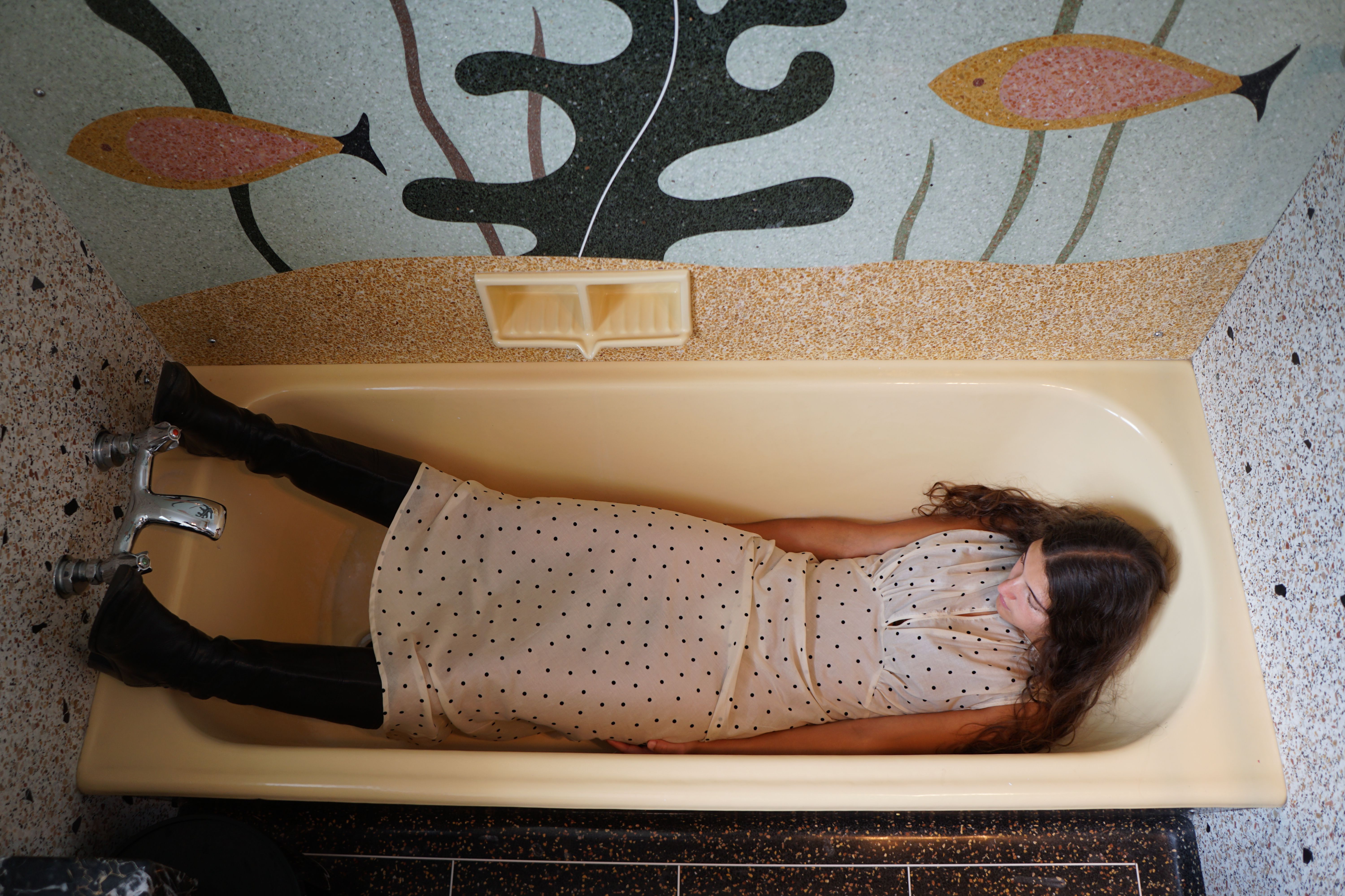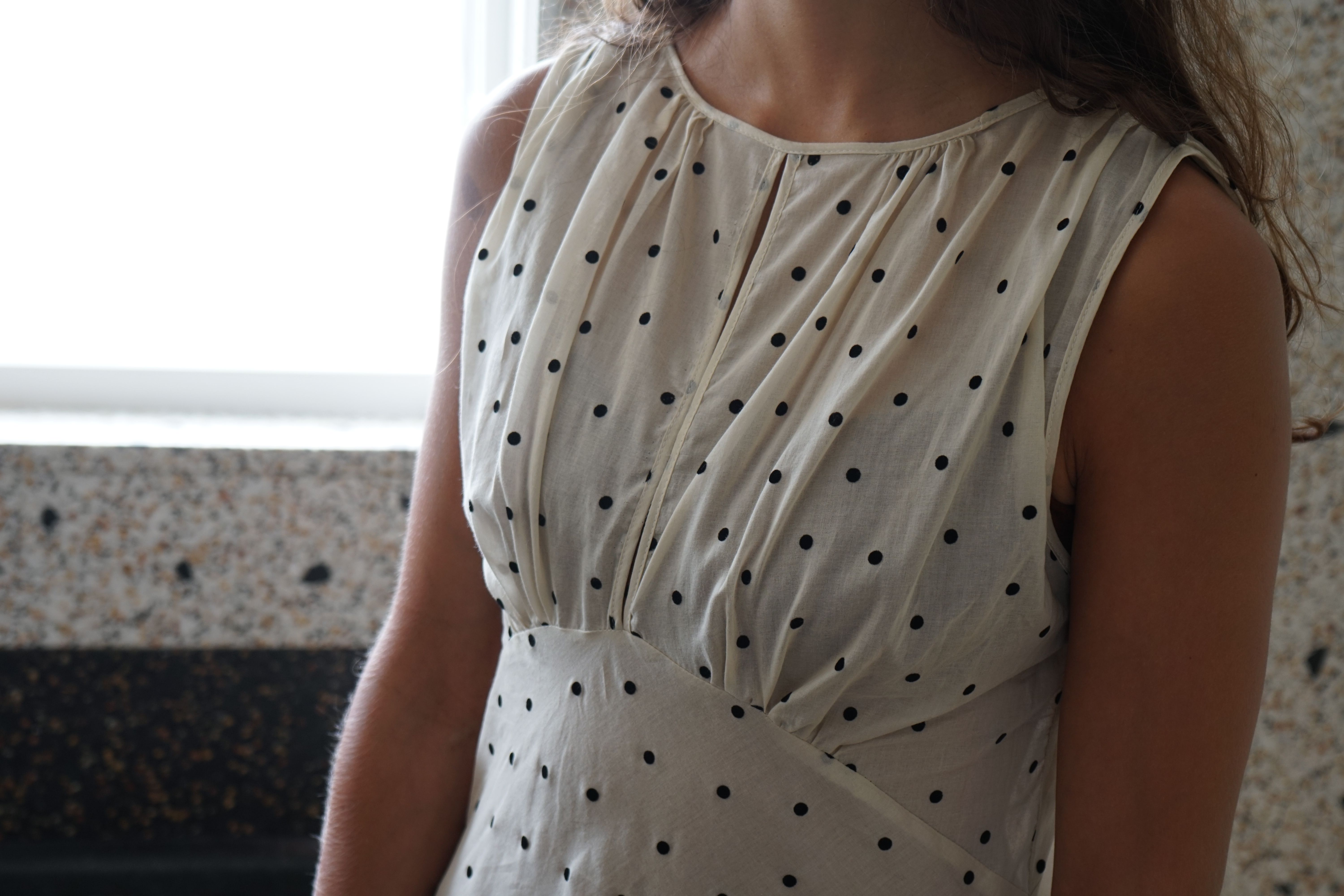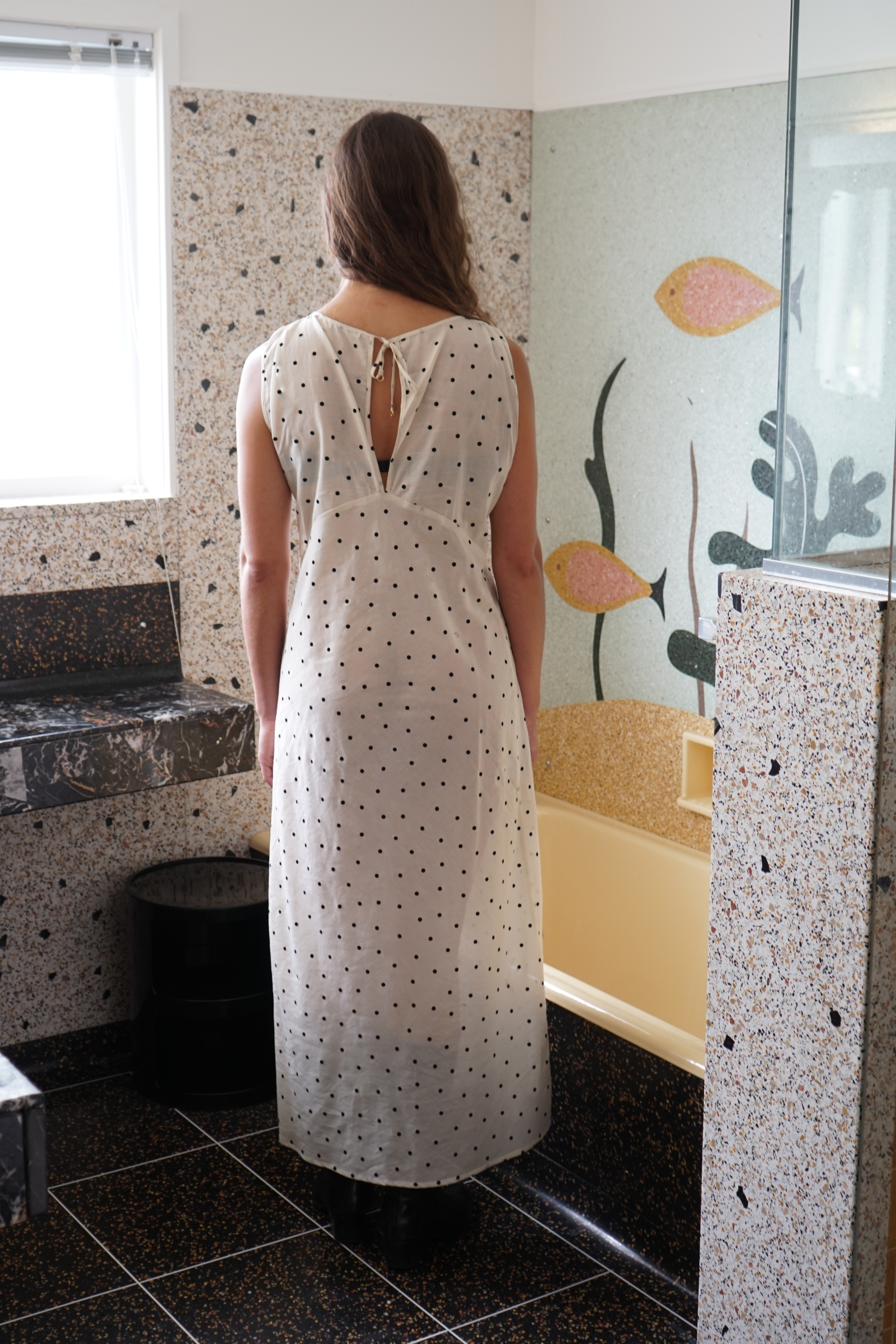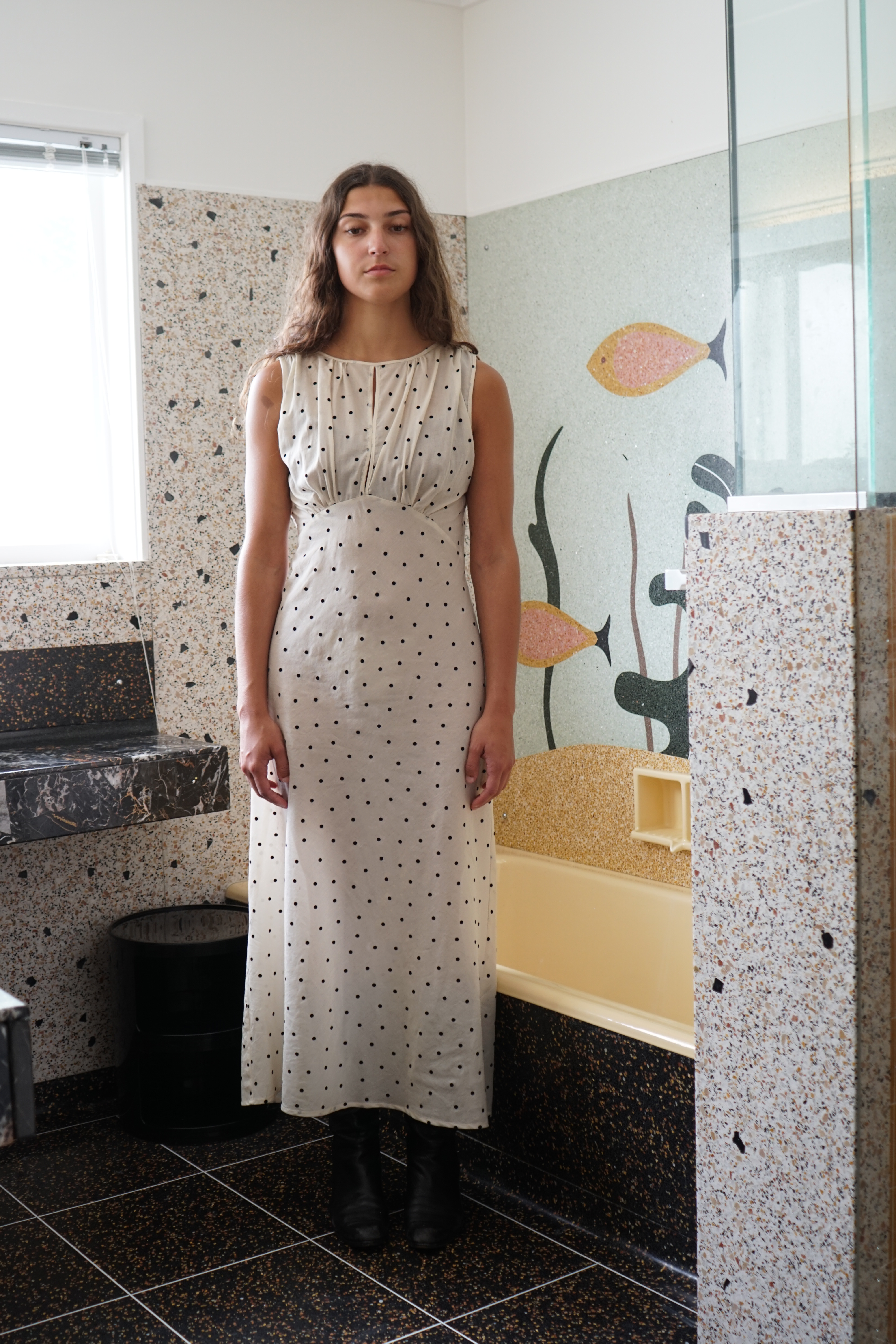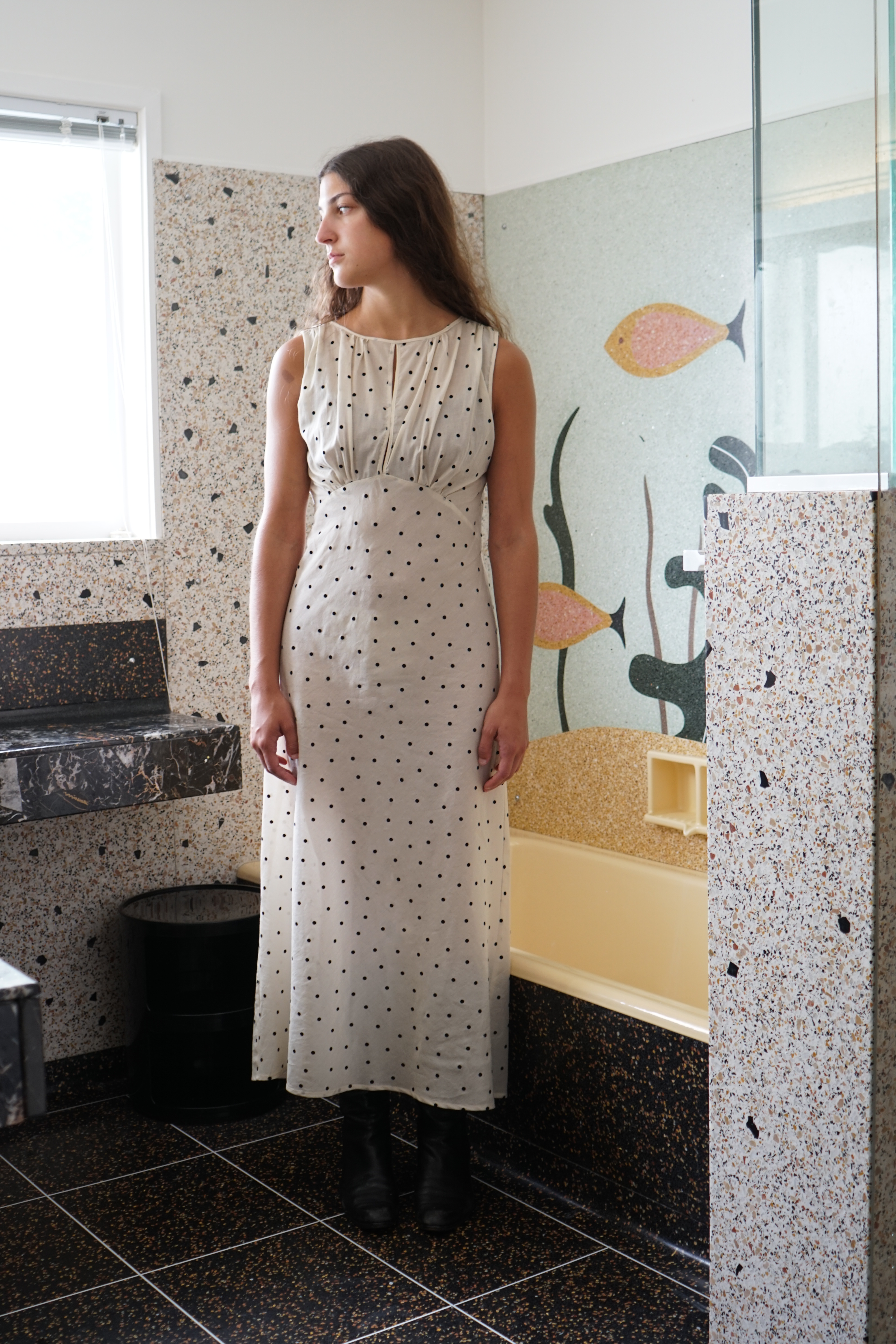 The Heidi dress is made from 100% lightweight cotton and features a black flocked spot design. It includes a bias-cut skirt with gathering under the bust, a bound neckline, and openings at both the front and back of the neck.