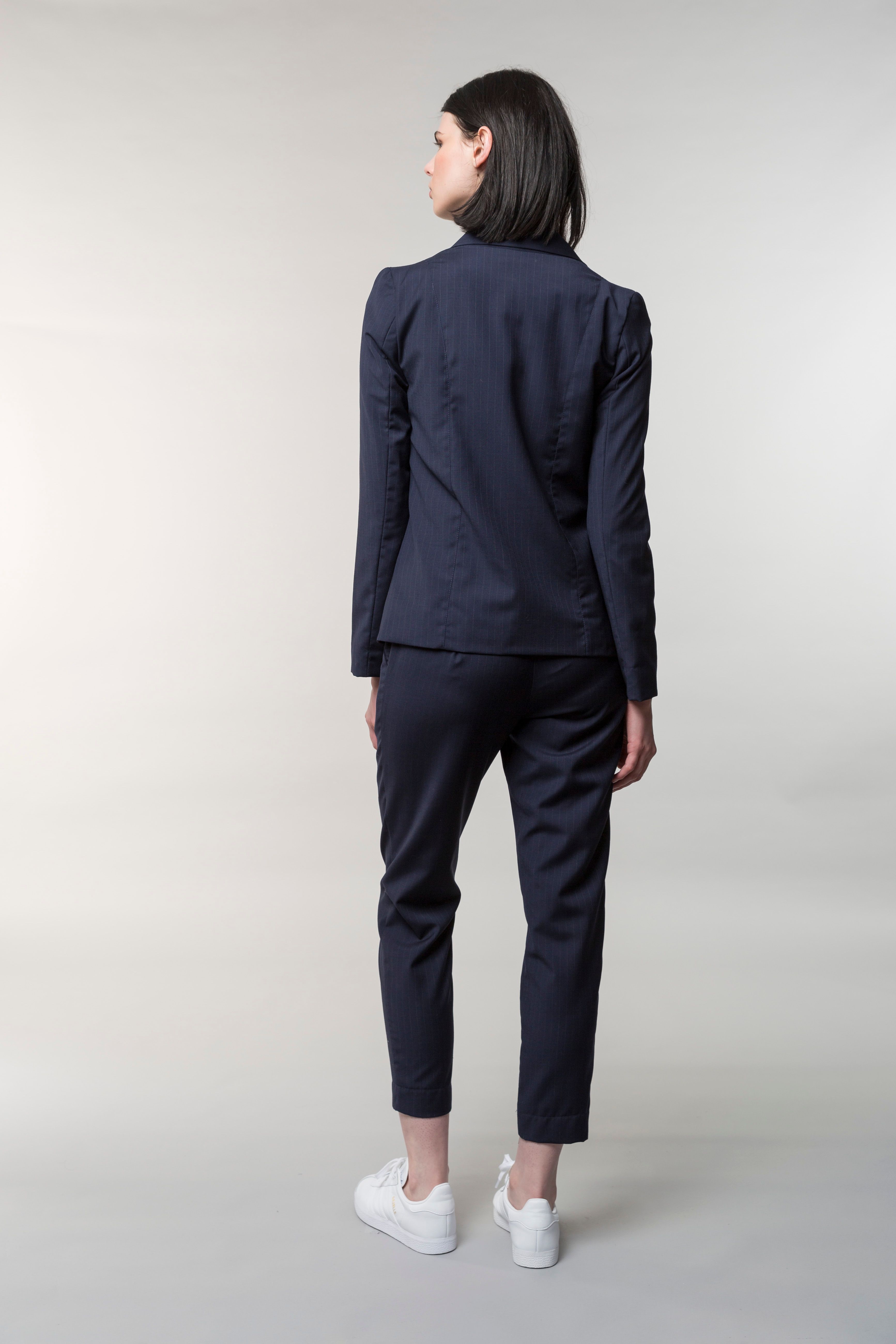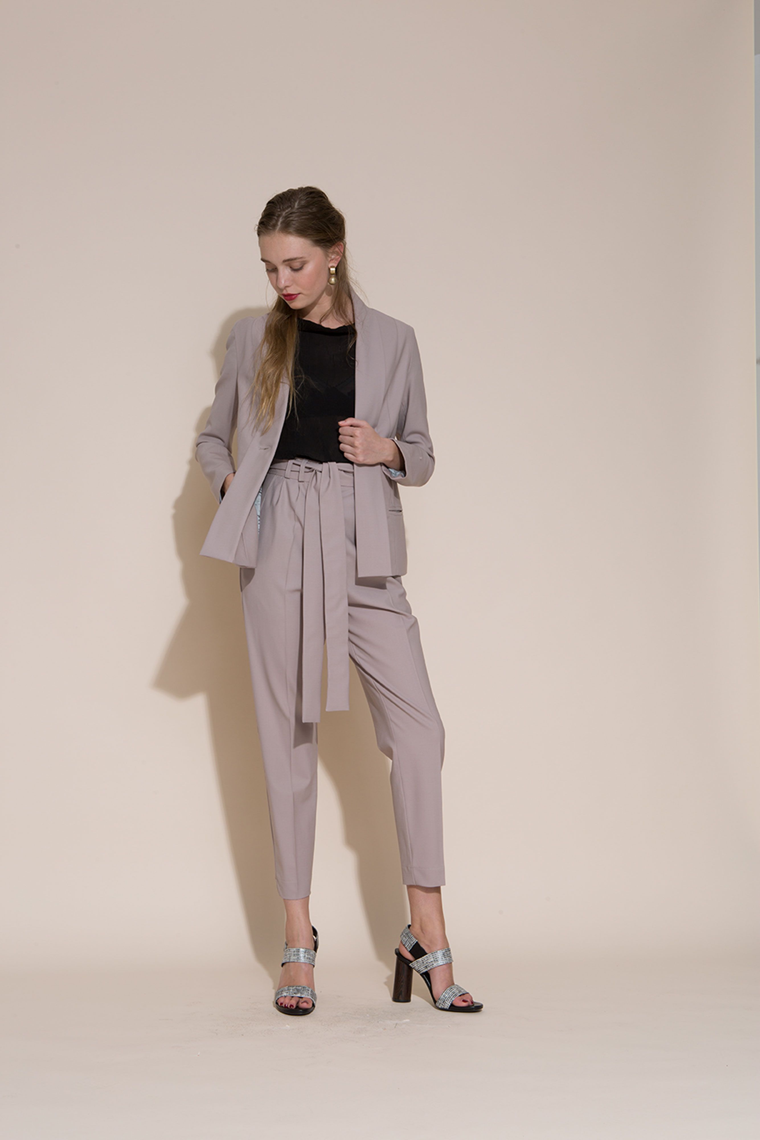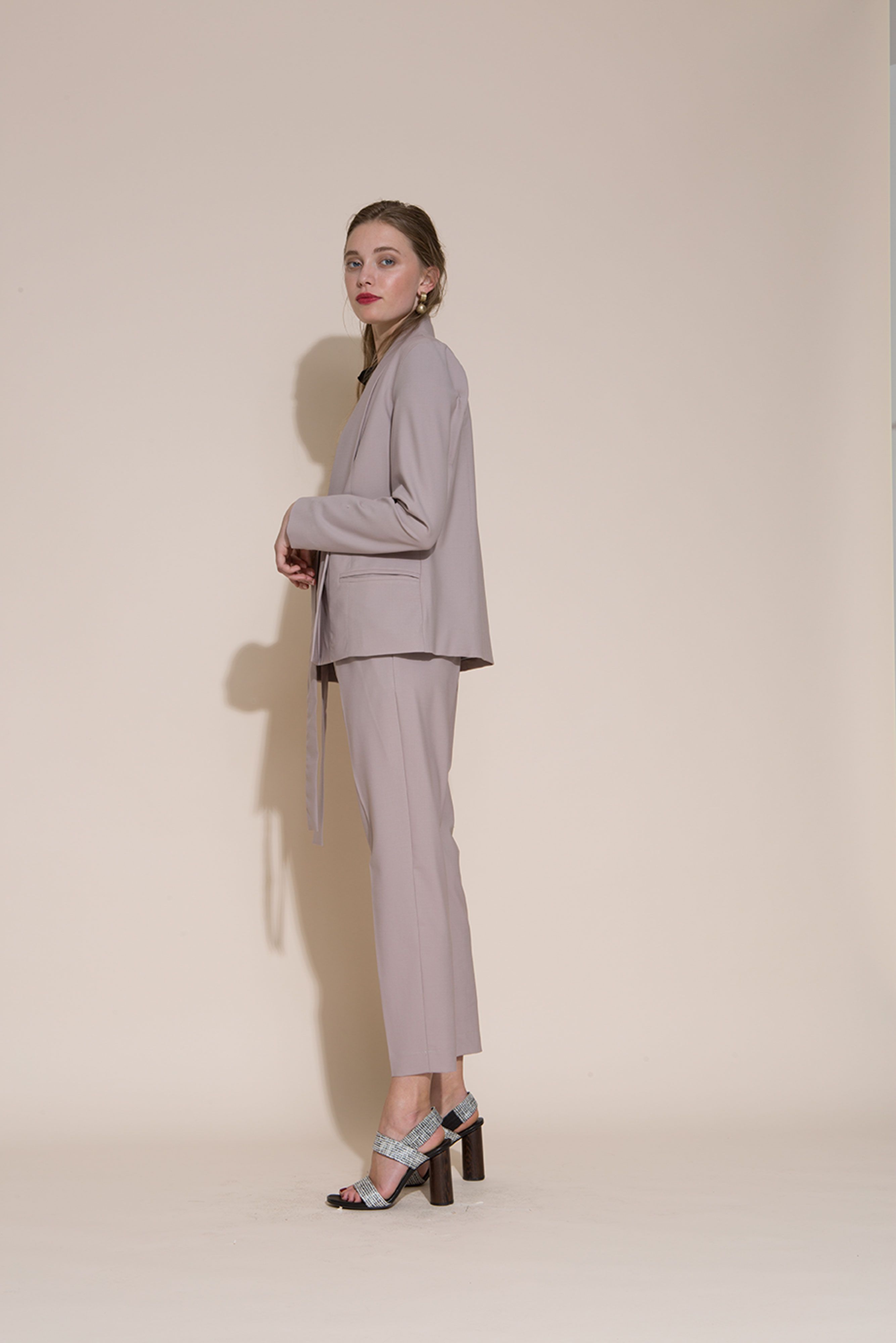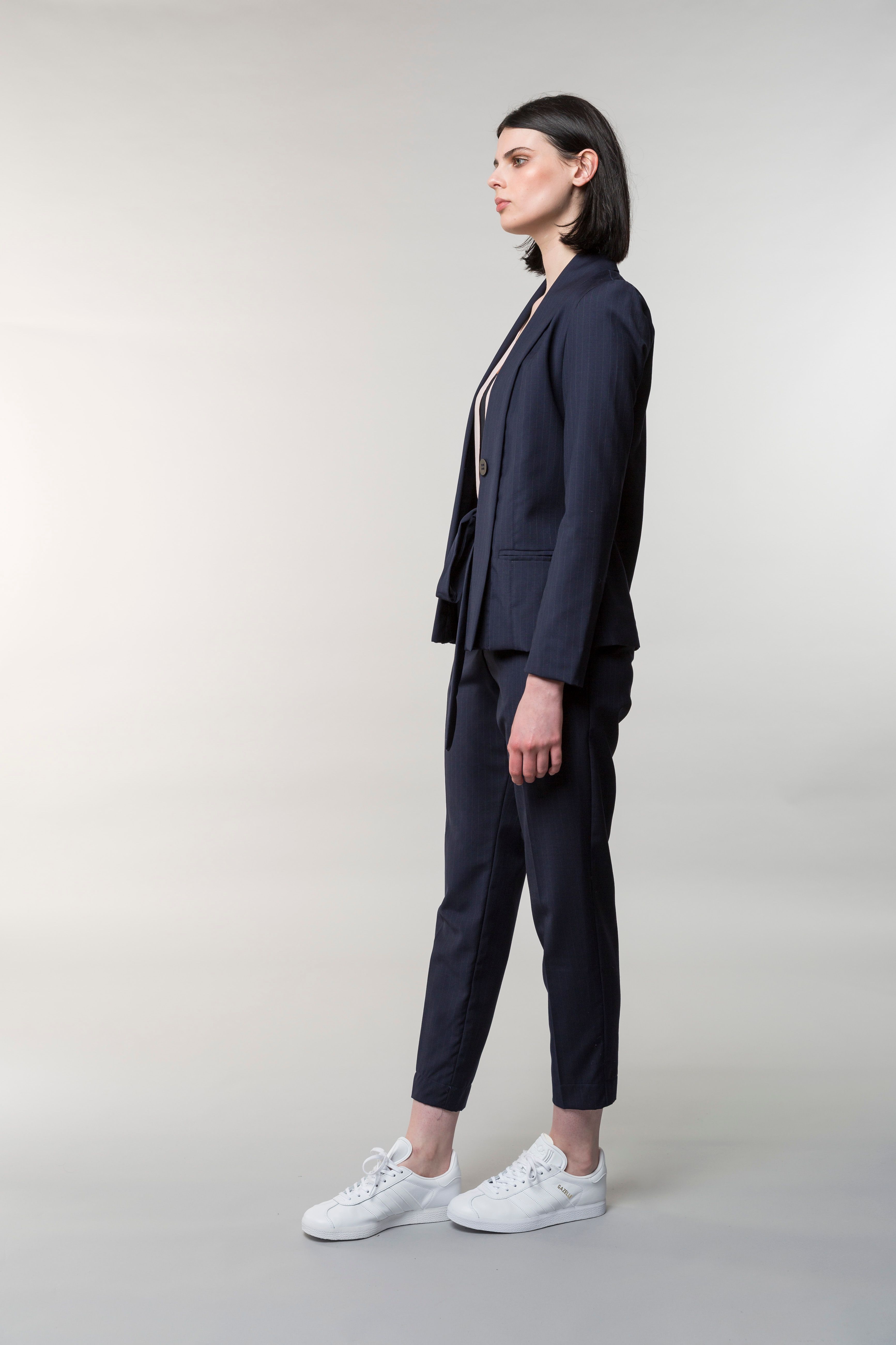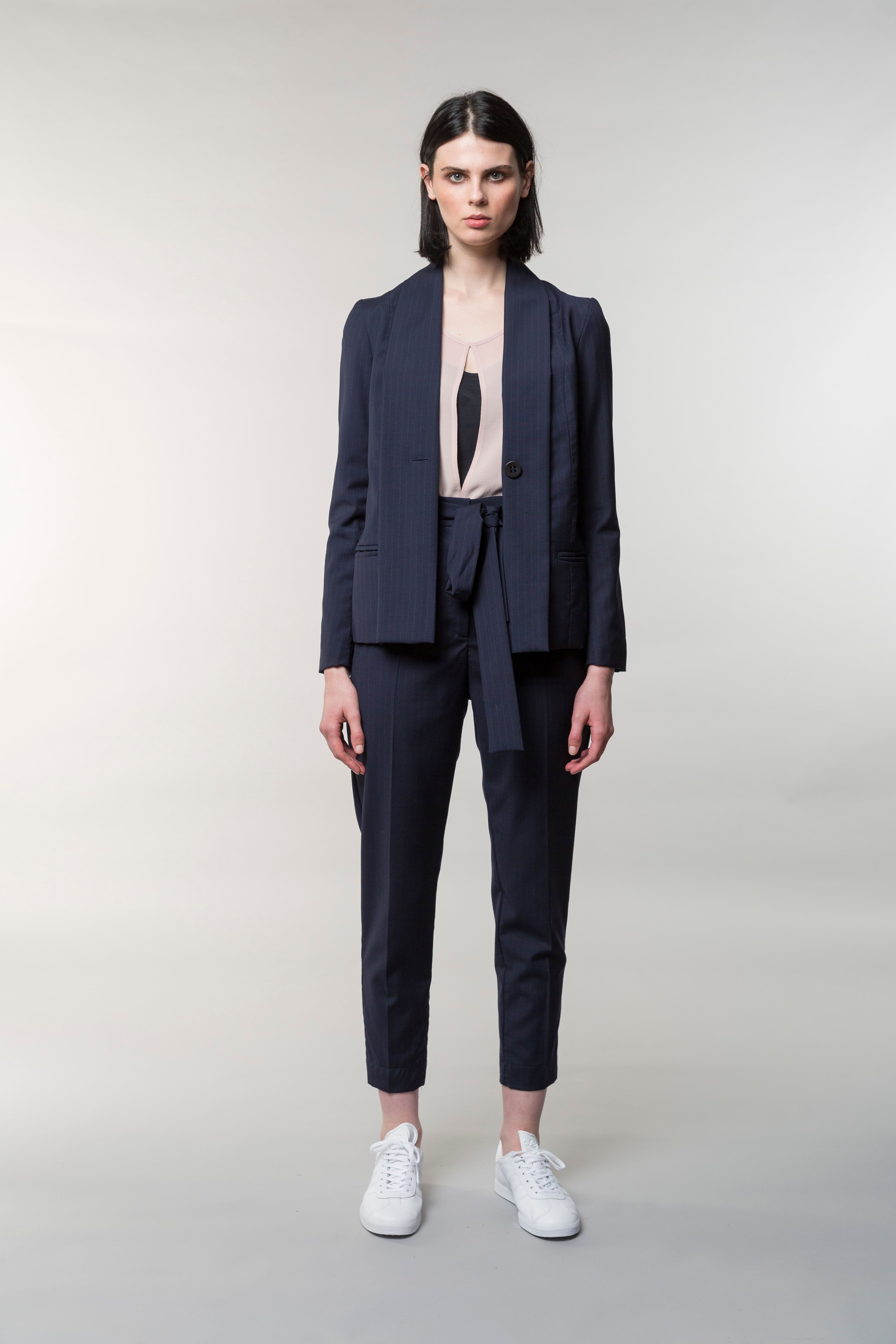 The Helka jacket is modern and feminine. One button to close and beautiful ties to fasten. Elegant fit with side panel pockets and a folded down pleat detail running from shoulder to hem.