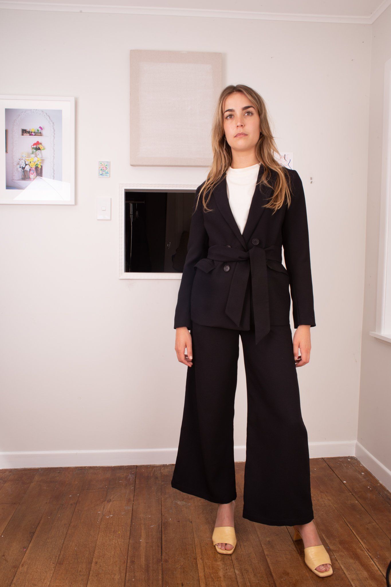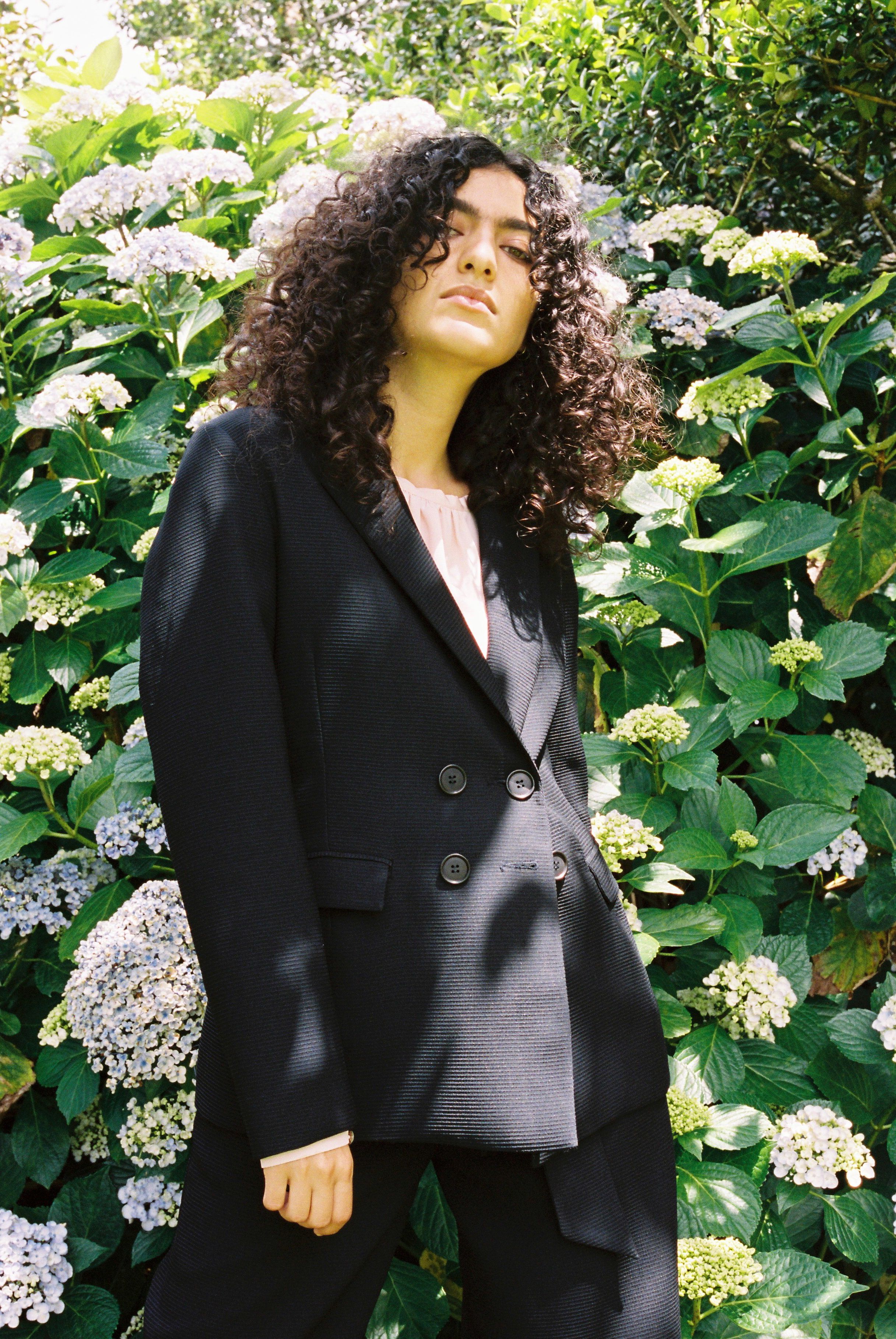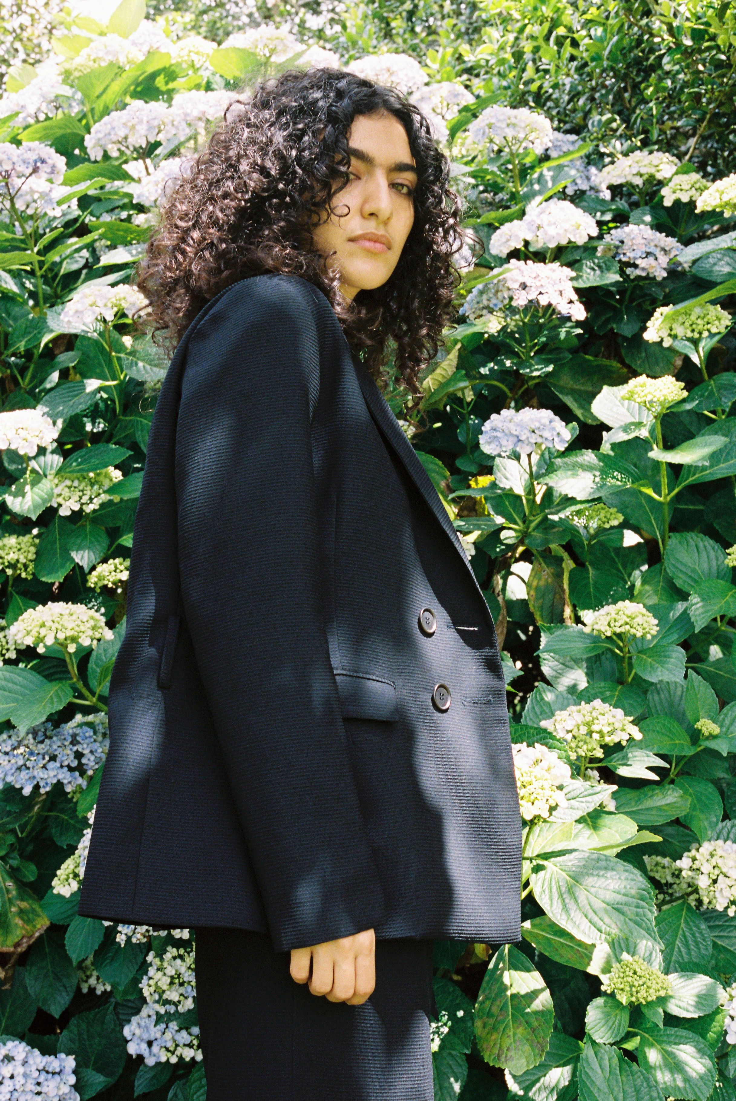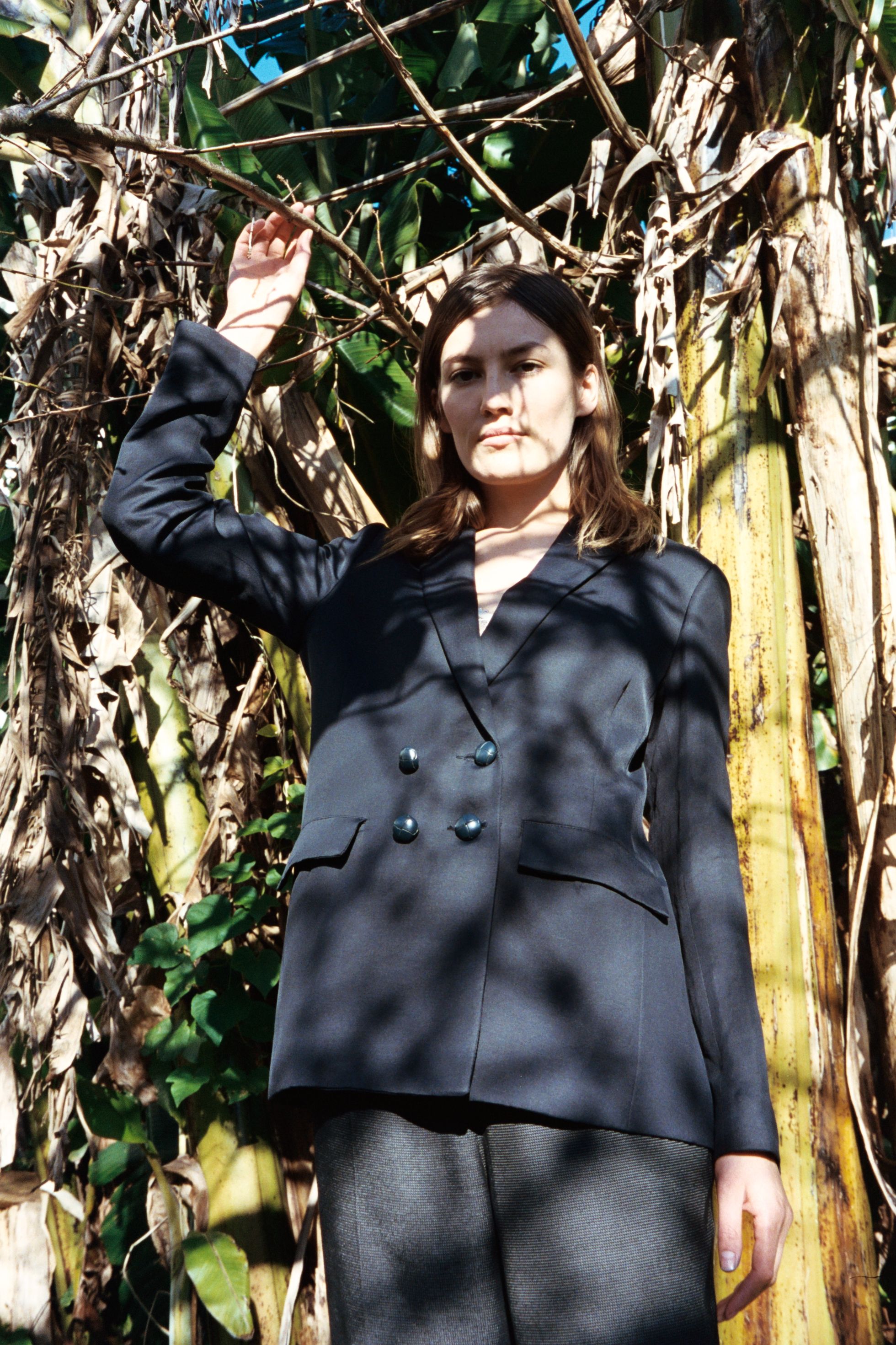 Our impeccable suiting in a fresh double breasted style. Neat on the shoulder and clean sleeve that finishes at the wrist. Collar is sharp and long lined. Darts at waist for subtle shape. Leather buttons to close. Pocket details. Finishes at the hip.