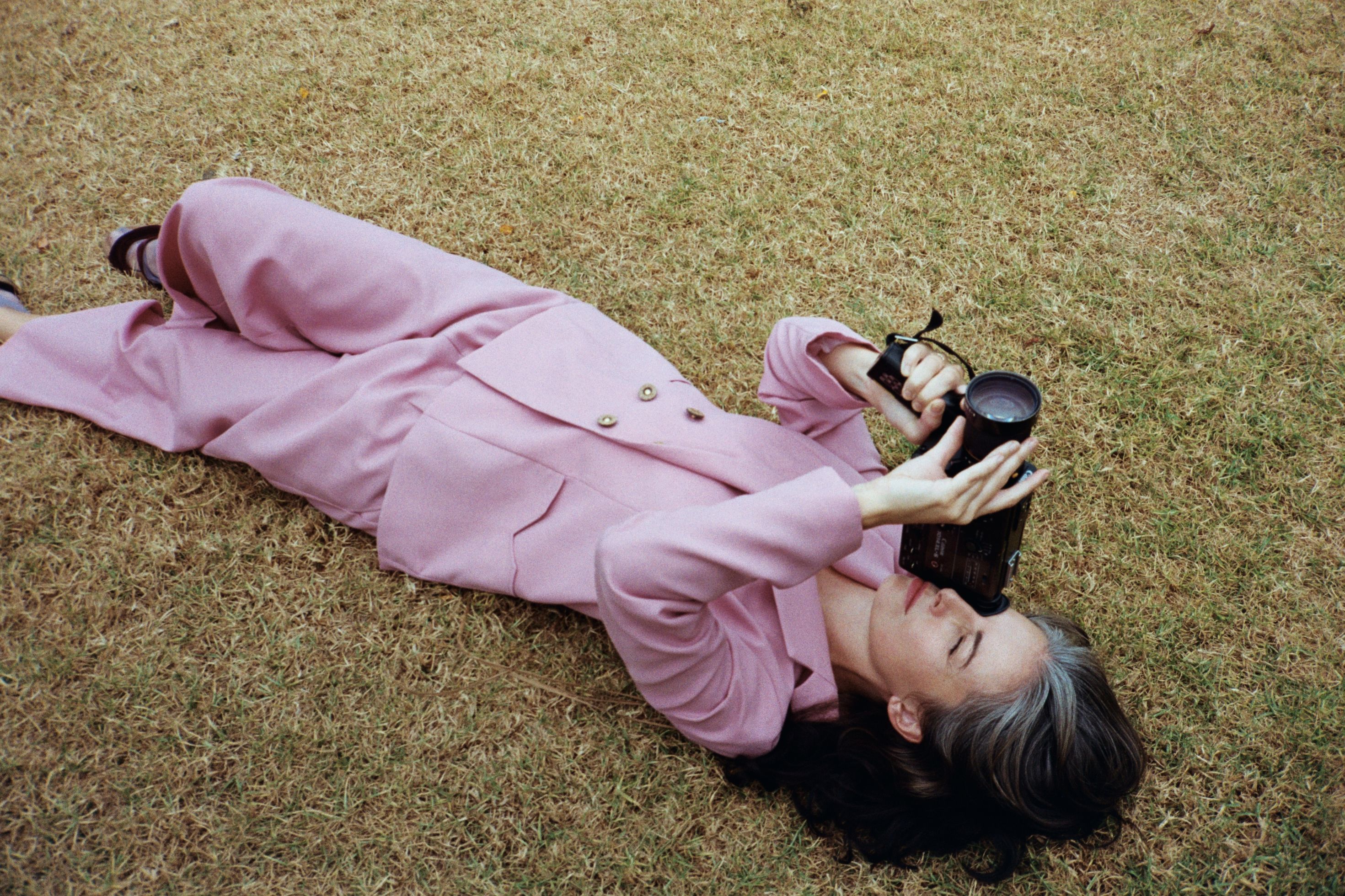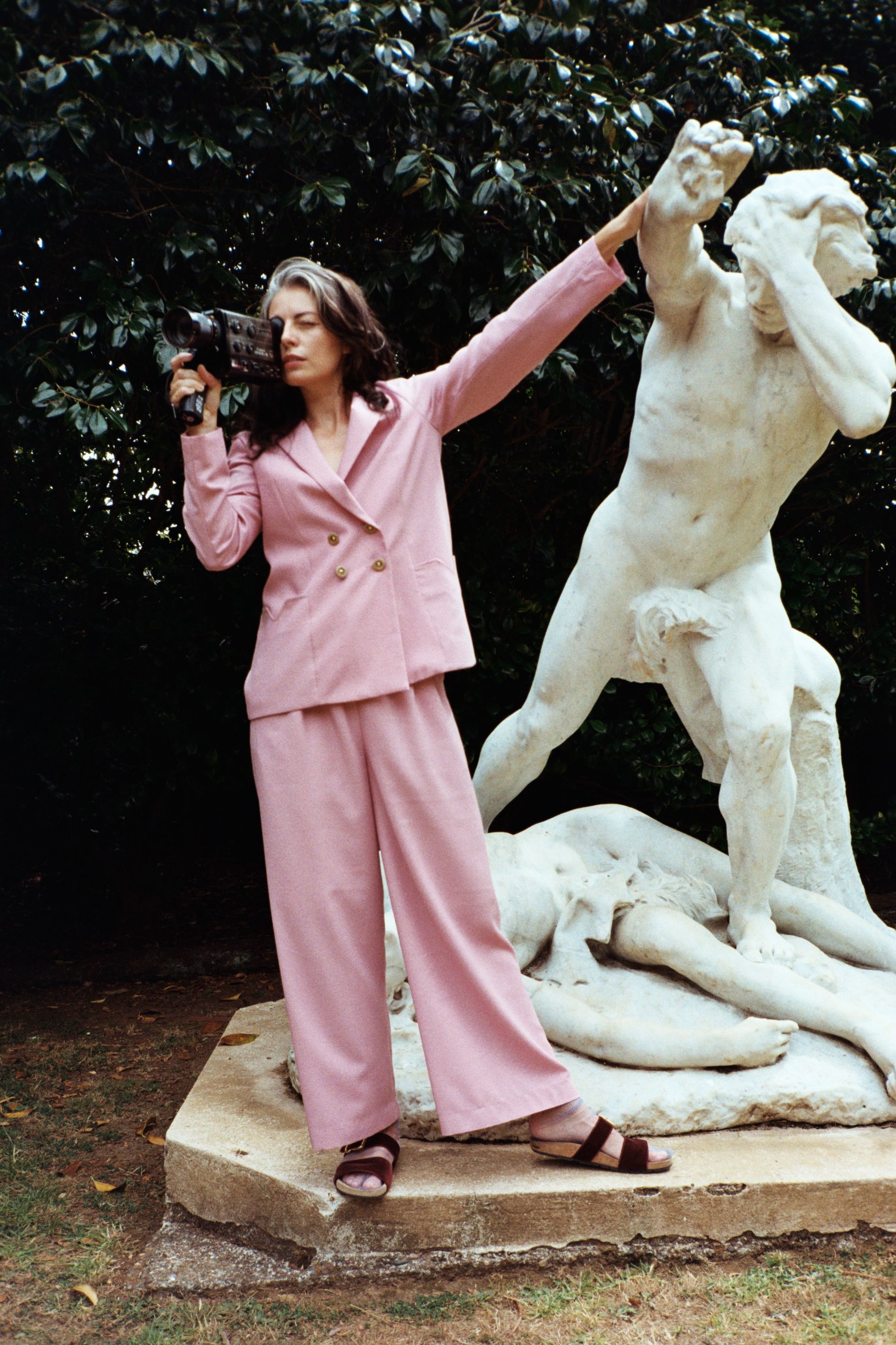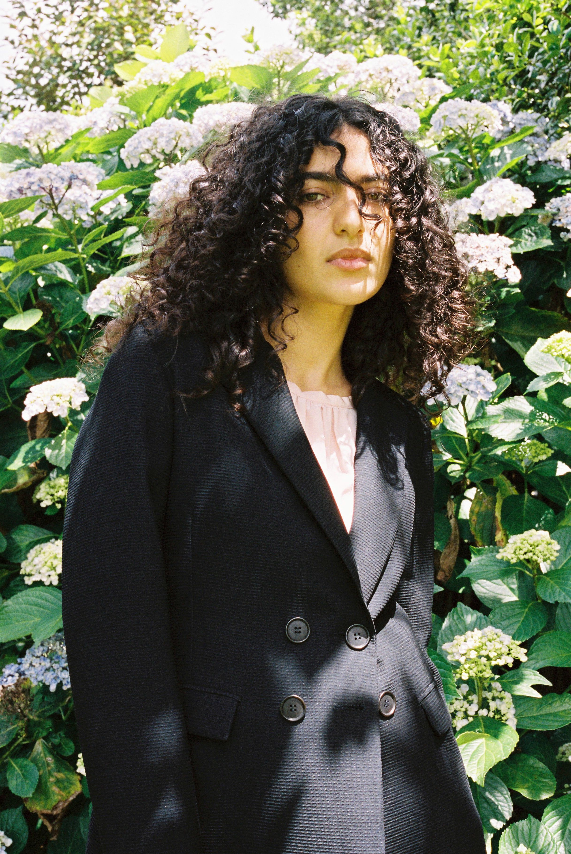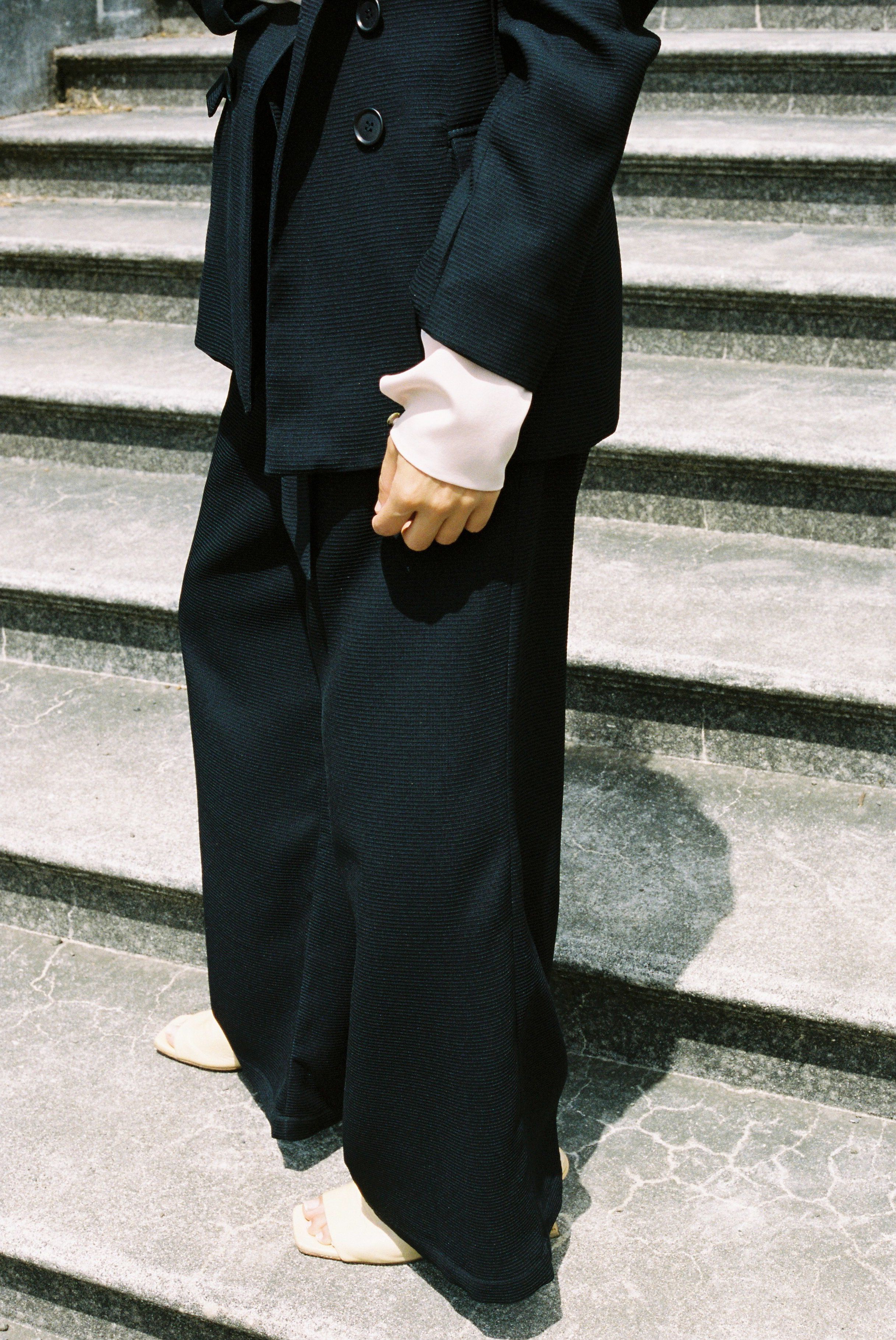 Our impeccable suiting in a fresh double breasted style. Neat on the shoulder and clean sleeve that finishes at the wrist. Collar is sharp and long lined. Darts at waist for subtle shape. Leather buttons to close. Pocket details. Finishes at the hip.