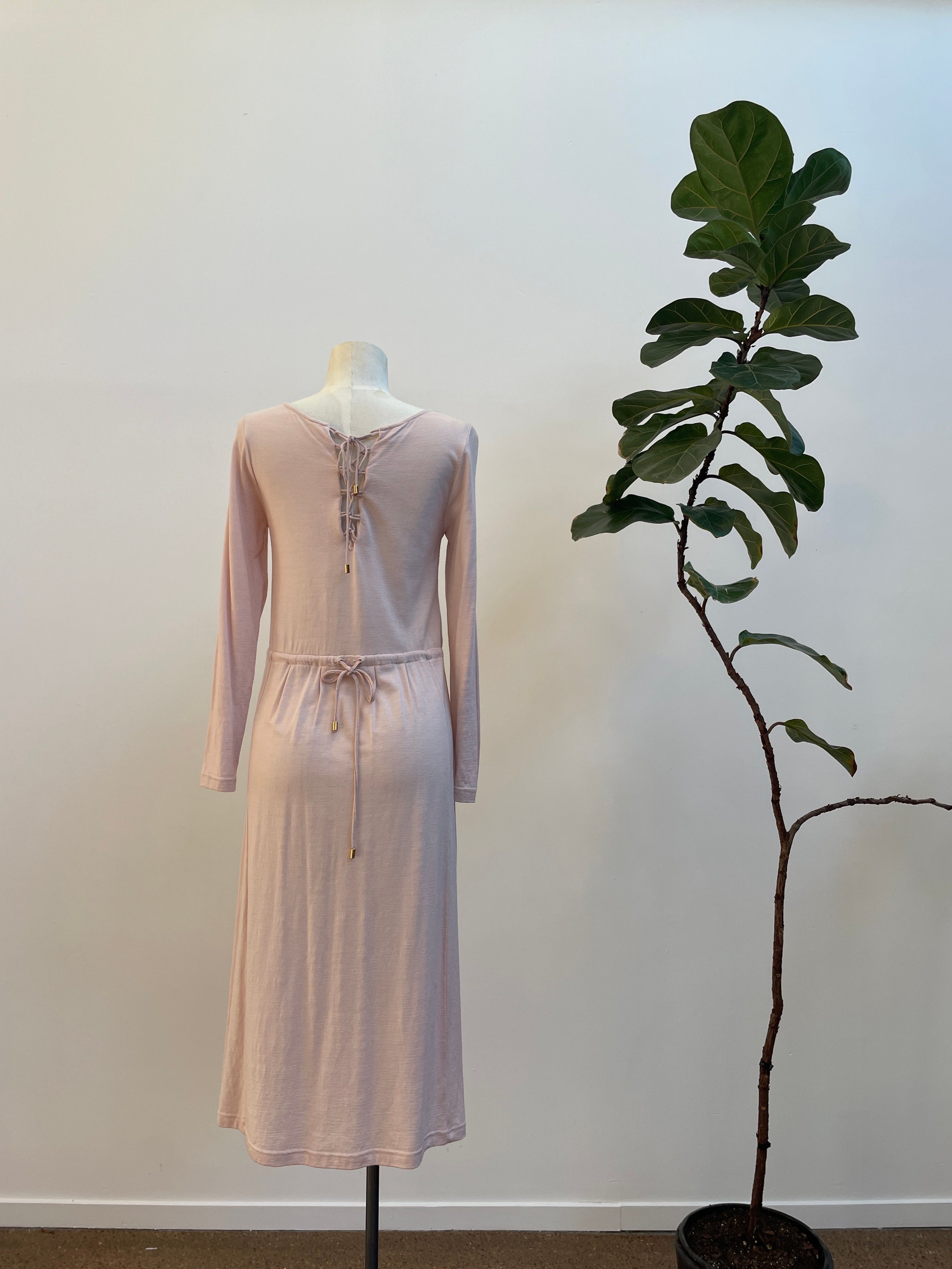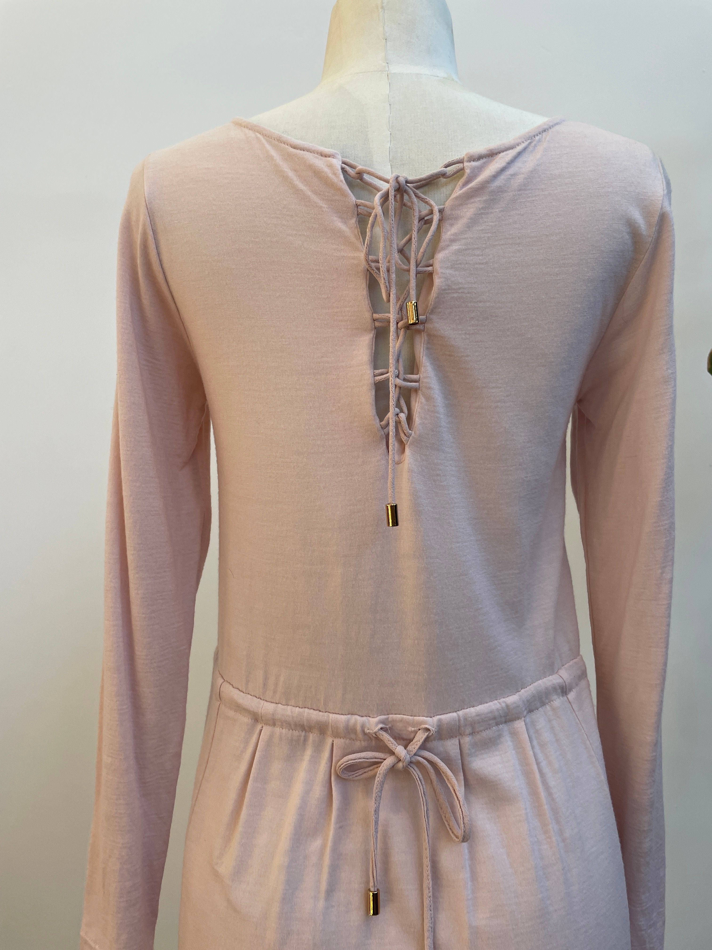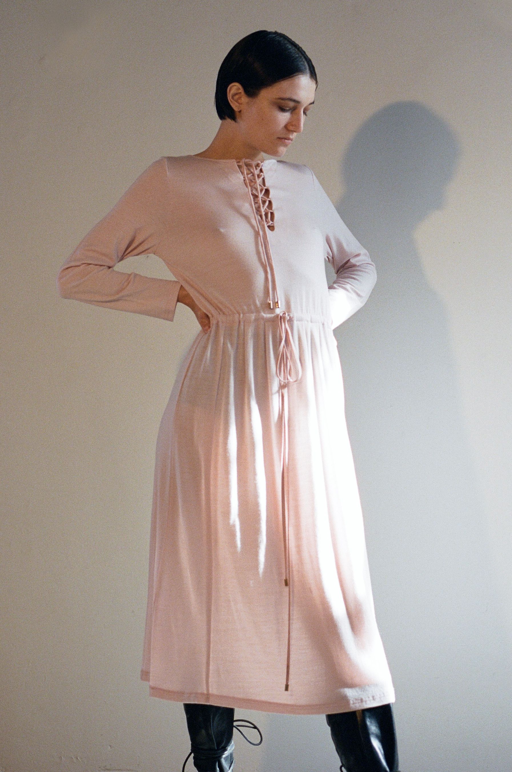 Our much loved 100% merino in a refreshed shape. The Hero dress is wonderfully versatile and works perfectly as winter workwear. Rounded neckline featuring lace up detail centre front. Full length sleeves. Drawcord waist can be pulled in to create shape or left more loose and free. Skirt falls to mid shin.