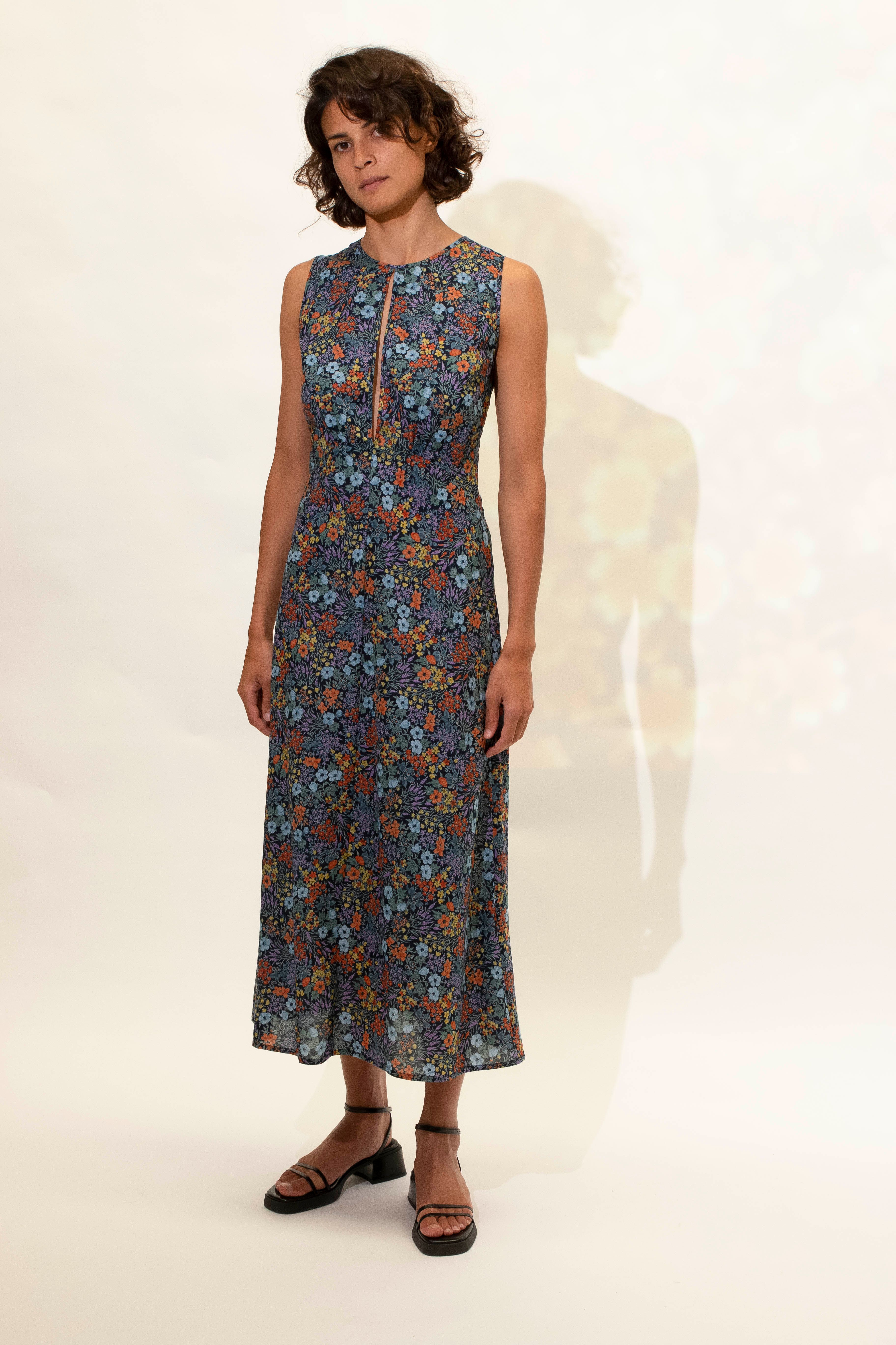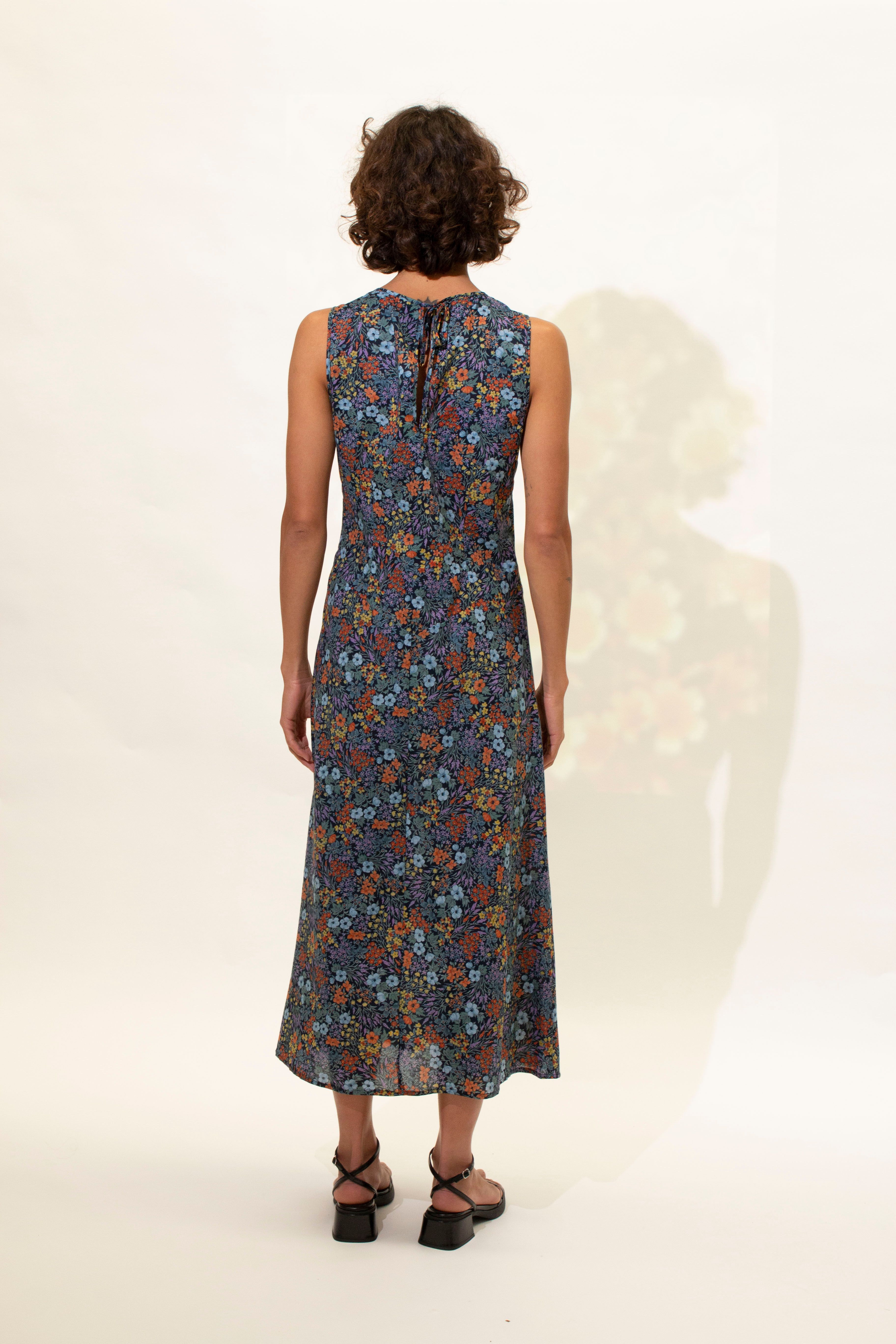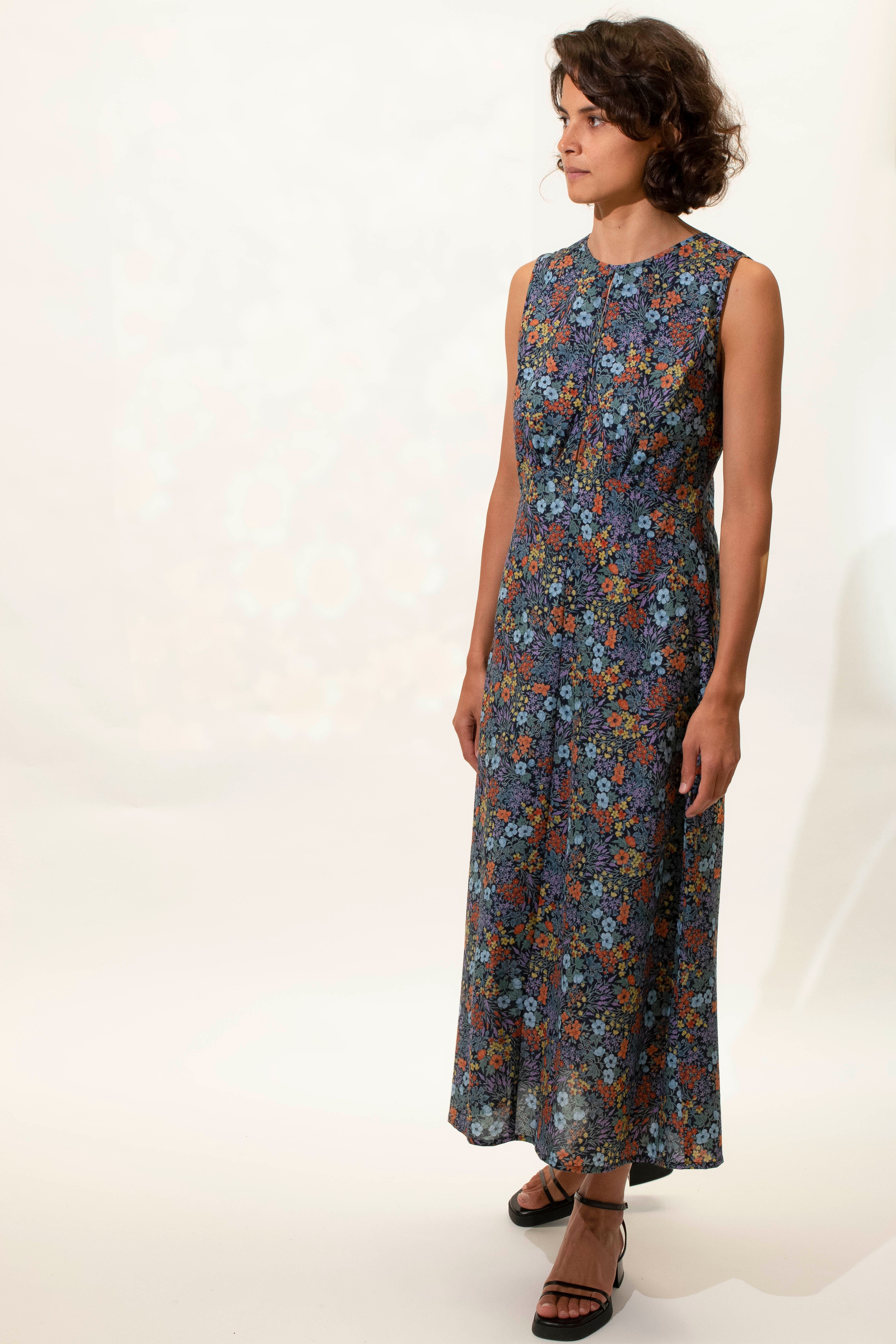 A beautiful elegant bias cut dress featuring puzzled together panels and soft gathered detailing under the bust. This dress features a high round neck with a split at the front and back. Tie closer at back neck. Hem falls to ankle.