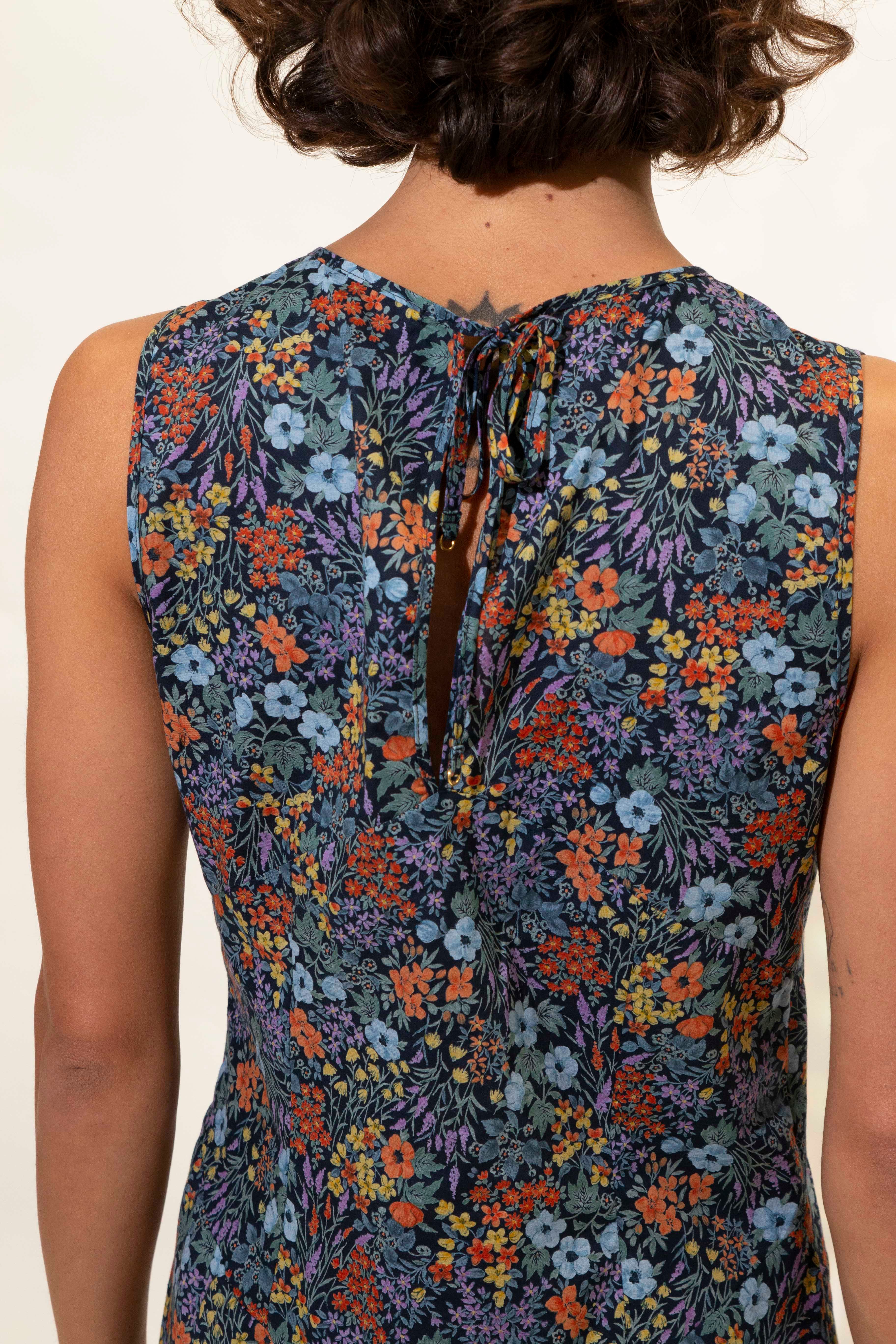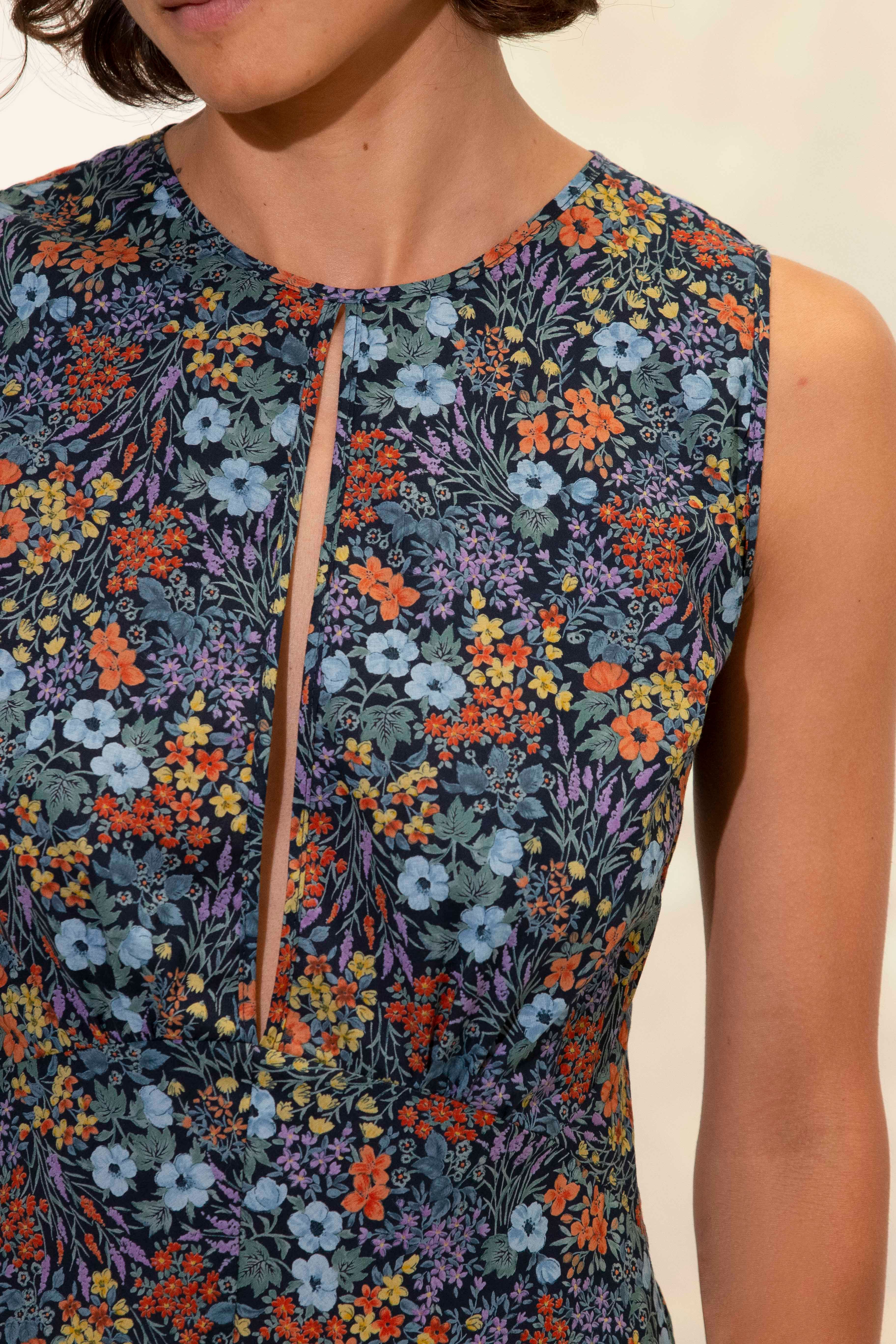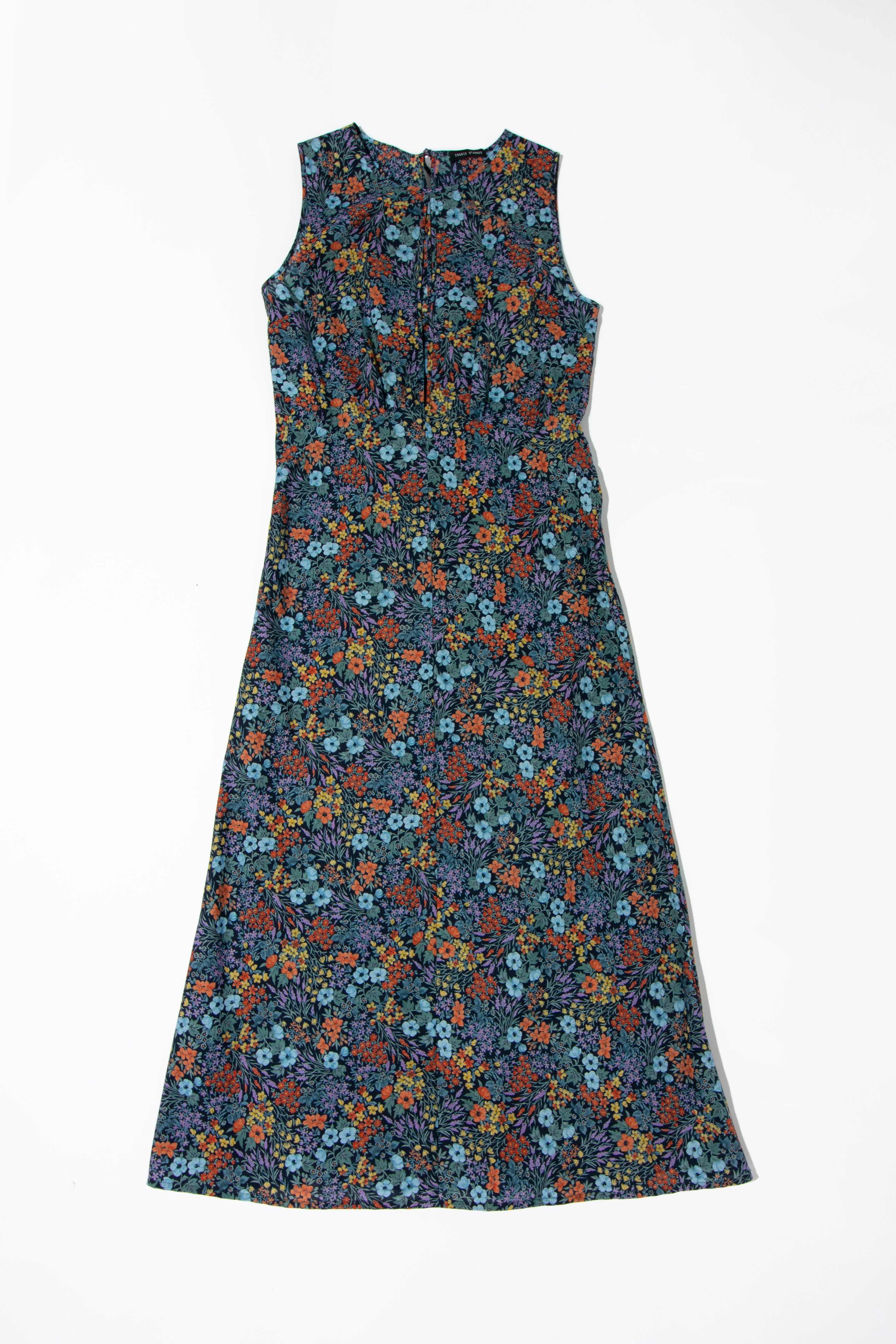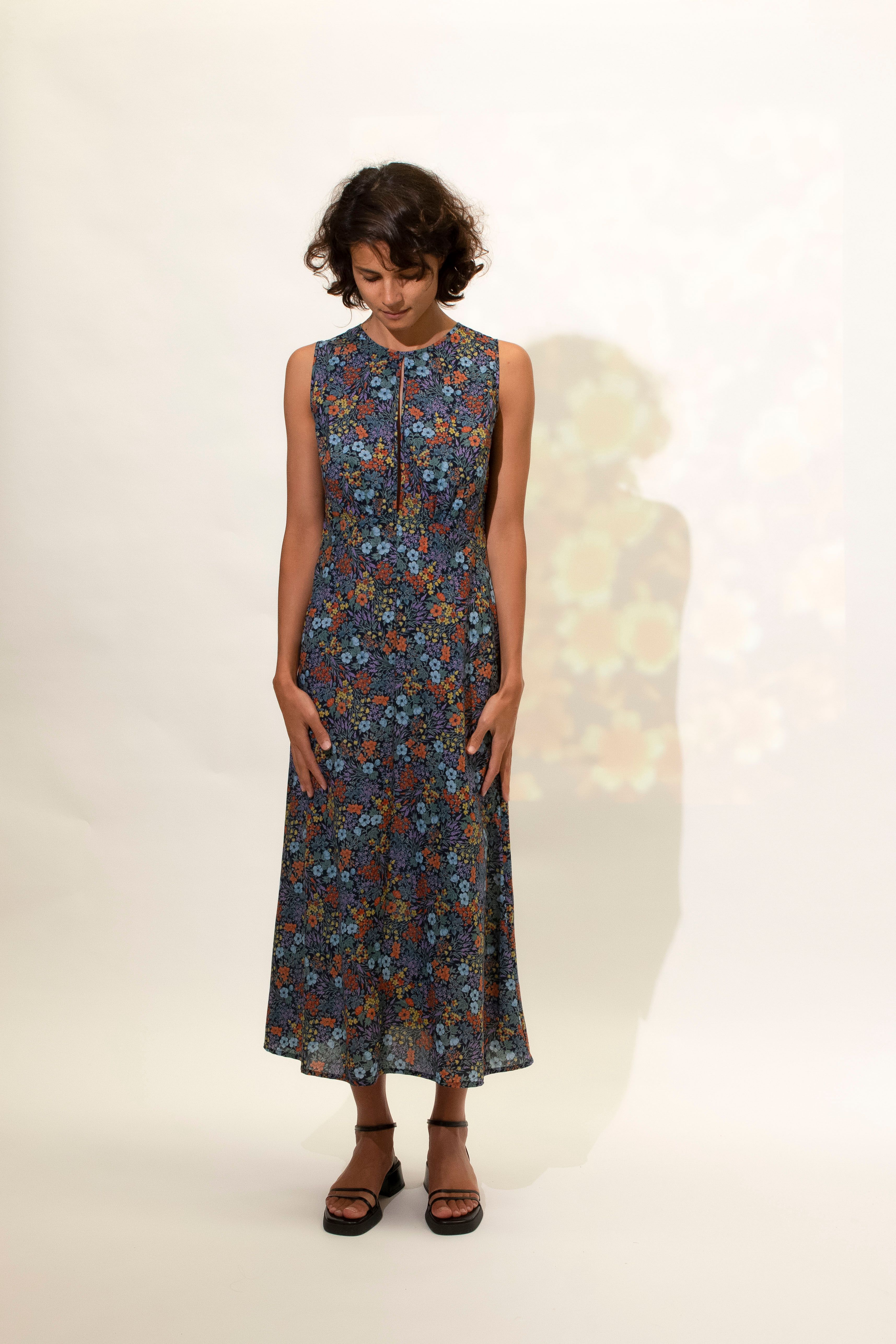 A beautiful elegant bias cut dress featuring puzzled together panels and soft gathered detailing under the bust. This dress features a high round neck with a split at the front and back. Tie closer at back neck. Hem falls to ankle.