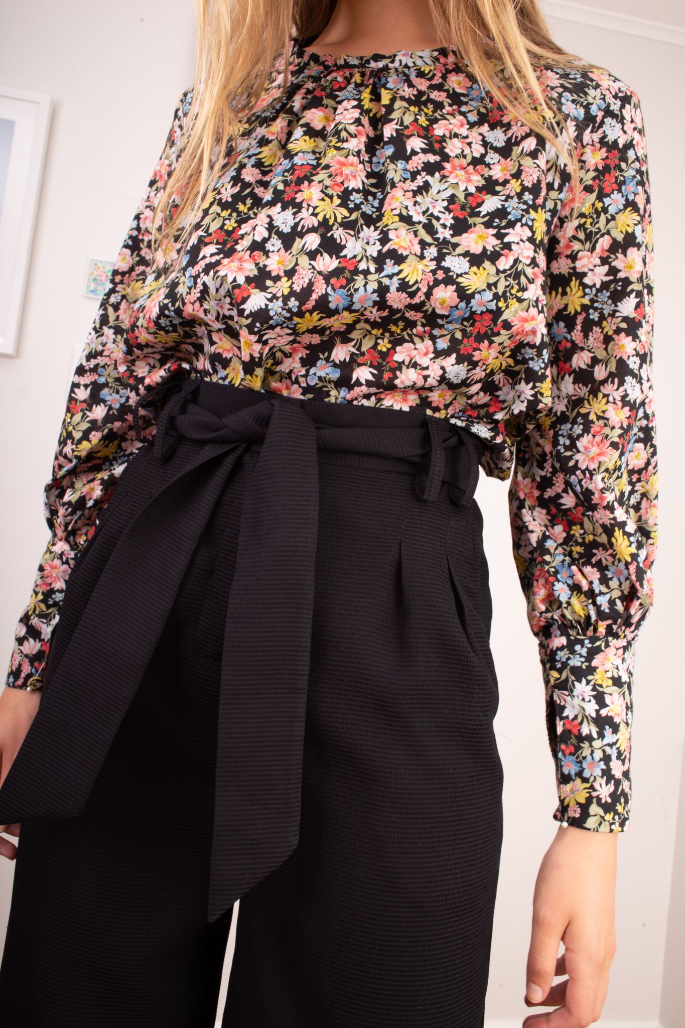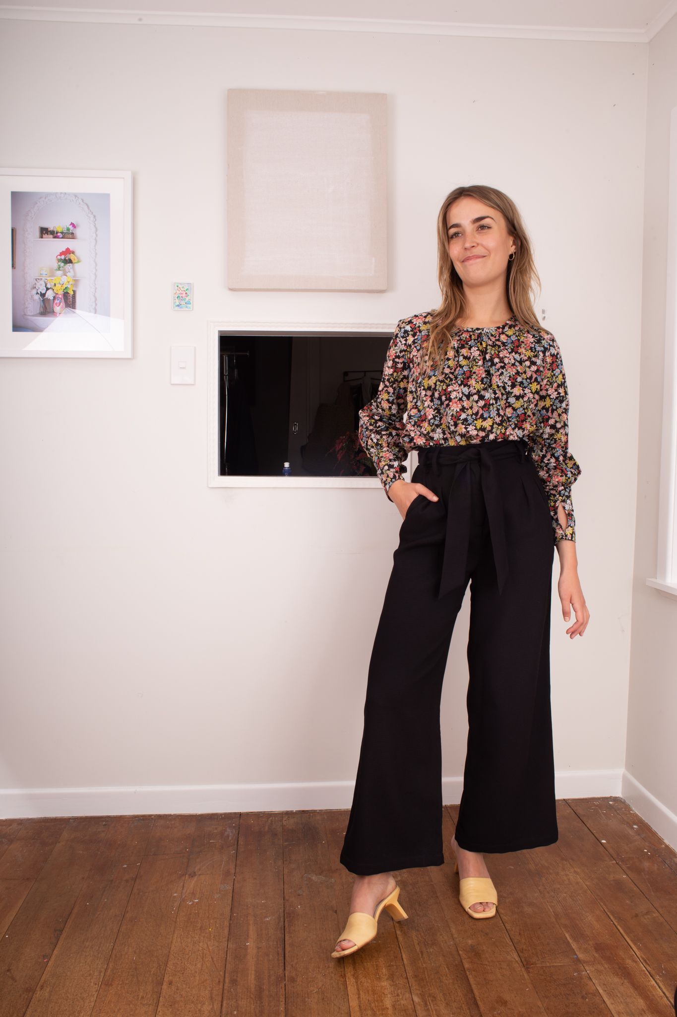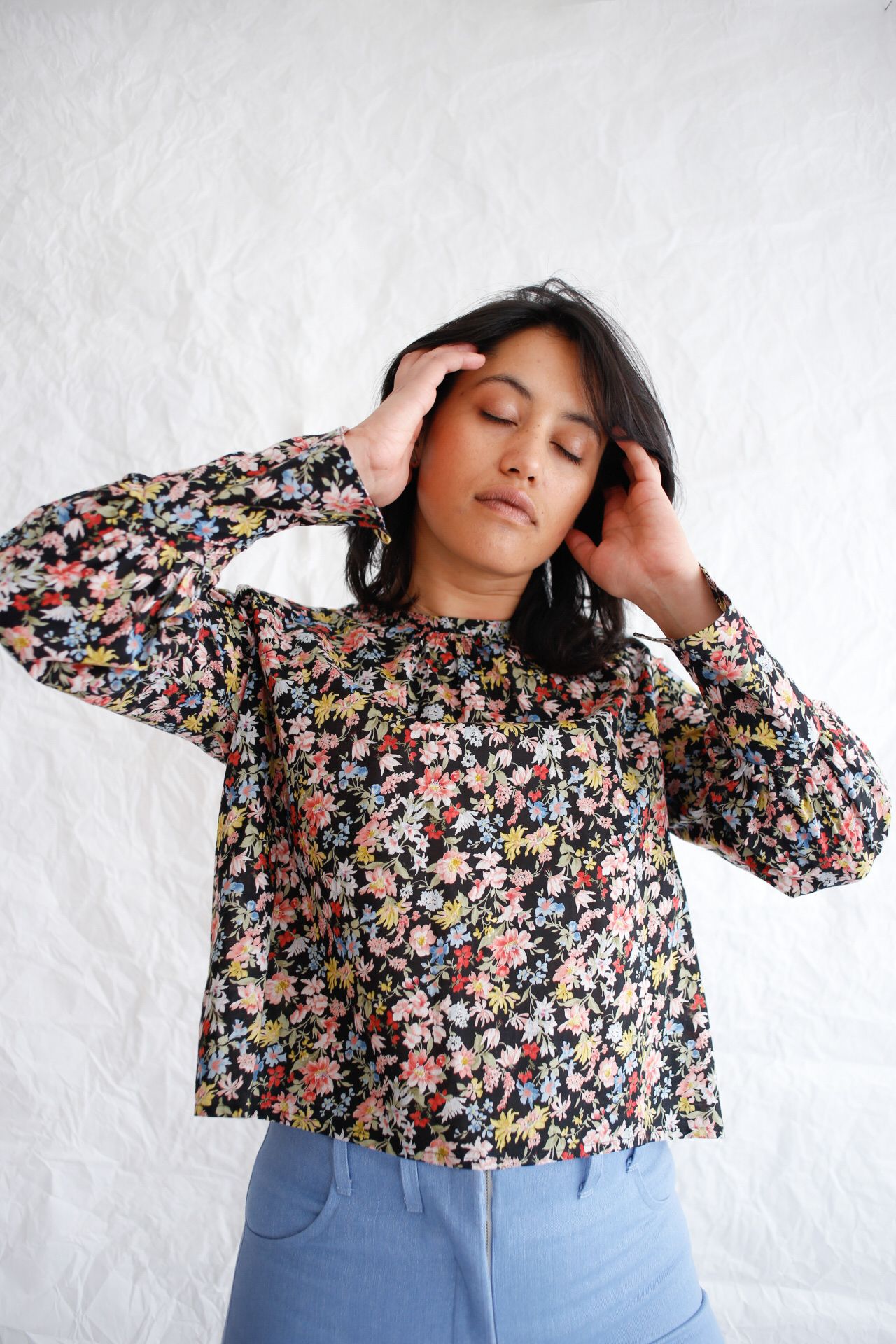 Gathers at upper, mid back. Back of neck closure with tie creates keyhole detail.