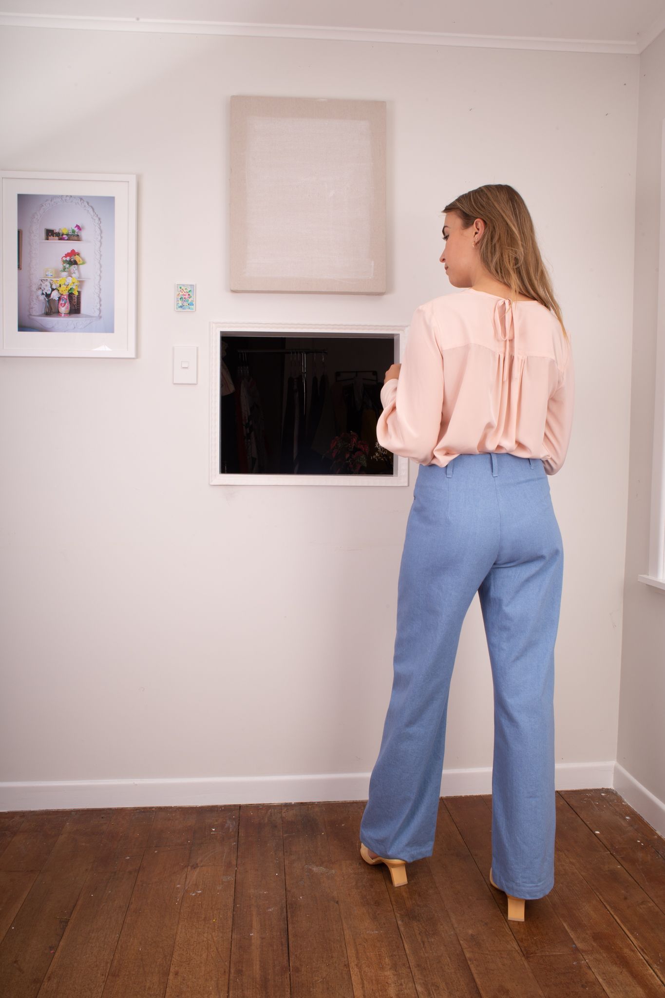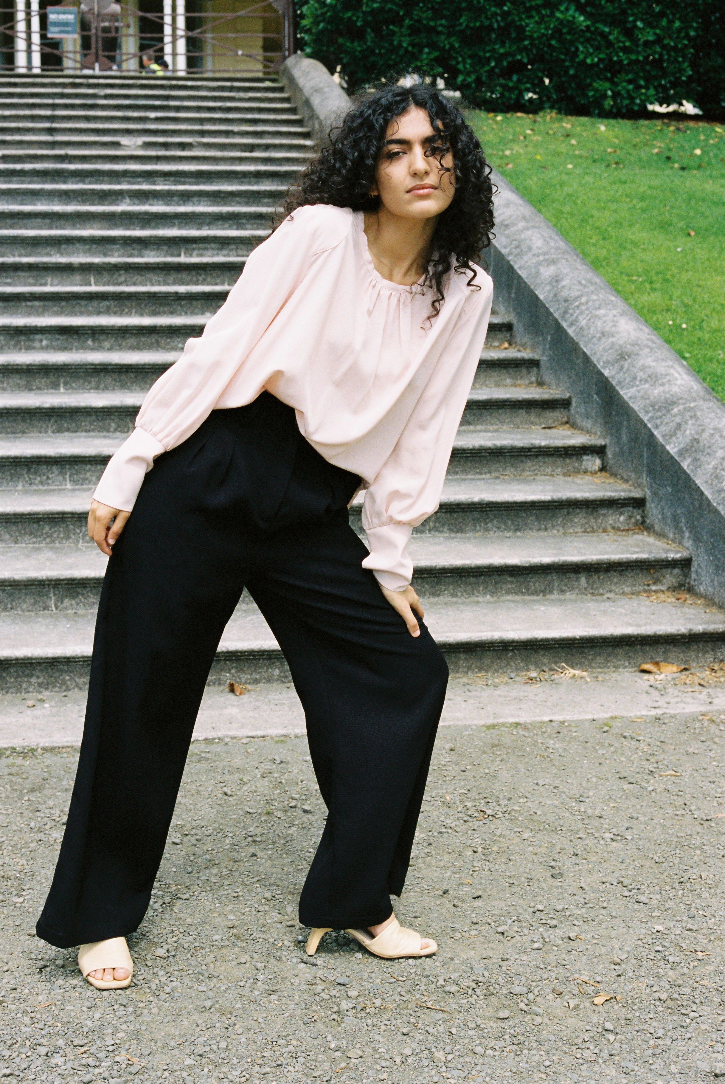 -Gathered at neck, shoulder yoke detail.