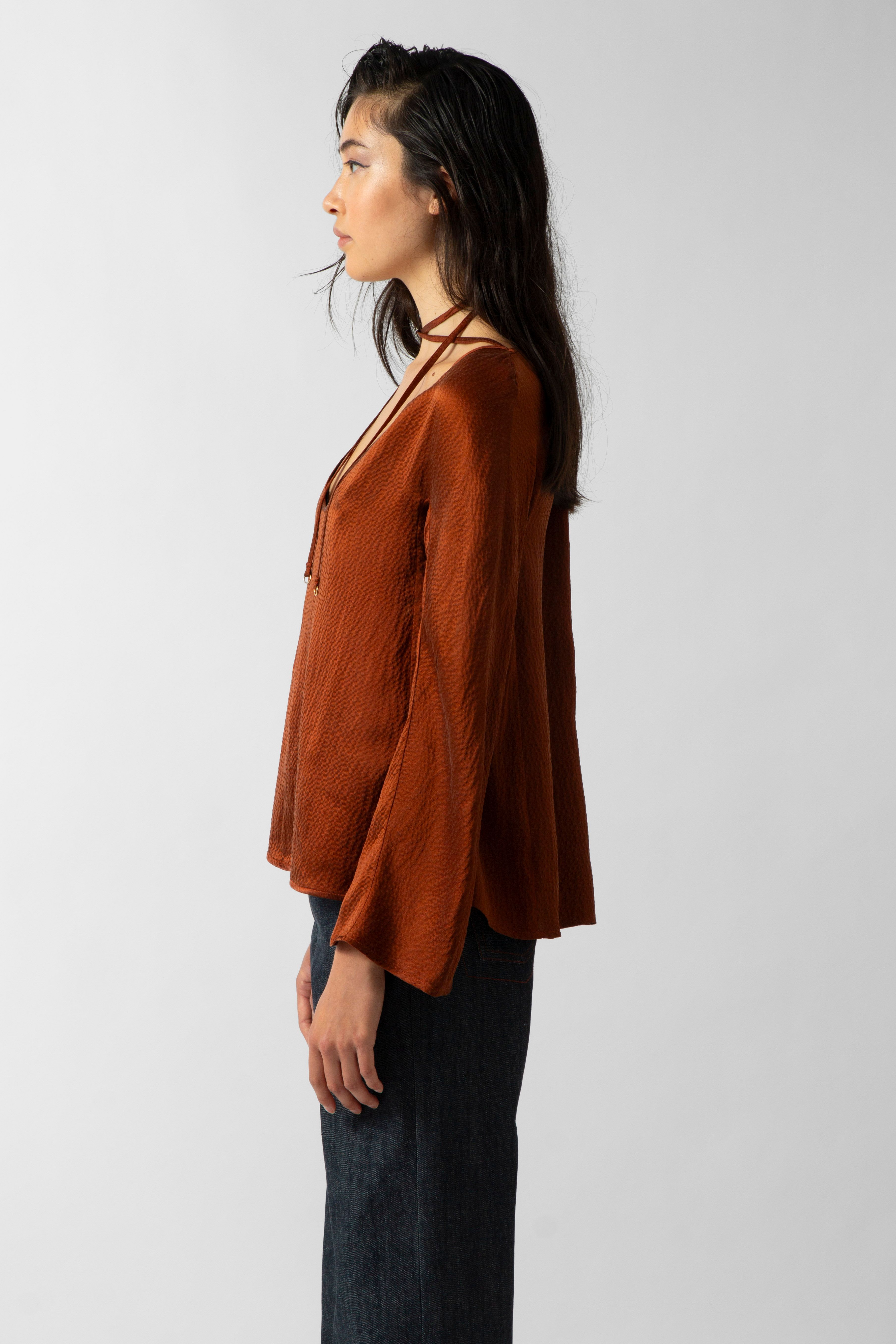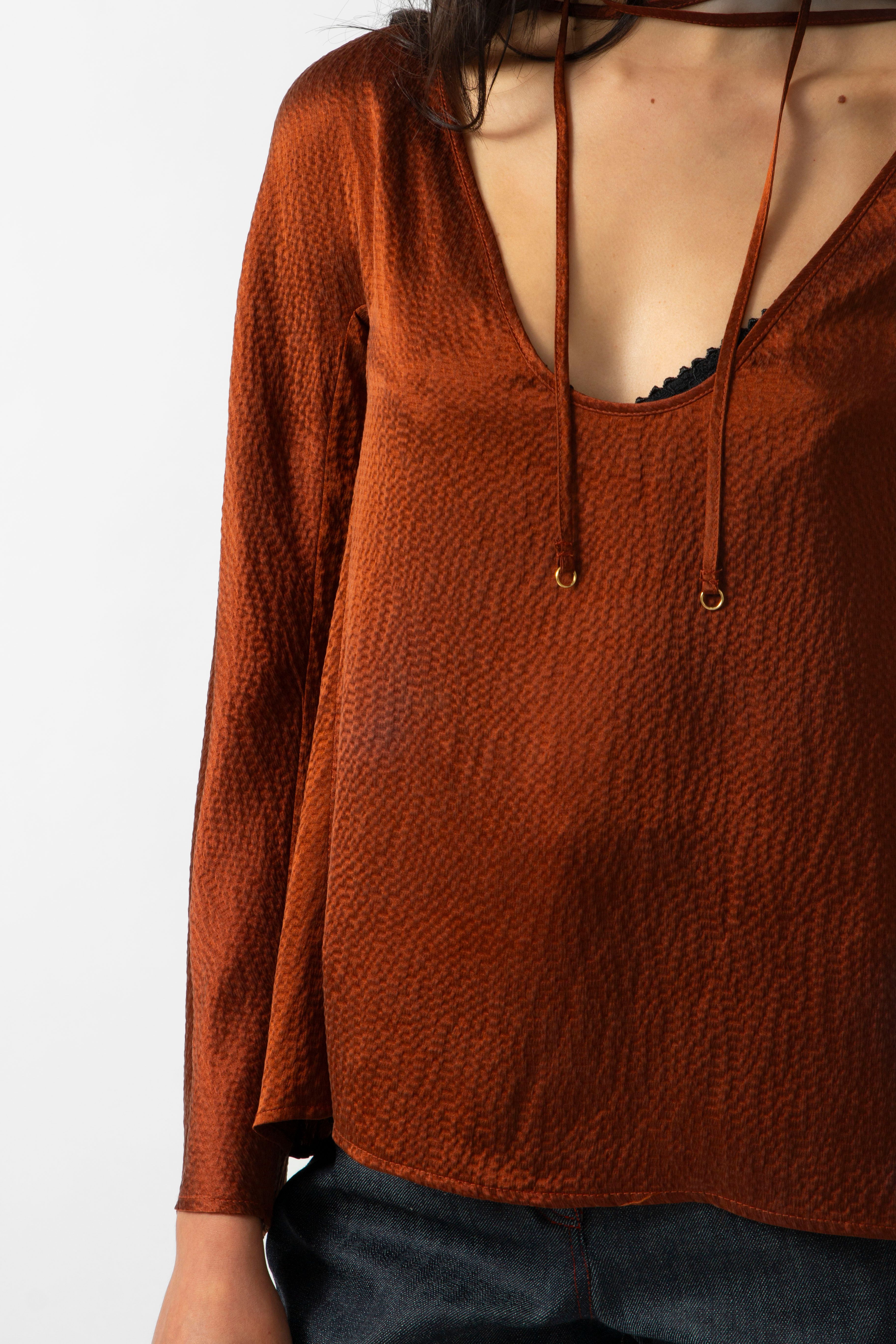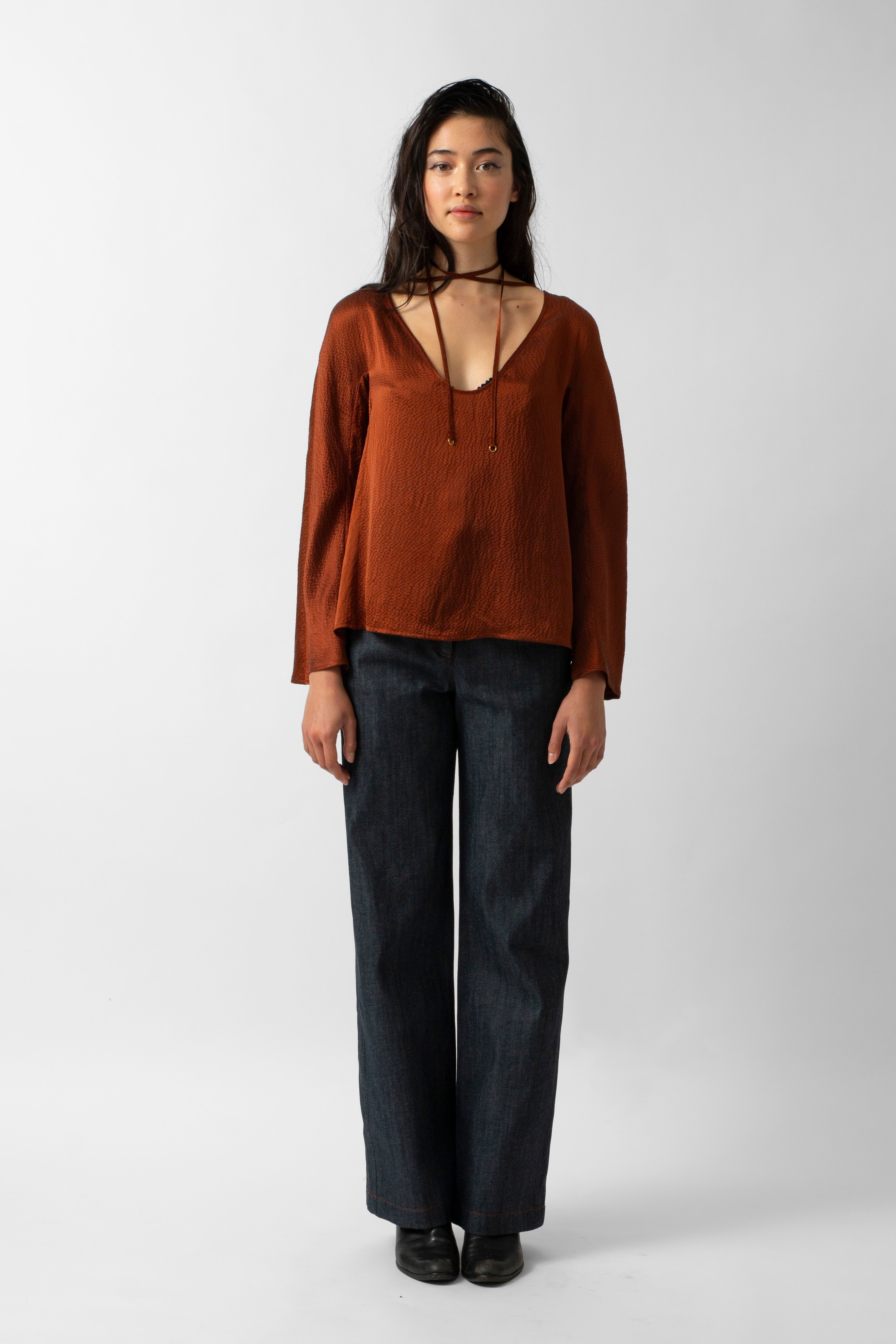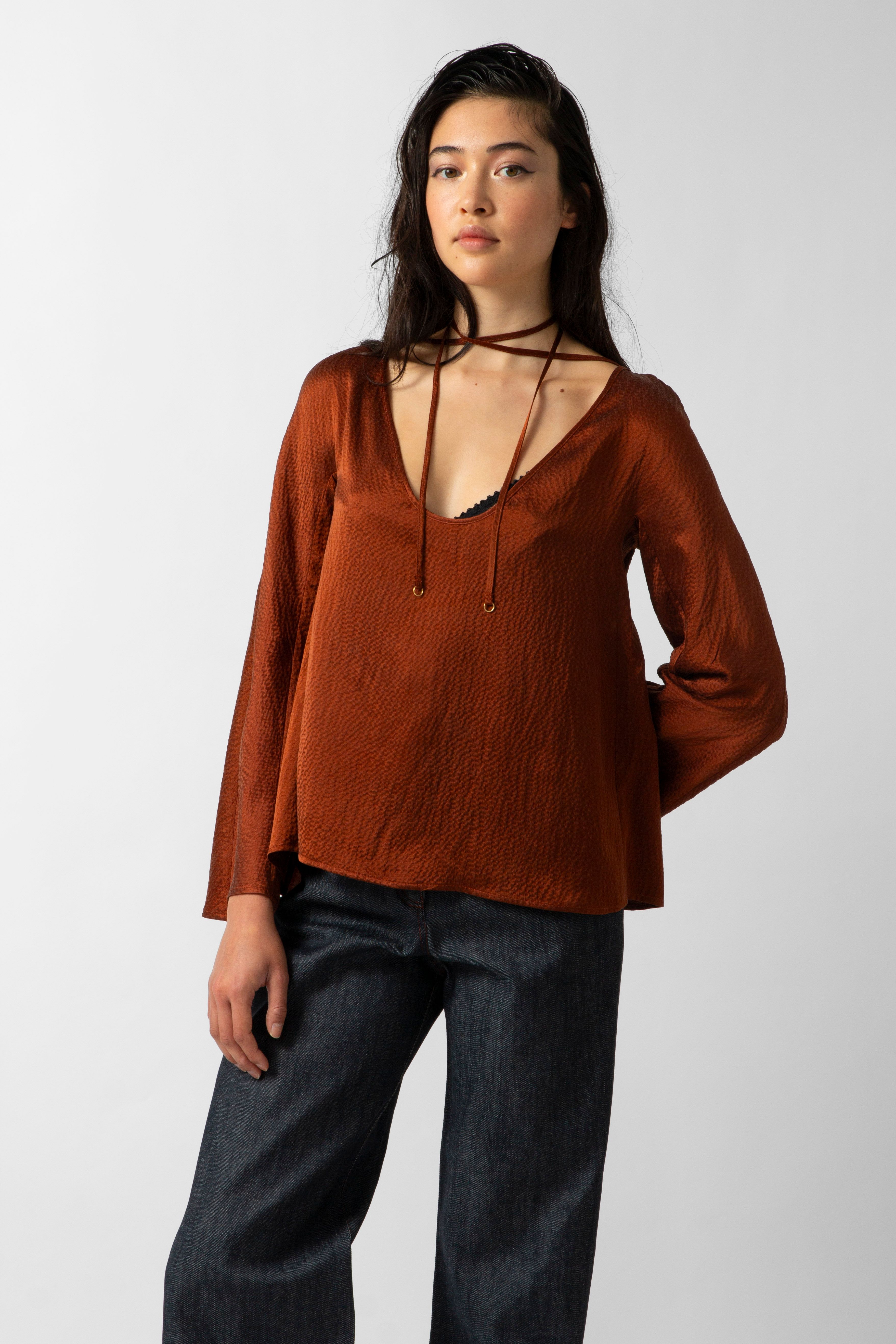 The Laurelle top in our custom dyed Tobacco hammered silk satin. Also avalible in 100% waffle cotton white and Florida print.