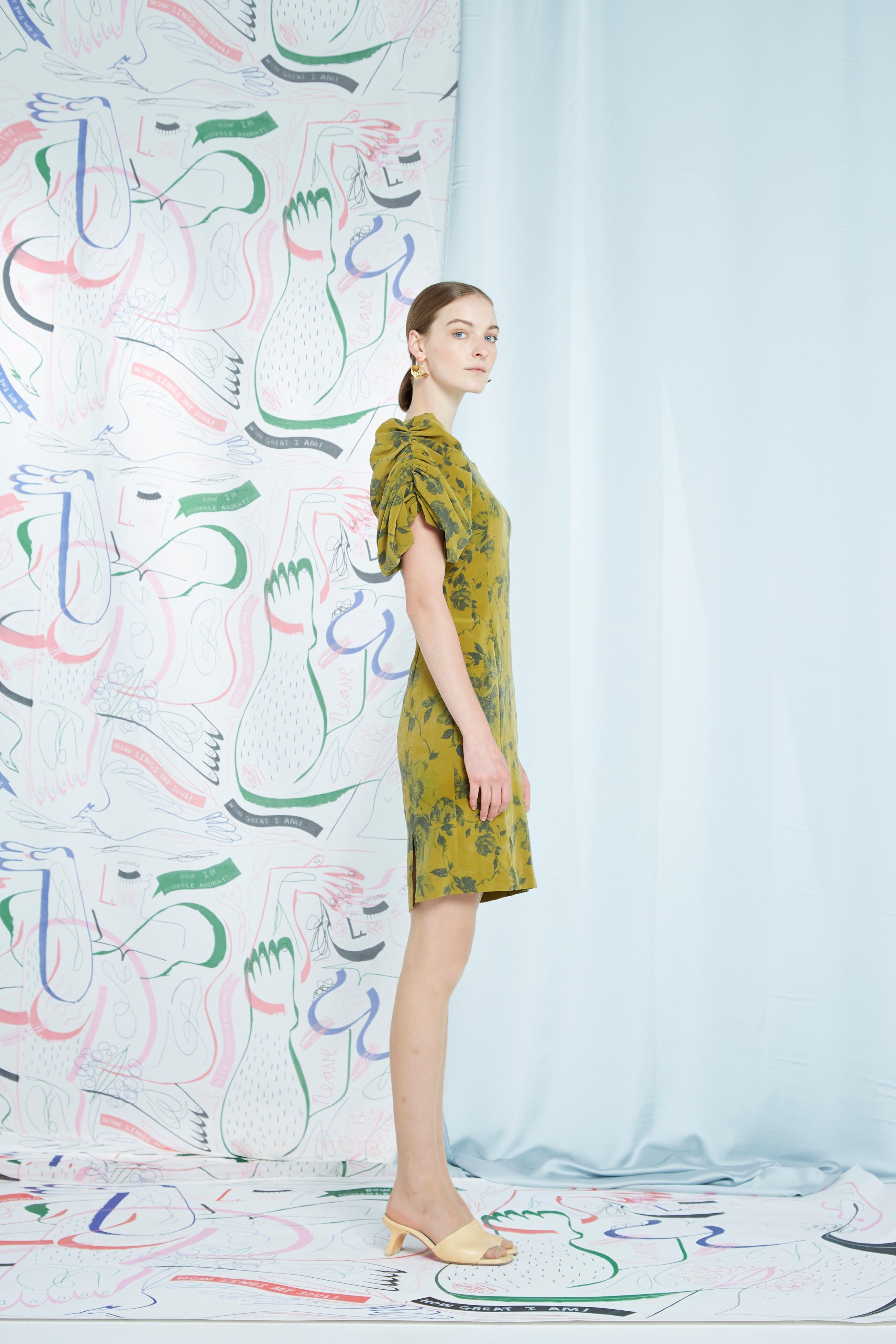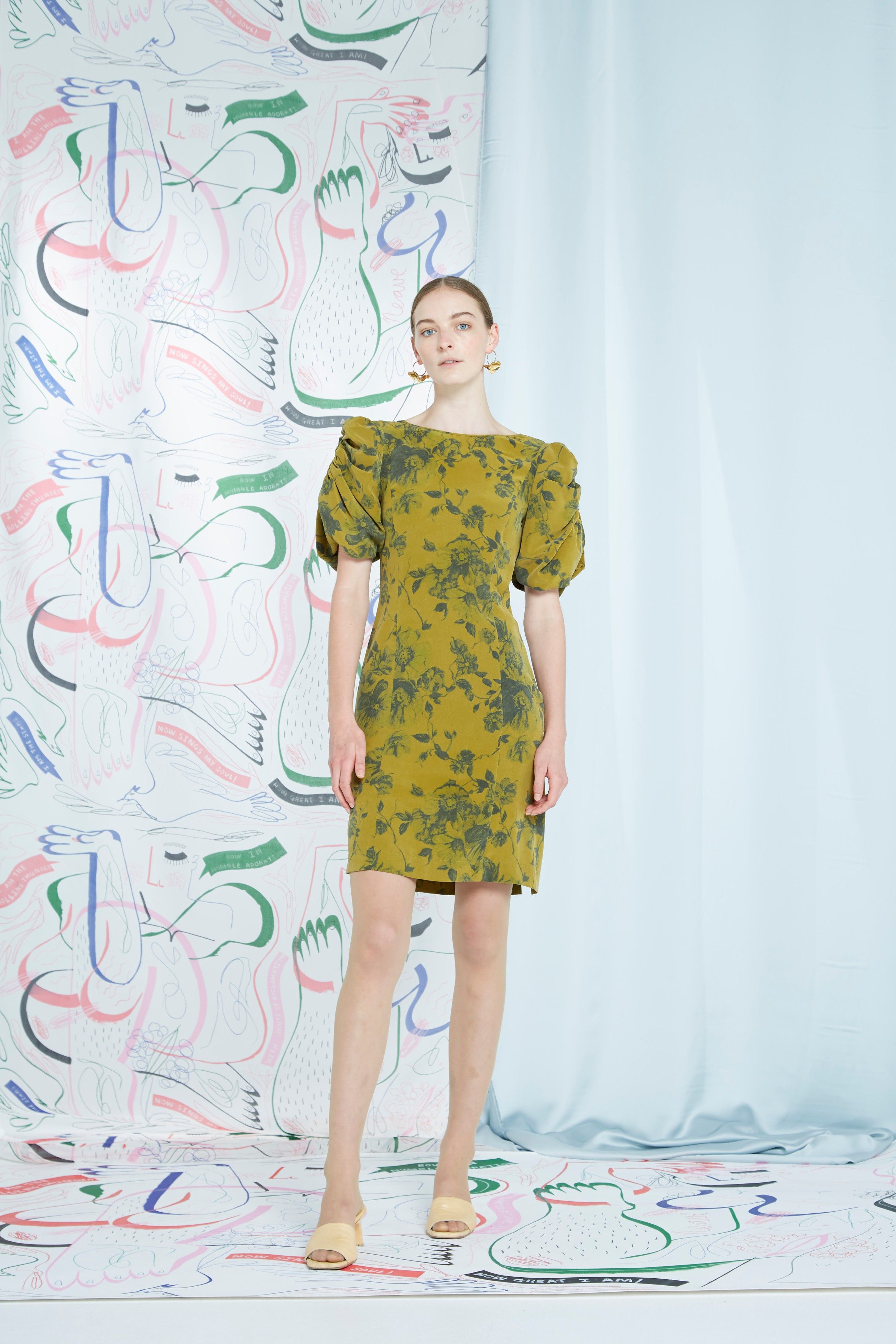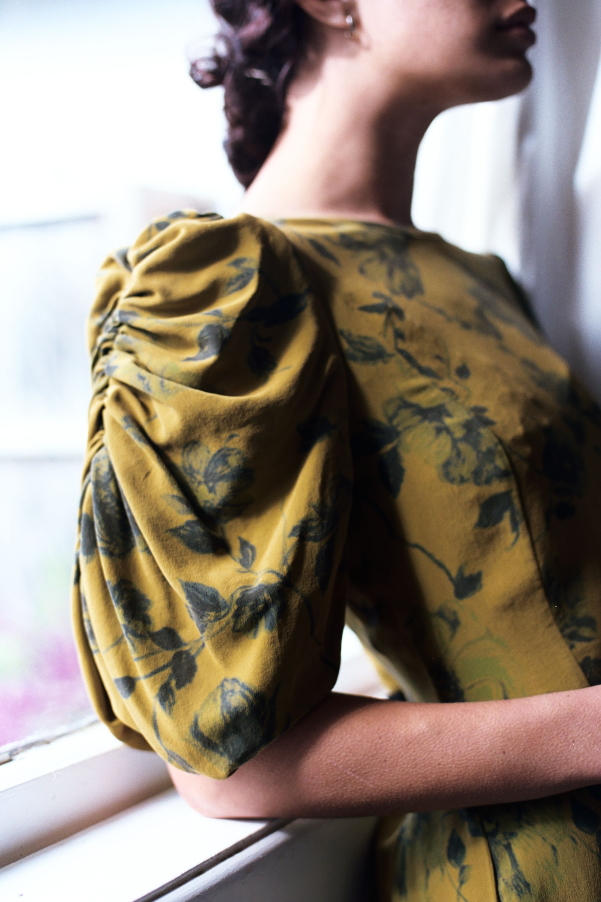 -Gathered, exaggerated sleeves. Finish at elbow.
