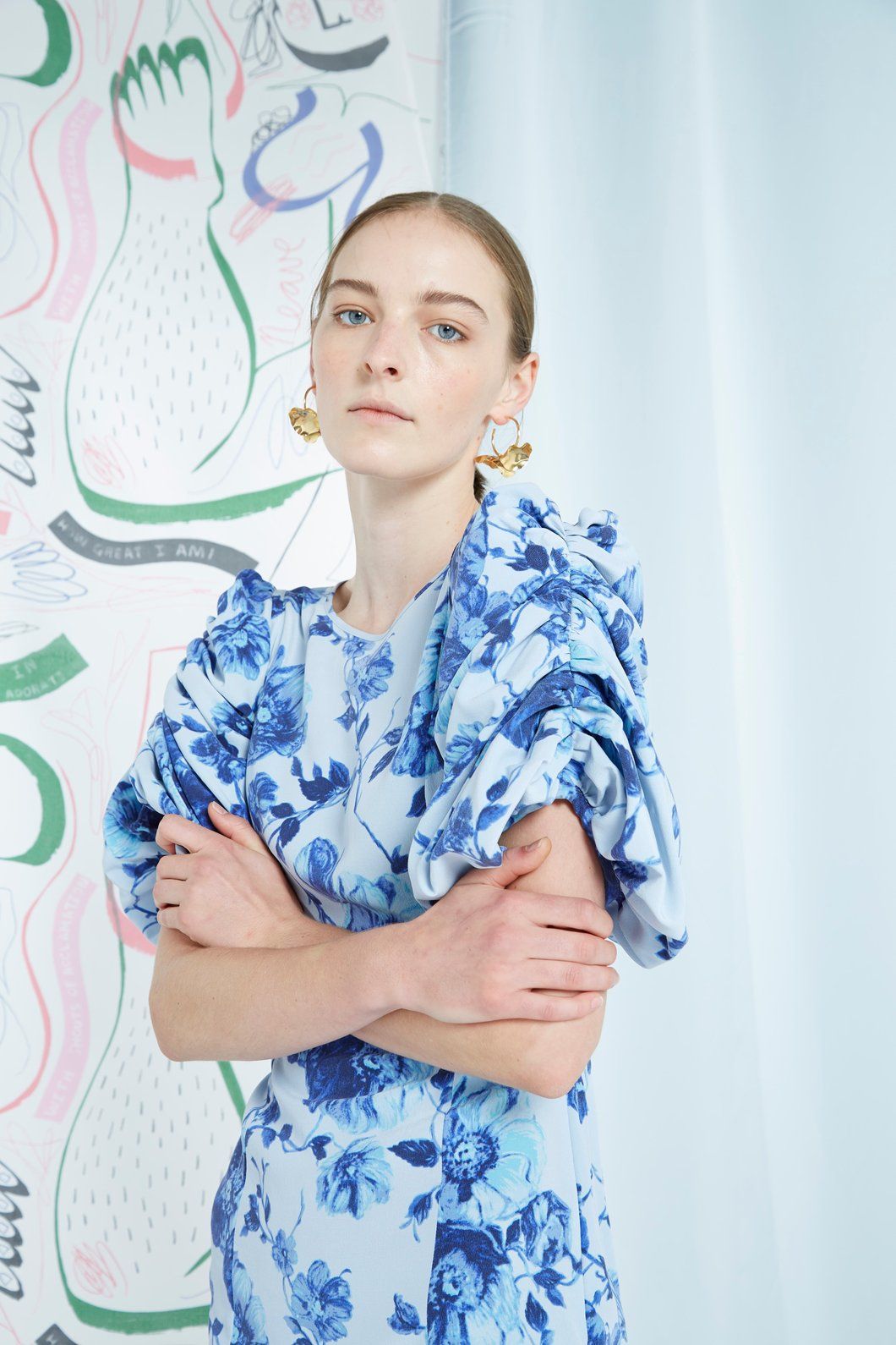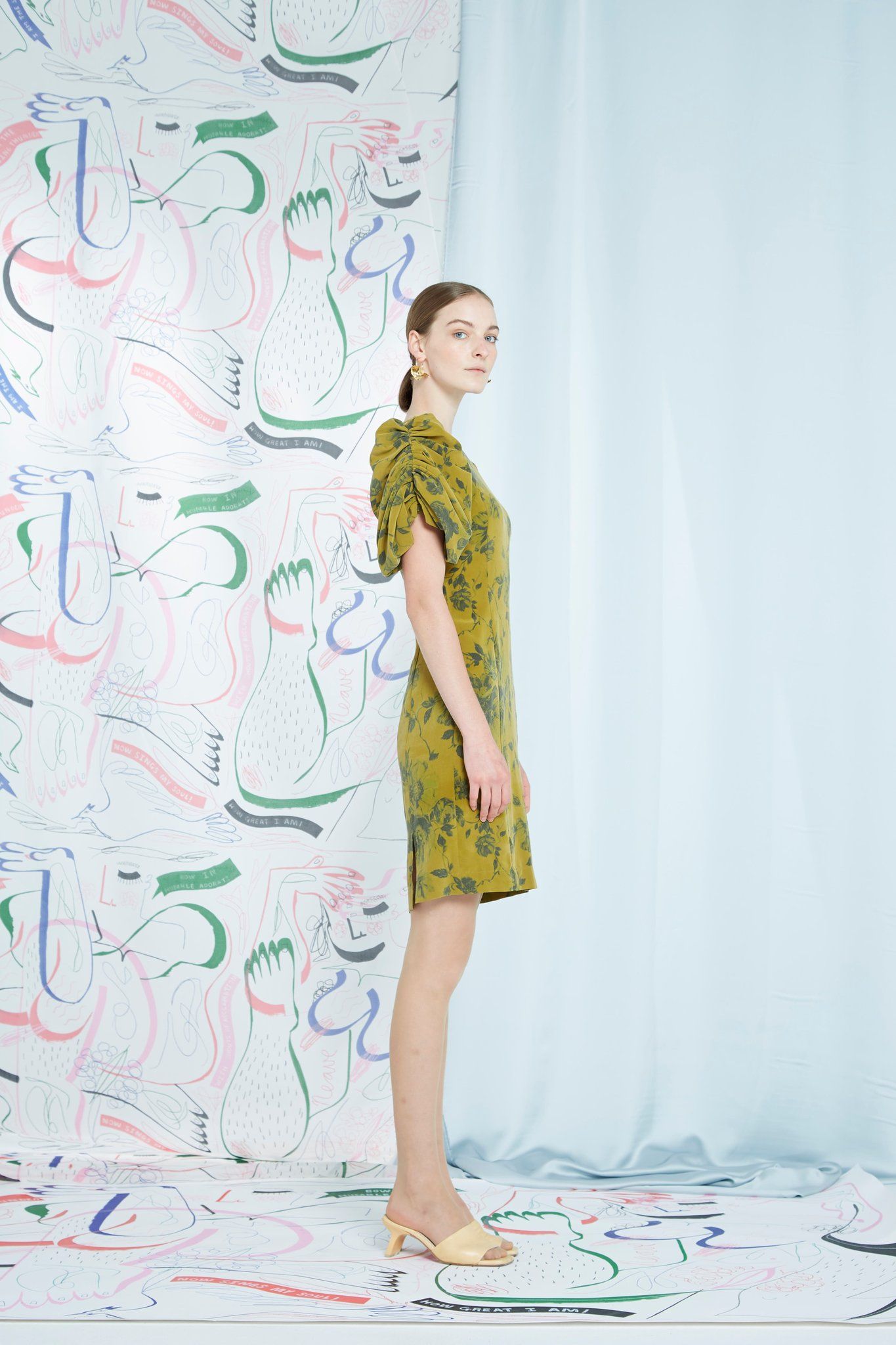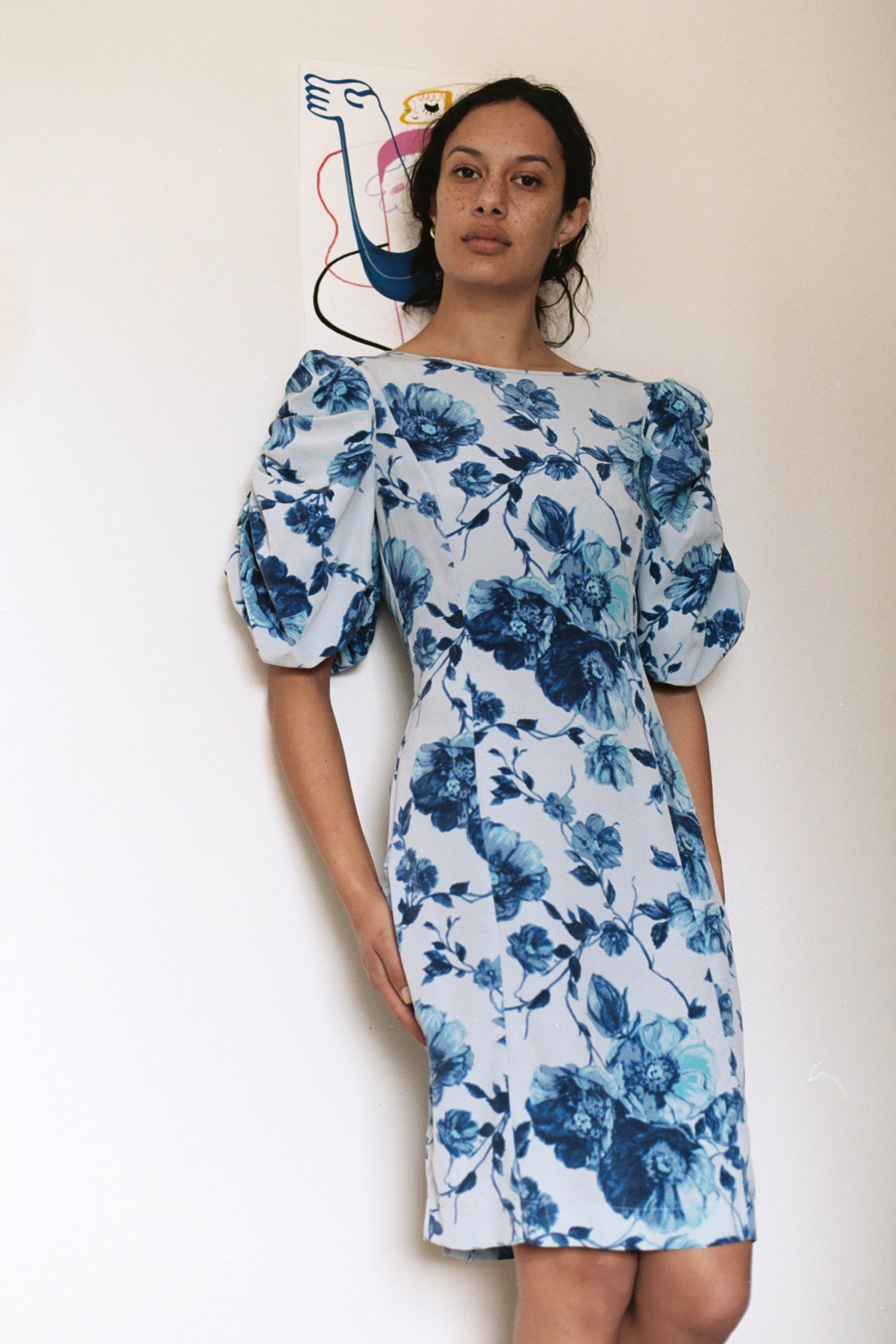 The Lavonia Dress is a beautifully crafted piece, featuring a gathered, exaggerated sleeve that gracefully ends at the elbow. Its elegant, fitted silhouette is enhanced by panelled detailing and two back splits.