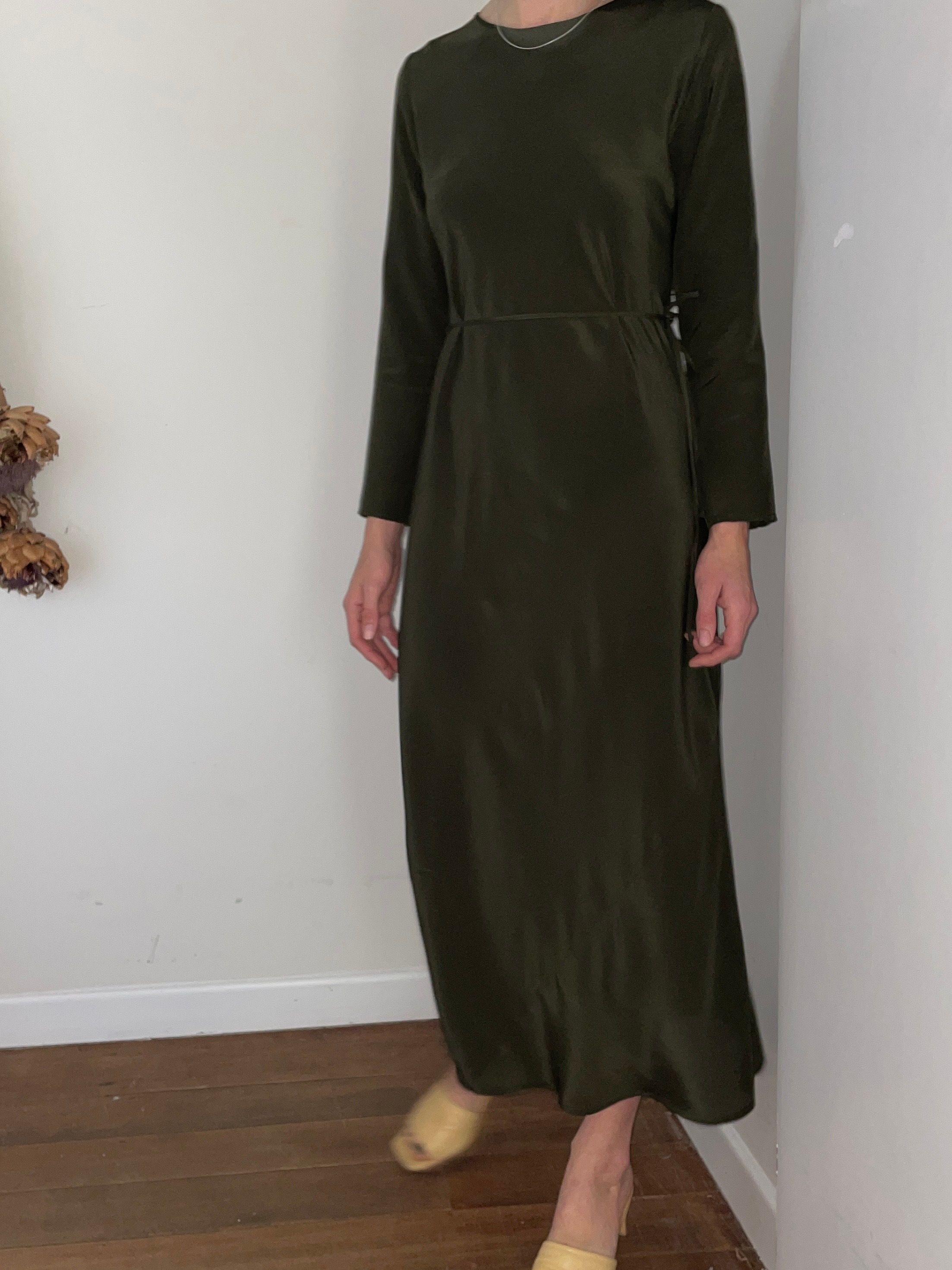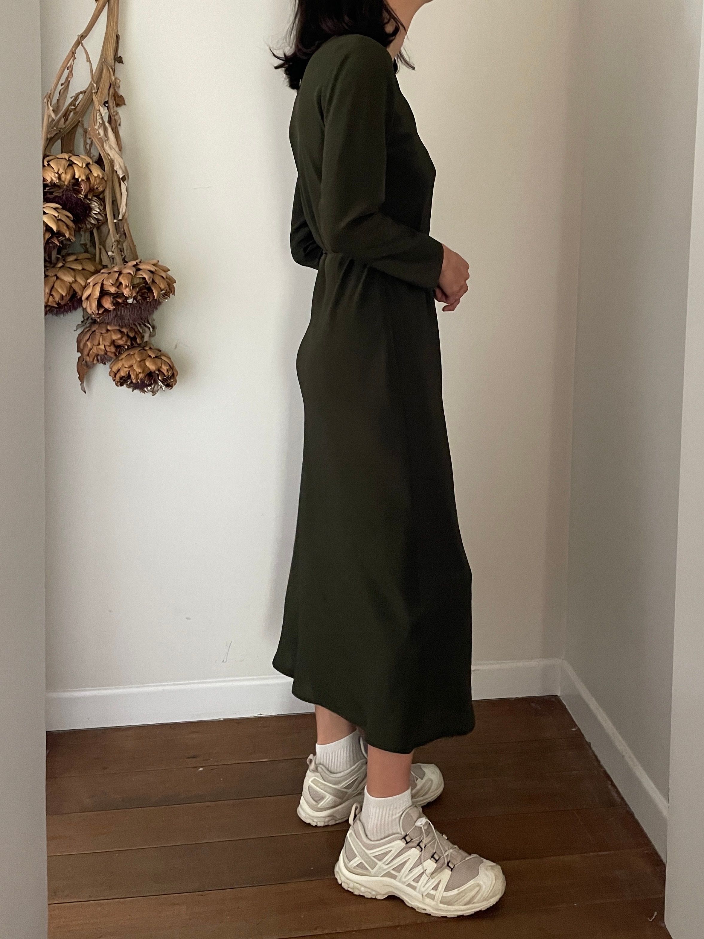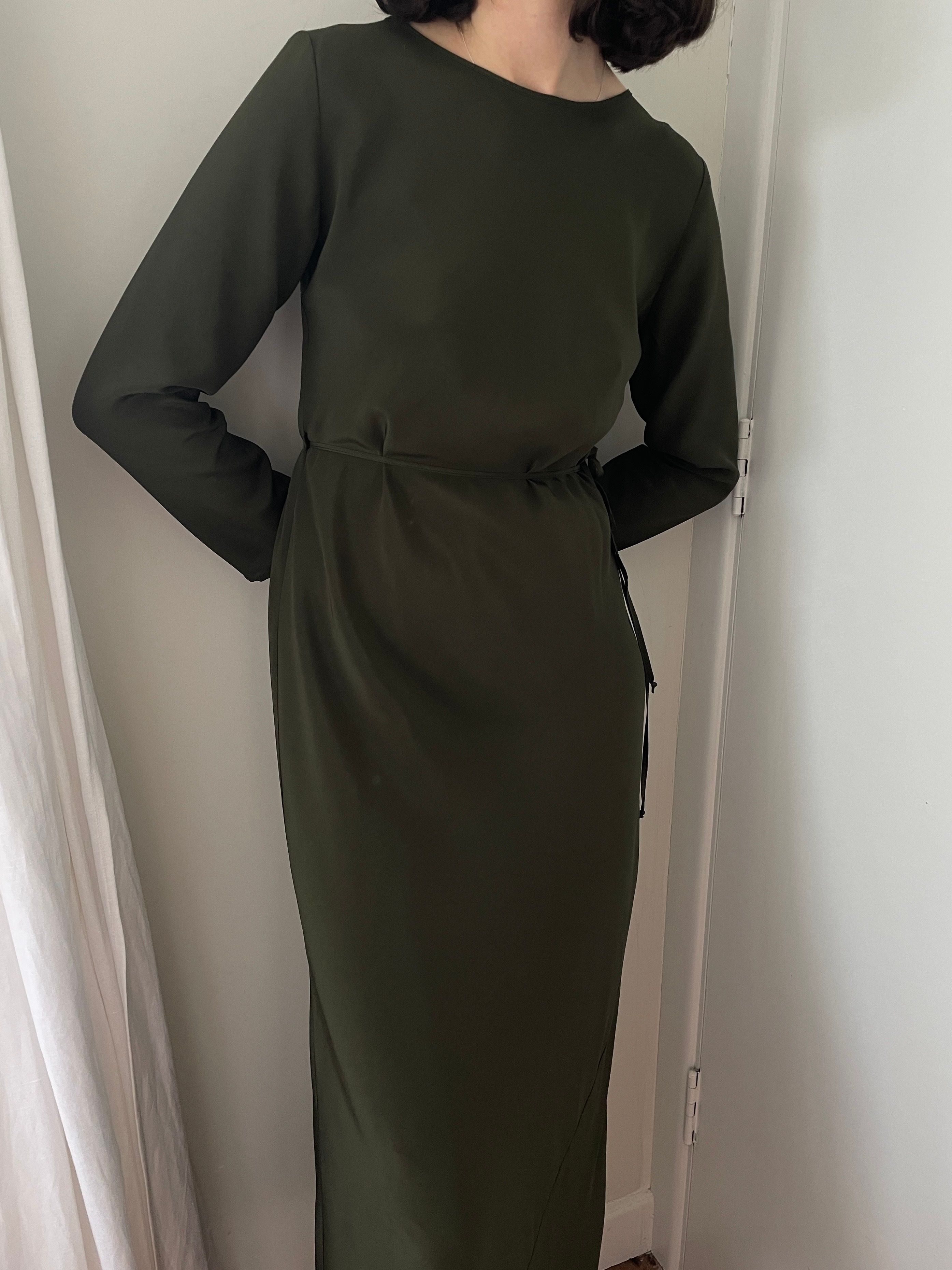 Bias cut Bound neck and tie that sits on the natural waistline Dress finishes at the ankle Sleeves finishes just above the wrist