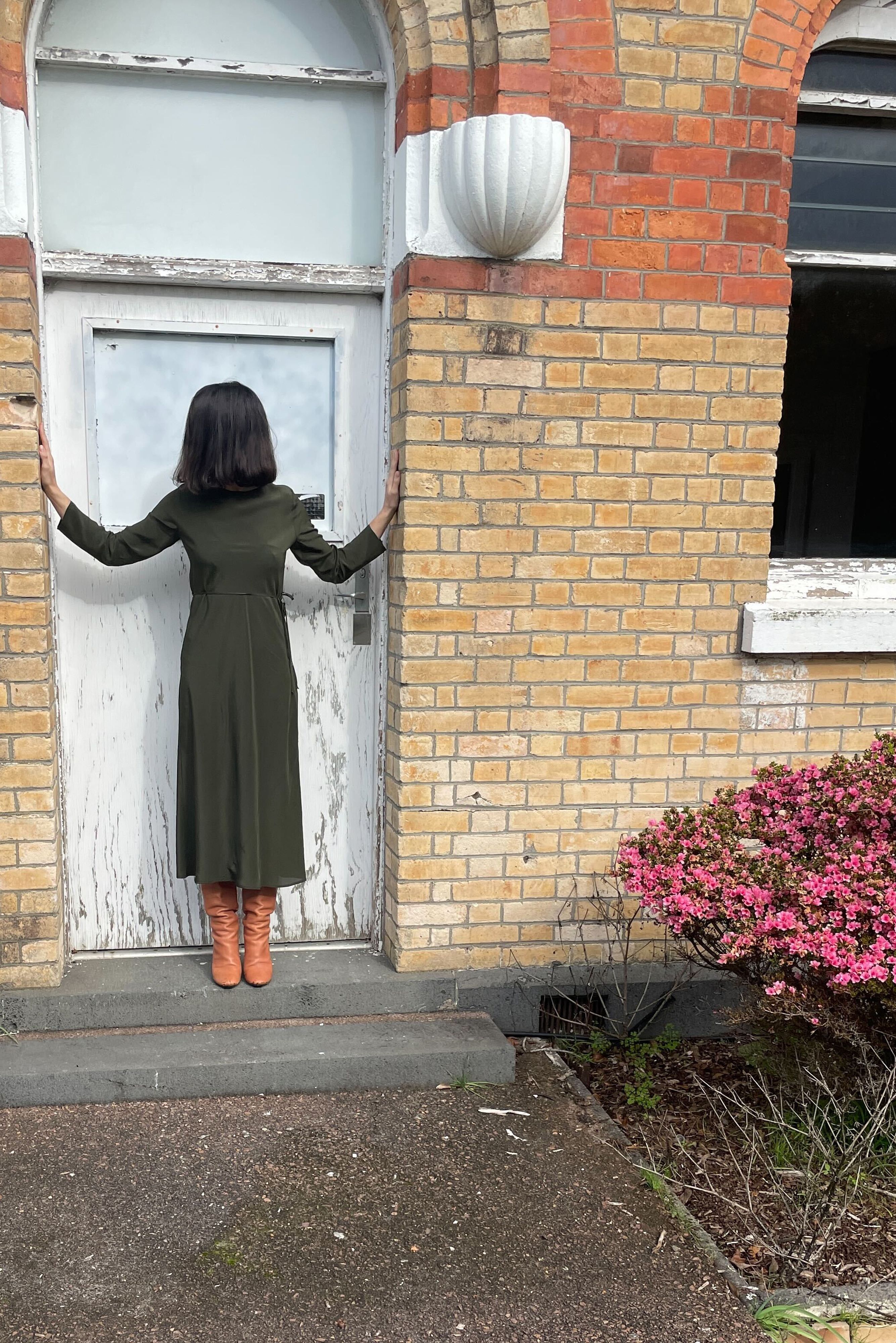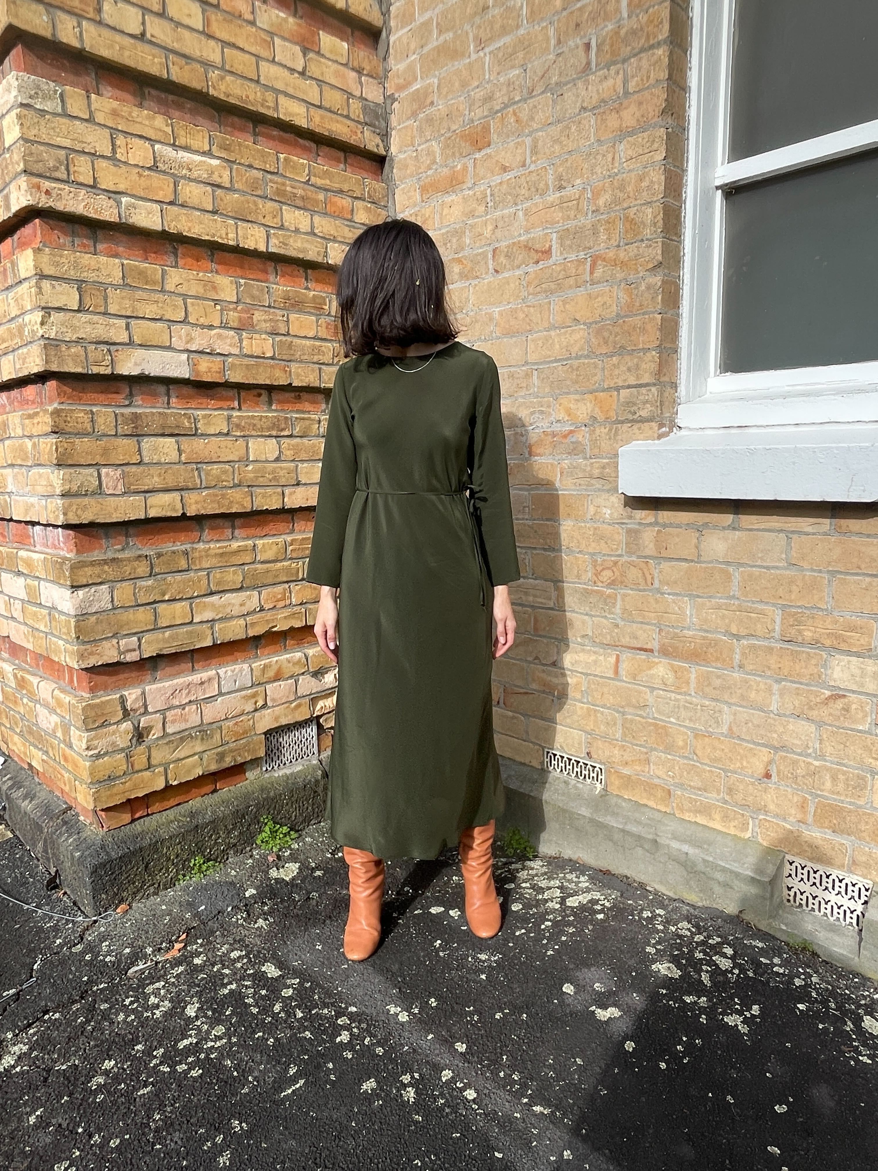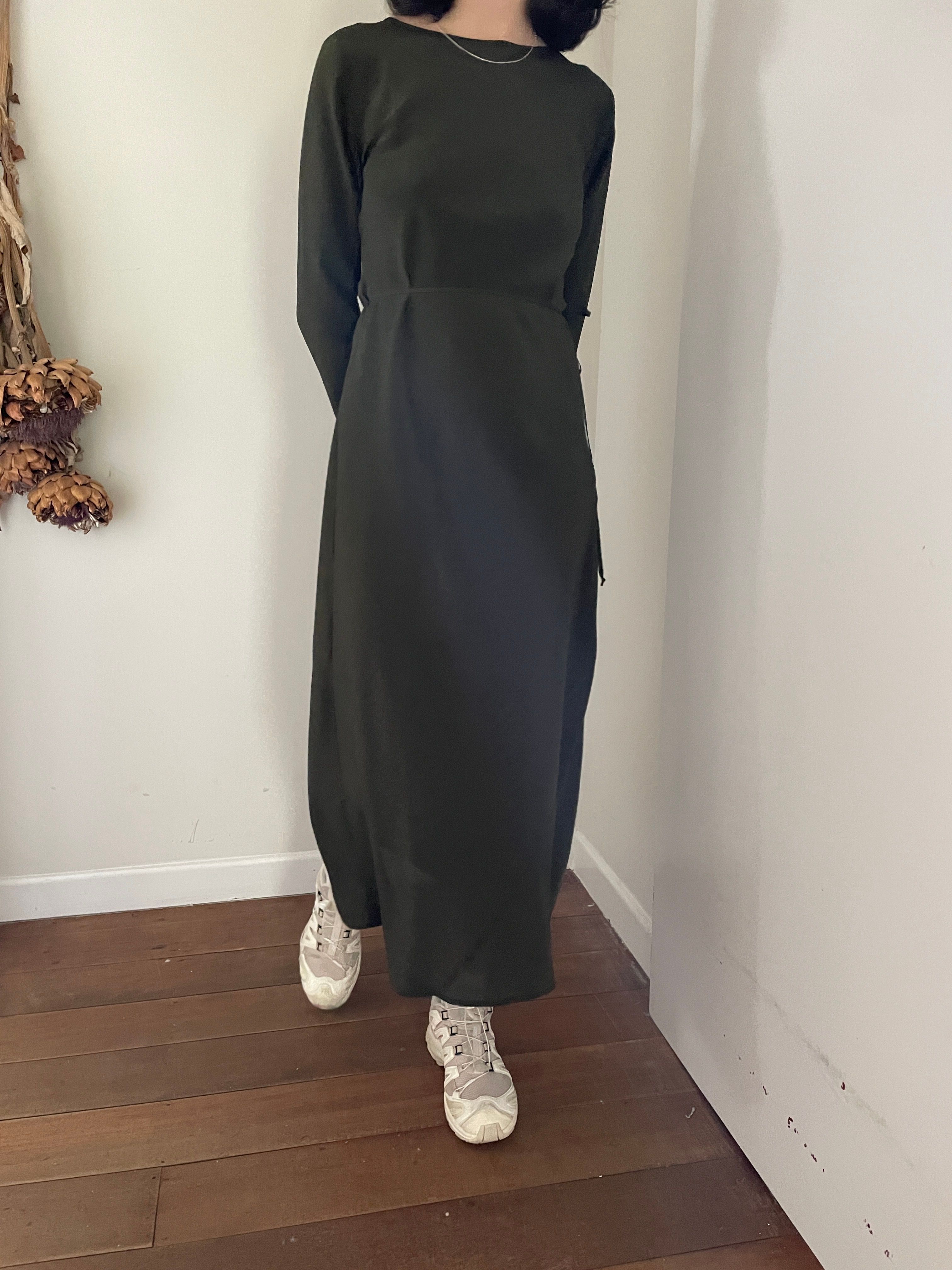 Bias cut Bound neck and tie that sits on the natural waistline Dress finishes at the ankle Sleeves finishes just above the wrist