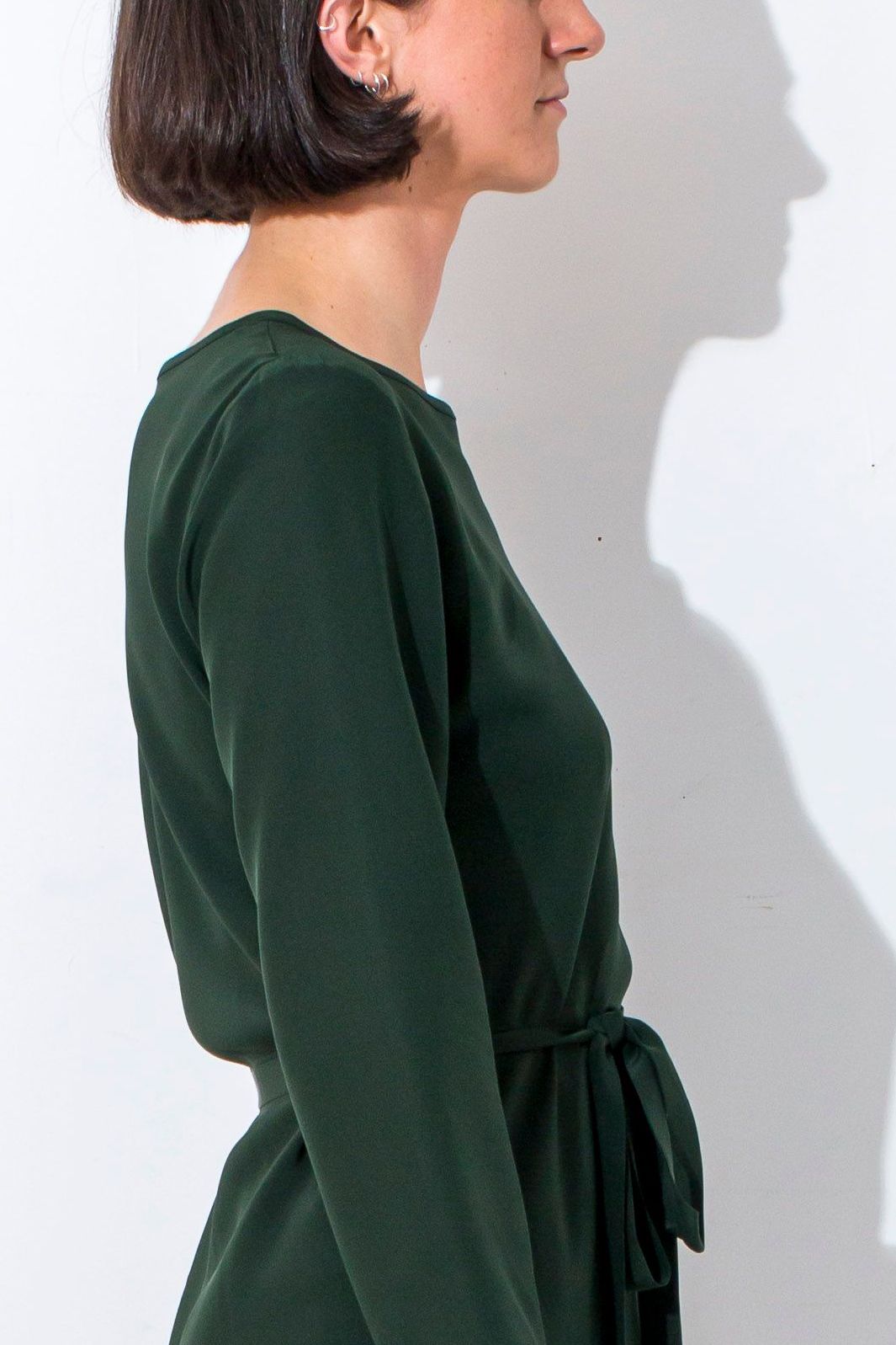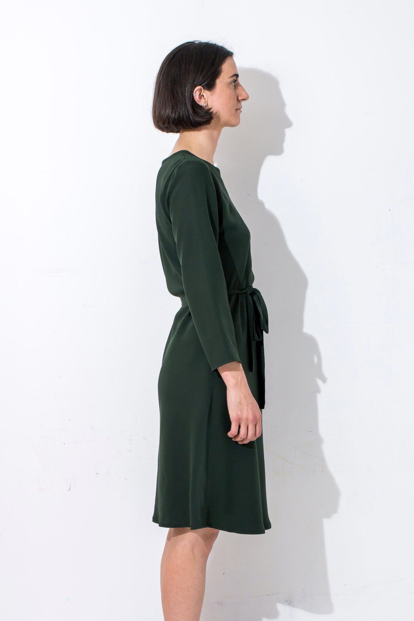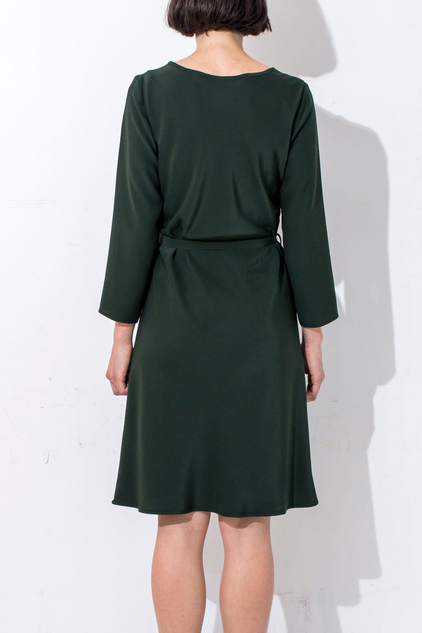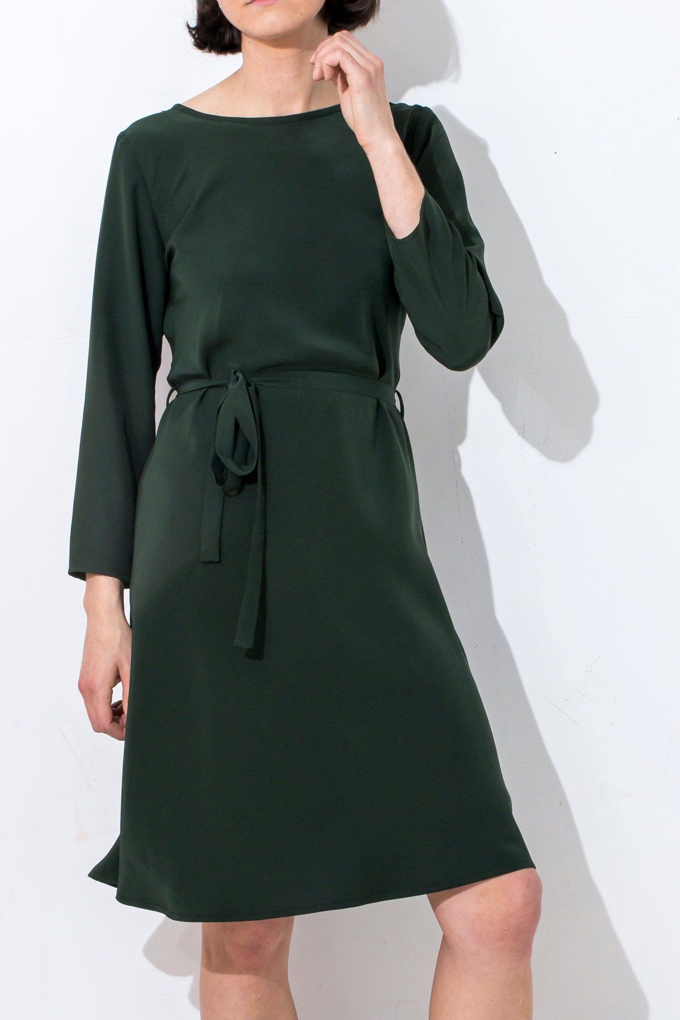 Size L Bias cut Bound neck and tie that sits on natural waistline Dress finishes at the knee Sleeves finish below the elbow