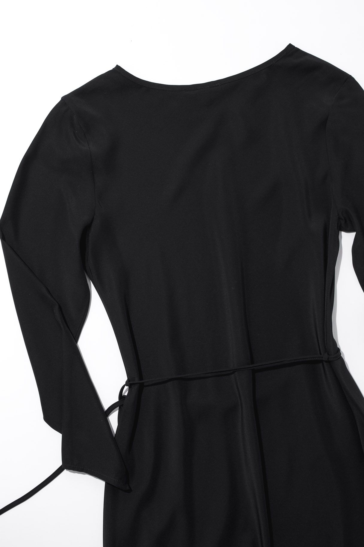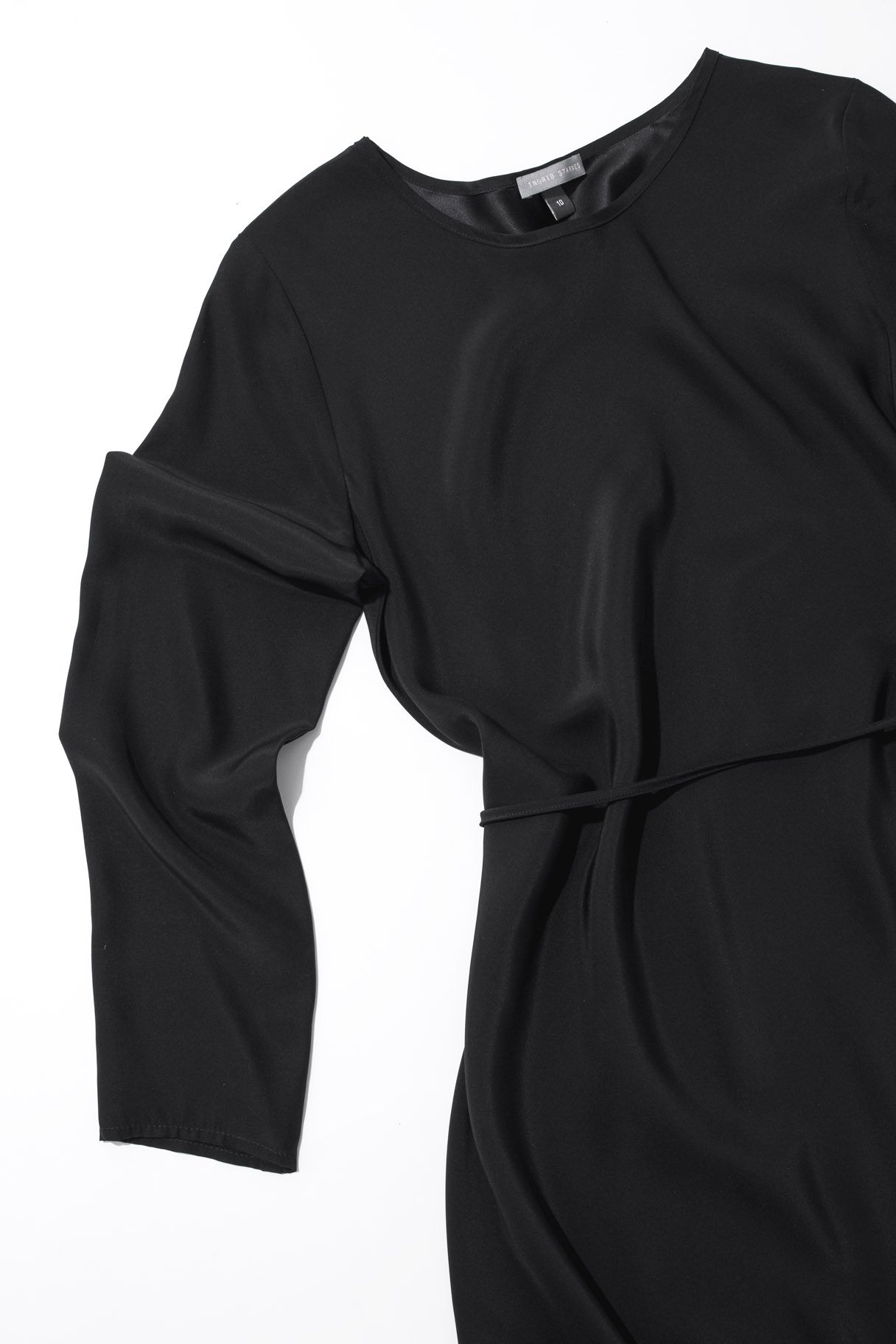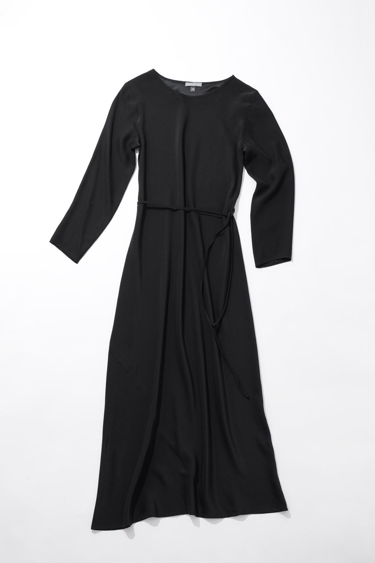 Bias cut Bound neck and tie that sits on the natural waistline Dress finishes at the ankle Sleeves finishes just above the wrist