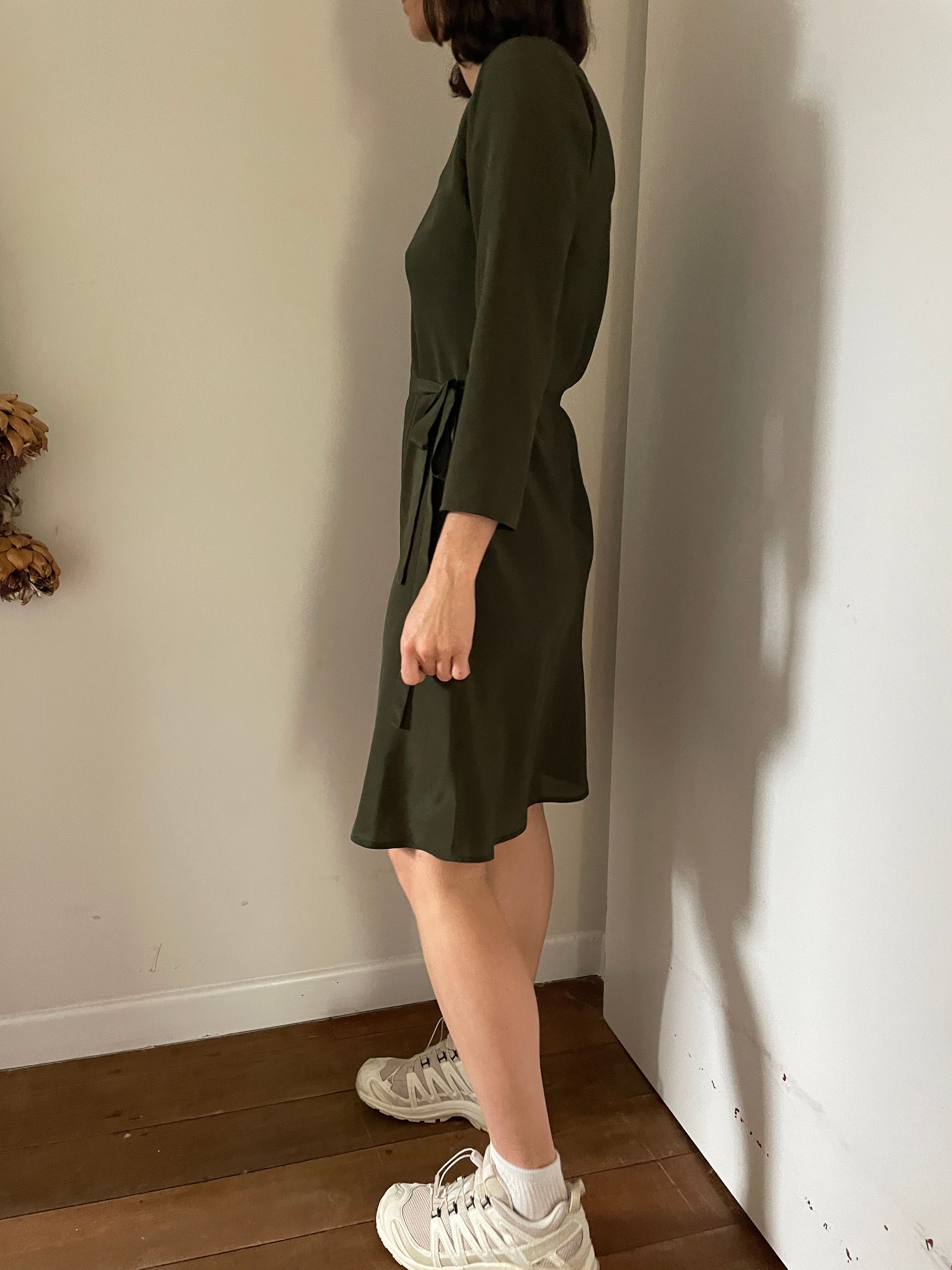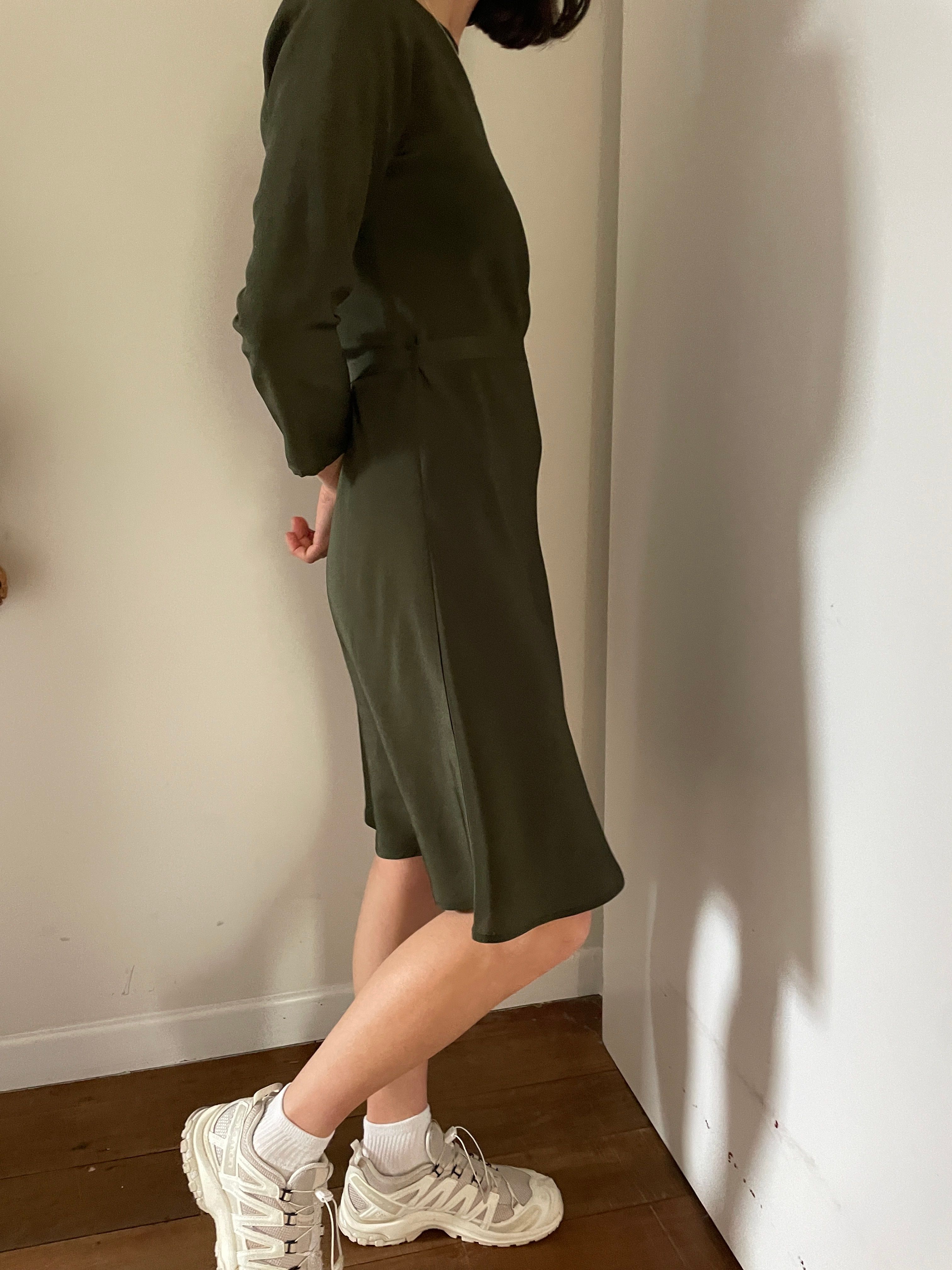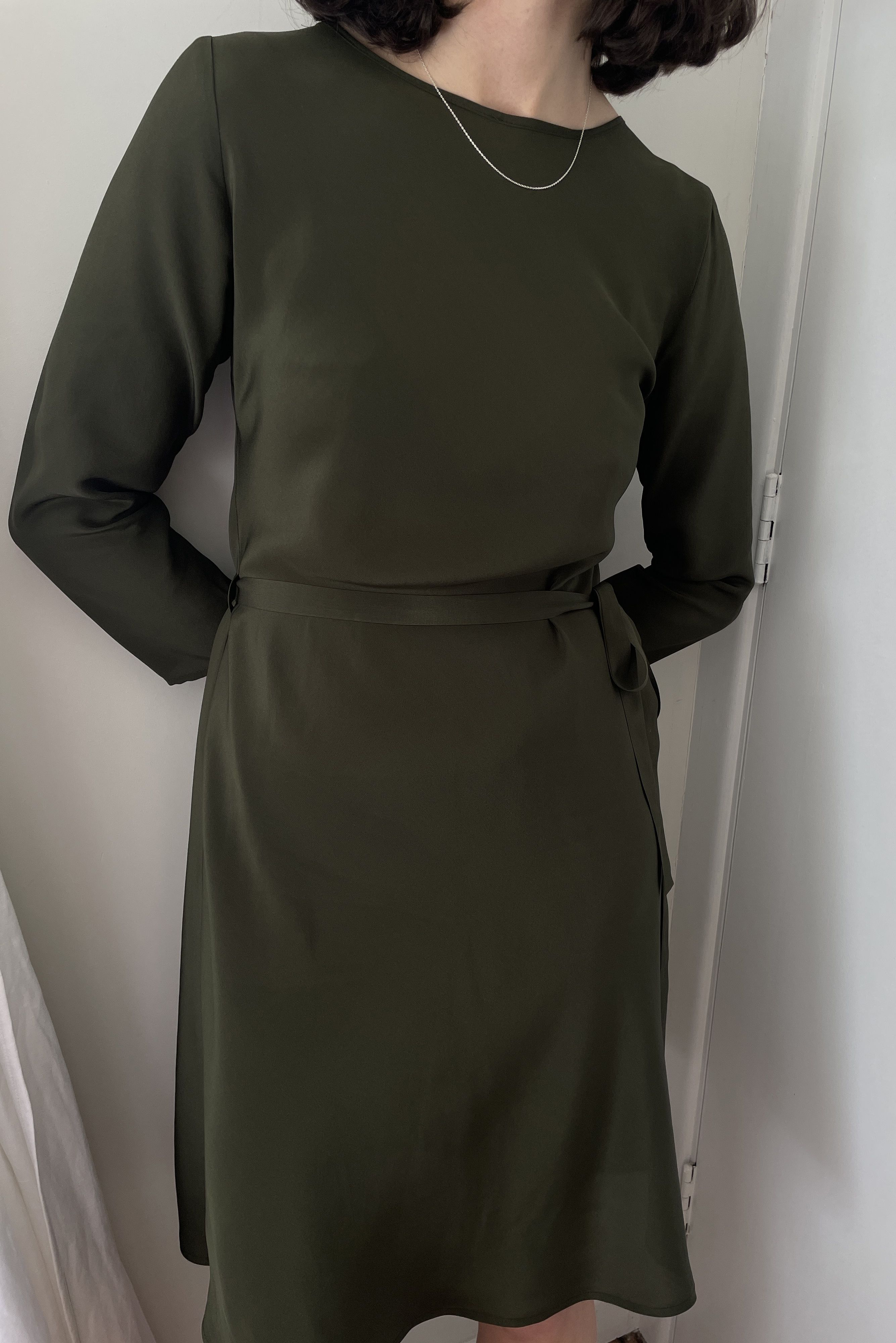 Bias cut Bound neck and tie that sits on natural waistline Dress finishes at the knee Sleeves finish below the elbow