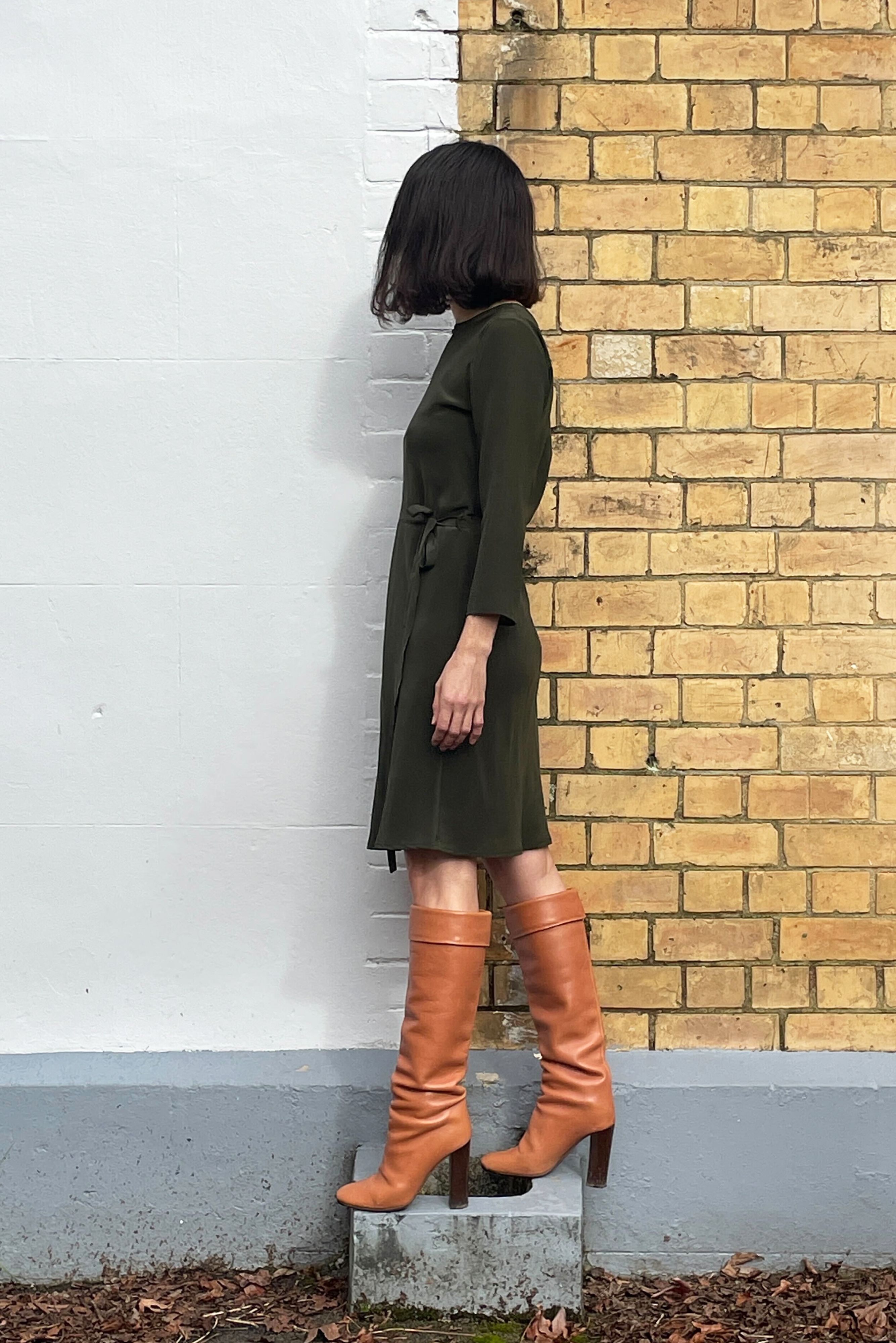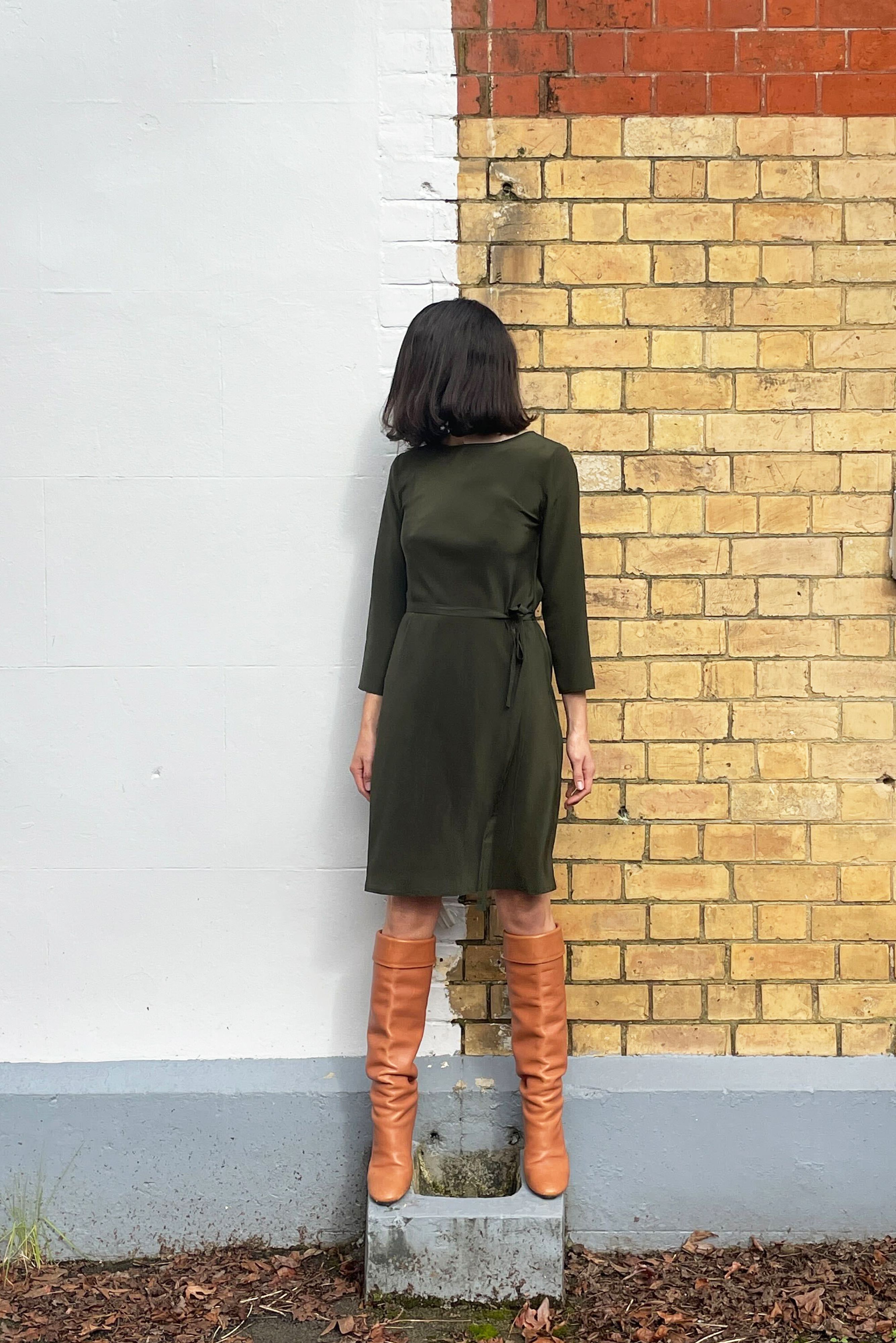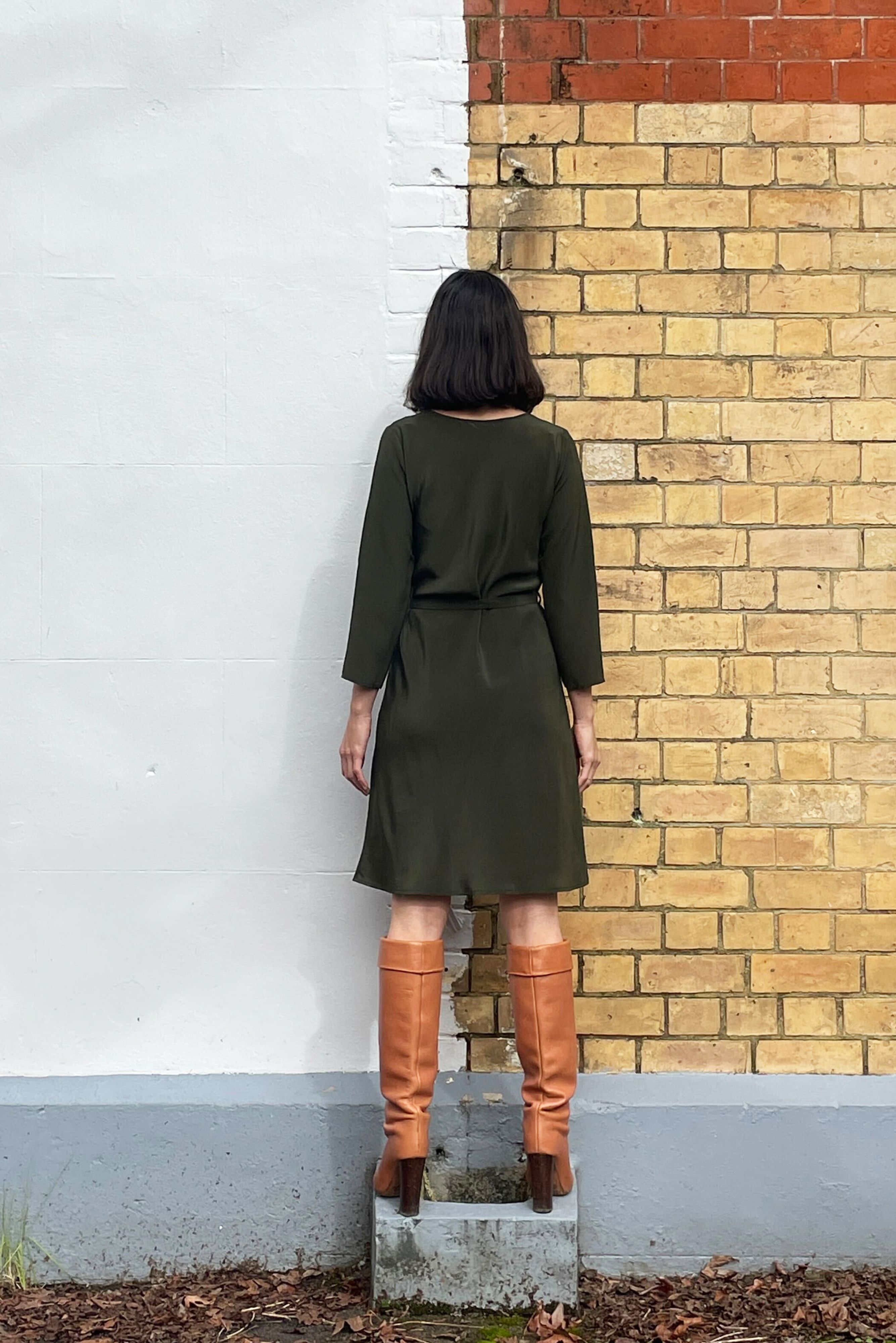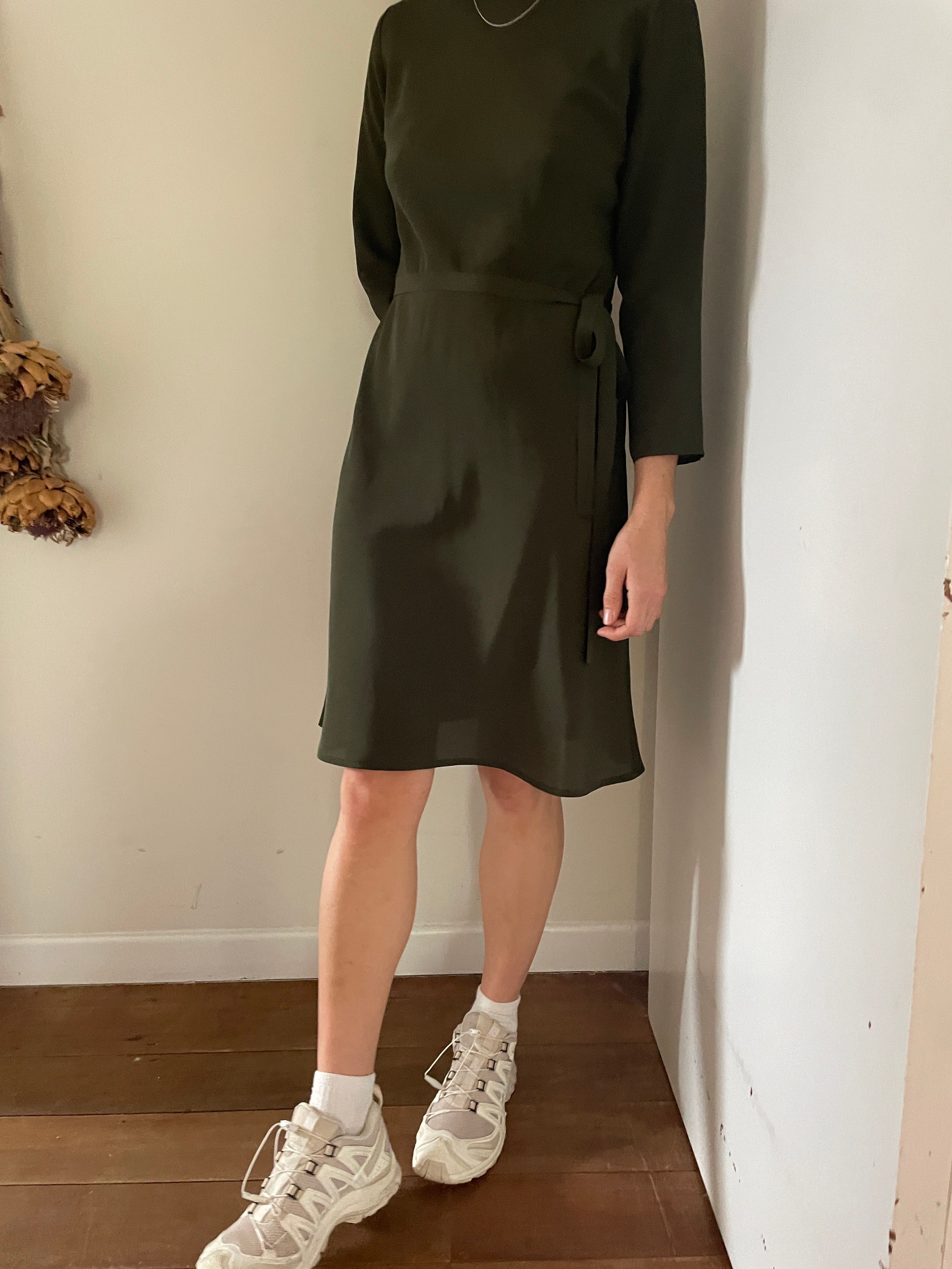 Bias cut Bound neck and tie that sits on natural waistline Dress finishes at the knee Sleeves finish below the elbow
