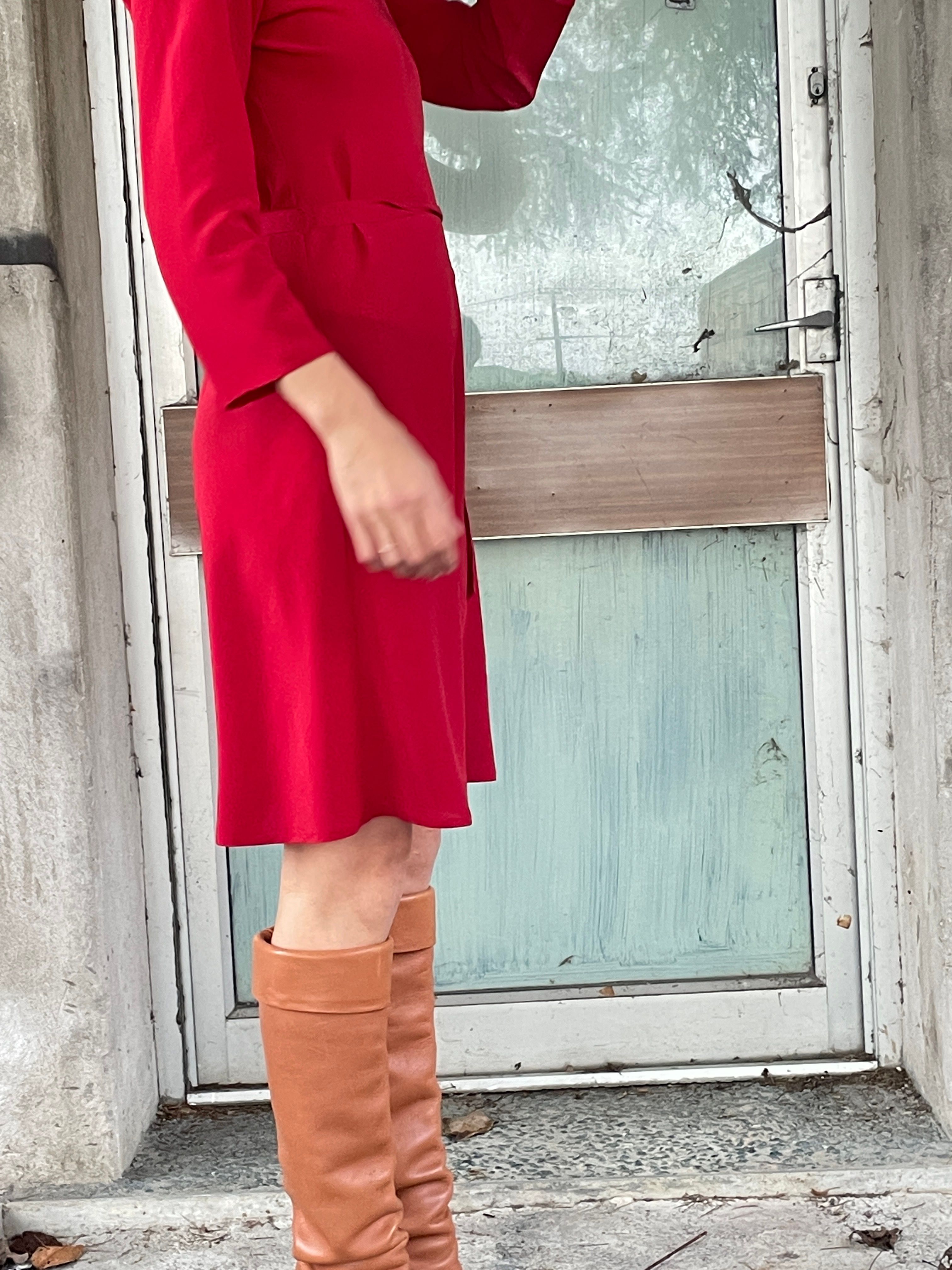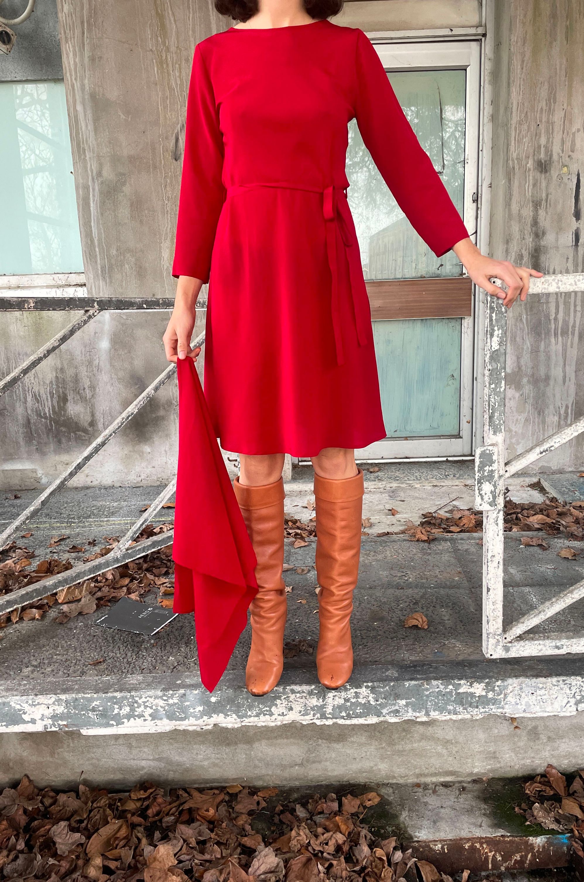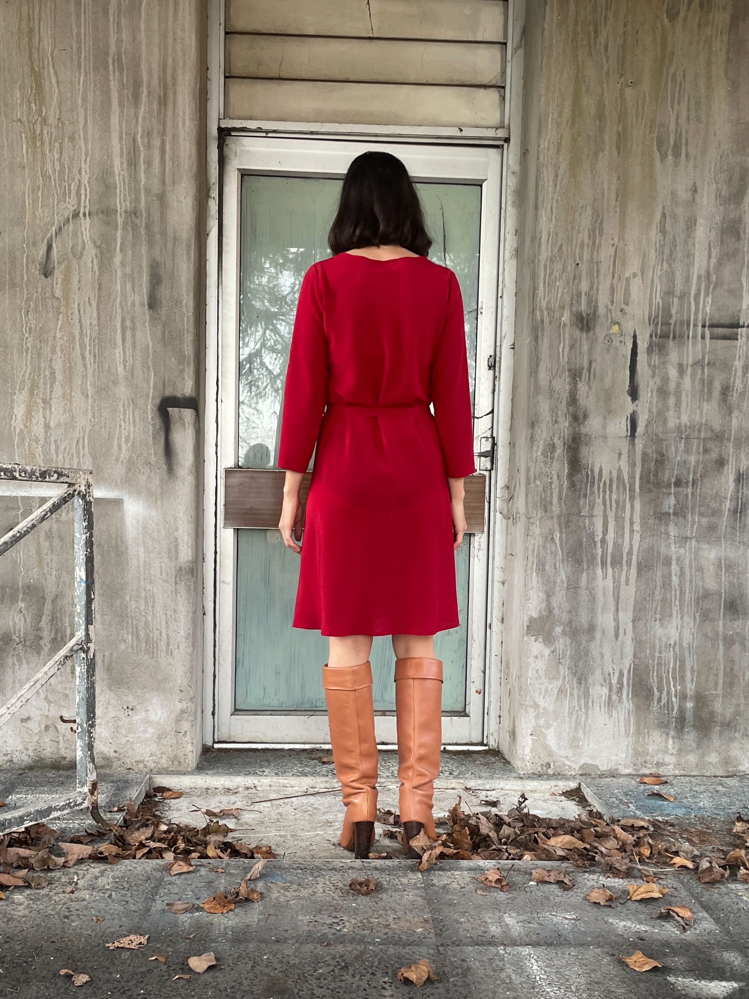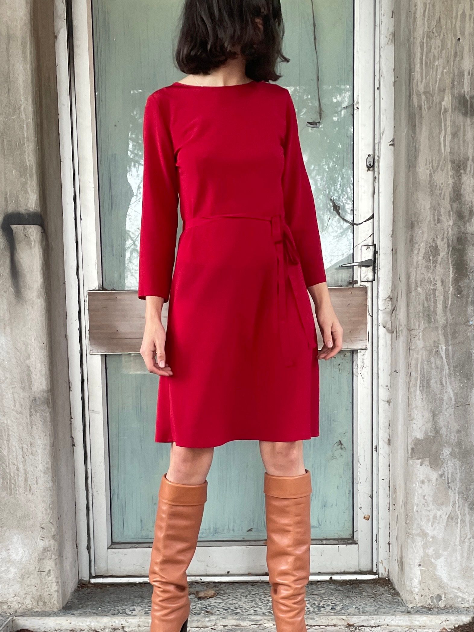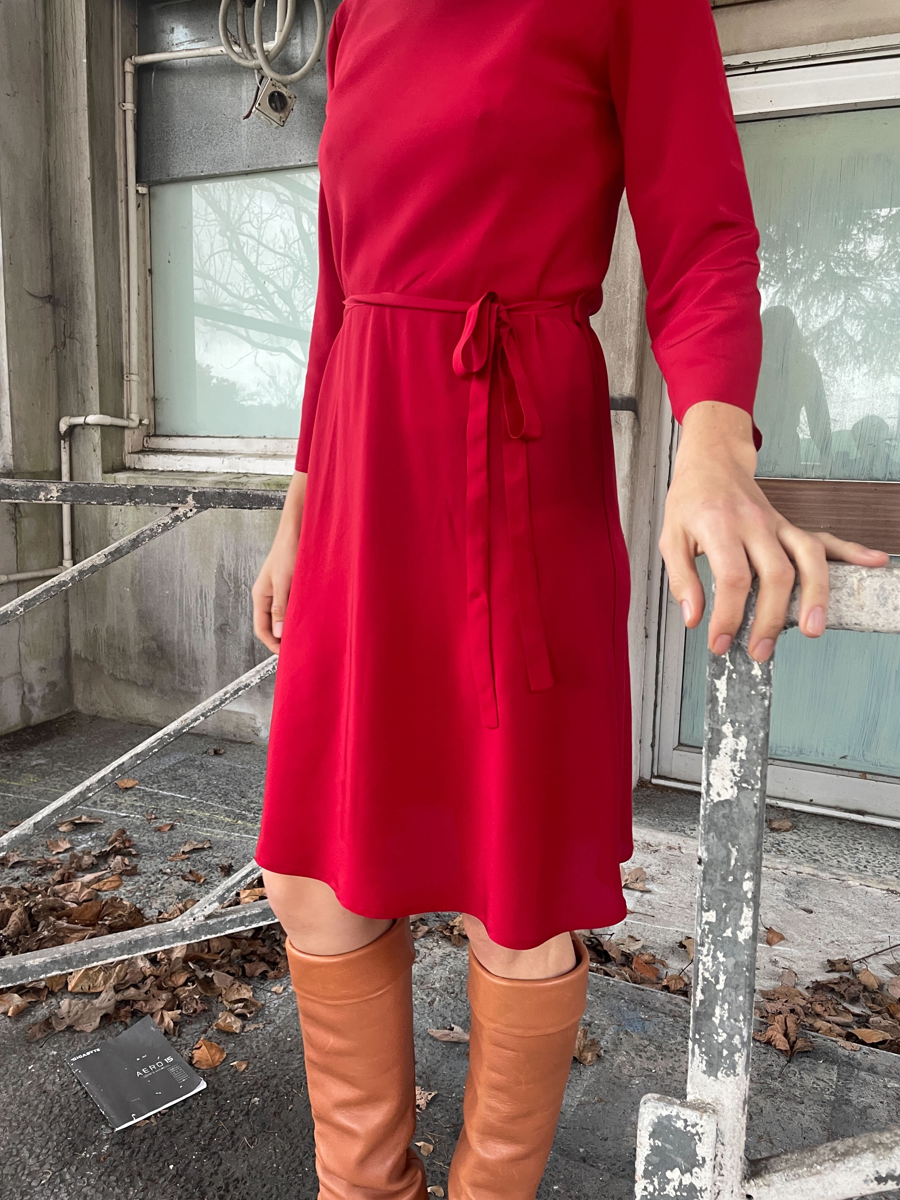 Bias cut Bound neck and tie that sits on natural waistline Dress finishes at the knee Sleeves finish below the elbow